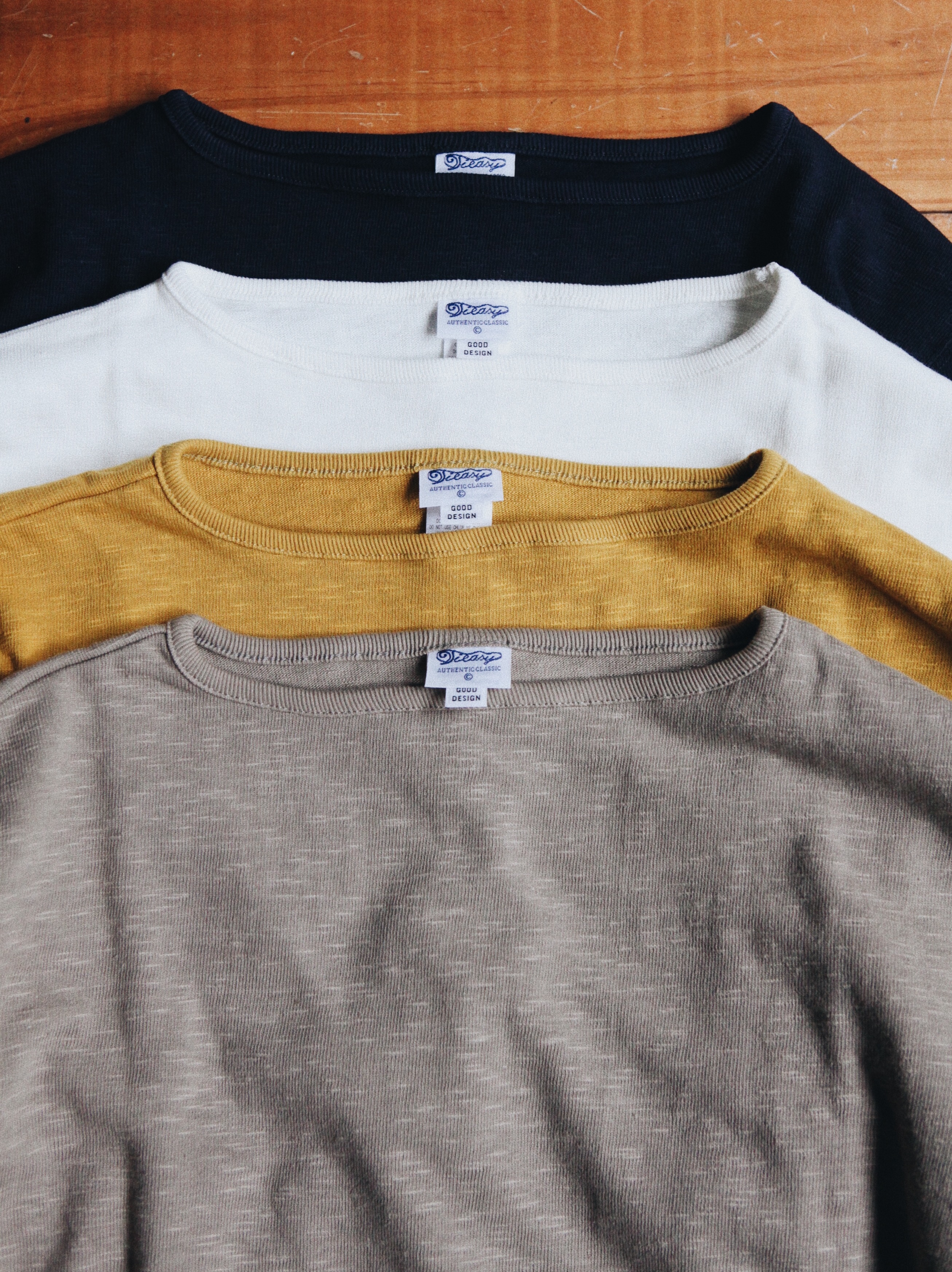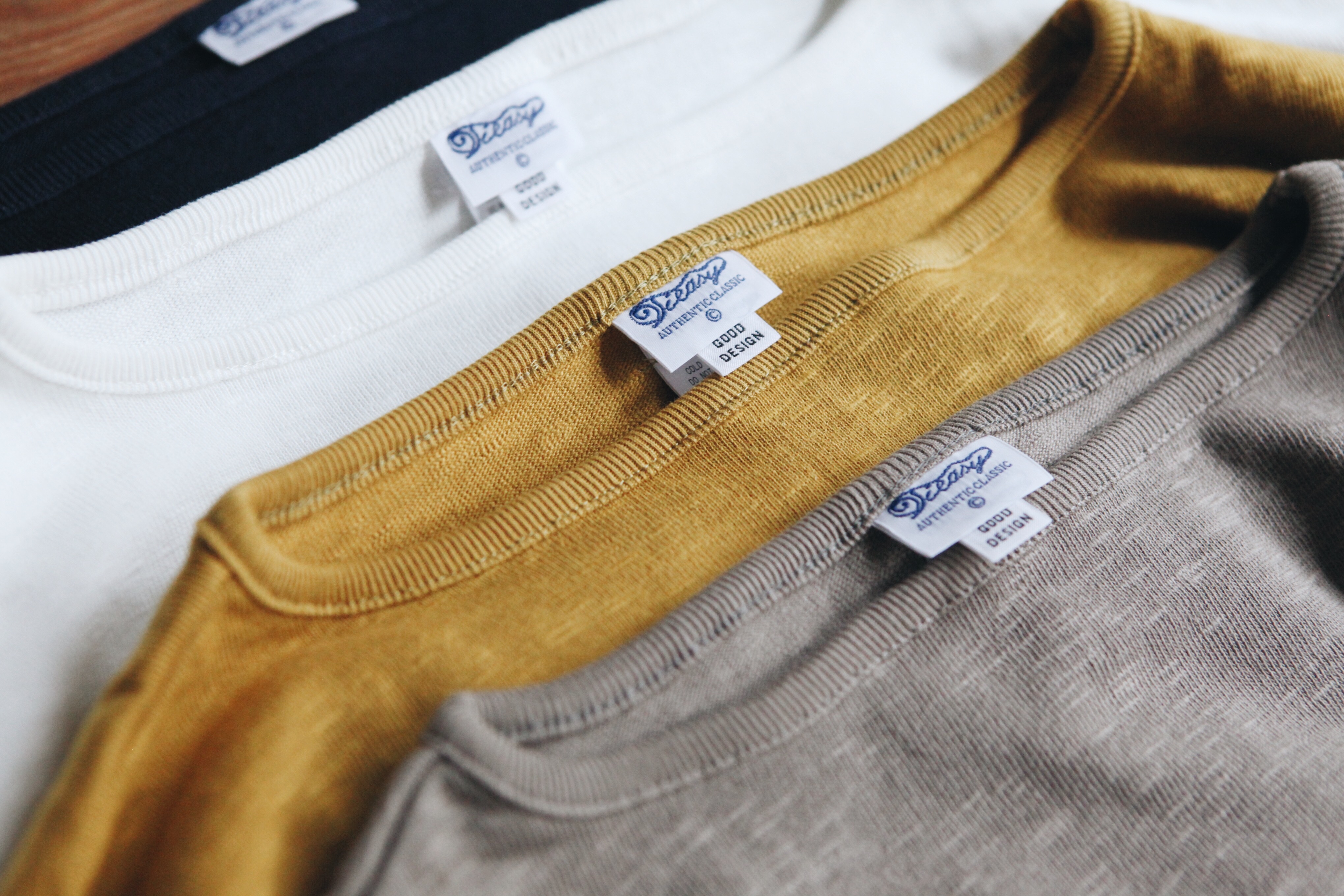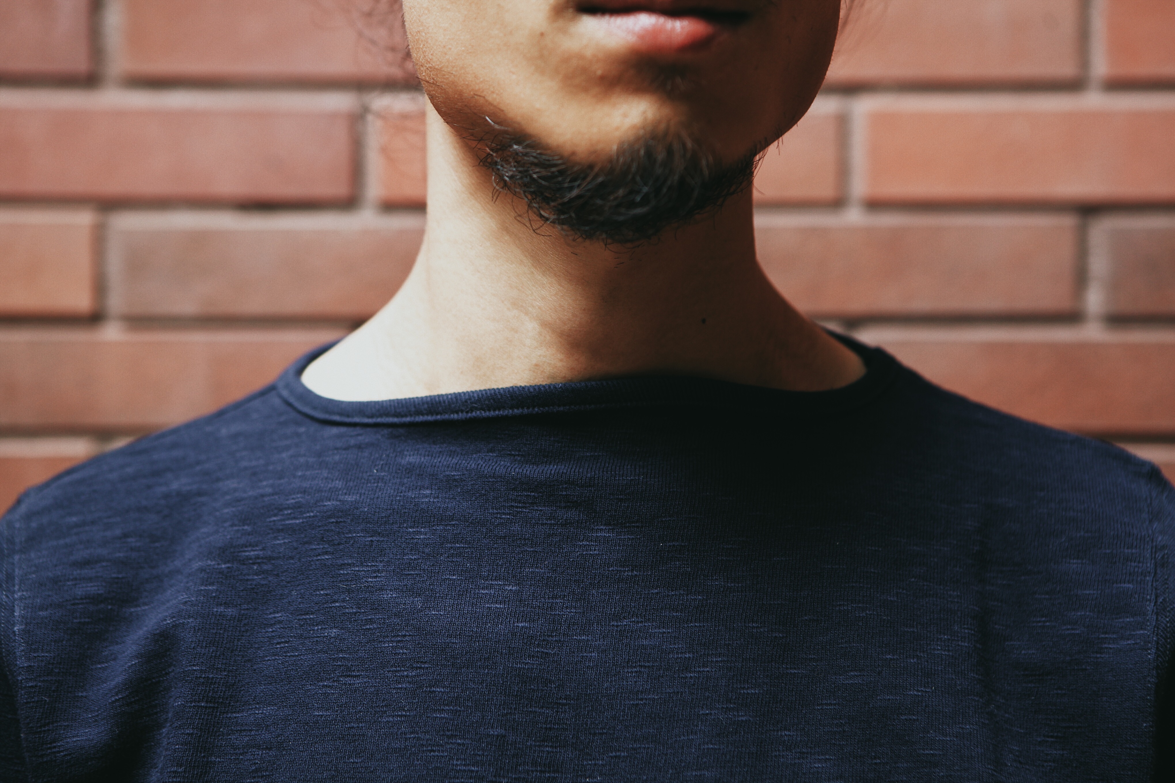 HDCS Cotton比起一般T-shirt的棉布製作速度更慢,質地更加飽滿、柔軟且觸感佳;竹節紗密度高但透氣保暖讓肌膚良好呼吸,最特別的是布料表層摸得到起伏的橫向平紋,是老式織布機才能編織出的獨特手感;而Organic SRAB Cotton使用美國優質有機棉花,從紡紗開始,到老式針織機經緯編織、縫紉及最後的染製都在日本嚴謹做工下完成。