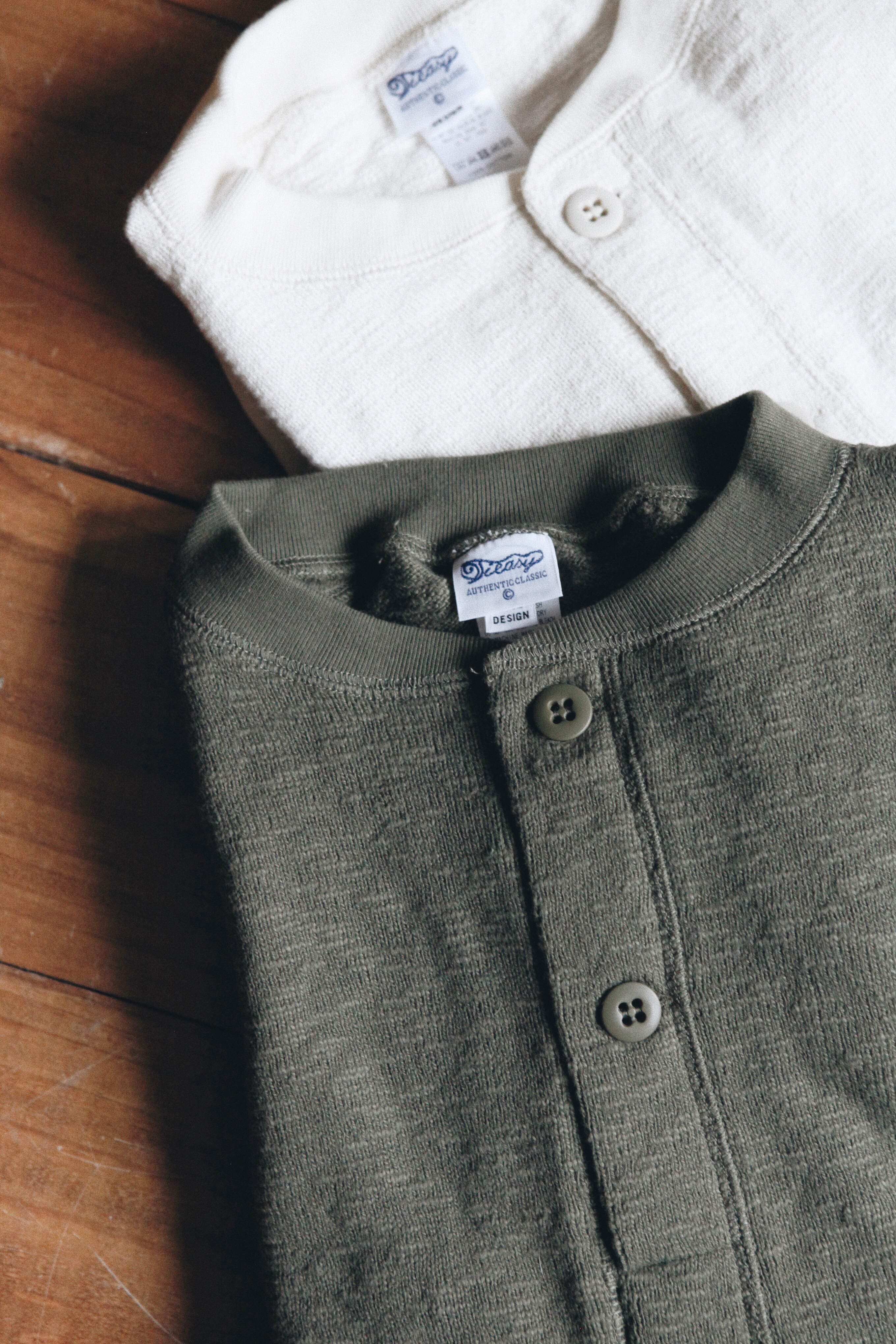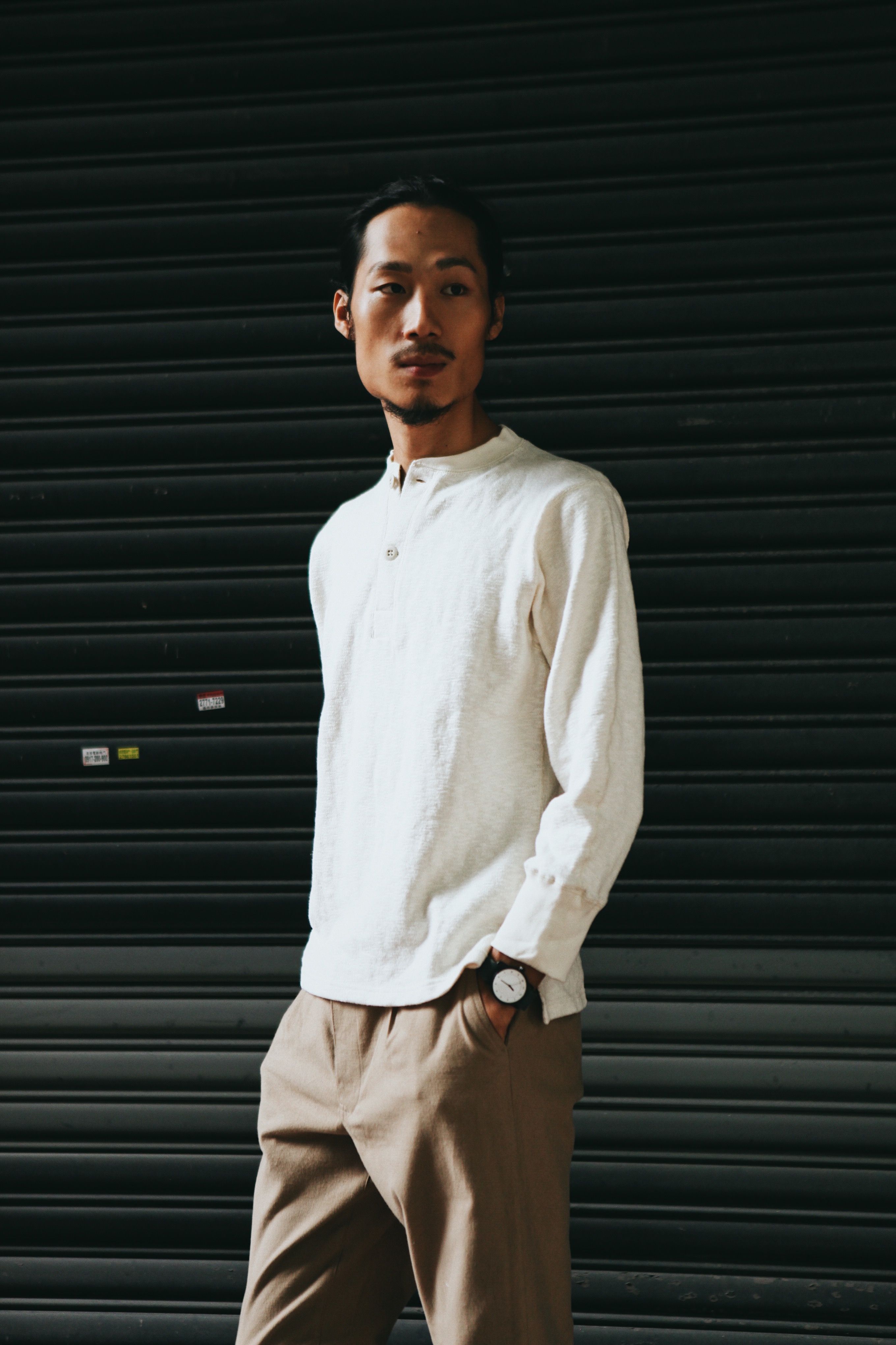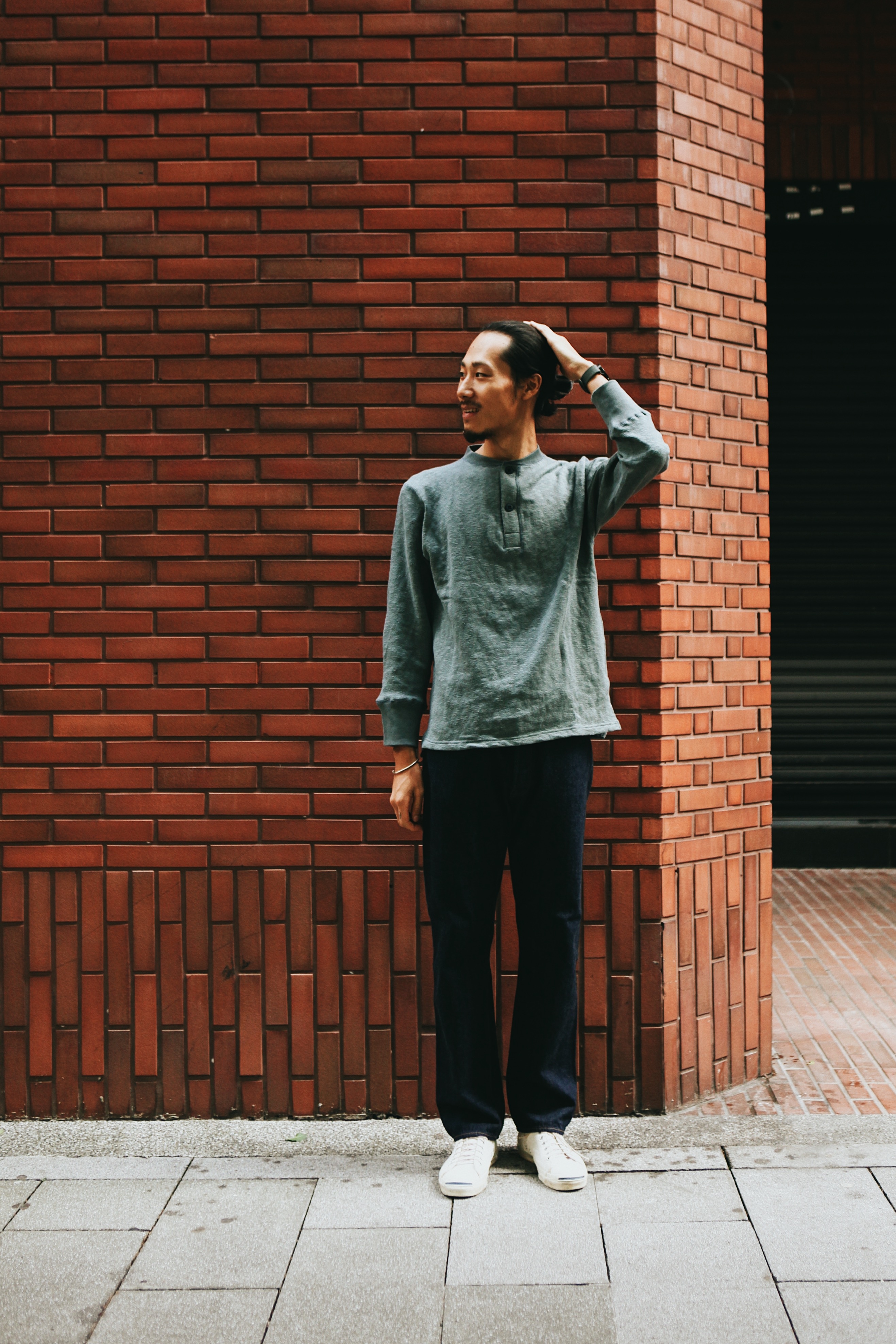 源自早期美軍著用的軍用亨利領襯衫,前襟微微的立領及兩顆開扣的設計,比起一般書卷氣的亨利領上衣更為陽剛些,下擺兩側另有開衩,背面下襬略長,為修身版型;布料的針織更粗,稍微拉扯能看到老式針織機織出的不規則橫紋,手感相當扎實豐富。