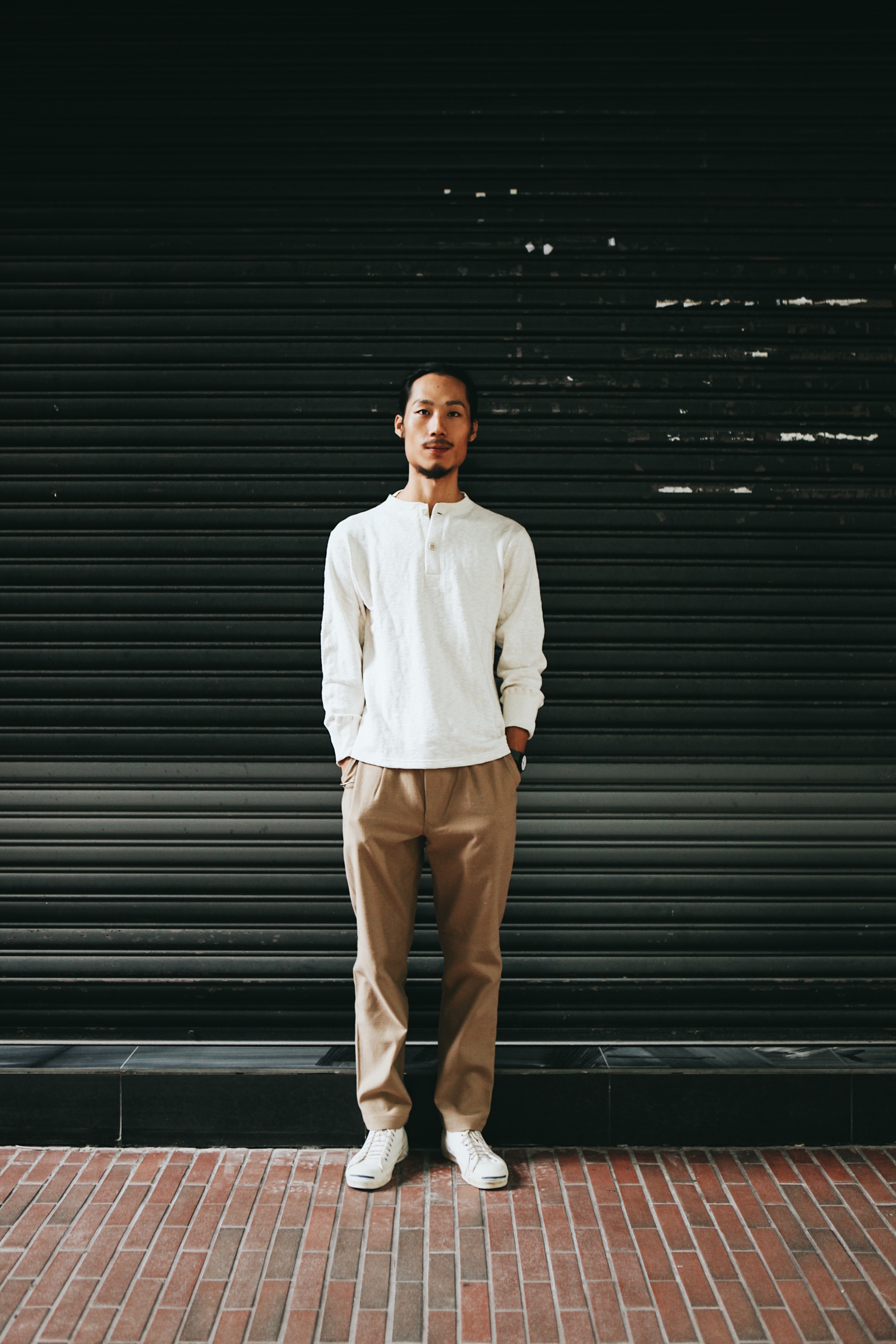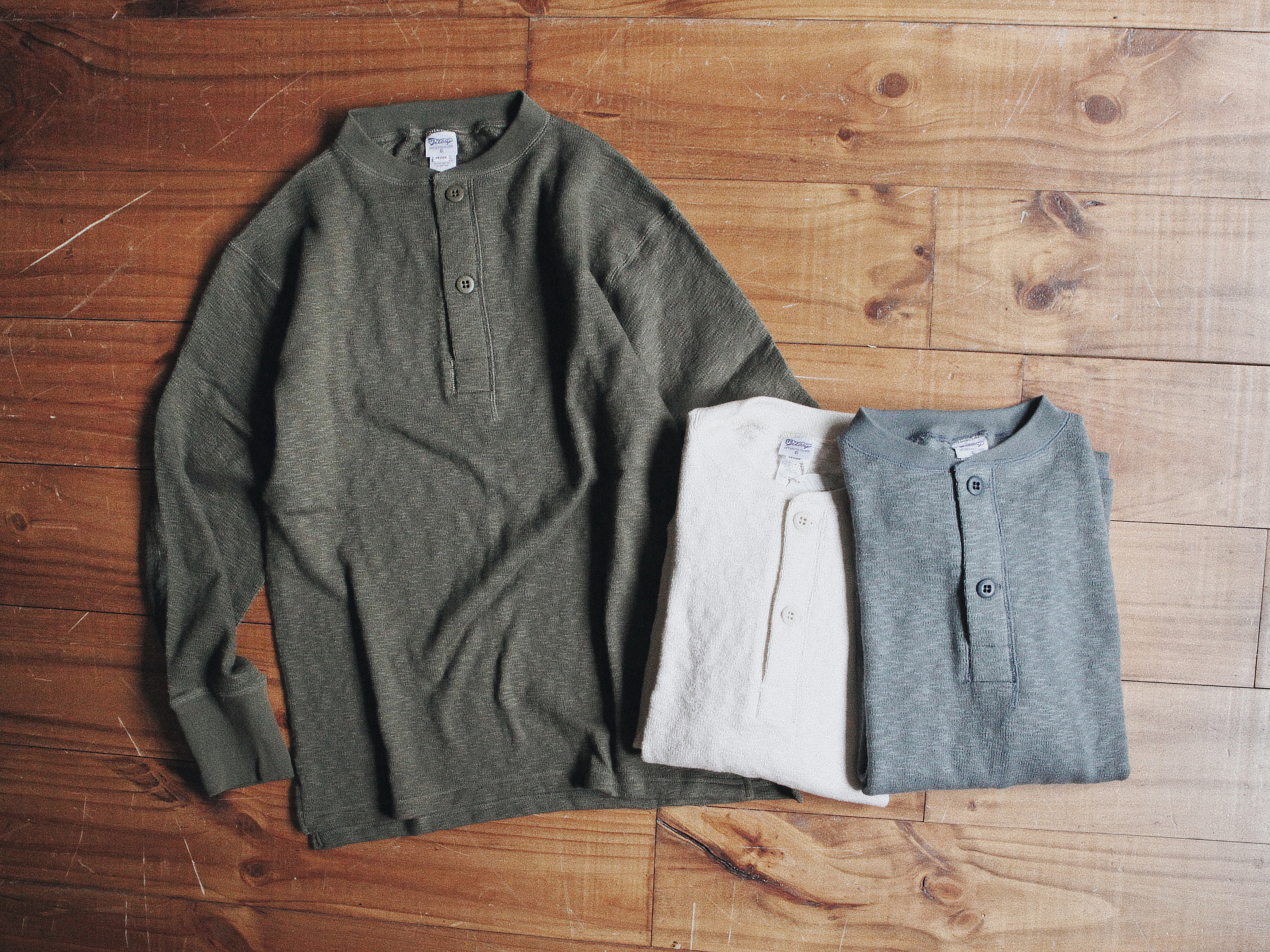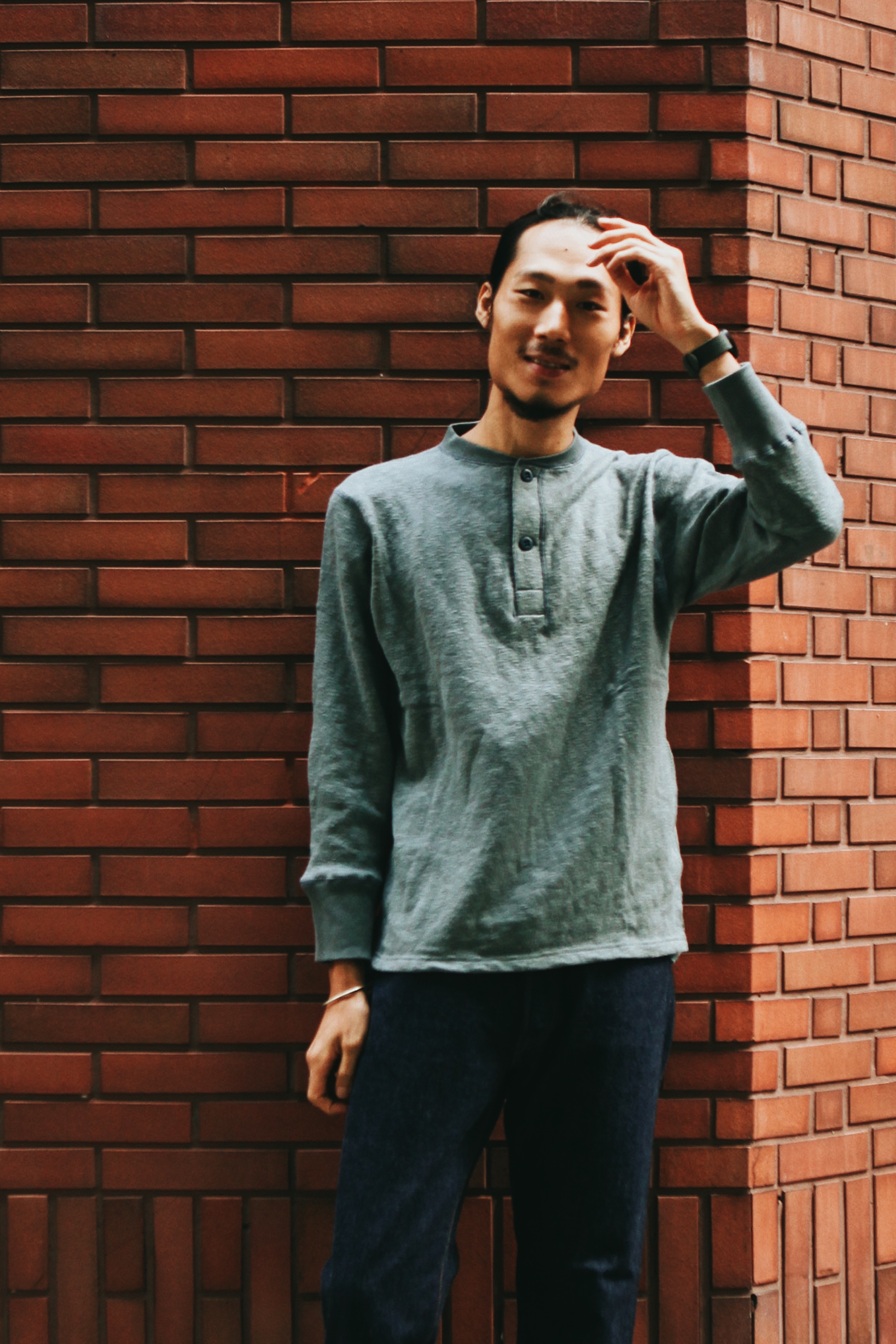 源自早期美軍著用的軍用亨利領襯衫,前襟微微的立領及兩顆開扣的設計,比起一般書卷氣的亨利領上衣更為陽剛些,下擺兩側另有開衩,背面下襬略長,為修身版型;布料的針織更粗,稍微拉扯能看到老式針織機織出的不規則橫紋,手感相當扎實豐富。