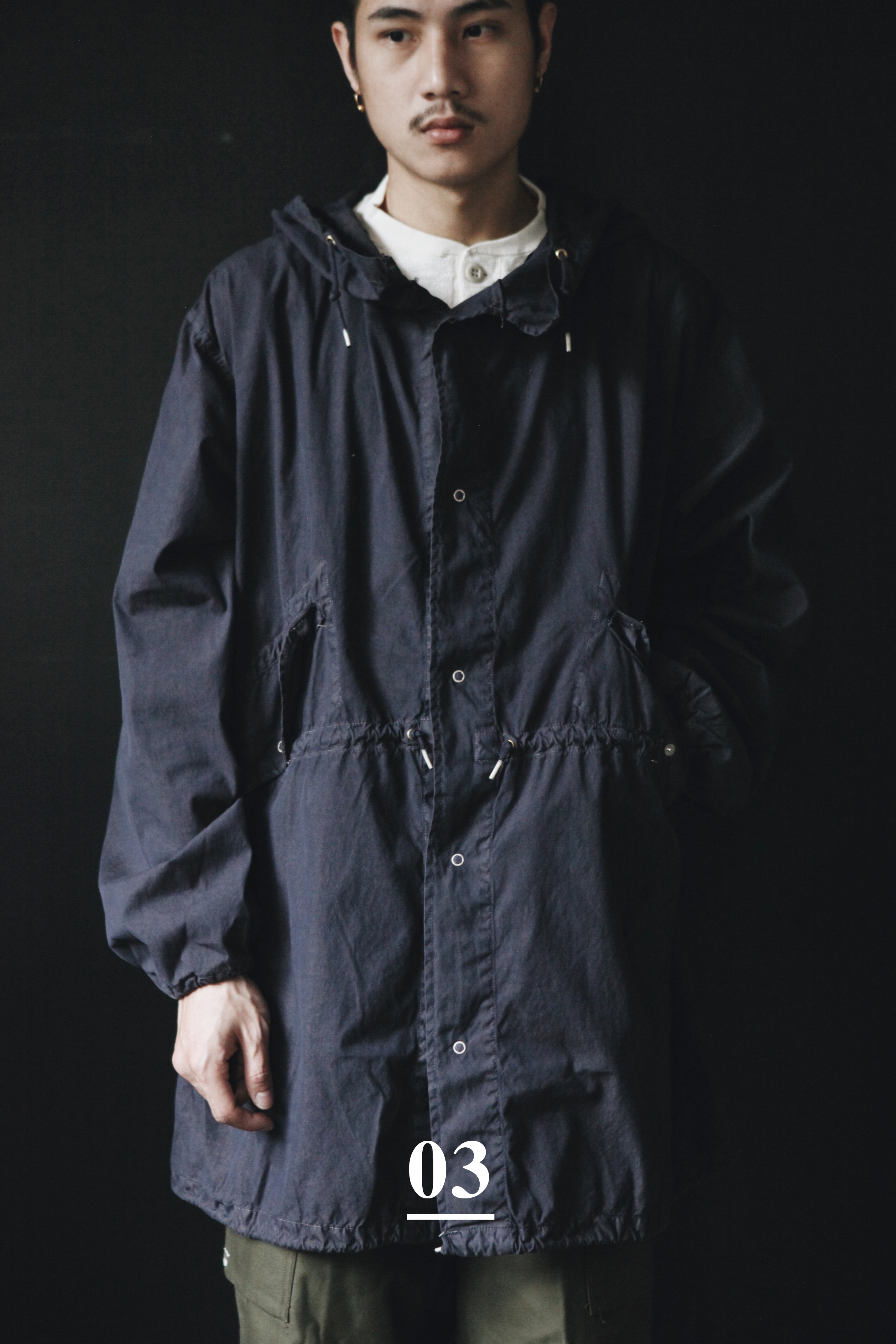 這款大衣早期是美軍在雪地使用的純白外罩大衣,含尼龍材質,最初設定為雪地作戰偽裝使用。後襬魚尾開衩的版型與知名的M65 fishtail parka有點類似,防潑水的輕薄布料使在裡頭的衣物不顯臃腫並維持乾燥;連帽、腰部及下擺處皆有抽繩防止雪及寒風灌入,輕便易折、好攜帶的輕薄雪衣經染製成深藍色後增加不少份量,更可以不怕髒的任意使用。