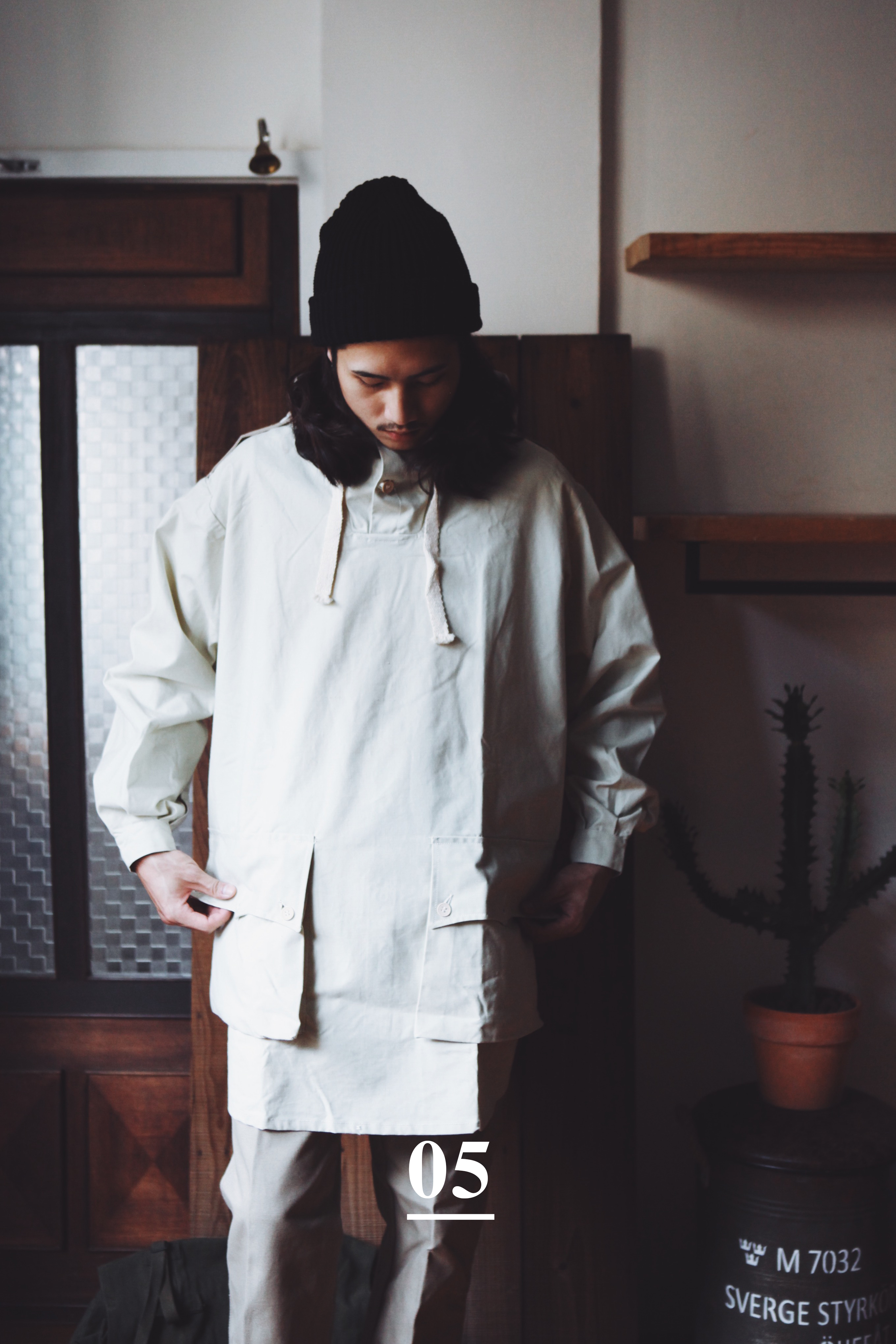 Anorak罩衫版型一般略寬大,我們搜集的type1紙鈕扣系列,連帽上附有兩條粗棉繩調節帽圍,前襟由兩個紙鈕扣開闔、袖口稍微縮起;下襬兩側各有附鈕扣的搶眼大口袋,套上它顯得相當有氣勢。