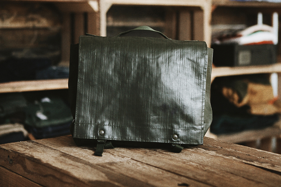 捷克裝載防毒面具的軍用單肩包,使用較有科技感的輕量防水橡膠布,頂部有提把;內裡為麻料材質,內附三個夾層空間,是顆大小合宜的深綠外出包,防水材質相當適合台灣潮濕的氣候!