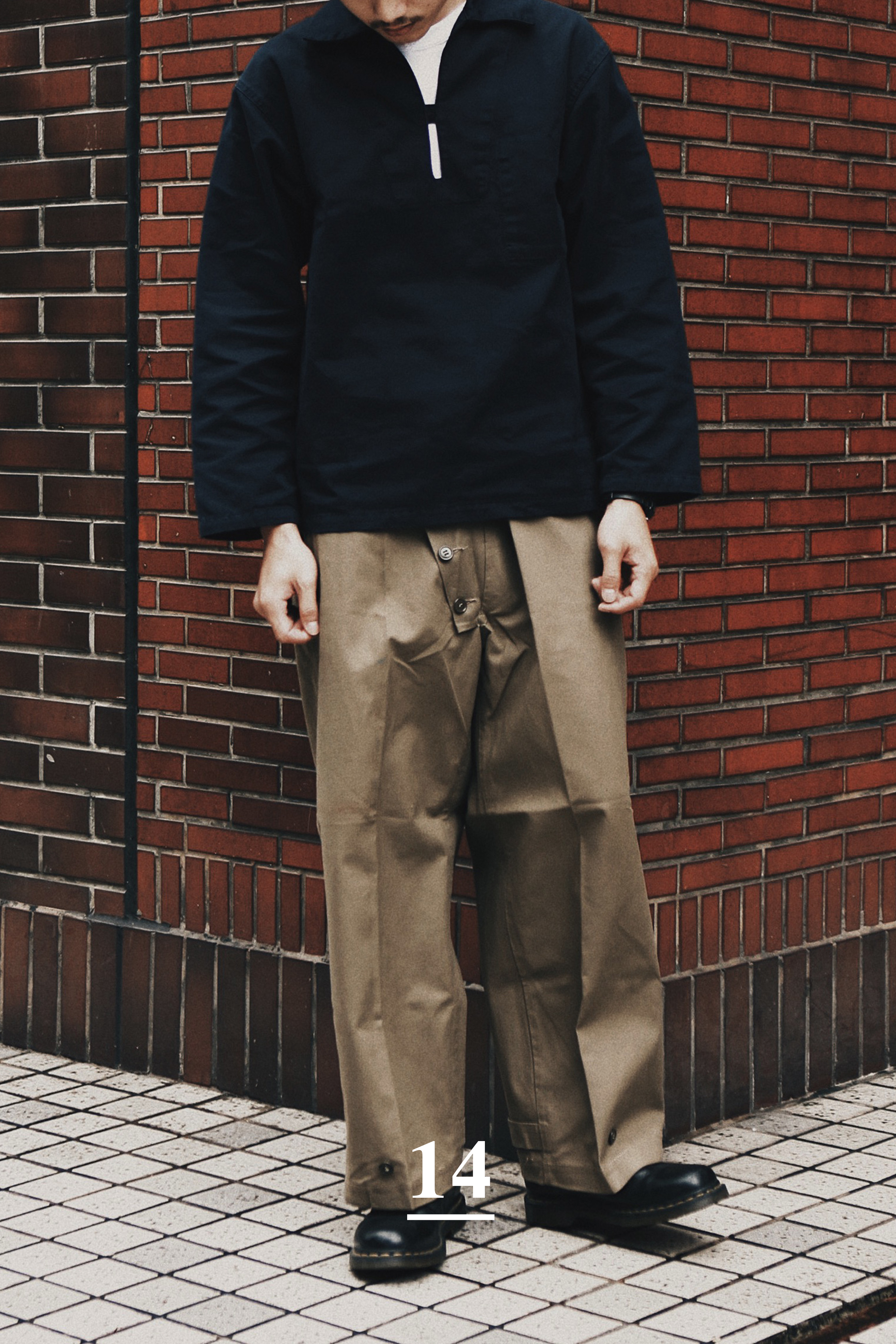 這款60年代提供給駕駛兵的義大利軍用雨褲,霸氣的寬版褲型以防潑水的軍布製成(平時以上蠟達到防水效果),相當硬挺有型;在縫合處的背面皆有布膠打底,因此防風防水的效果突出,腰間的腰帶設計也相當大氣,腰帶可以從30腰繫至36腰穿;褲扣處以三角斜裁布料為特色,非常具有義大利軍品誇張的特點。