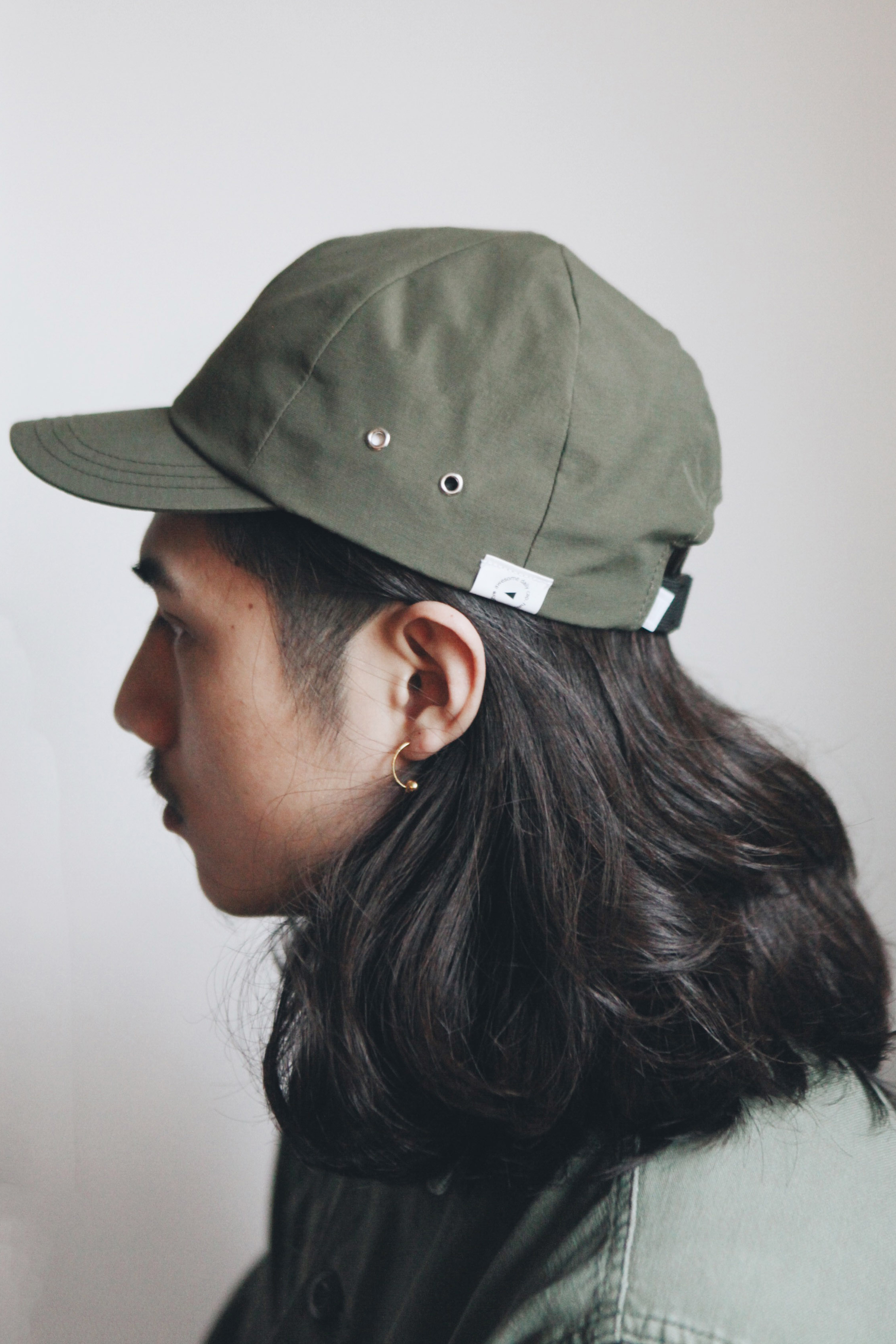 這頂棒球帽外層為尼龍材質,內裡為棉質,因此有一定的防潑水效果,兩側為金屬環的透氣孔洞,帽圍以尼龍繩扣環調節,外型簡單俐落。