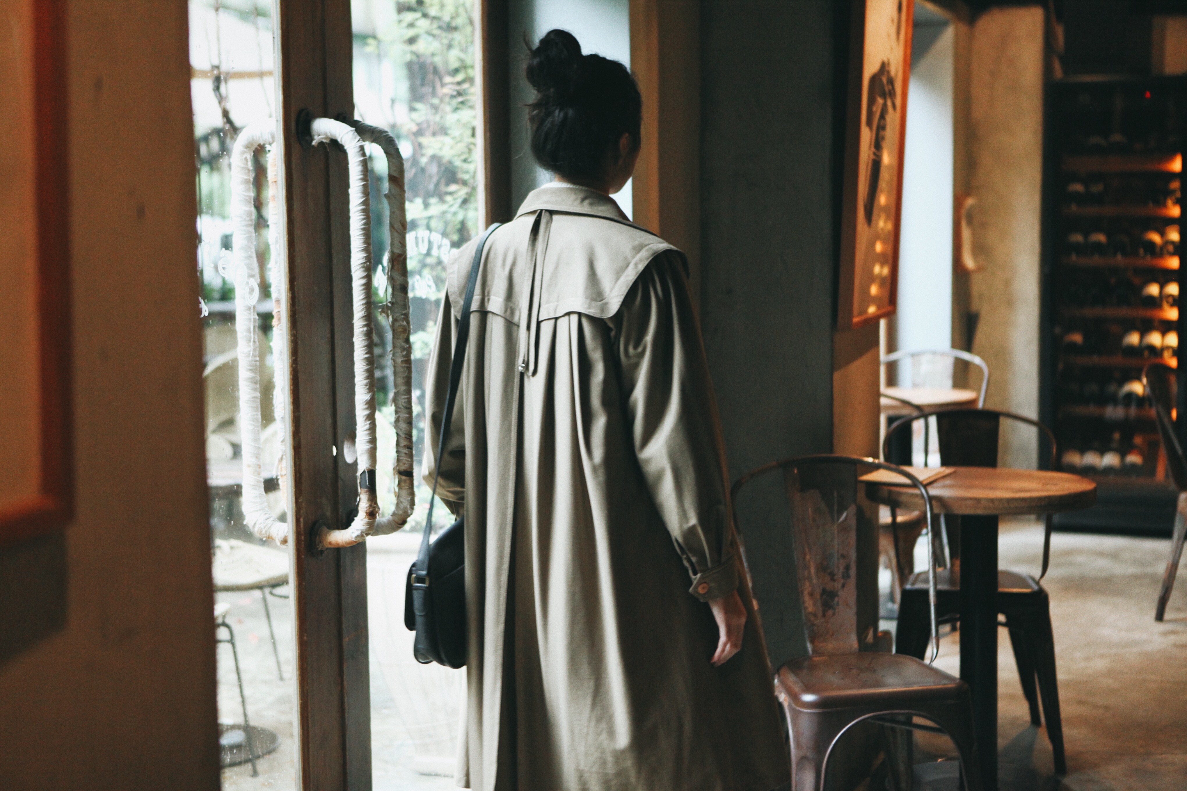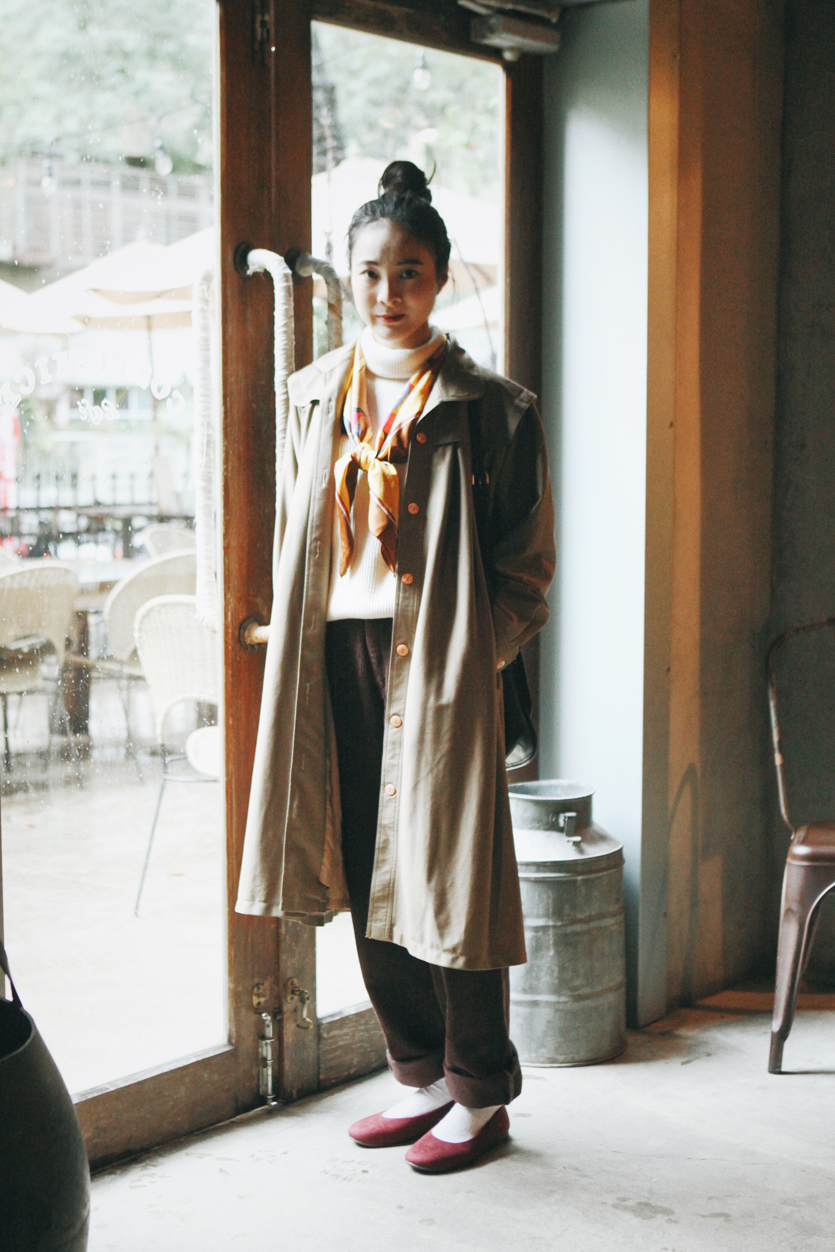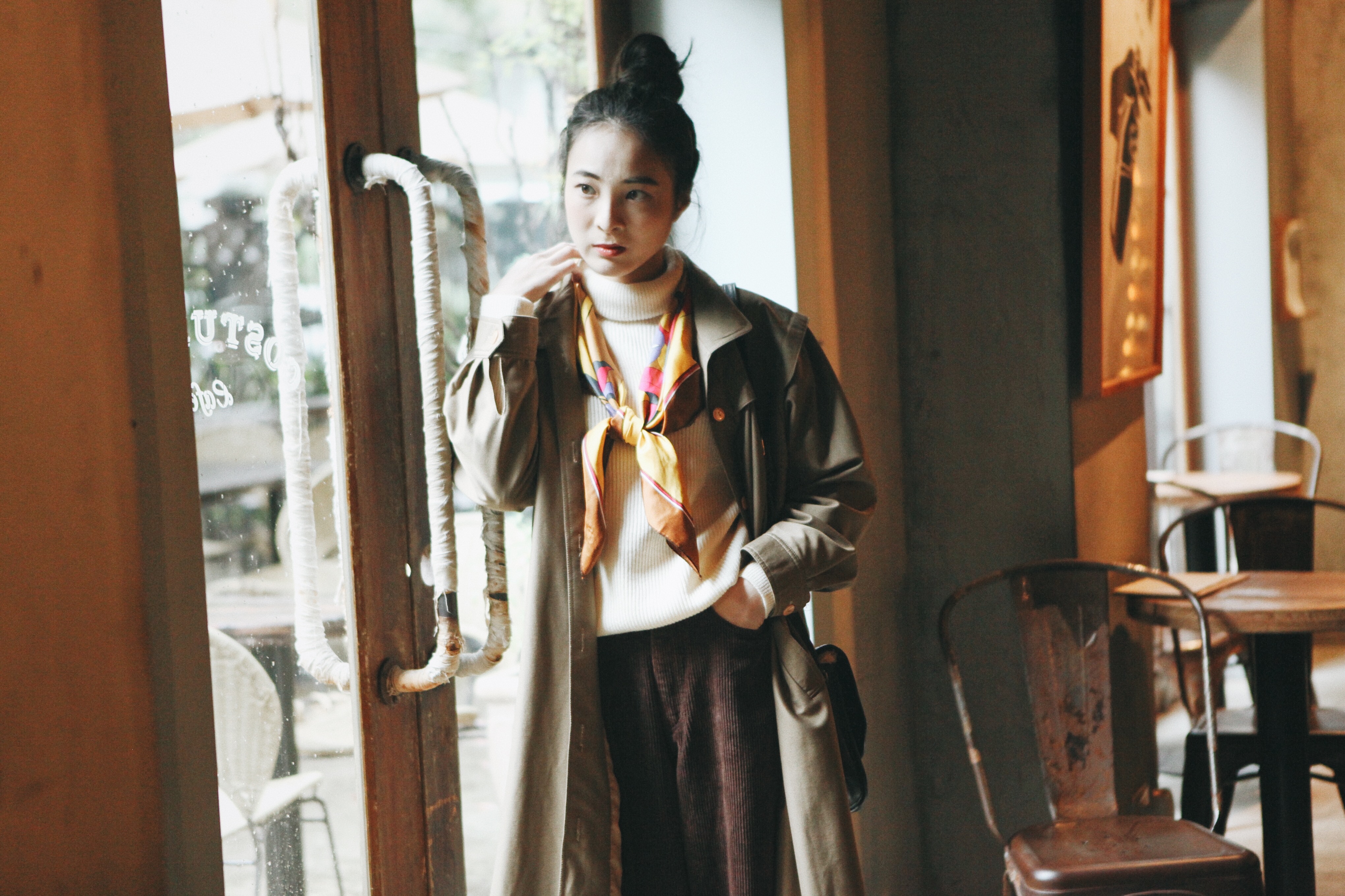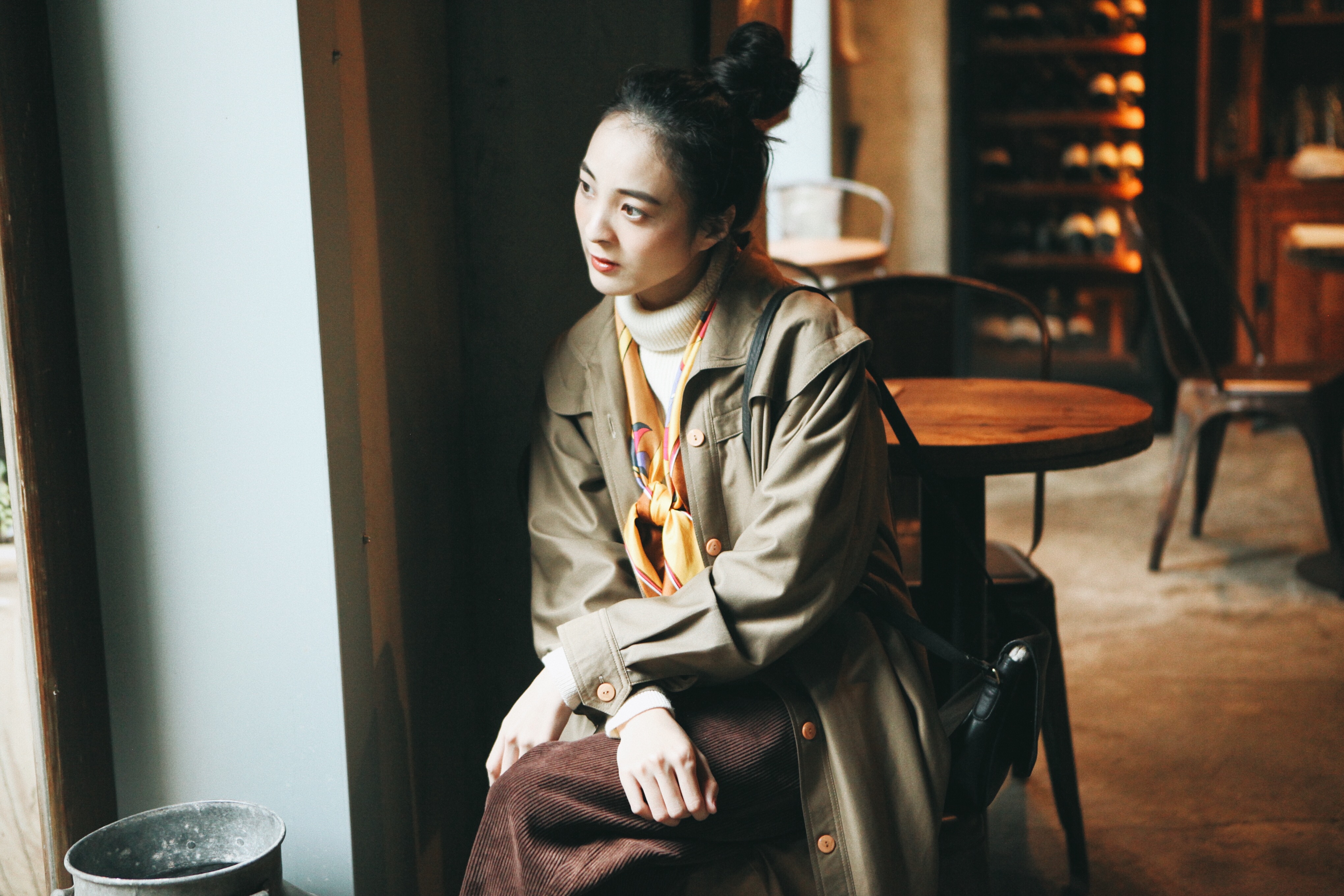 職場魅力女性一定要有的風衣,不像套裝那麼正式,也不會像運動外套過於休閒,展現專業與穩重形象。進入室內換下外套裡面是Vincent et Mireille的英國羊毛毛衣,富有油脂的羊毛編織成的毛衣帶著醇厚質感。與米色相似色的鵝黃領巾是你展現穿搭技巧處;深棕色燈芯絨褲舒適實穿。