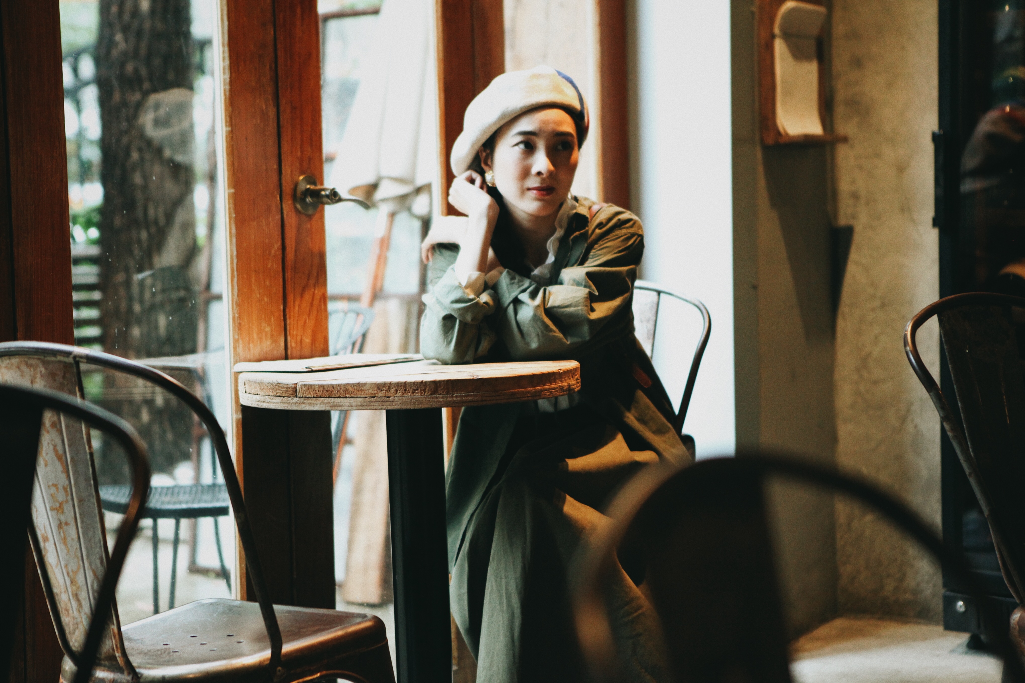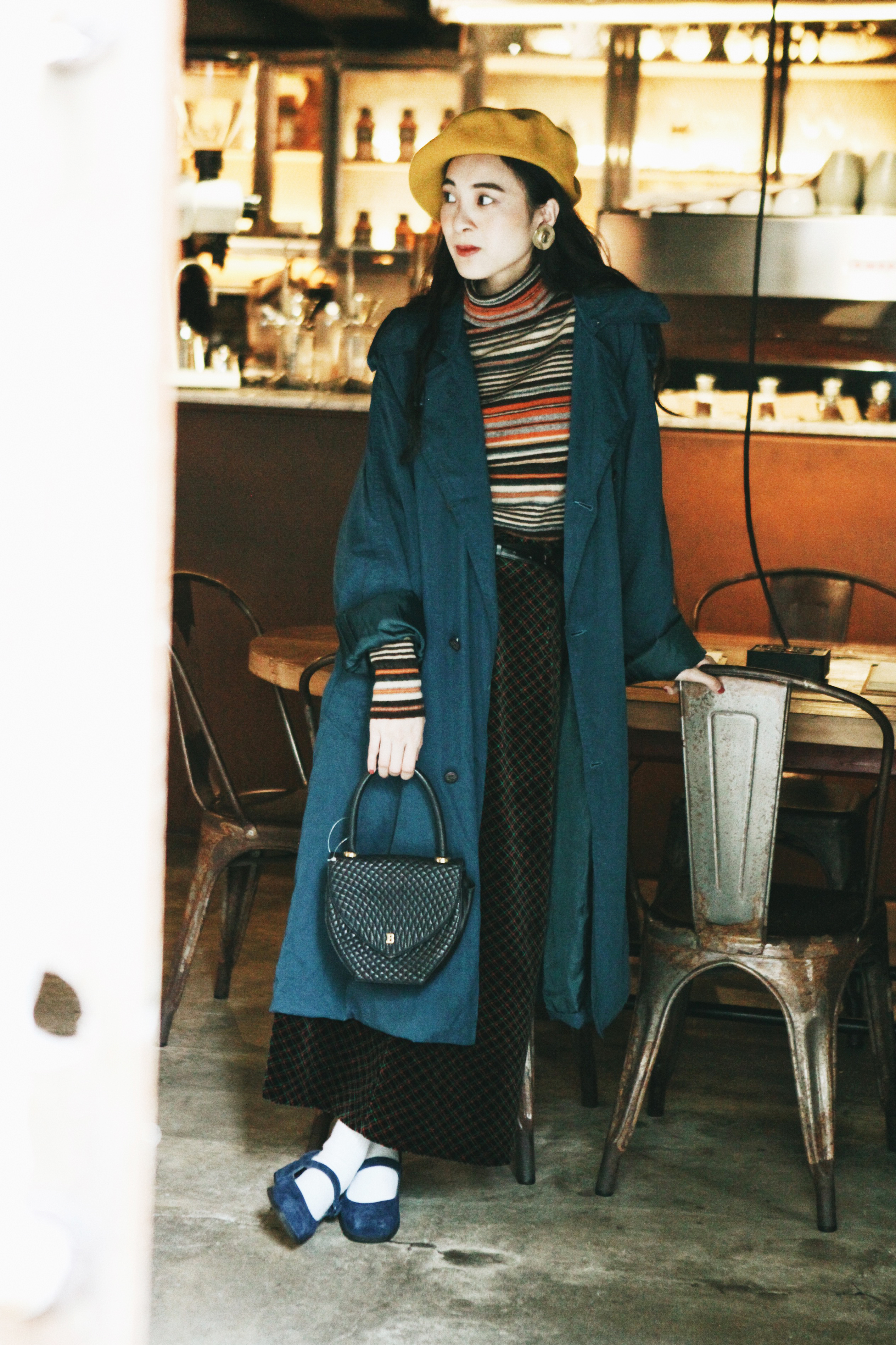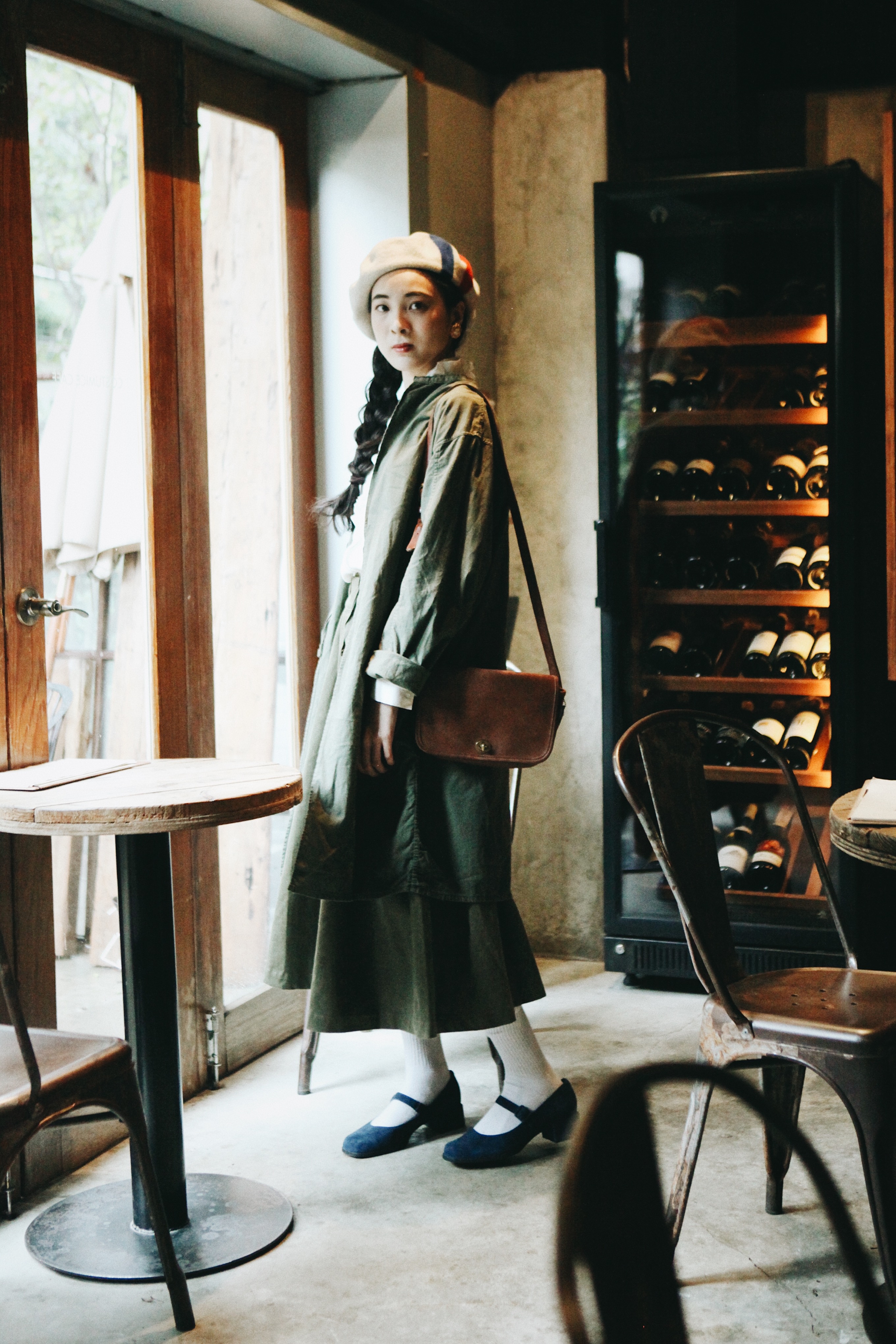 以軍綠完成同色系的約會搭配, 軍綠色瑞典軍醫療用長袍與A ROOM MODEL自製裙的巧妙組合,使上下身具有套裝般的整體性;內搭領子有著立體摺紋的白色絲質襯衫,為上身增添份量;法國貝雷帽戴在蓬鬆髮辮上顯得朝氣十足。