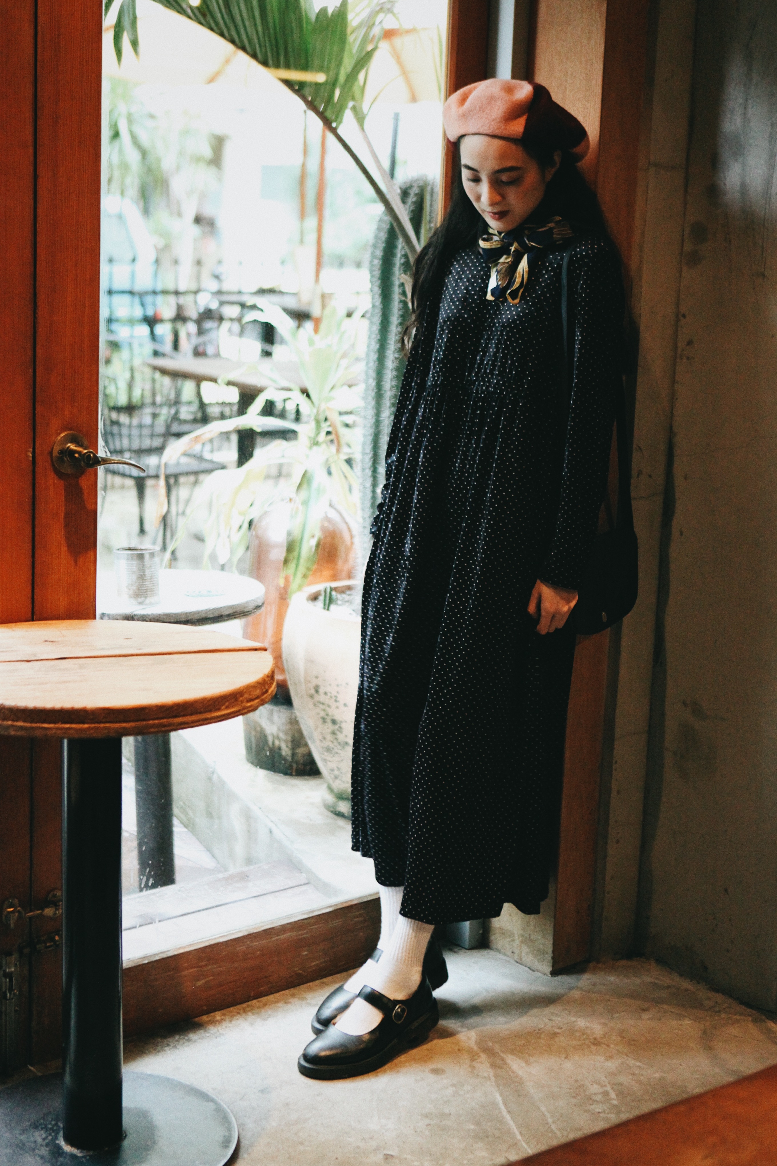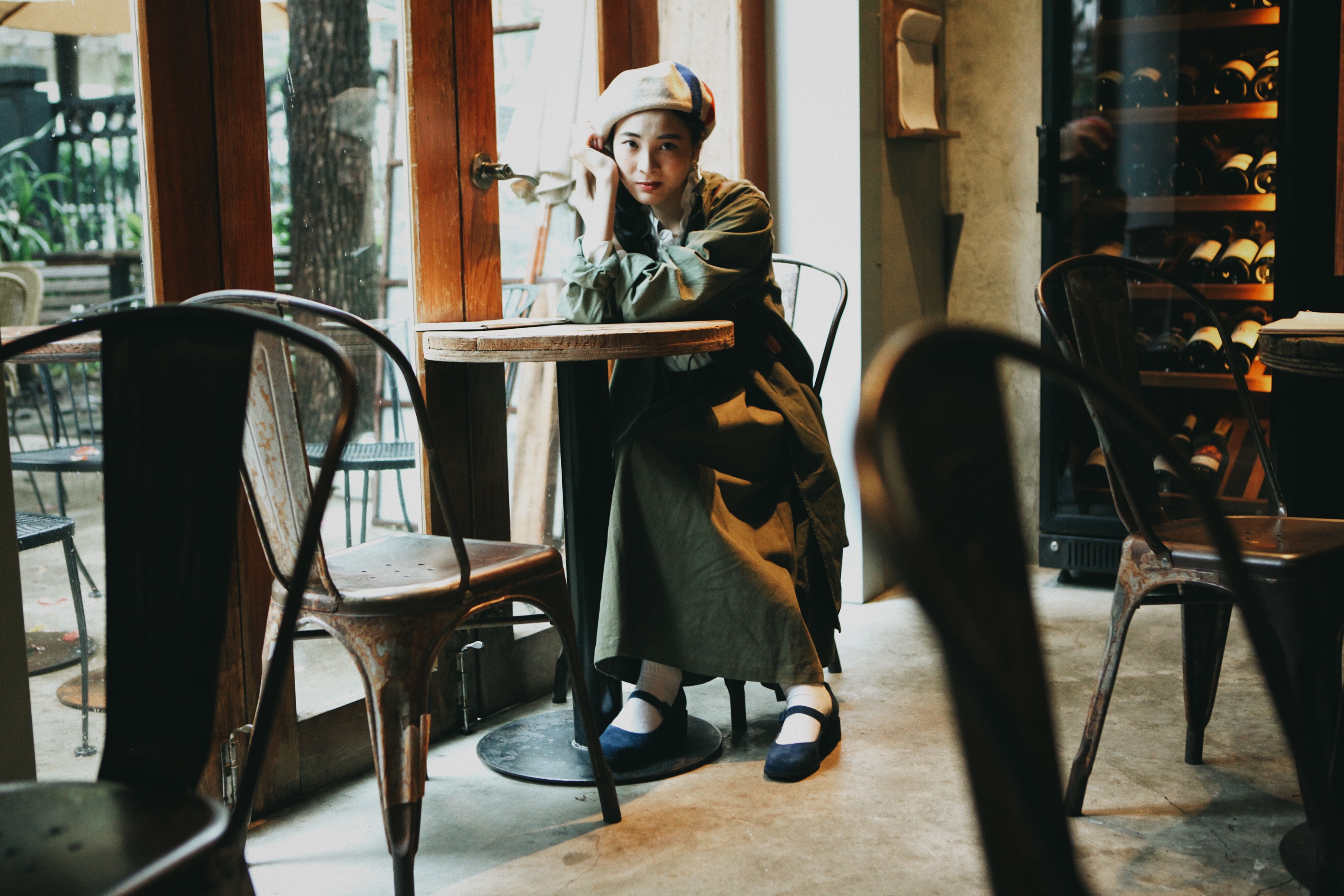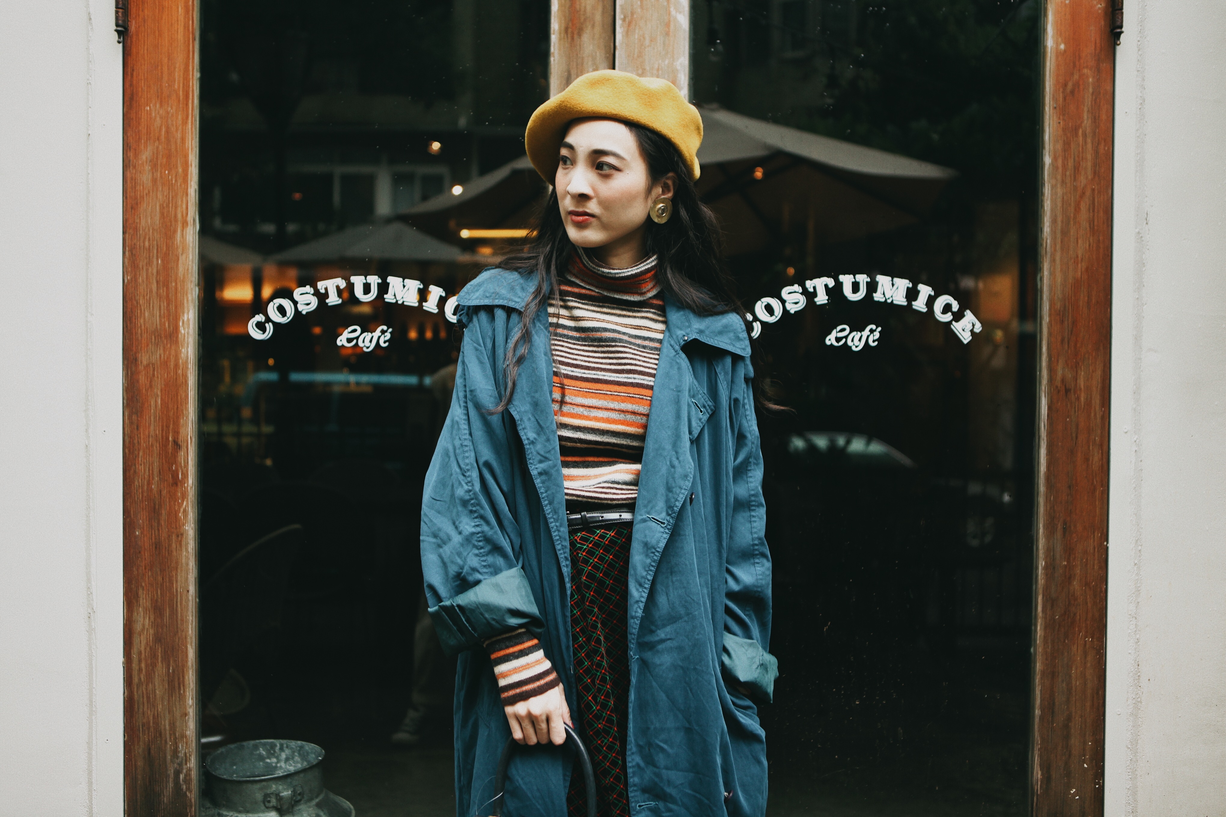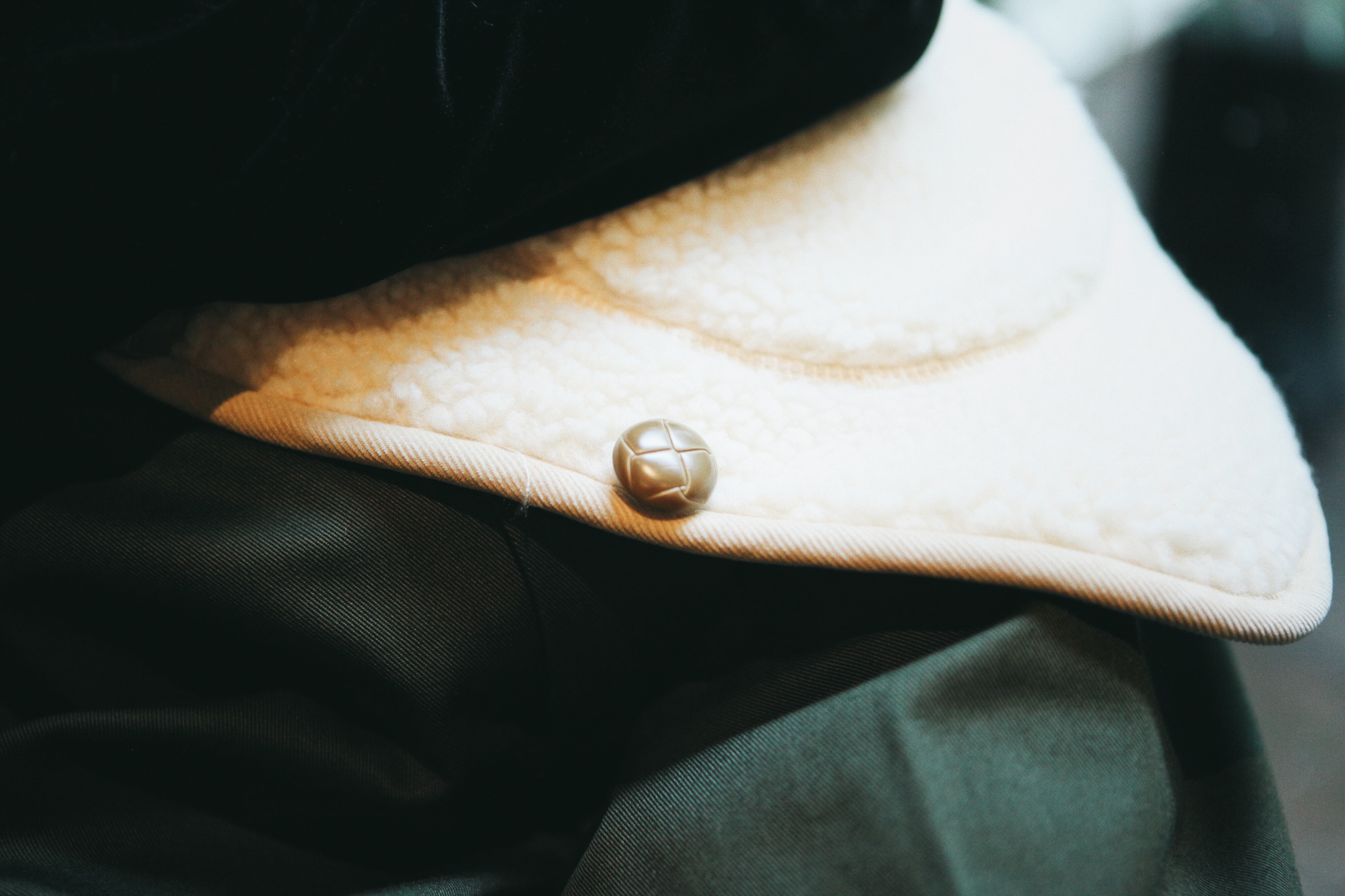 以軍綠完成同色系的約會搭配, 軍綠色瑞典軍醫療用長袍與A ROOM MODEL自製裙的巧妙組合,使上下身具有套裝般的整體性;內搭領子有著立體摺紋的白色絲質襯衫,為上身增添份量;法國貝雷帽戴在蓬鬆髮辮上顯得朝氣十足。