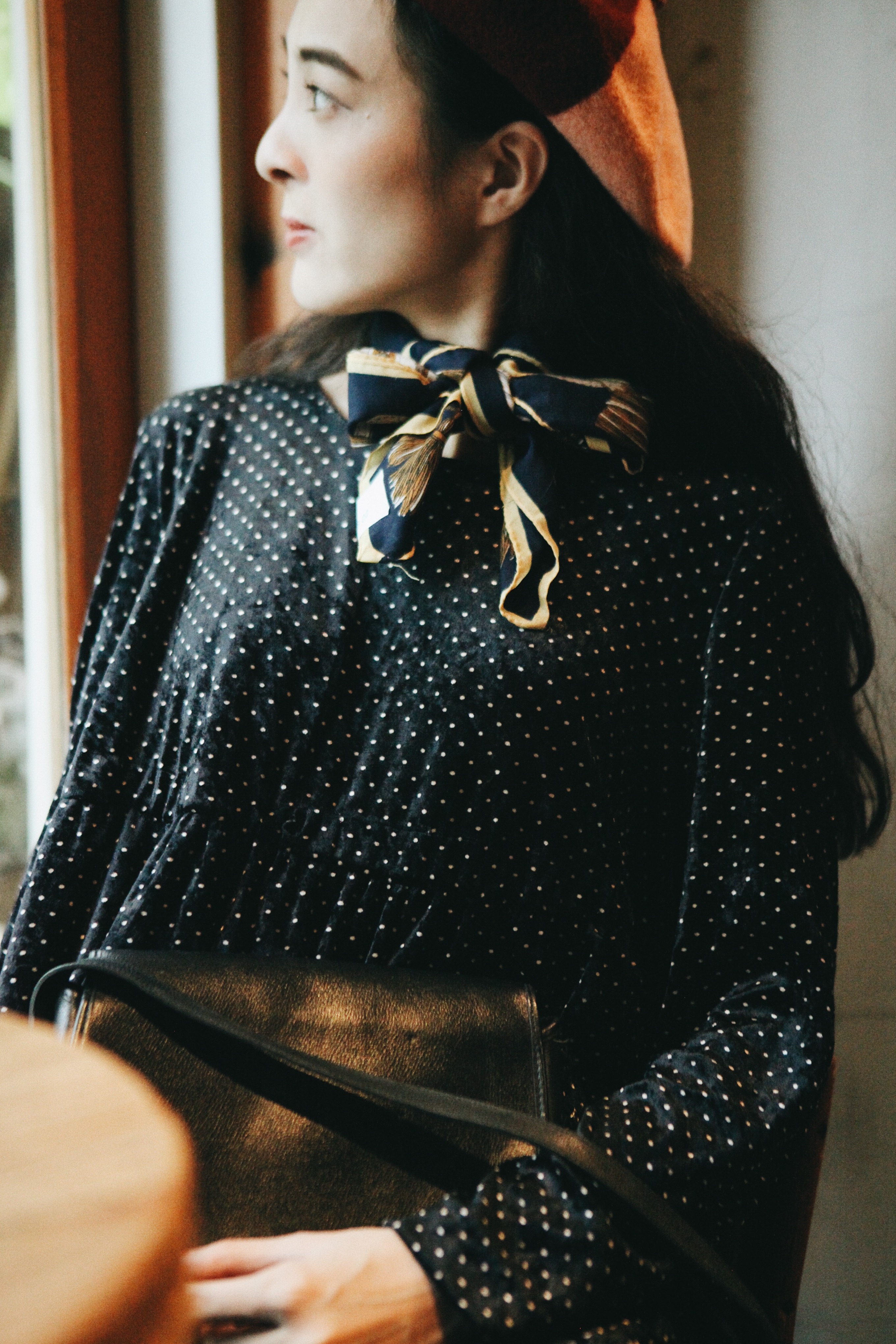 在閨蜜中總是搭配領頭羊的你對於材質的掌握也高人一等,這次聚會特別挑了近幾年越來越醒目的天鵝絨材質洋裝,布料具有波光淋漓的色澤,將絲巾在領口打結,加上莓果色貝雷帽為搭配添加豐富性。