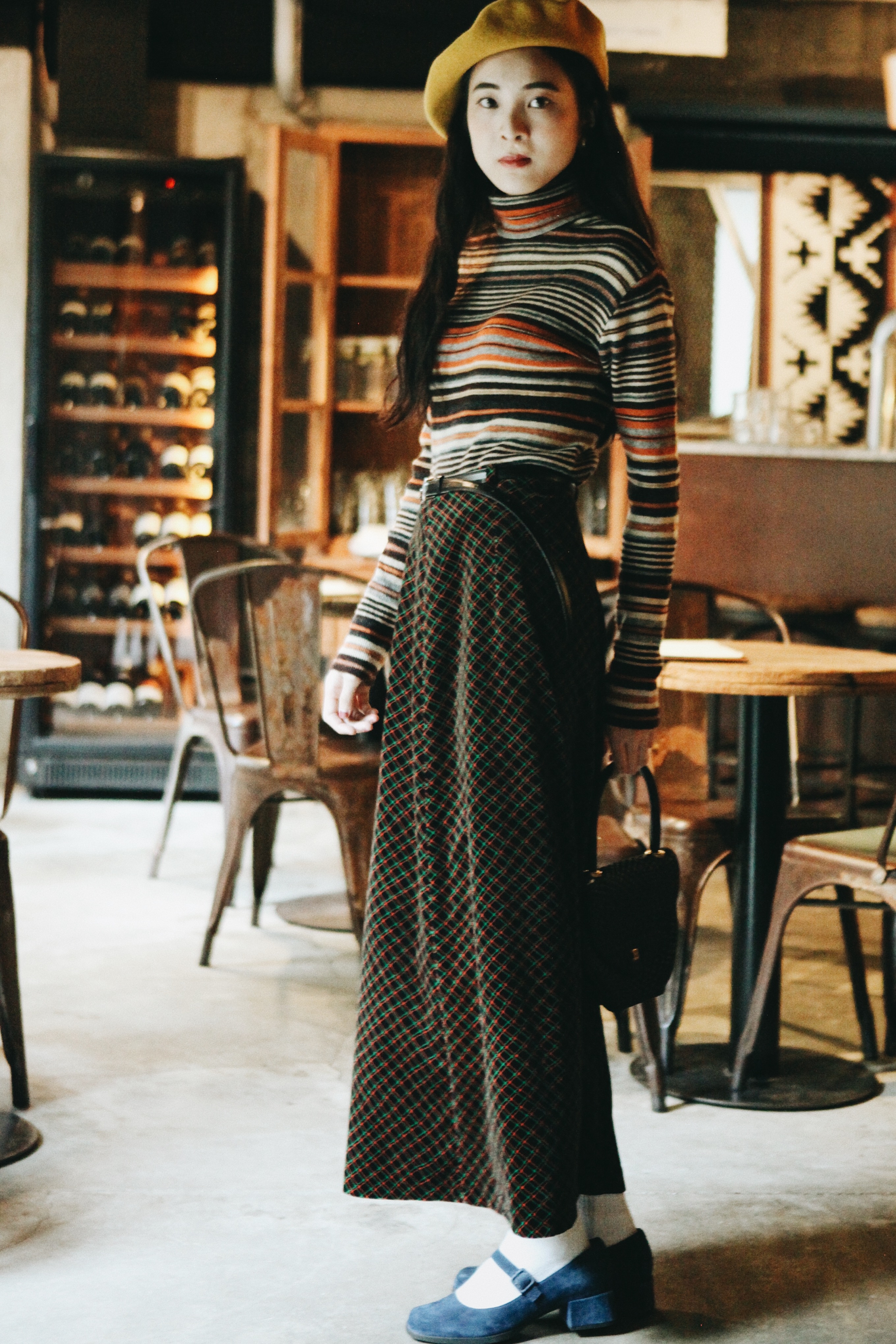 即使是不露出肌膚的秋冬季節,合身針織上衣也能修飾出良好身形,不減損個人魅力;搭配格紋天鵝絨長裙,垂墜感材質讓女生在意的下半身因布料的特性而大大顯瘦;寶藍色風衣及黃色貝雷帽更是配色大膽搶眼之處。