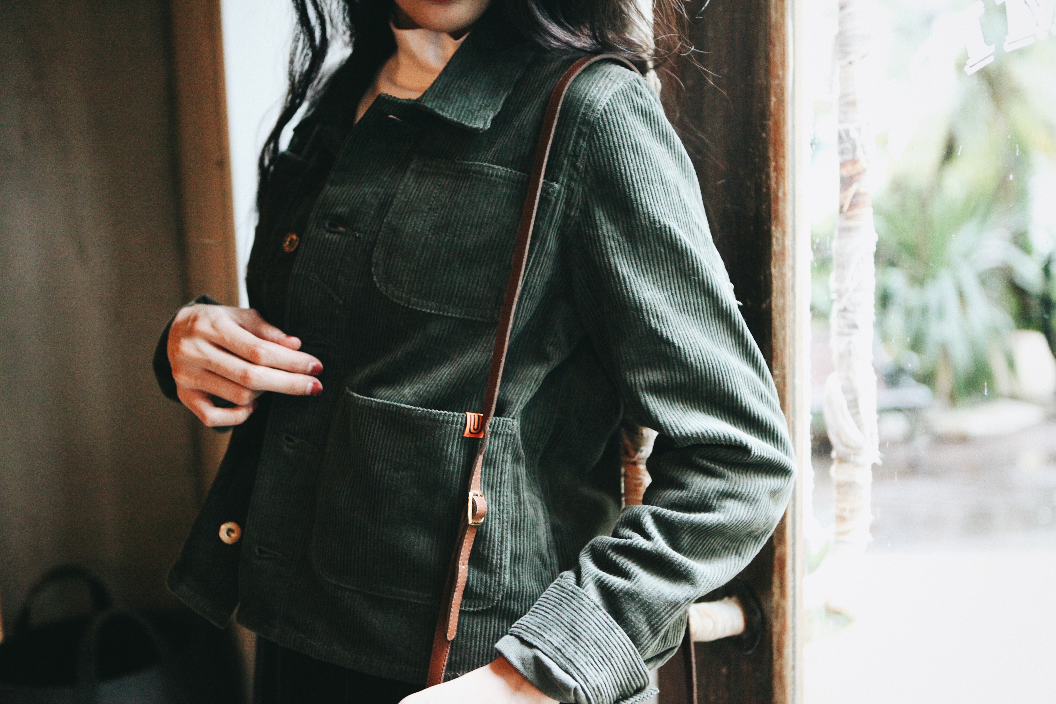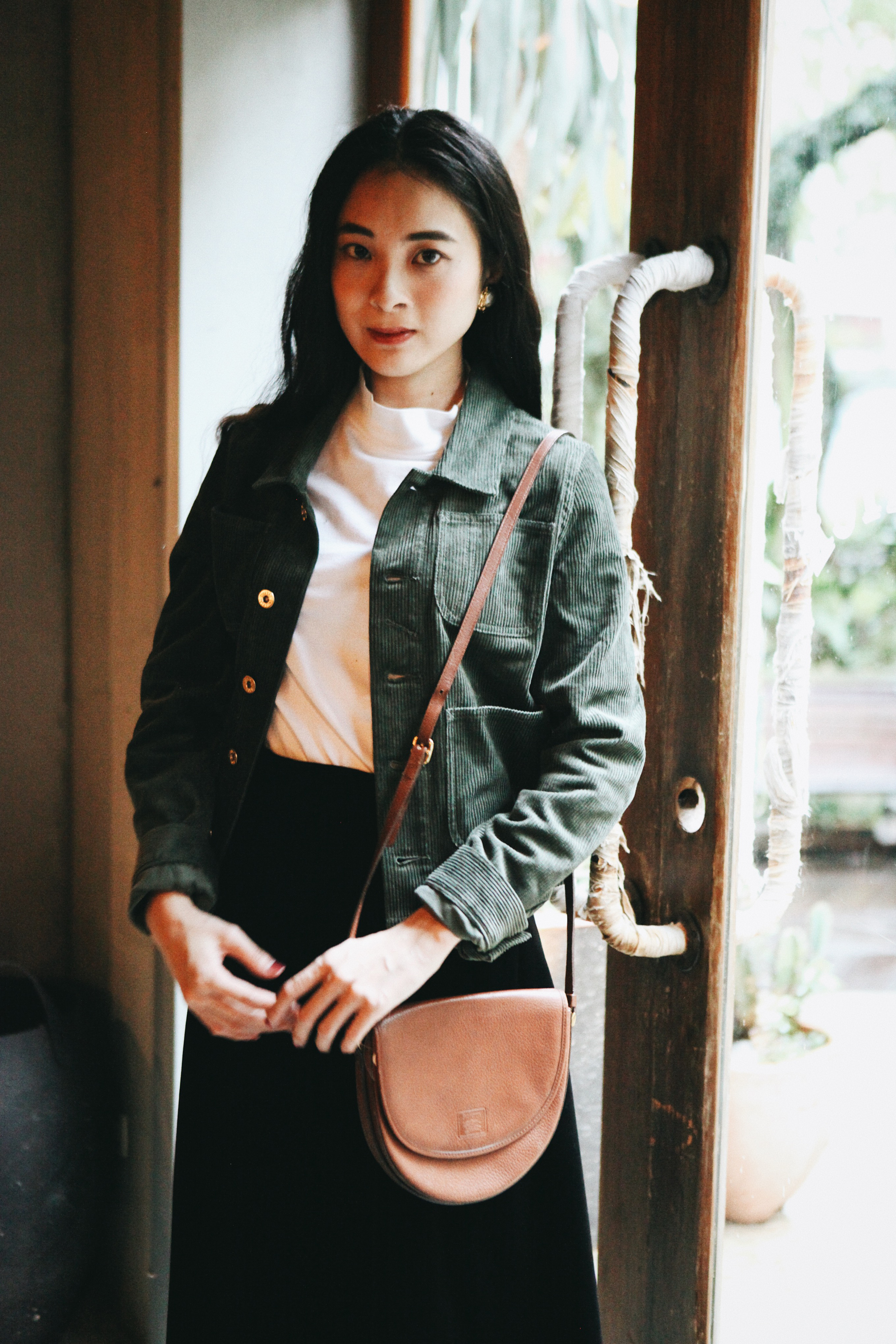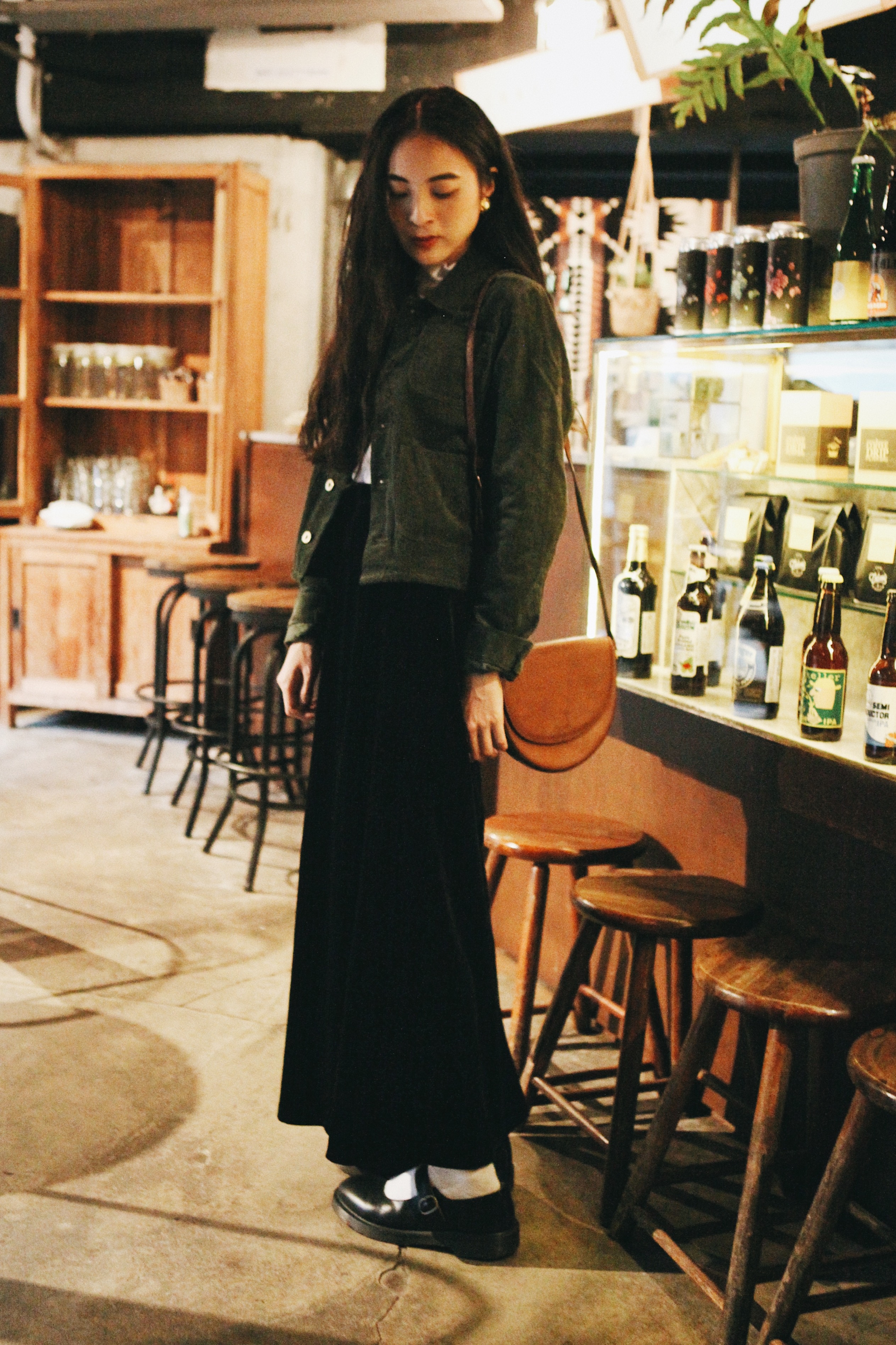 不論是與剛認識不久對象的初次約會,或是與熟悉另一半的假日約會,能夠盡情打扮是件讓人雀躍的事,穿著近期剛入手的墨綠燈芯絨外套,搭配Vincent et Mireille白色高領上衣、黑色天鵝絨長裙,配著Burberry的皮革包包,頭髮隨性披在肩後,偏暗色調搭配具有成熟神秘氣息。
