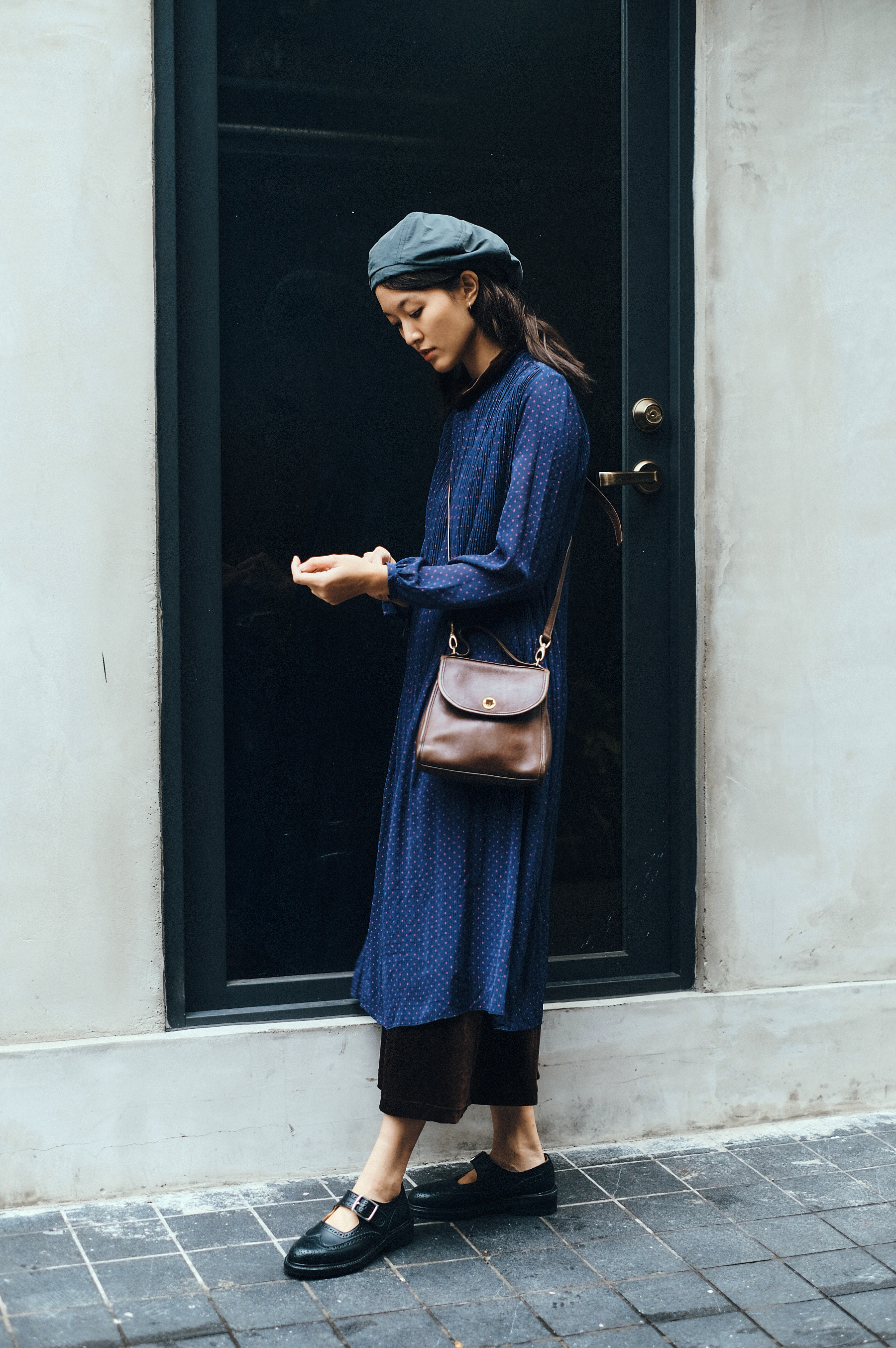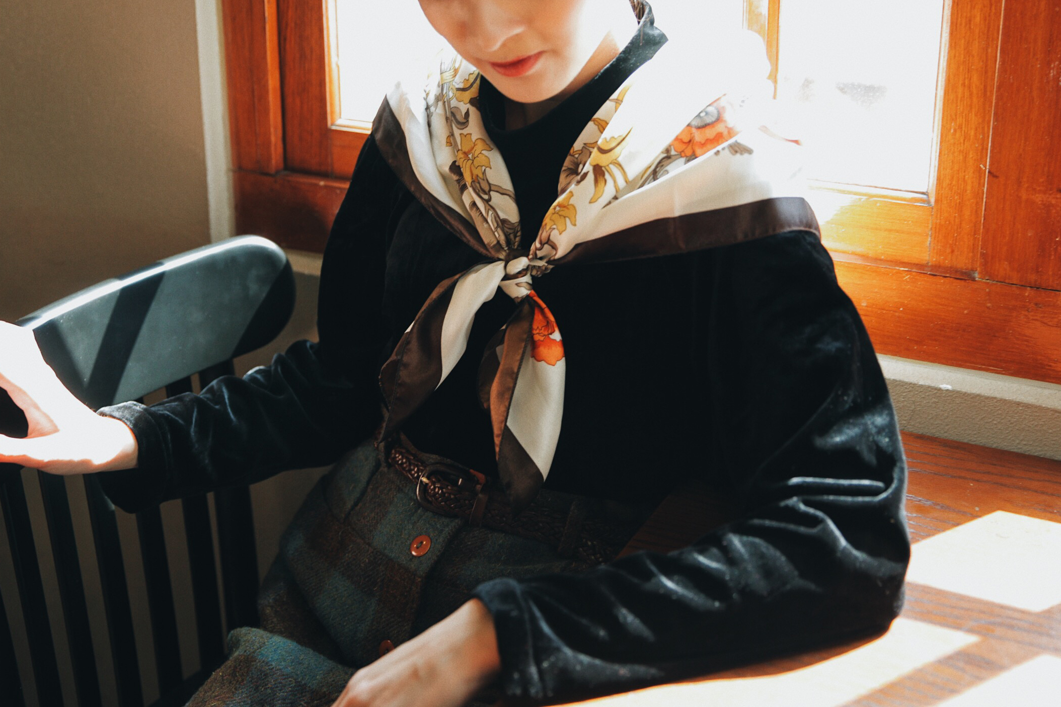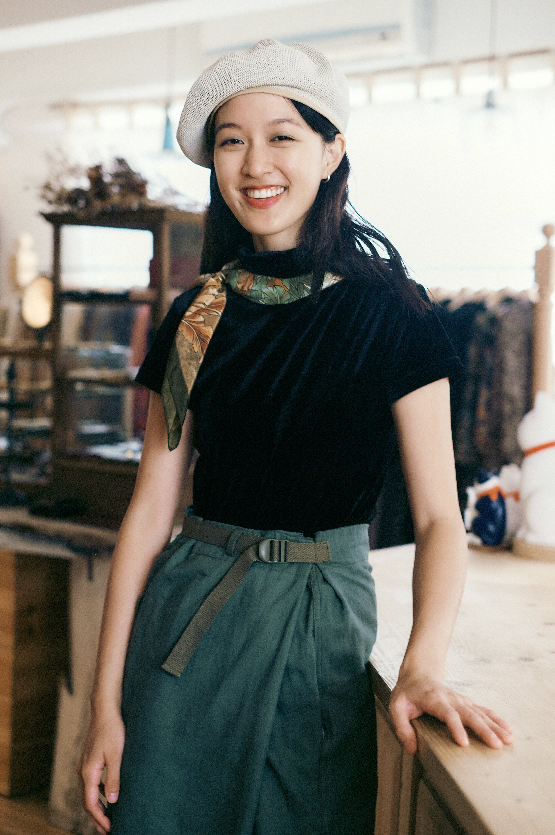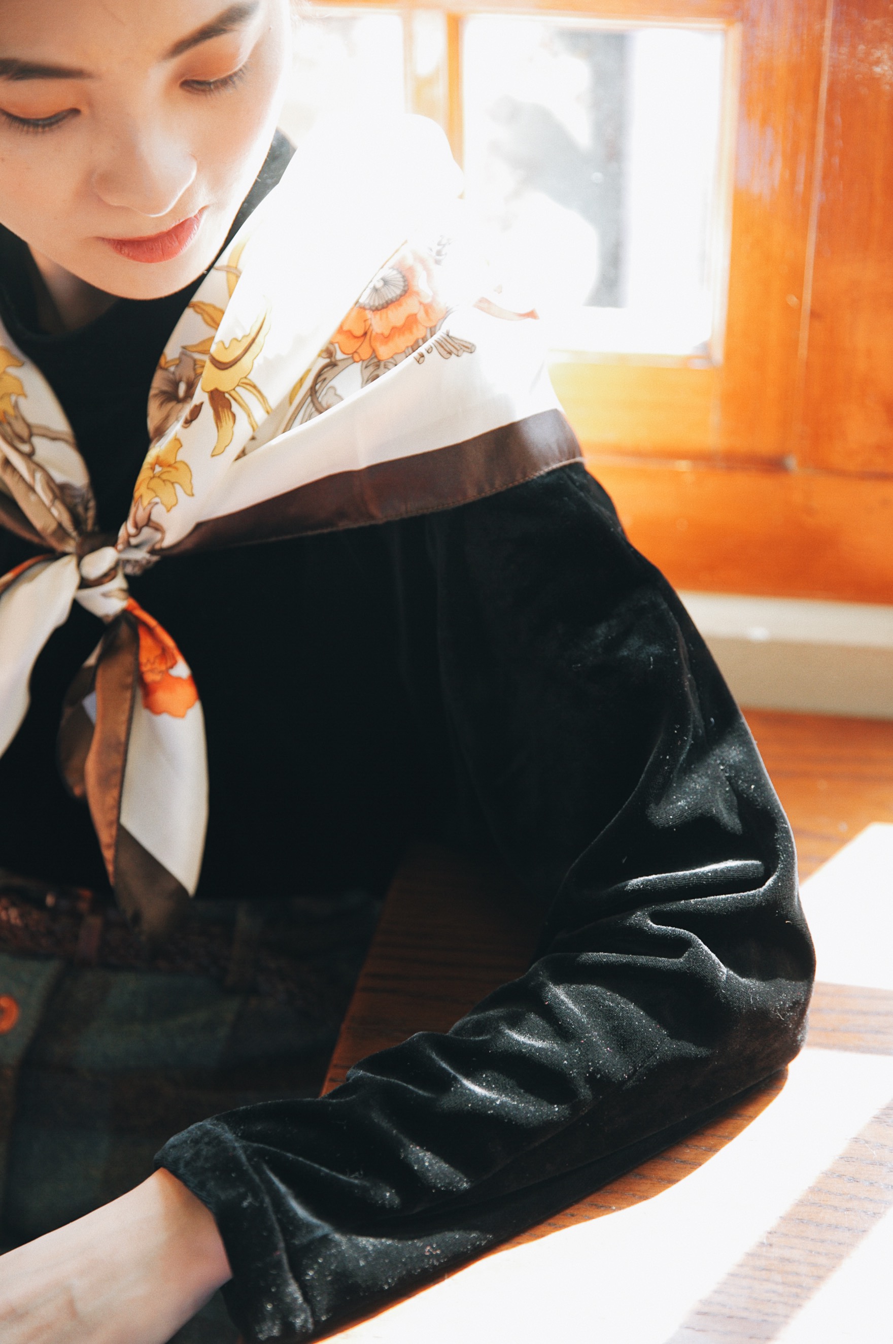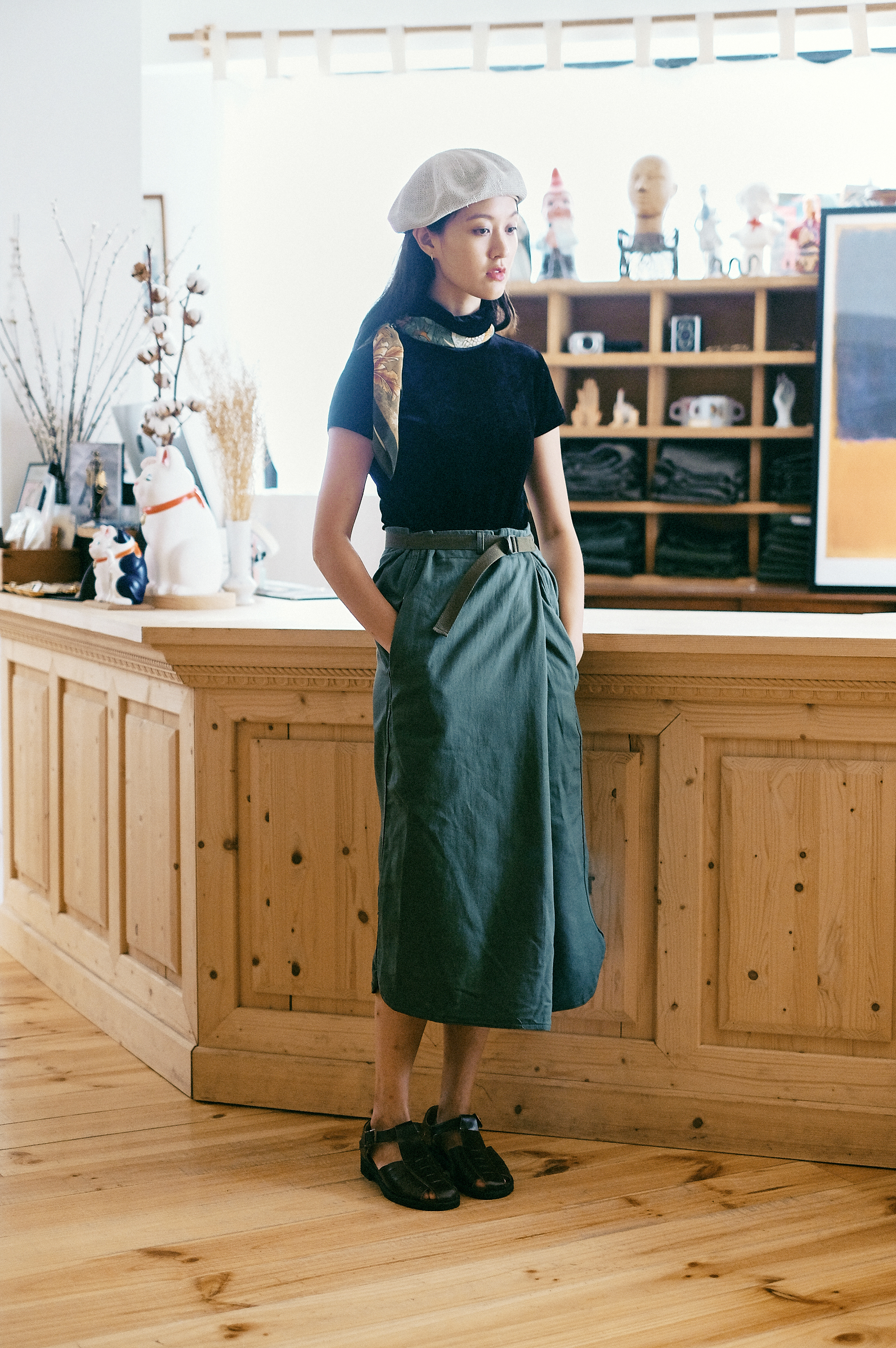 黑色的天鵝絨上衣,具有低調與奢華抗衡的衝突氛圍。可以適時地搭配絲巾,提亮上身裝扮。下身以A ROOM MODEL獨家款A字長裙,擄獲眾人視線。這款長裙以美軍布料改製而成,雙側調節釦之設計,讓穿衣者可以根據自身需求調整腰線,帶出個人身形優點。同樣為古著的捷克軍用涼鞋,以其歐式典雅的挖空設計,讓這次的搭配滿載時代交融的多重美感。