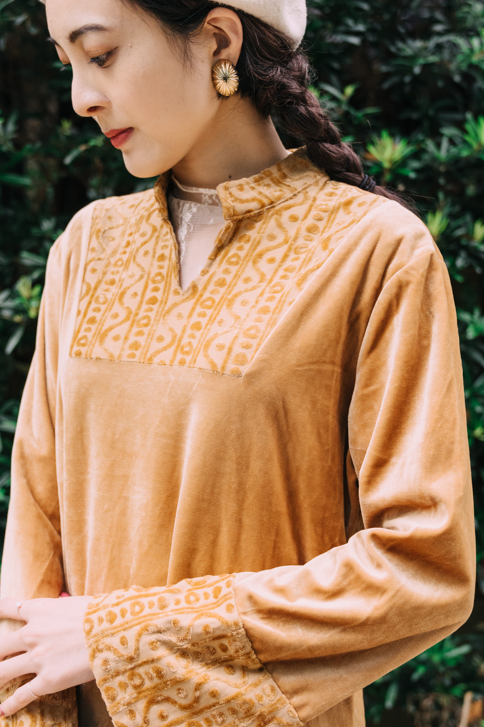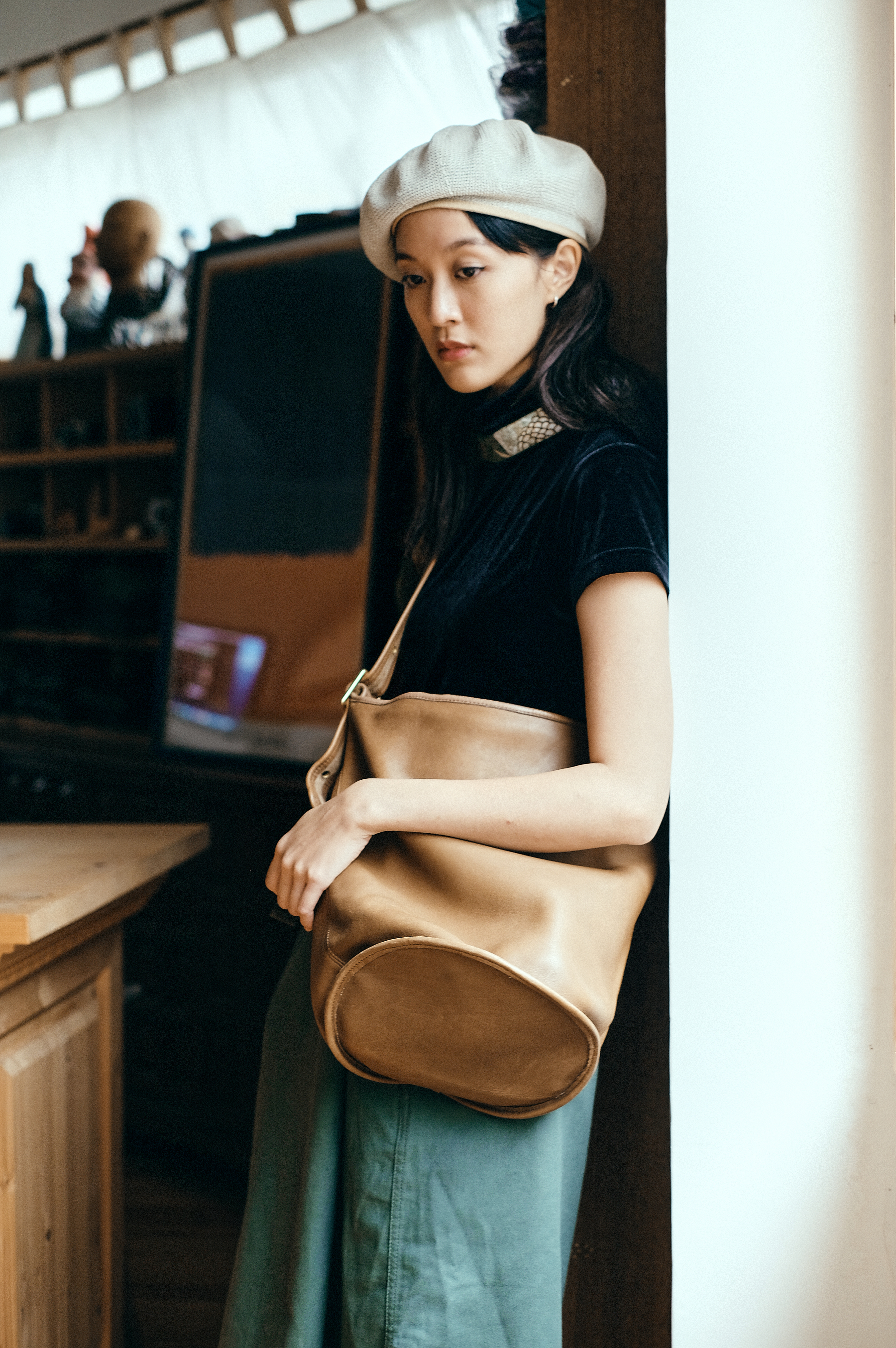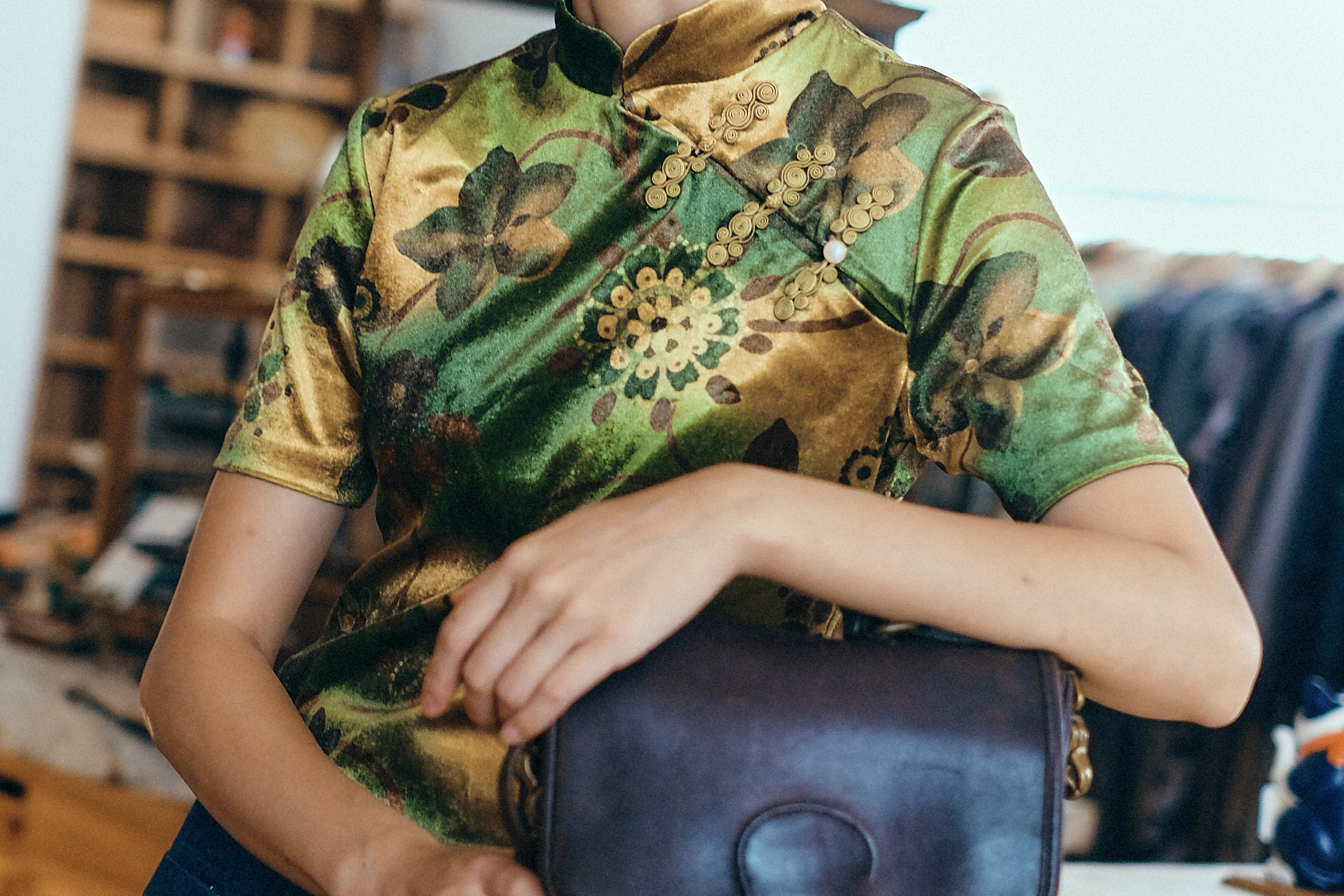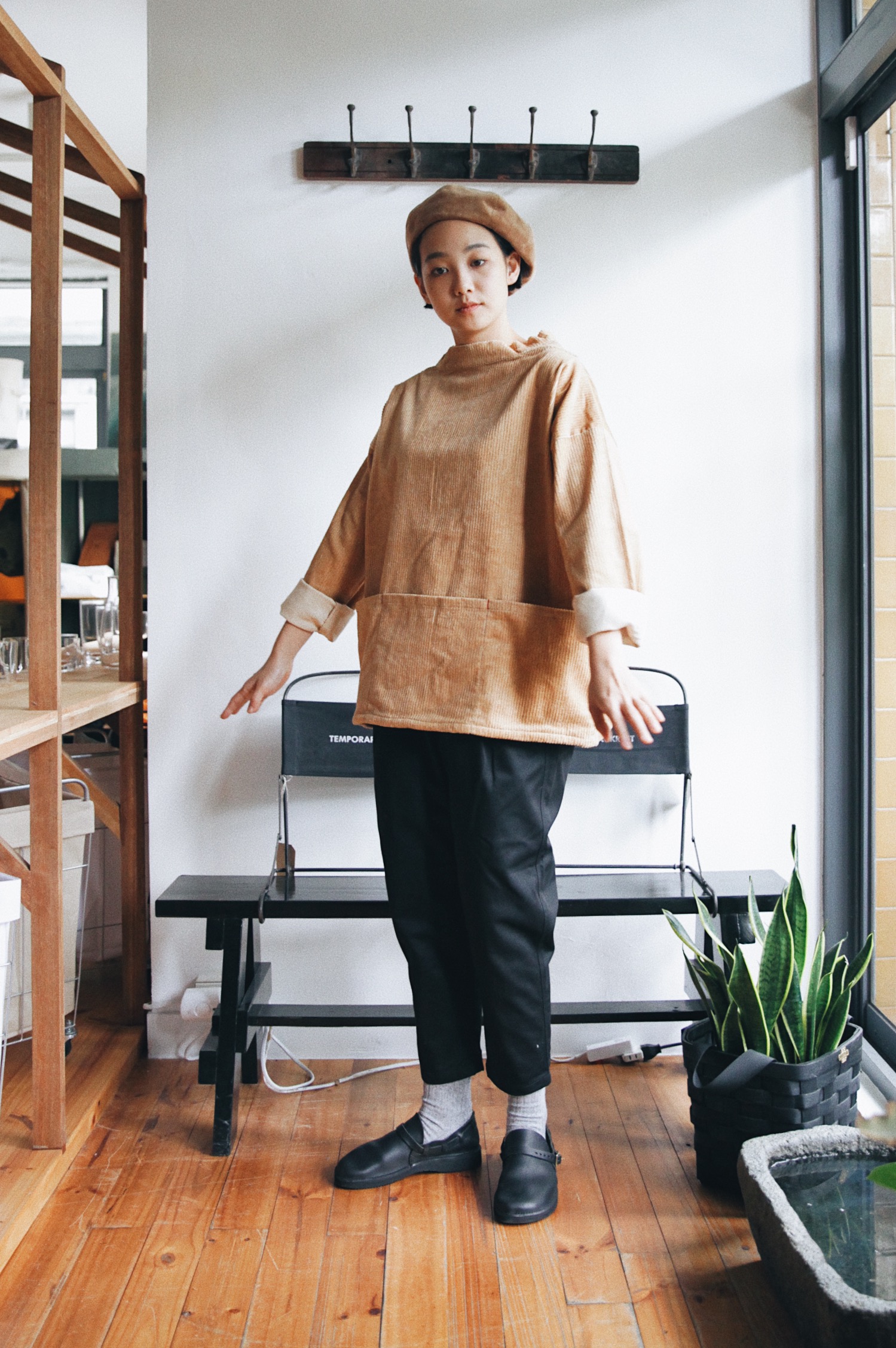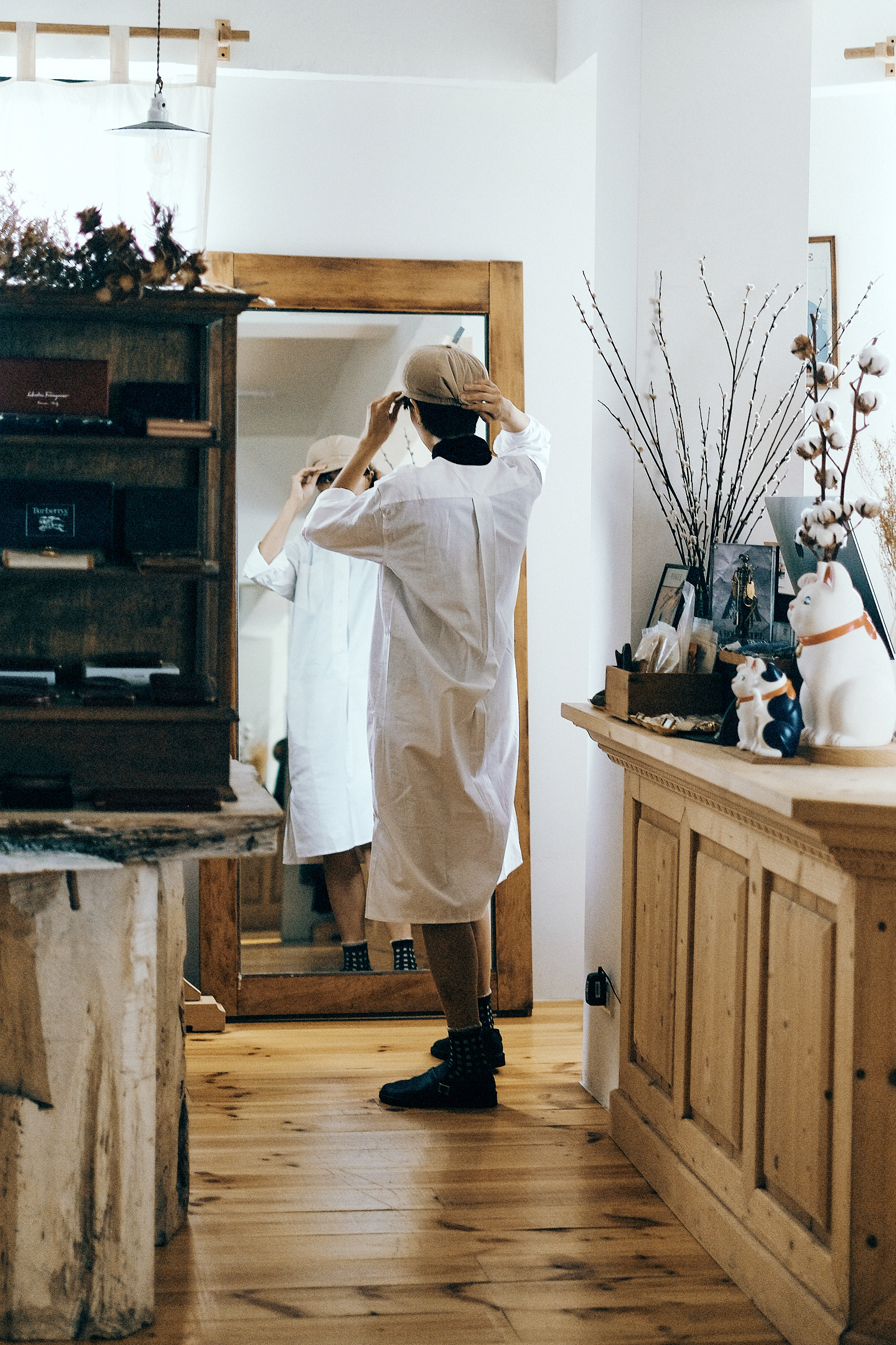 黑色的天鵝絨上衣,具有低調與奢華抗衡的衝突氛圍。可以適時地搭配絲巾,提亮上身裝扮。下身以A ROOM MODEL獨家款A字長裙,擄獲眾人視線。這款長裙以美軍布料改製而成,雙側調節釦之設計,讓穿衣者可以根據自身需求調整腰線,帶出個人身形優點。同樣為古著的捷克軍用涼鞋,以其歐式典雅的挖空設計,讓這次的搭配滿載時代交融的多重美感。