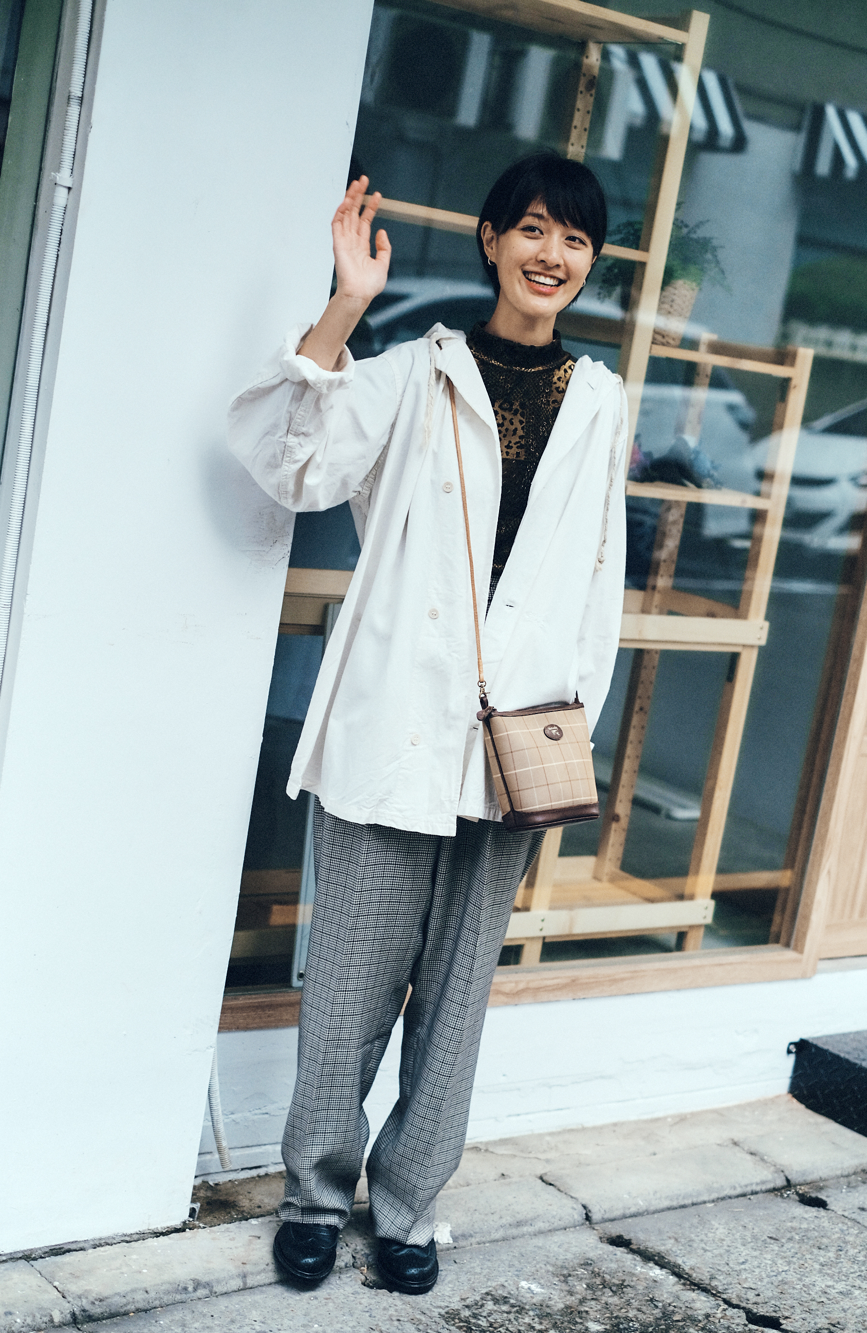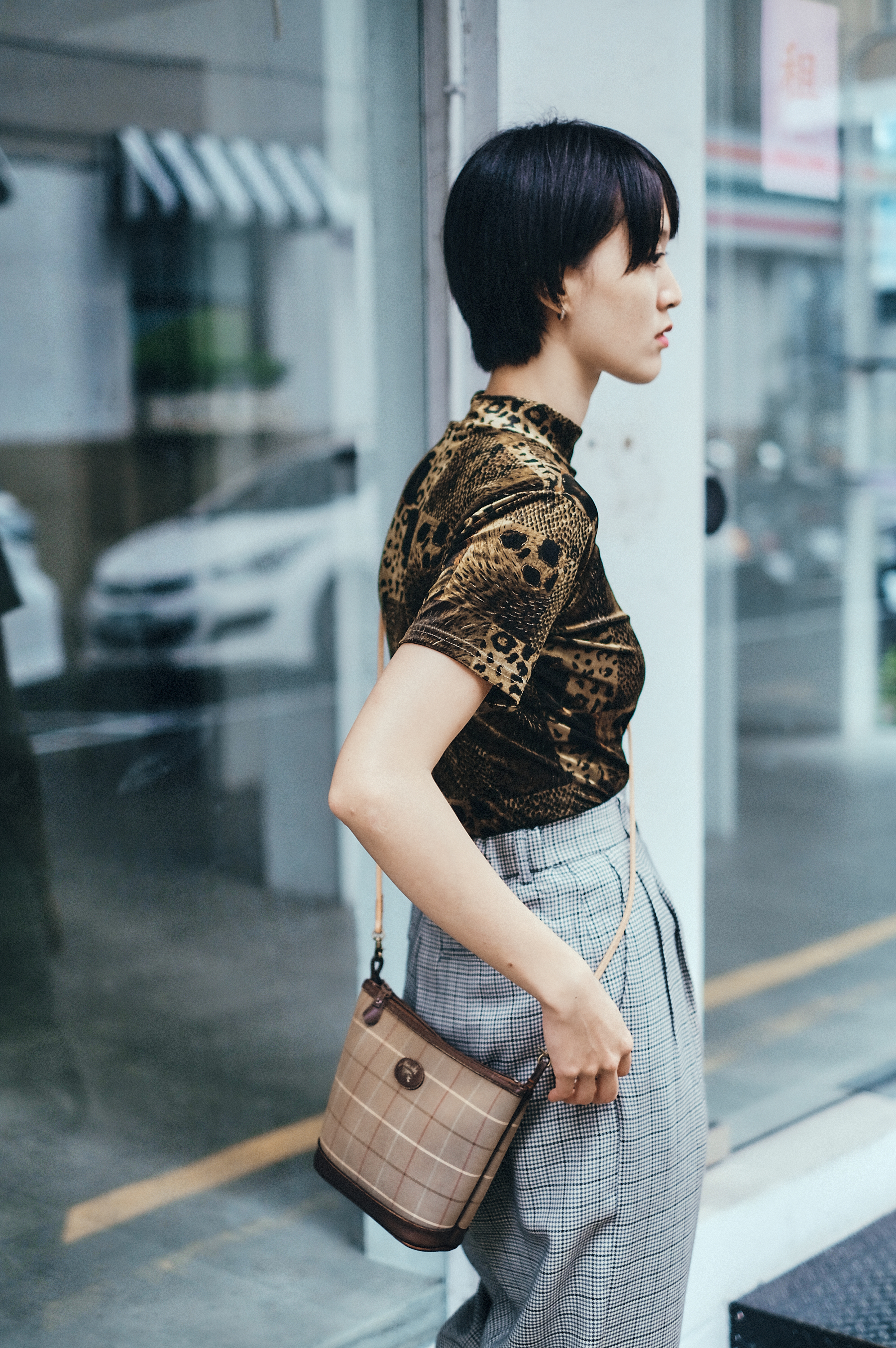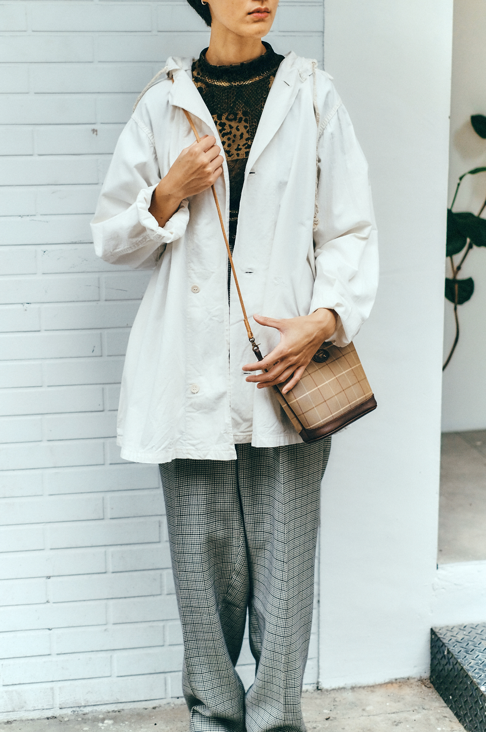 「印花 × 格紋」是本日的穿搭重點。選擇天鵝絨材質的圖案上衣,讓沈穩的表面無聲喧嘩起來。長褲以及斜背包,特意採用格紋,避免視覺上的混亂,巧妙地平衡上身的狂放。最後,由外搭的白色連帽雪衣外套,肩負起穩定上下對比的任務,長至臀部的雪衣外套,藉著寬鬆的特性,帶出休閒、和緩的調性。
