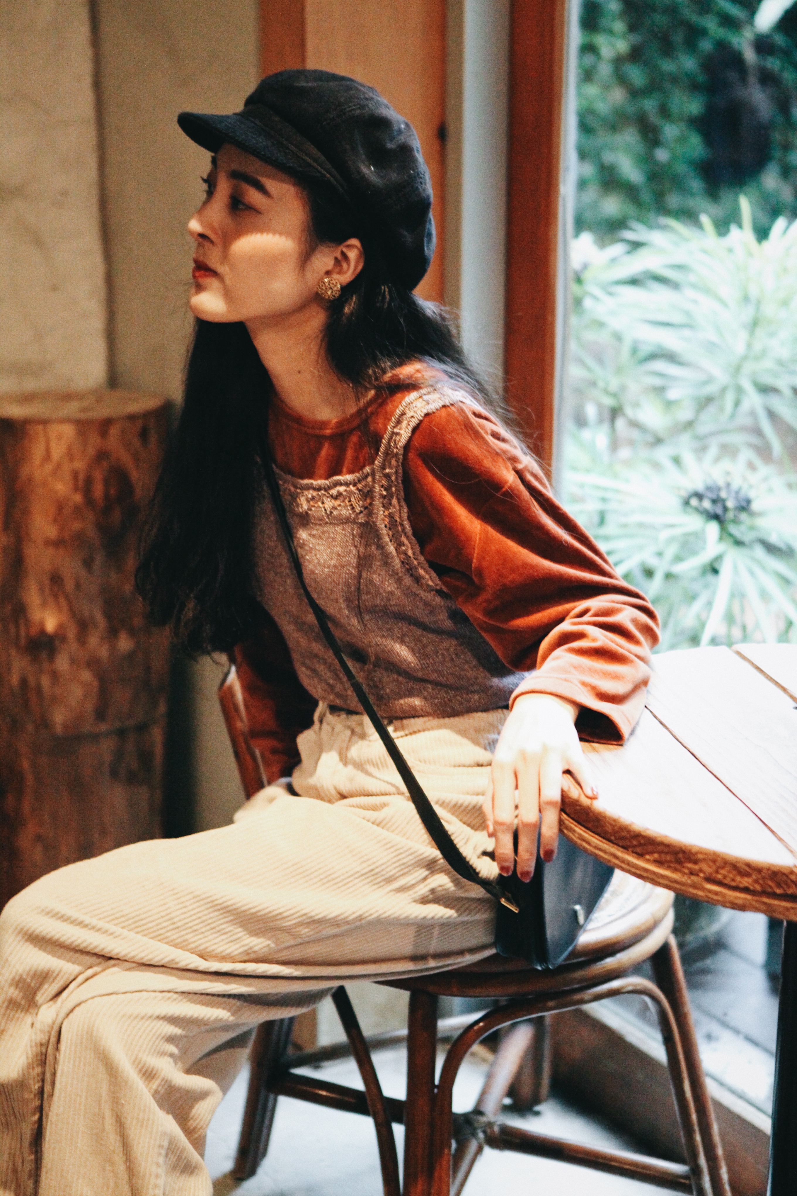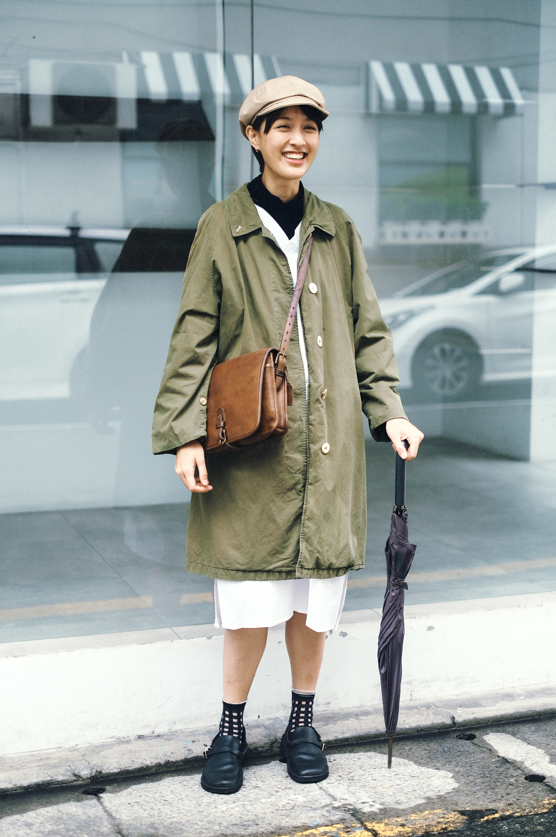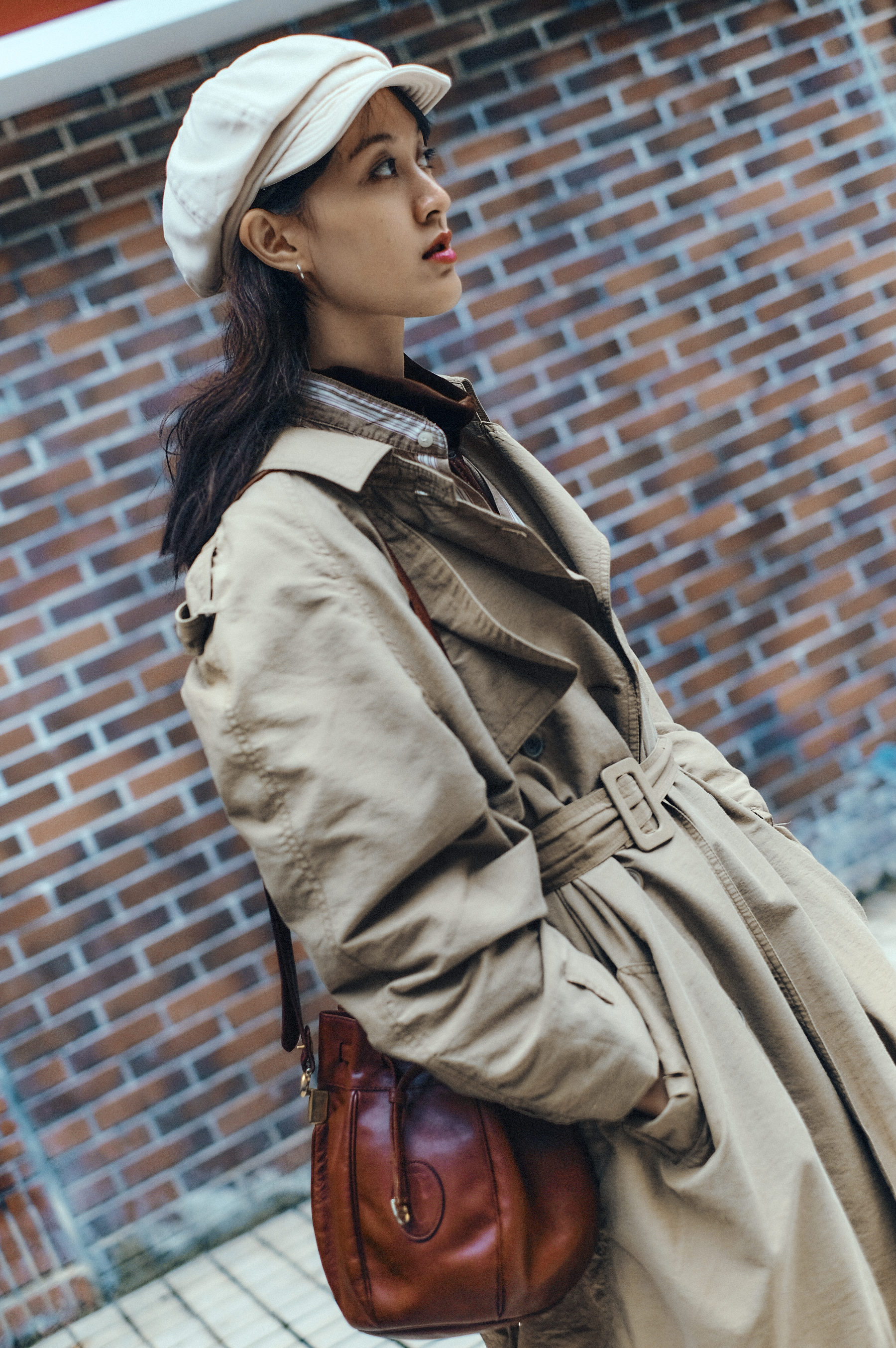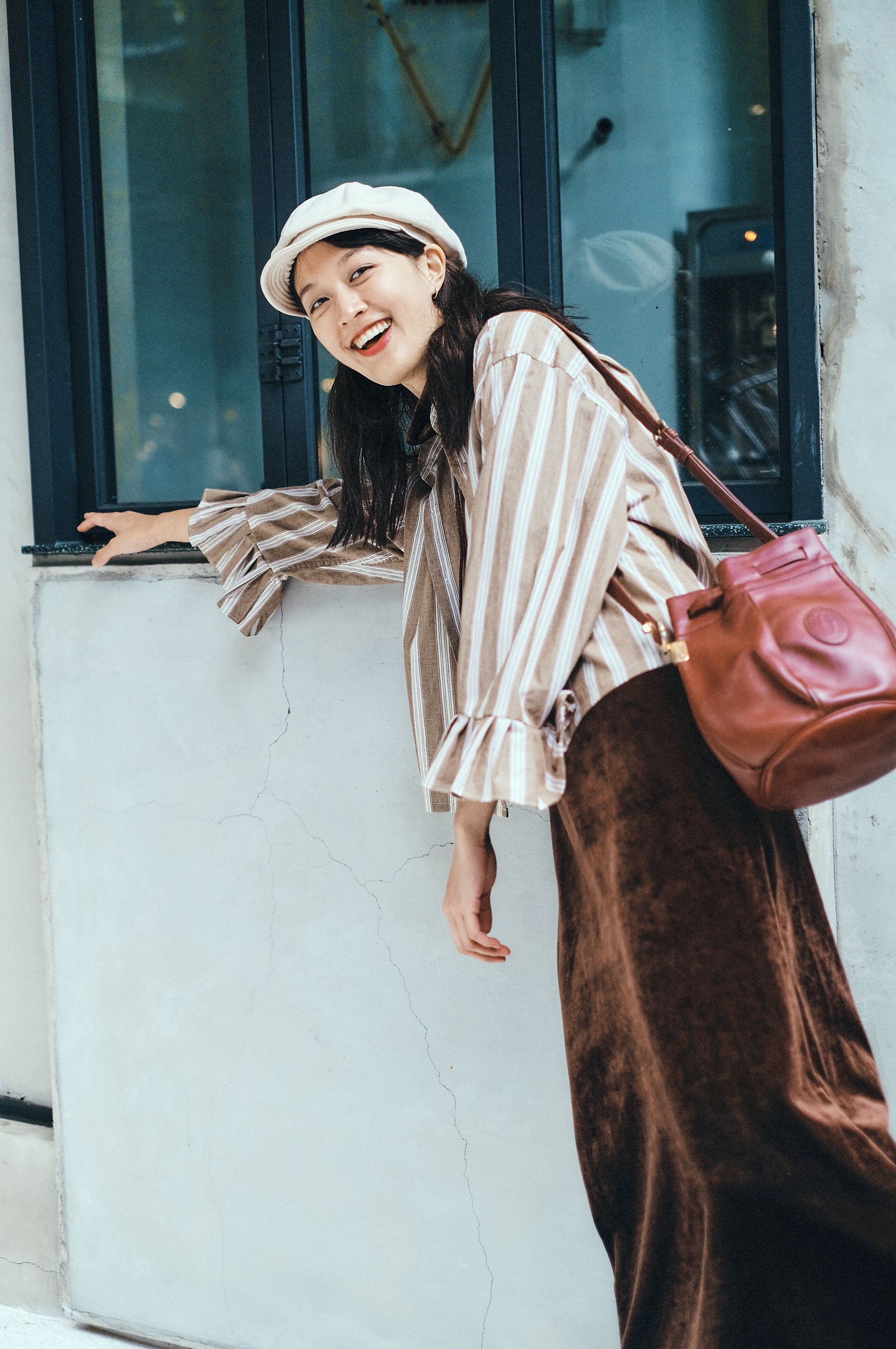 由白以及粉膚組成的粗直條花袖襯衫,從紋樣設計到剪裁,悄悄洩露著優雅的宮廷氣息,打破內搭連身裙的單一性。顏色的過度,是本次穿搭的心裁別具。從天鵝絨連身背心裙的紅褐色一路往上,直到頭頂的白色報童帽,藉由紅色系至白色的光譜分配,牽引出迷人活潑的氛圍。卡其色風衣一向與暖色穿搭十分相稱,完美凝練今日搭配。