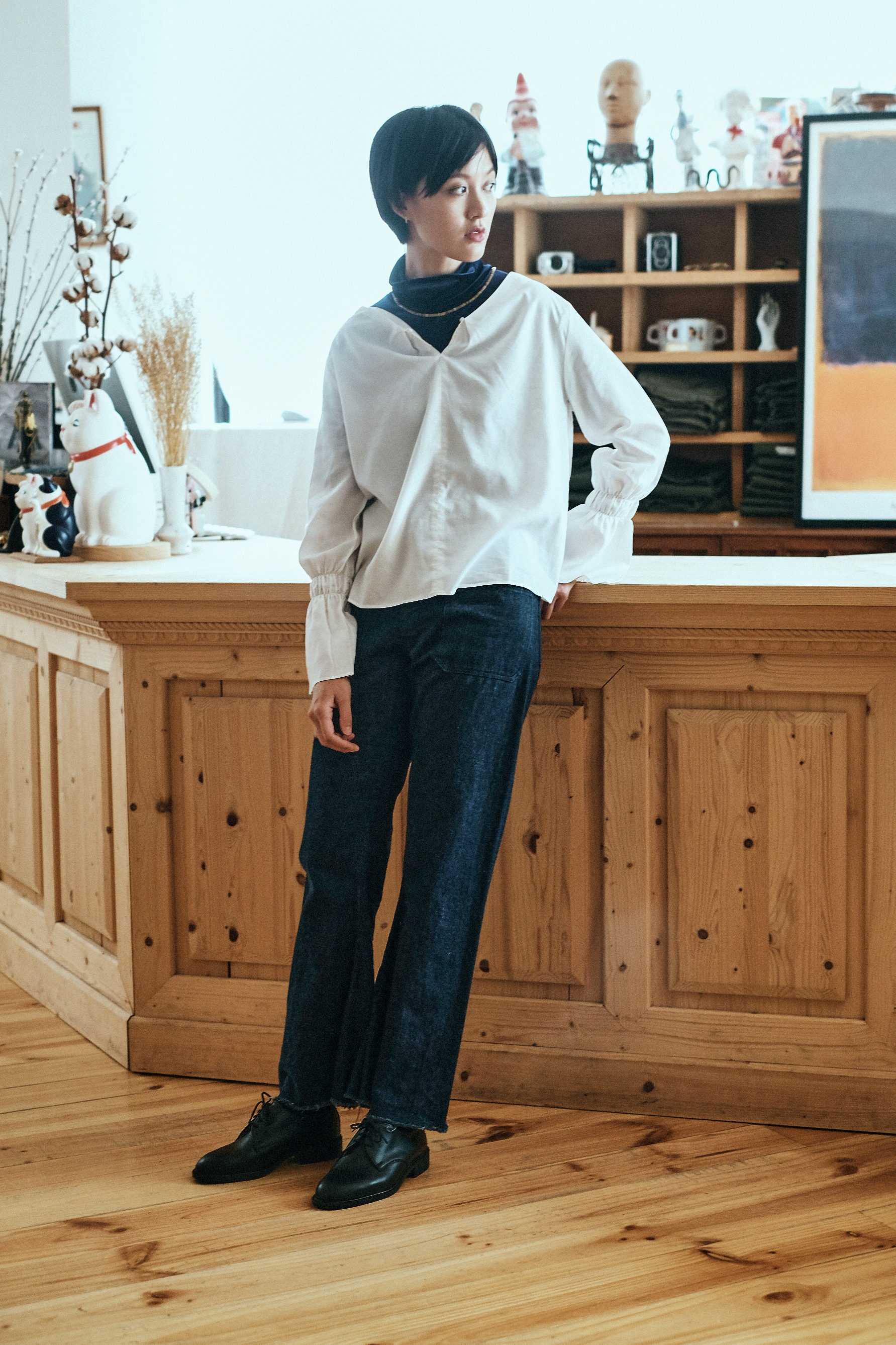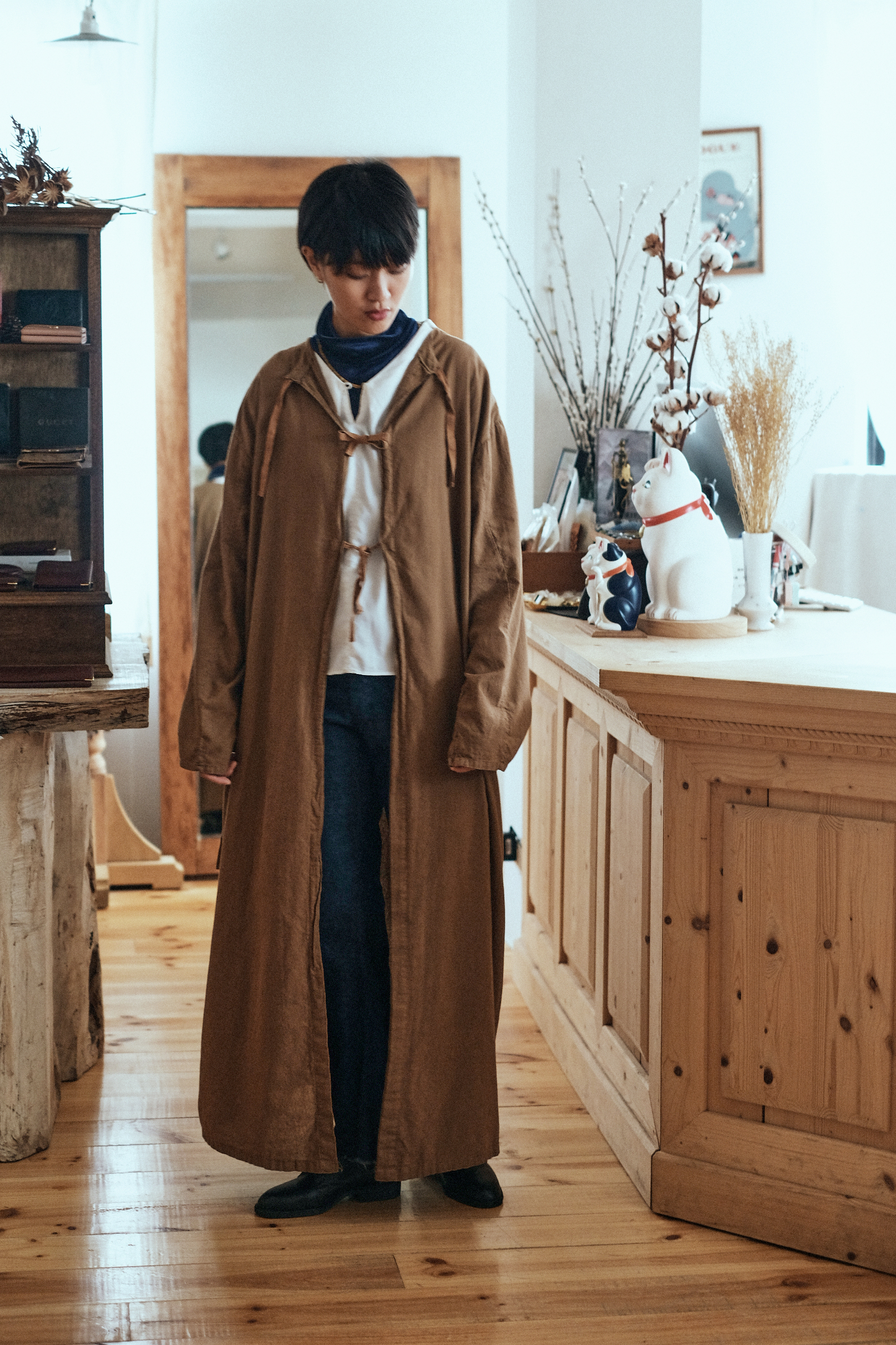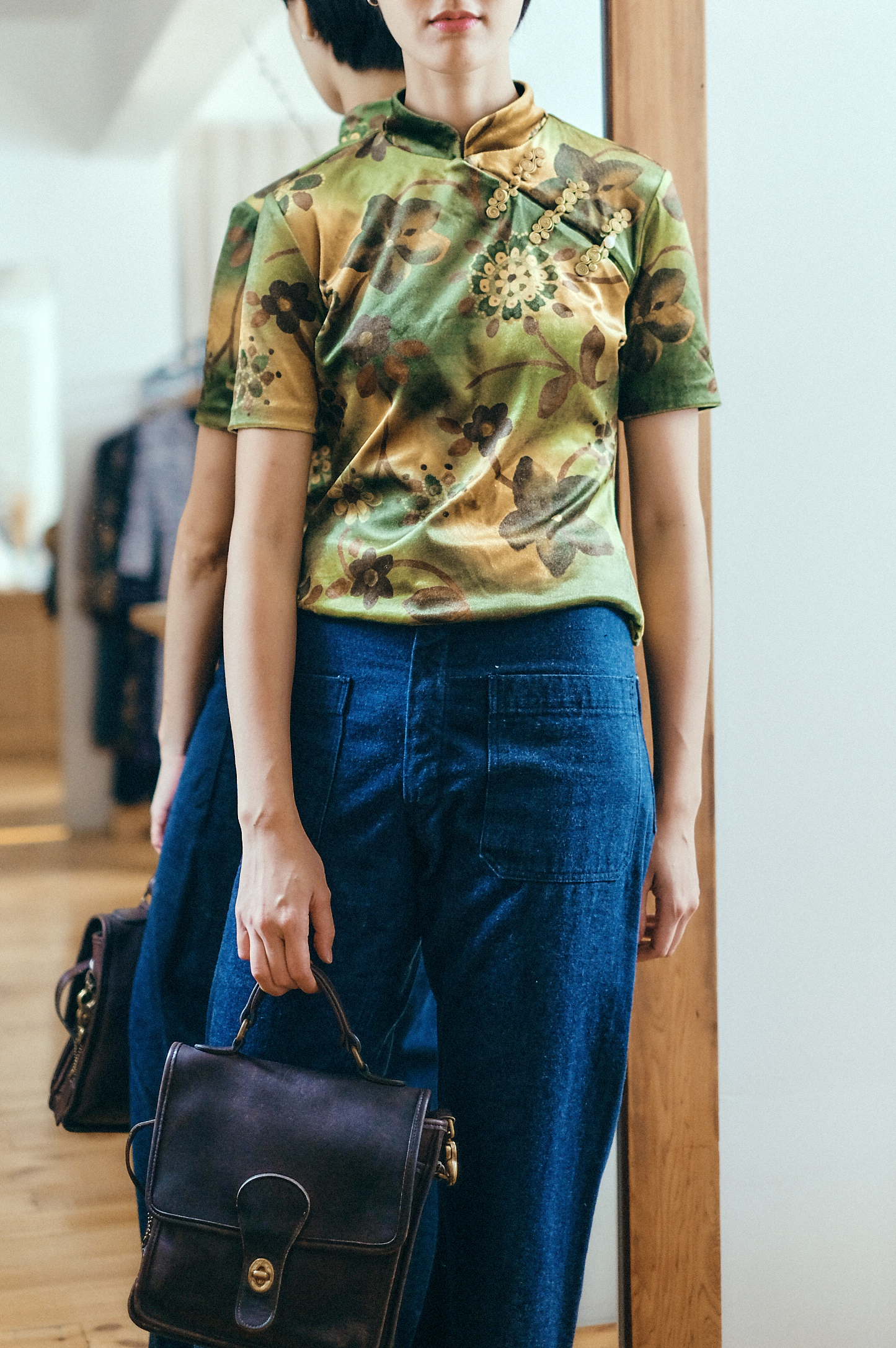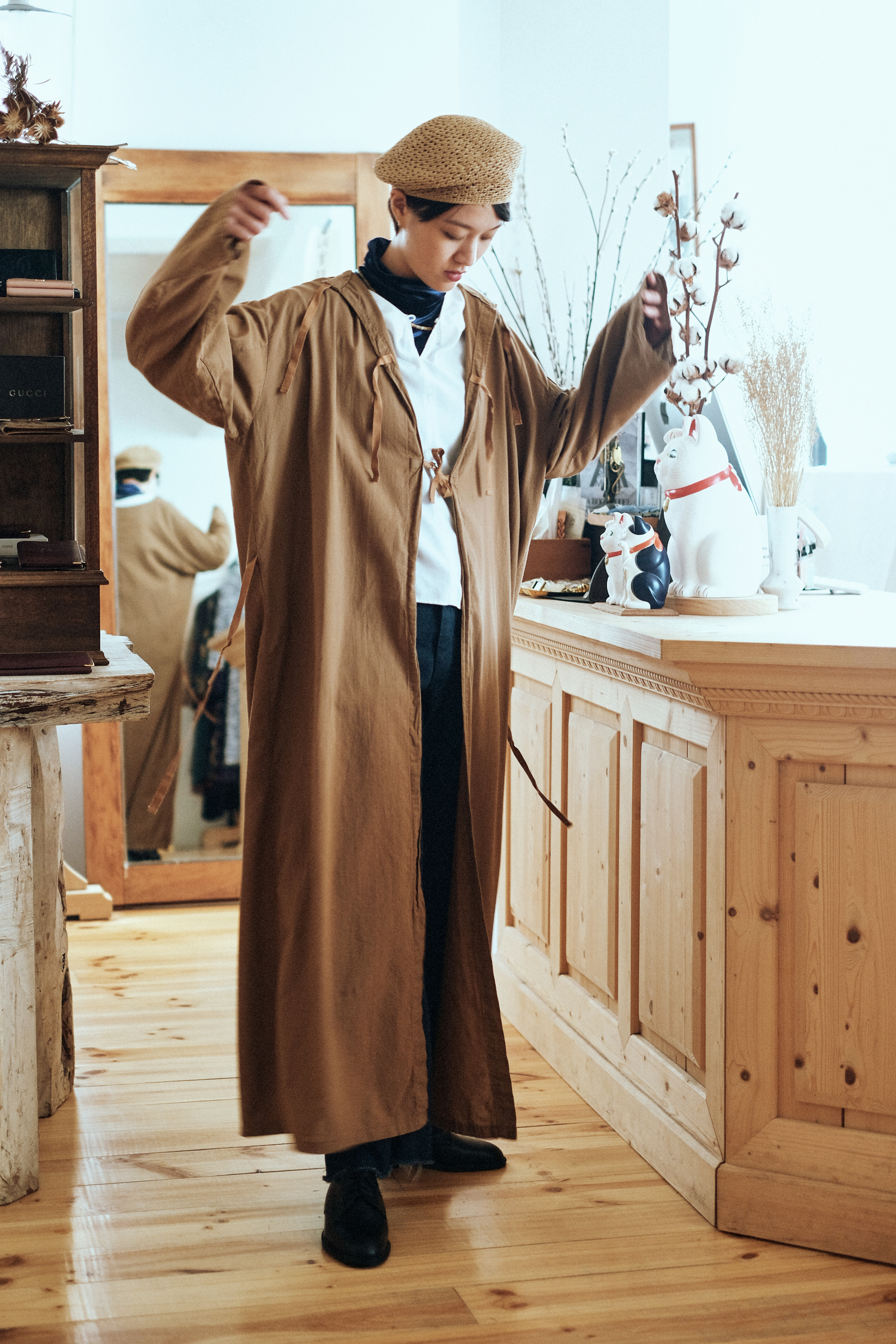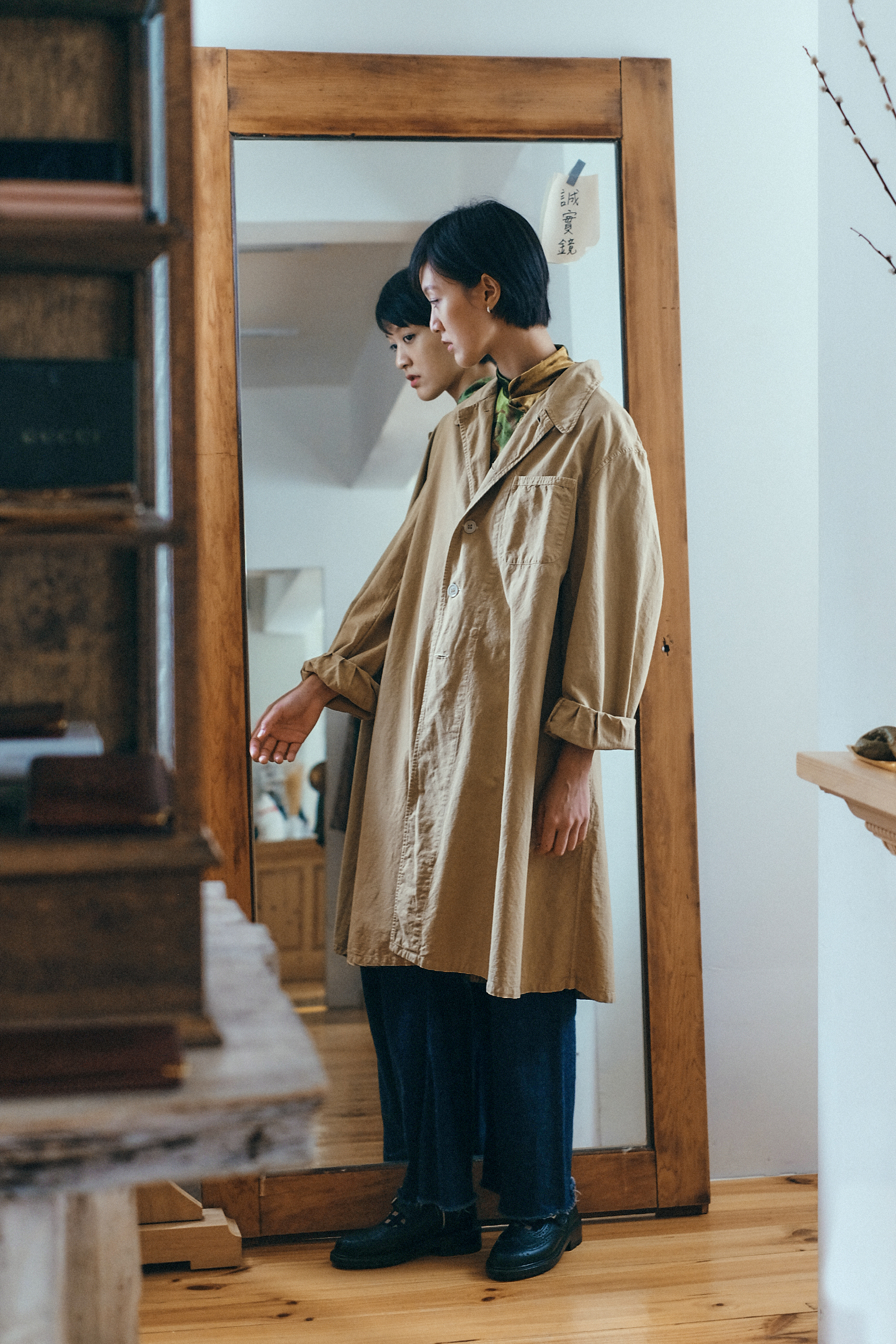 融合東方剪裁的立領,與T-shirt的版型。起源自東方的天鵝絨,在這件中式天鵝絨上衣身上,找到了歷史的呼應。下著選擇飄洋過海,引入美國海軍褲的爽朗氣息,同時還尋回了七零年代奔放嬉皮的自由靈魂。最後,以寬大輪廓的染製外套,重新定義身型輪廓,將各種自我展現,收束在此時此刻。