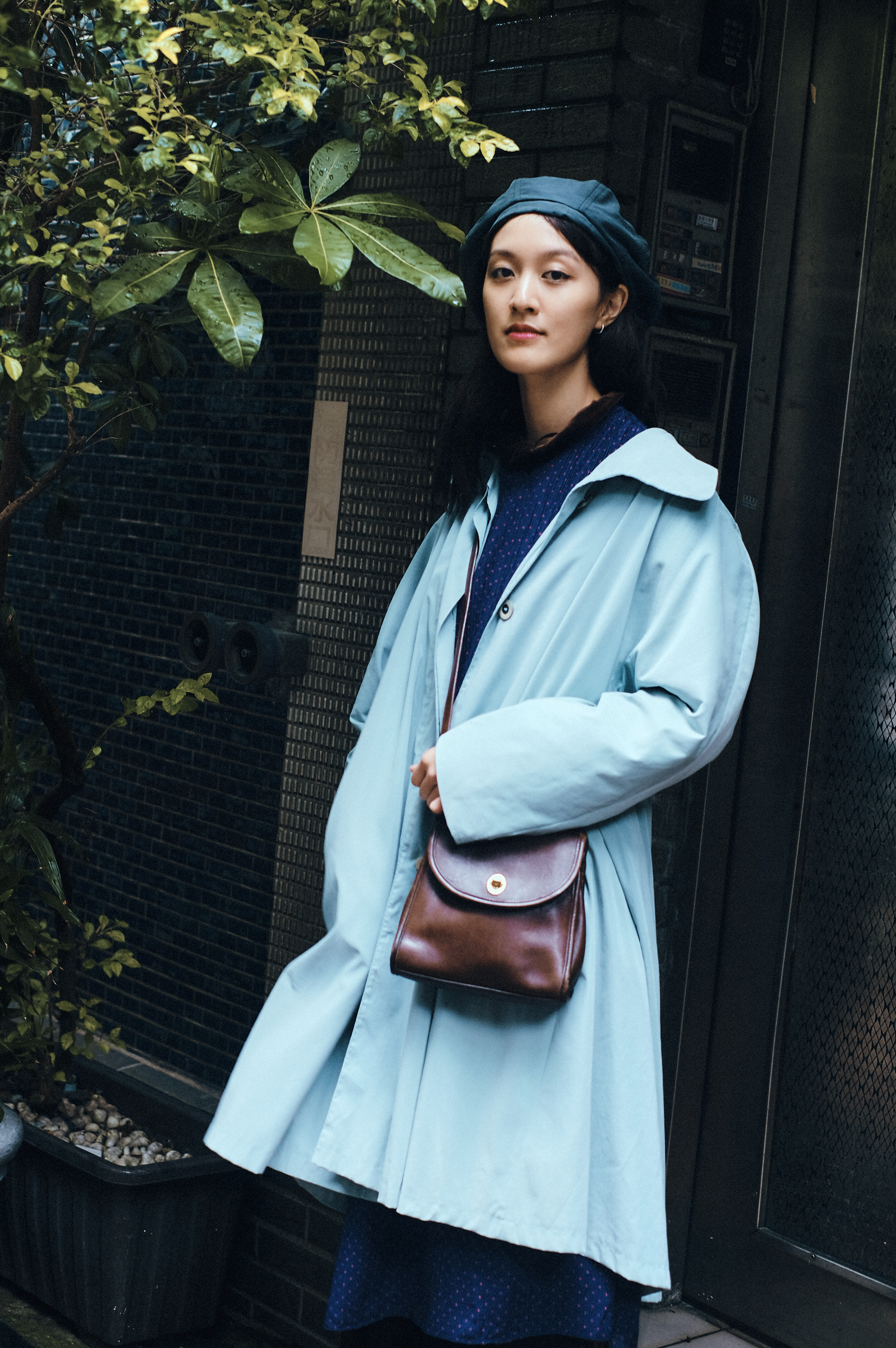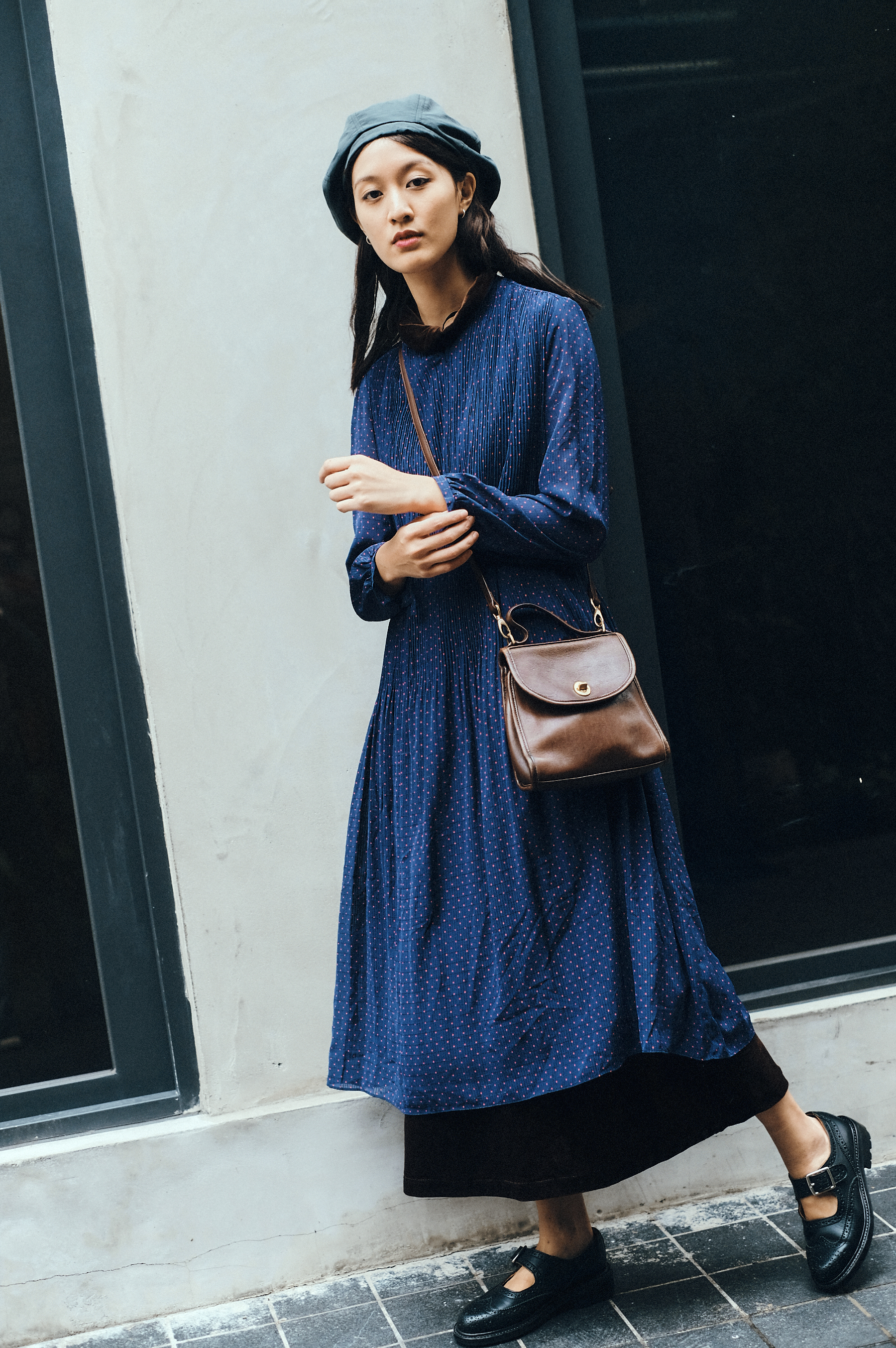 厭膩了中性色系、和諧色系的時候,天鵝絨就面料表現而言,是最佳的救援投手。顯眼的藍色系連身裙及中長款風衣,賦予裝束清新活潑的基礎印象。細節處的雕琢,則顯現了穿衣者的豐沛巧思。例如在內搭連身裙及包款上,共同選擇棕色系,並透過天鵝絨的反光特性,以及皮件的光滑外型,增加一身質地的多變性。