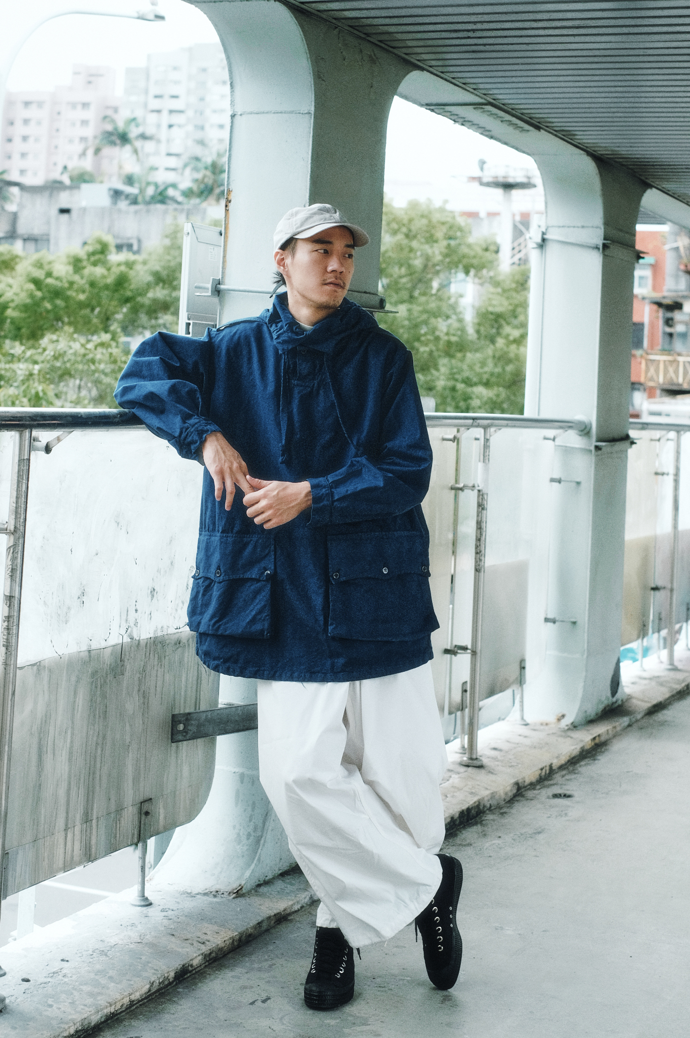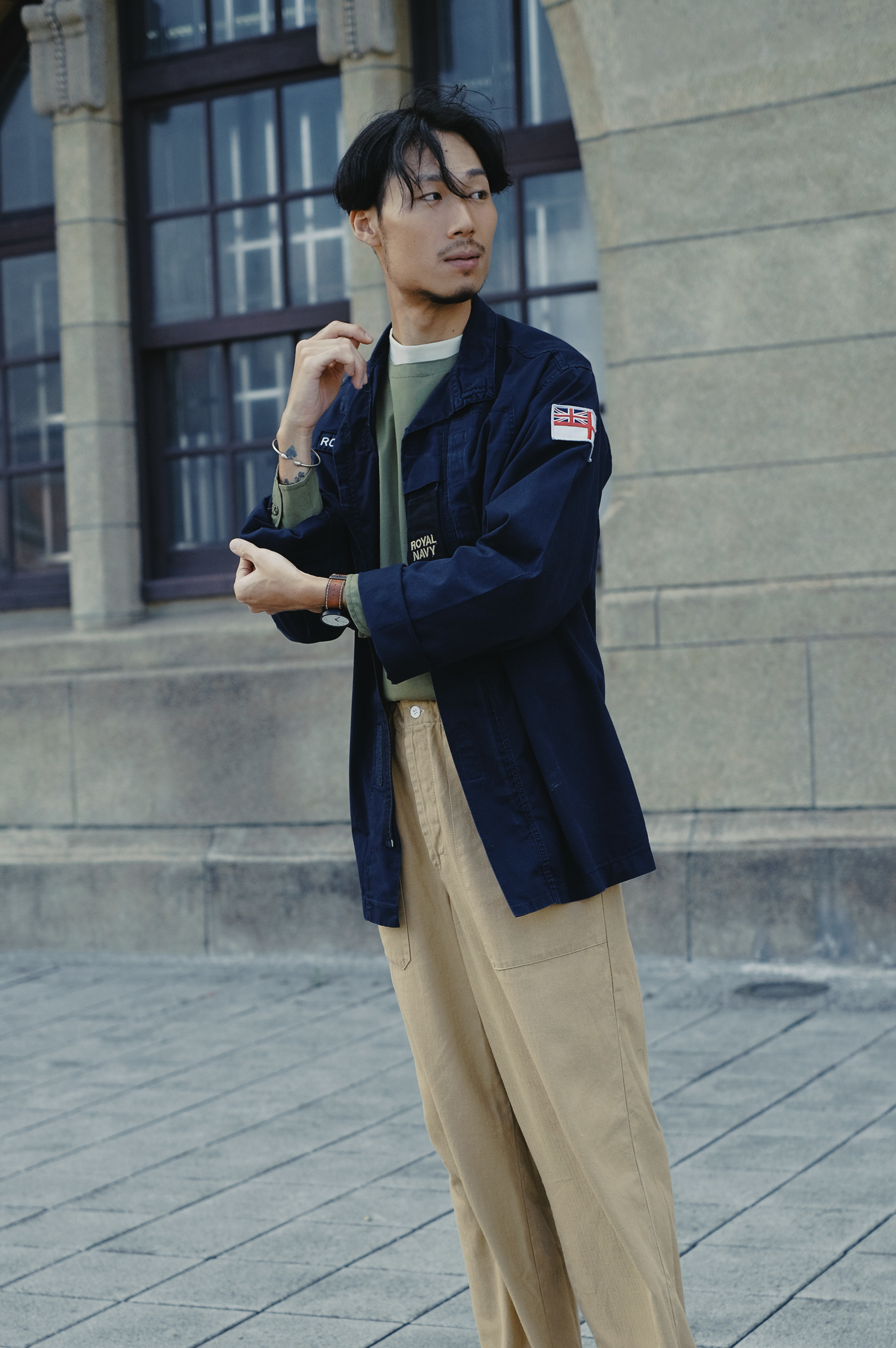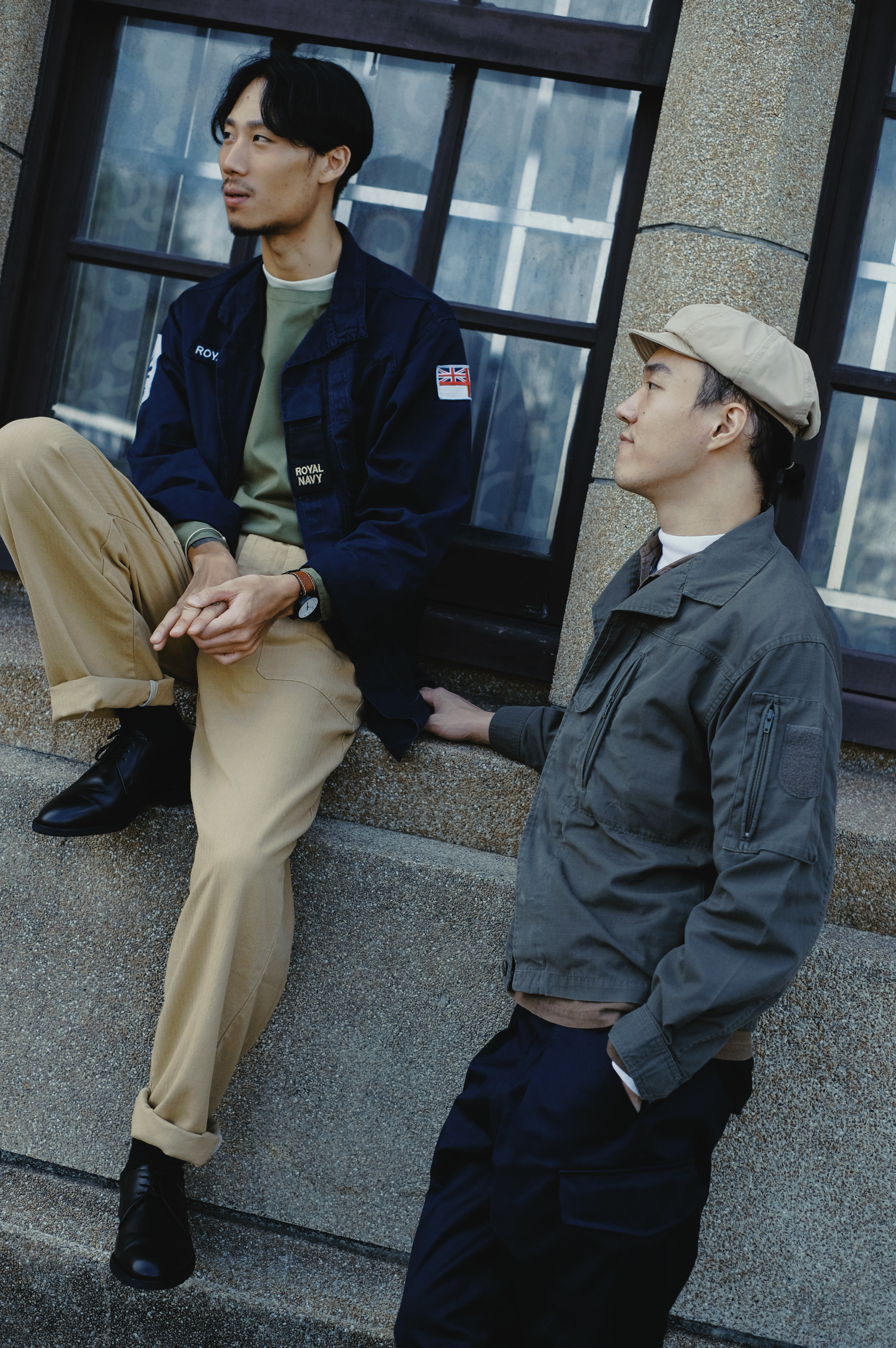 忠於軍品的各種細節的你,絕對不能錯過奧地利陸軍這一件Ripstop山訓外套。Ripstop是專們為軍用開發的紡織技術,混紡纖維格狀相互交織,在山訓因阻物刮傷面料時,不會因為人的動作導致破面加大,因此稱作Rip (撕裂)-Stop。輕鬆的翻領、垂直下拉式口袋,以及恰到及腰的長度,給人乾淨、俐落卻不失細節的印象。下身穿上英國皇家軍對公發的軍褲,兩側的大口袋與大顆的塑料釦藏著細膩的設計,英軍的典雅與東歐軍服的務實融合,巧妙的組合達到設計與機能兼具、無論任何場合都能駕馭的穿著。