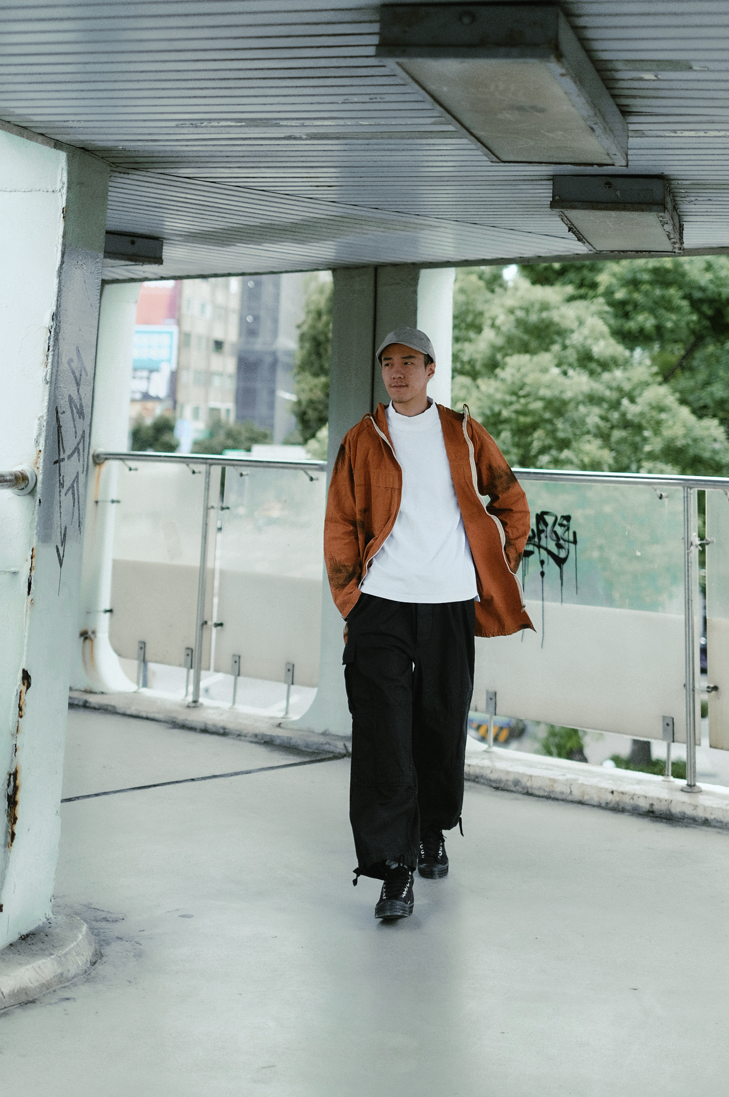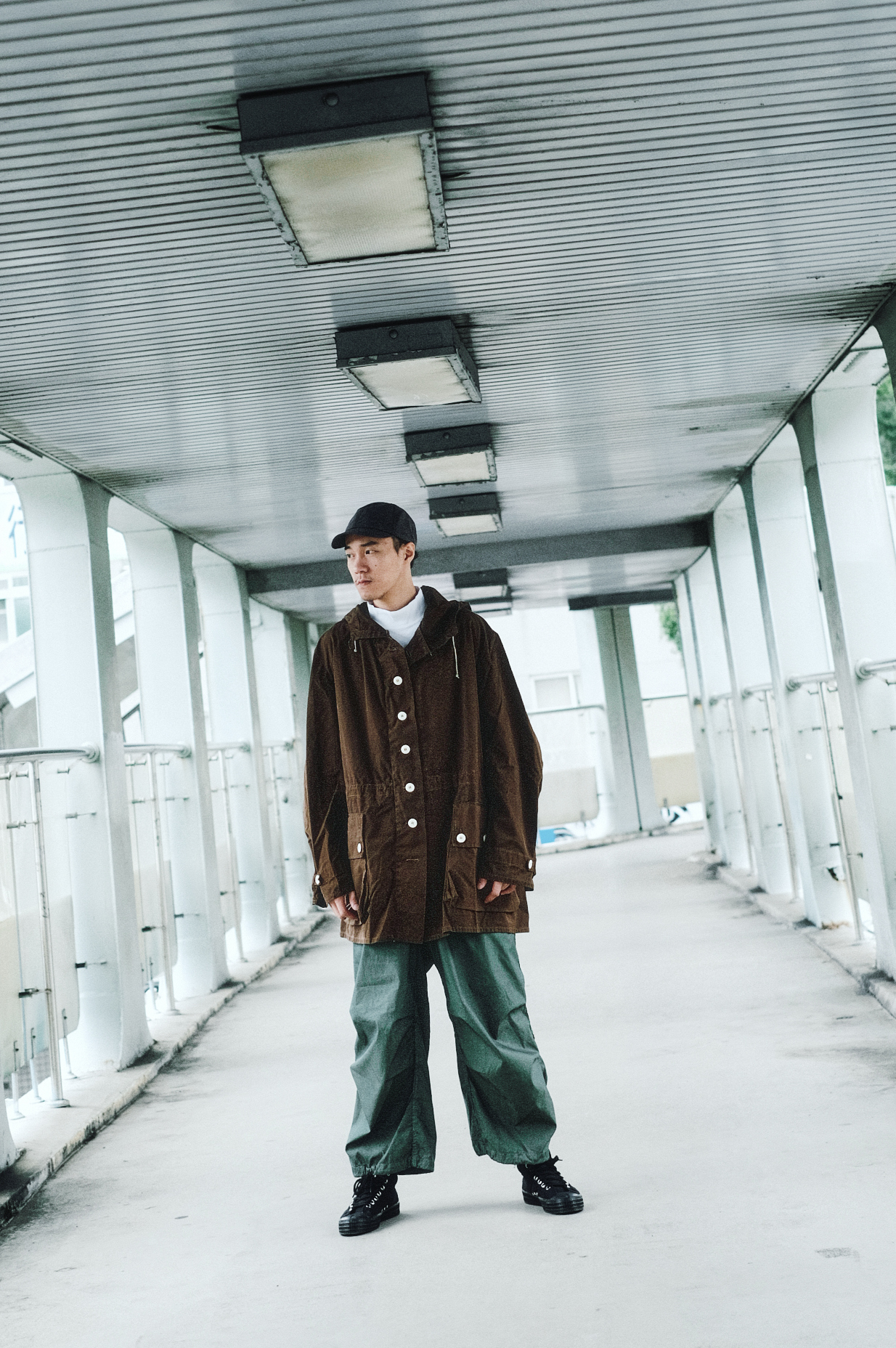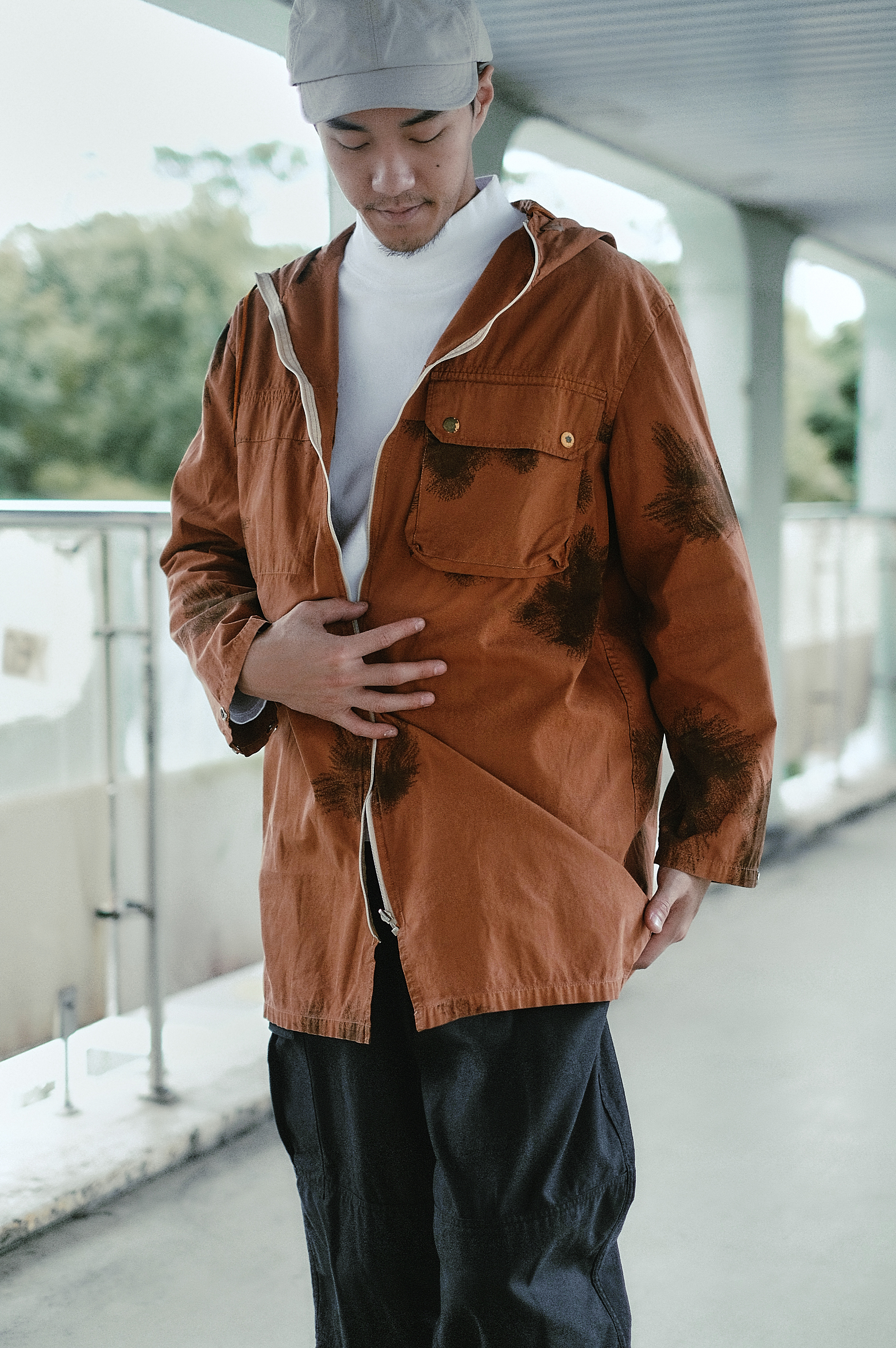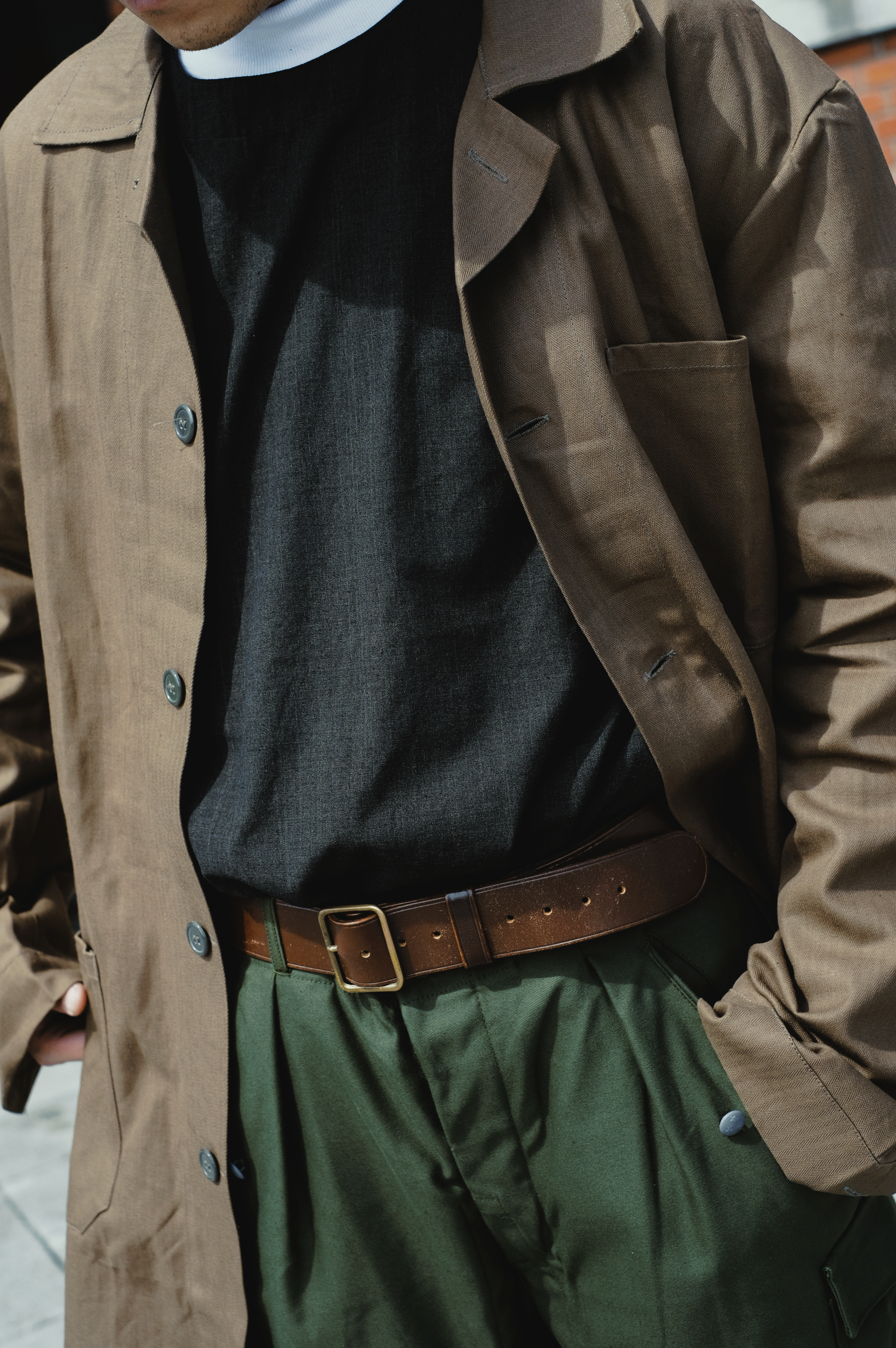 這一件由德國聯邦國防軍(Bundeswehr)公發,前方拉鍊可以拉到領口脖子處,連帽和下擺皆可以鬆緊繩控制,避免強風及低溫入侵。雪衣上的斑點是市面上珍貴少見德國的雪迷彩(schneetarn),雪迷彩的靈感來自雷鳥冬鳥的羽毛紋路,使用不規則圖案排序,以擾亂敵方視線。Rolling on也非常自豪地染製了特殊的咖啡色款,讓大家的雪地大衣有煥然一新的選擇。下身的再帥氣的搭上罕見的比利時戰地軍褲,襯托出身型的輪廓及層次感,也恰好可以應付冬季的寒風和小雨。