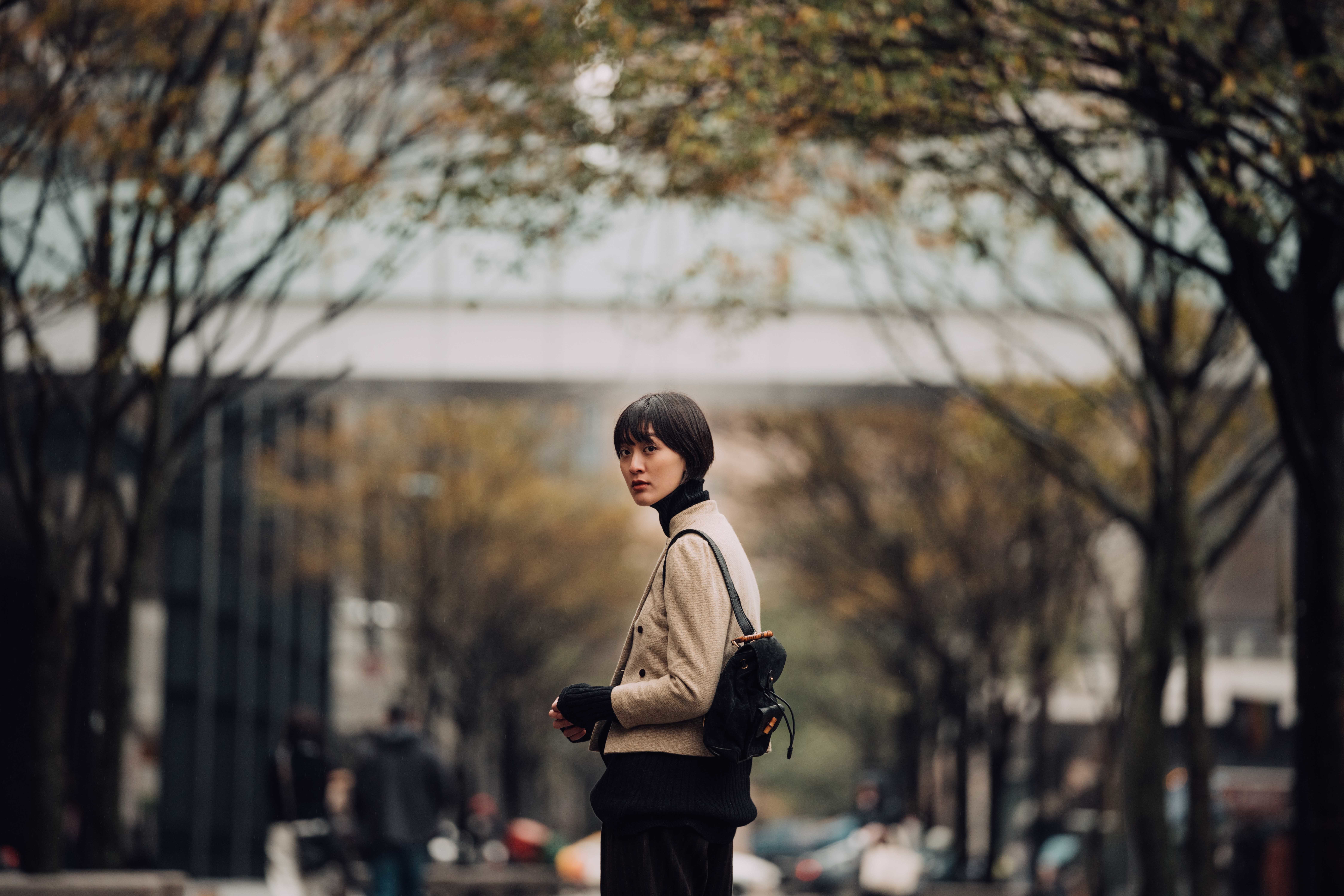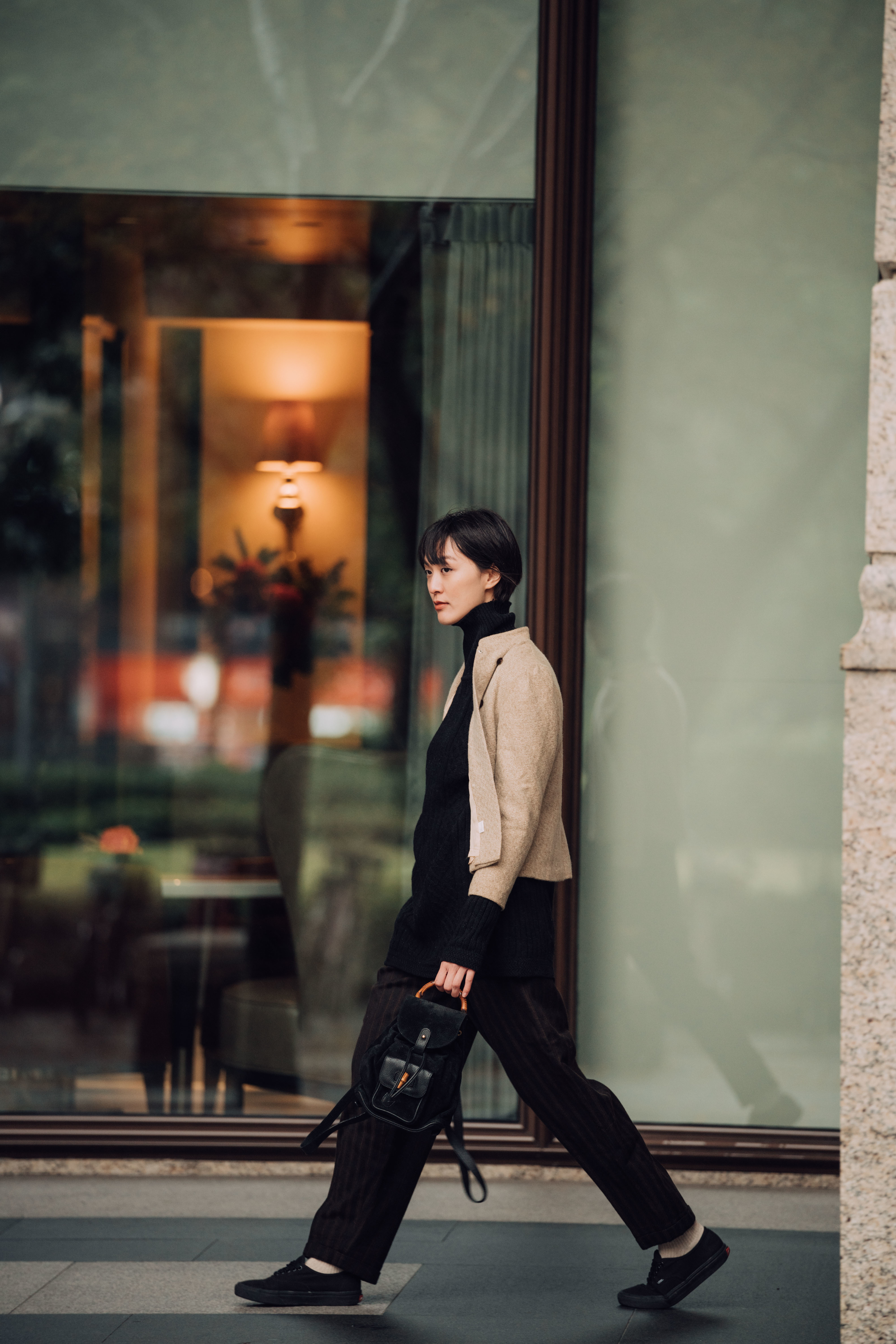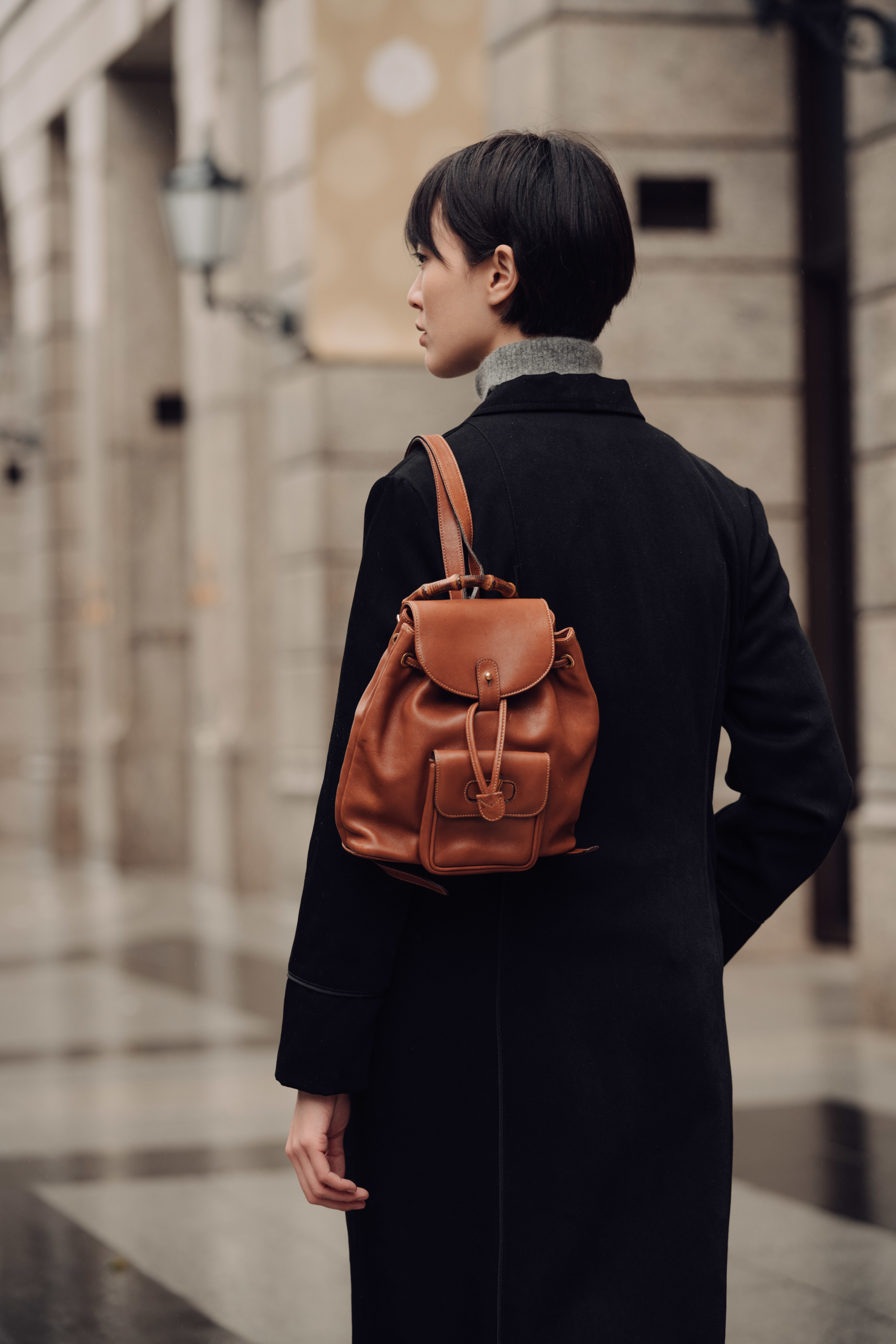 例如具有細密紋樣的針織高領毛衣、深色直紋毛呢長褲,以及優雅耐看的Gucci竹節麂皮後背包。