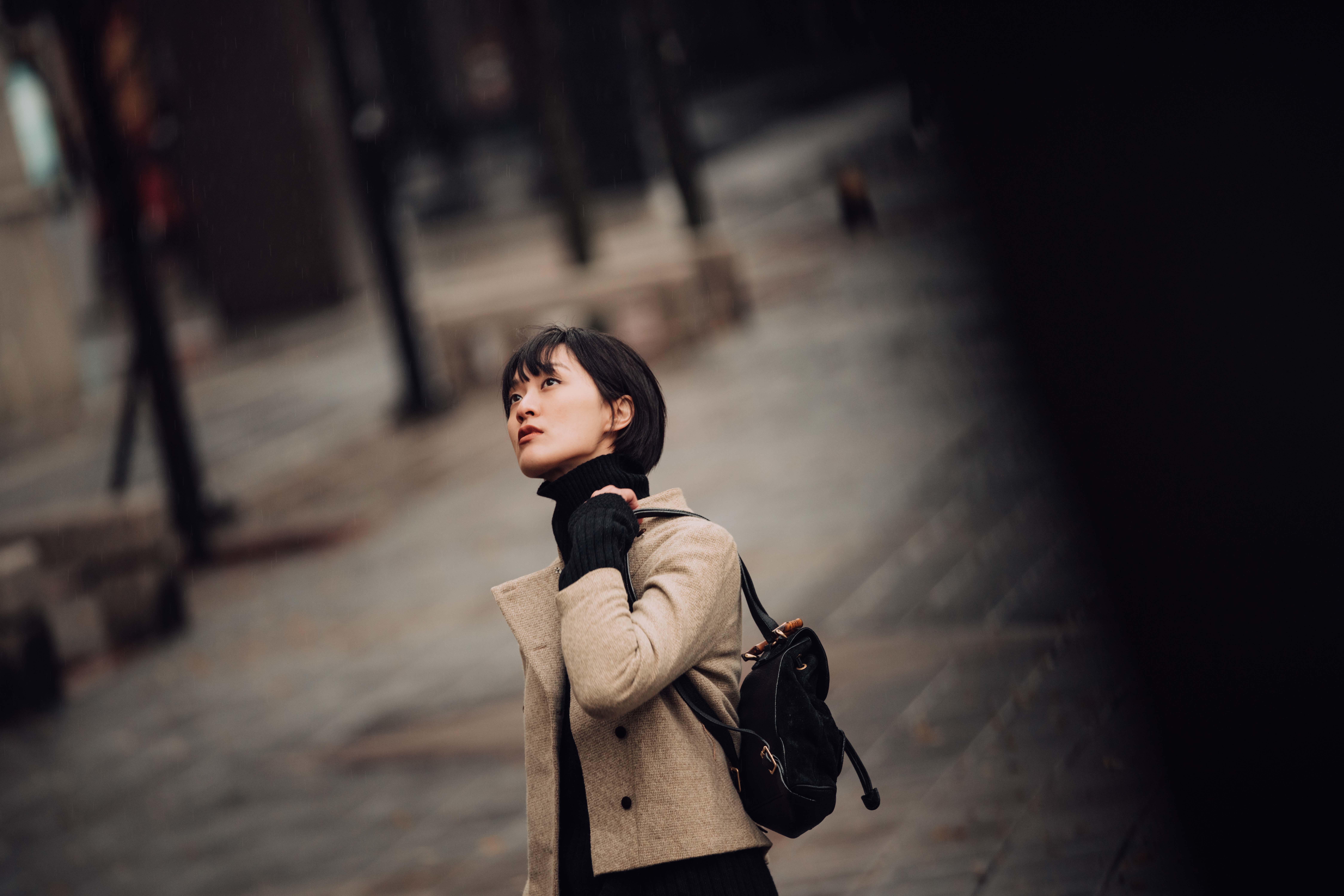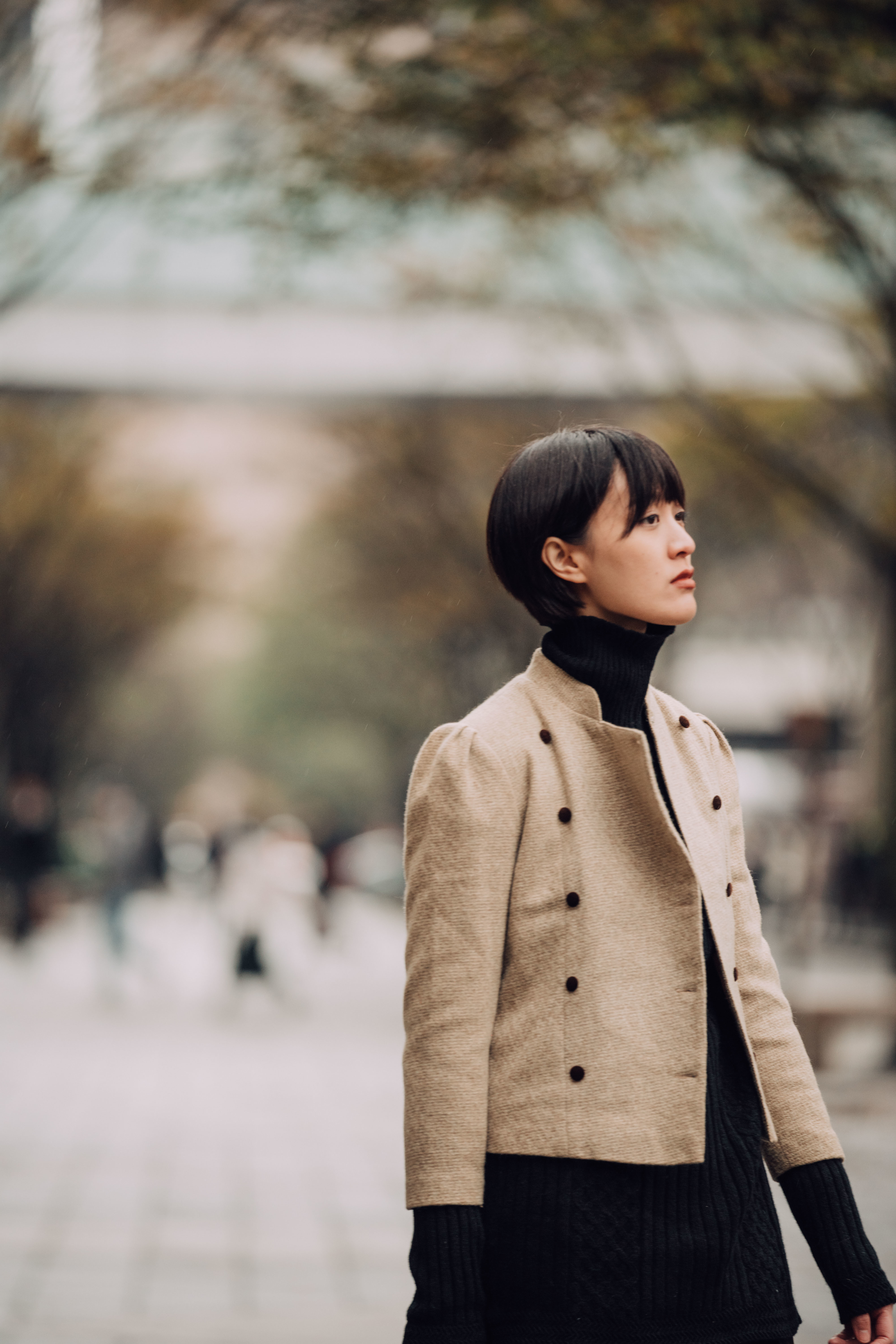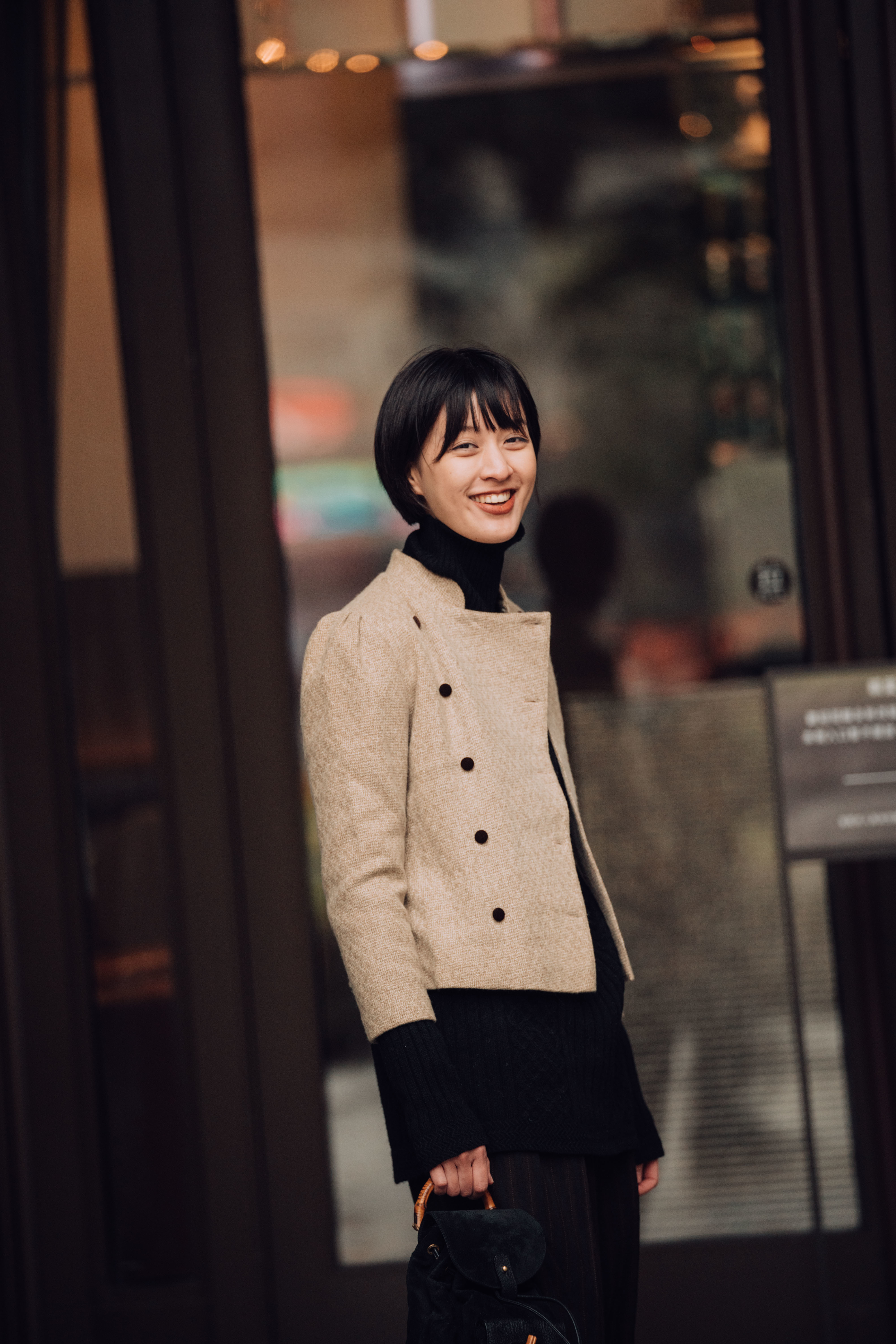 最後套上杏色立領毛呢短外套,雙排扣設計敞開隨性,扣起則適度收束身形,柔和的色澤輕巧提亮穿衣者的臉龐,展現和煦好氣色。