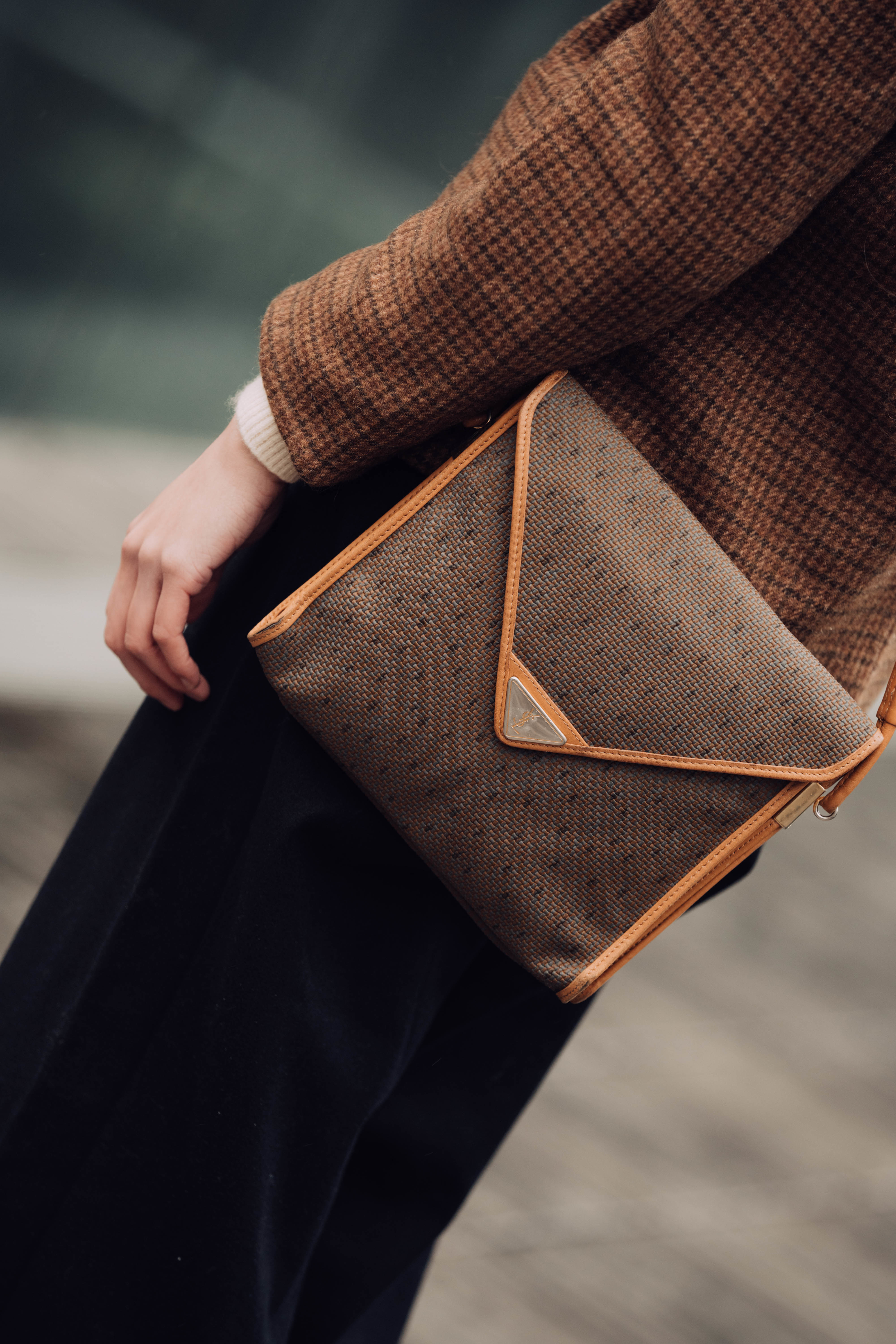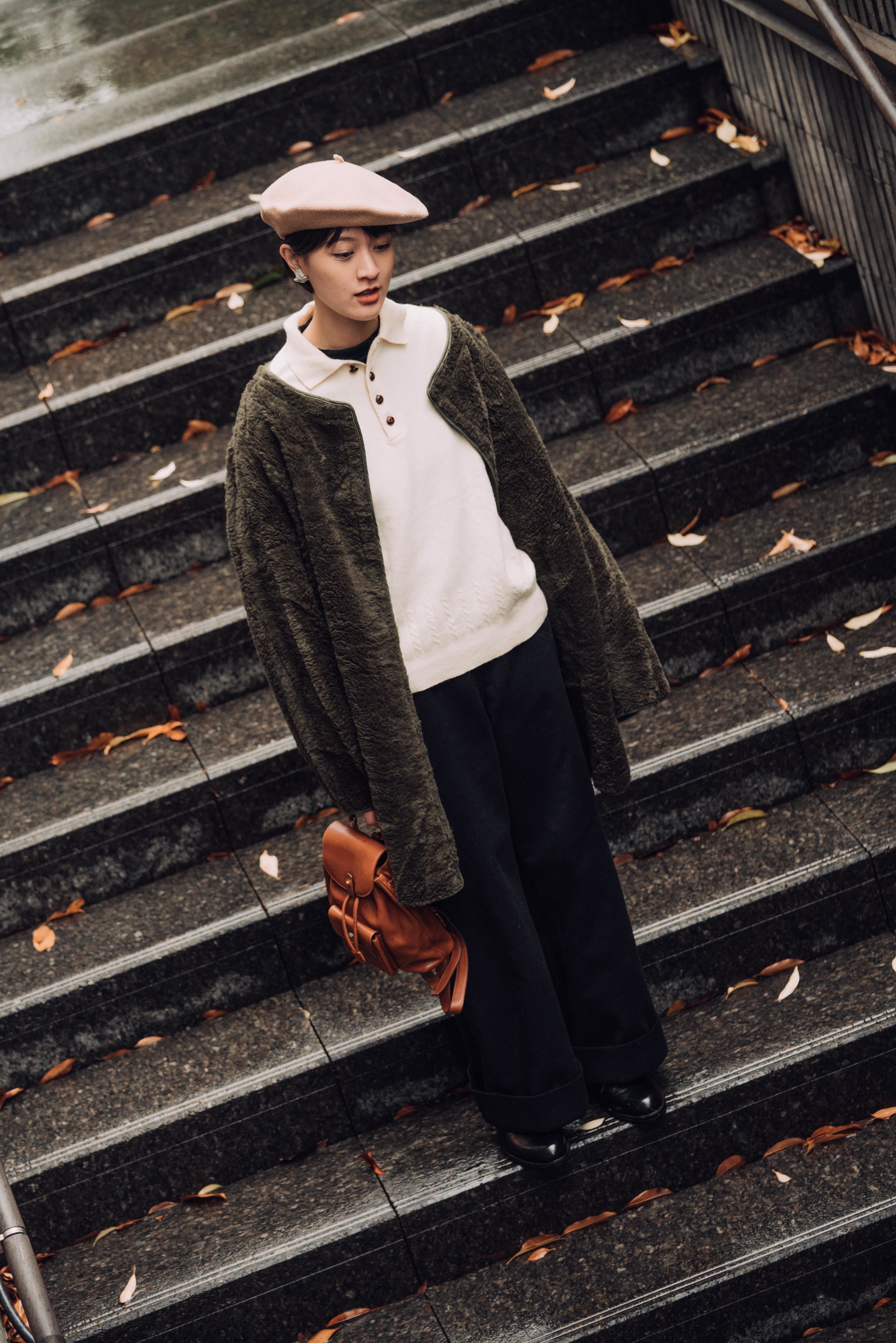 下身為上述提到的美海軍毛呢喇叭褲,下寬上窄的剪裁,簡約又大方。延續著帽子與下身的色彩設定,鞋子選擇來自90年代的法軍公發黑色皮鞋。替一身造型定調的Vintage毛呢外套,細看有著別緻的格紋圖案,搭配YSL斜背包,完成溫暖知性的冬日裝扮。