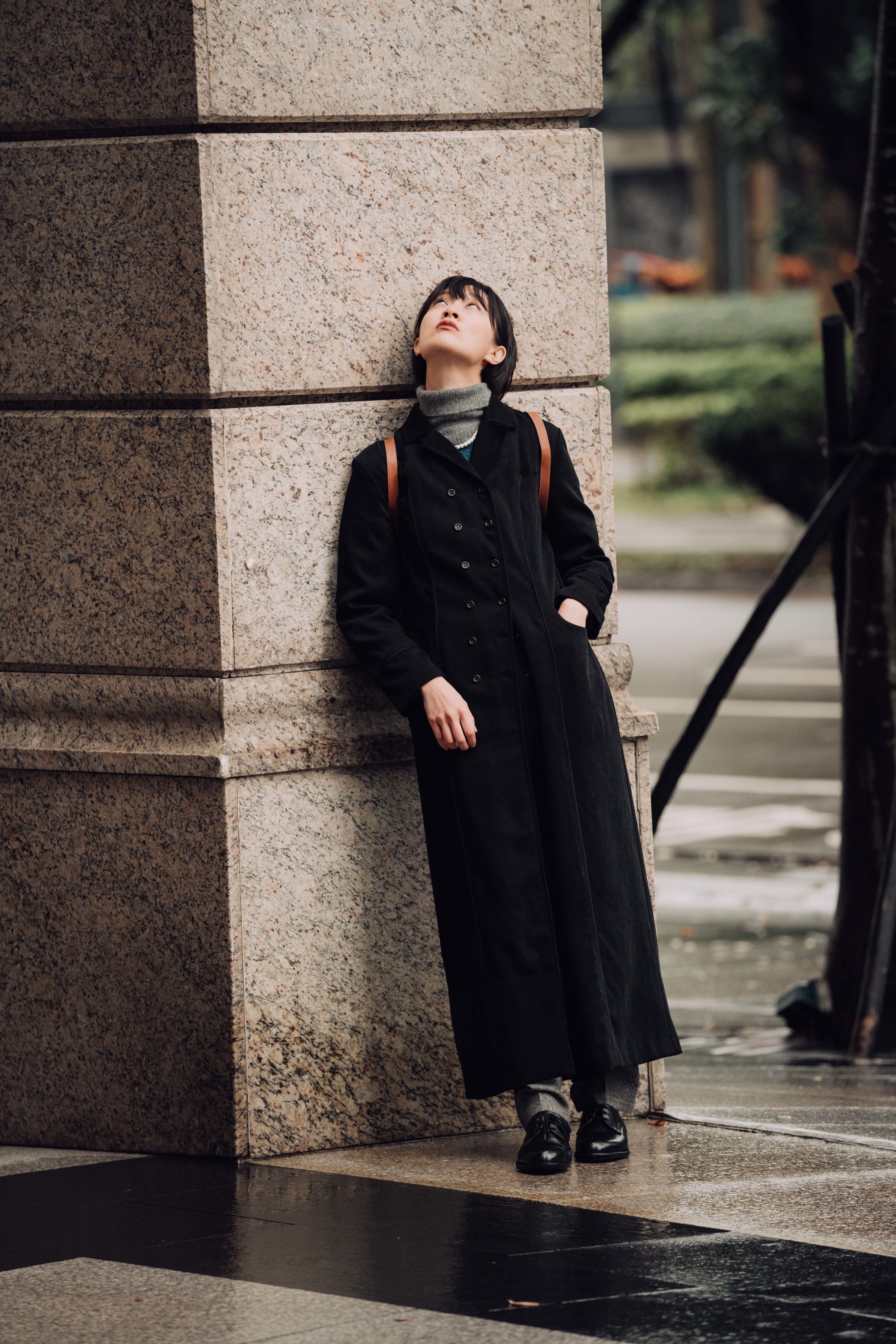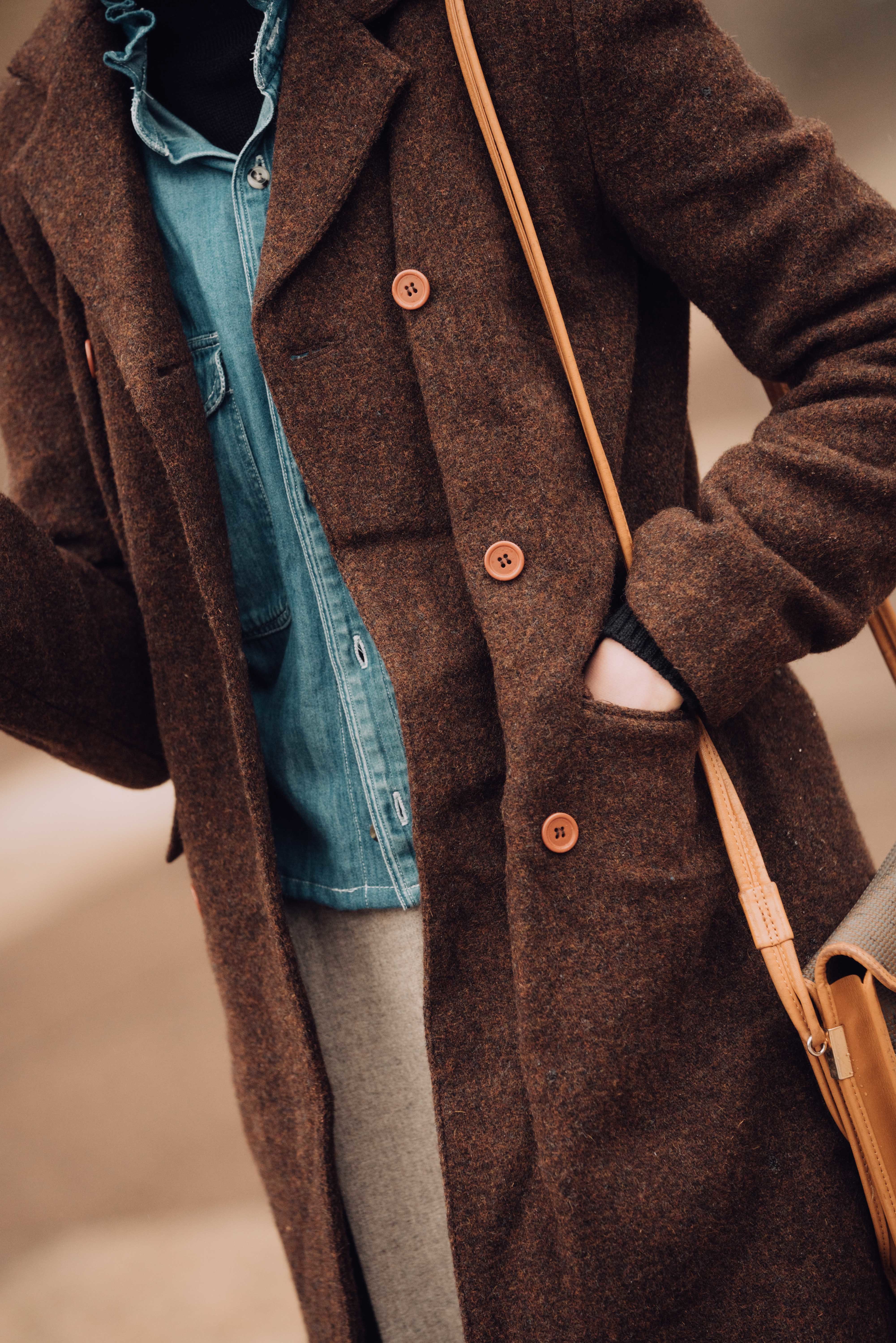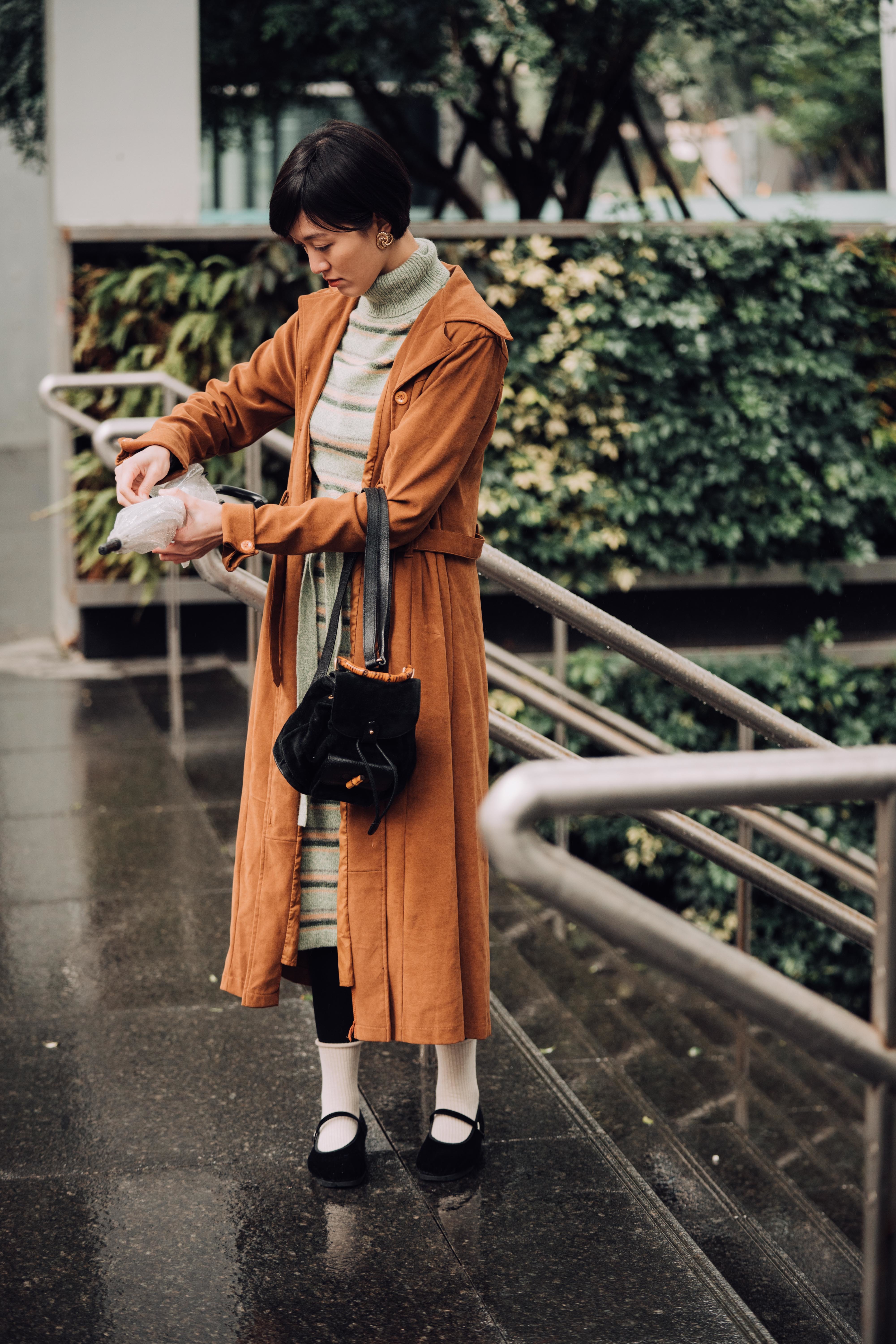 咖啡色的毛呢外套,及膝長度傳遞一股中性正裝感。