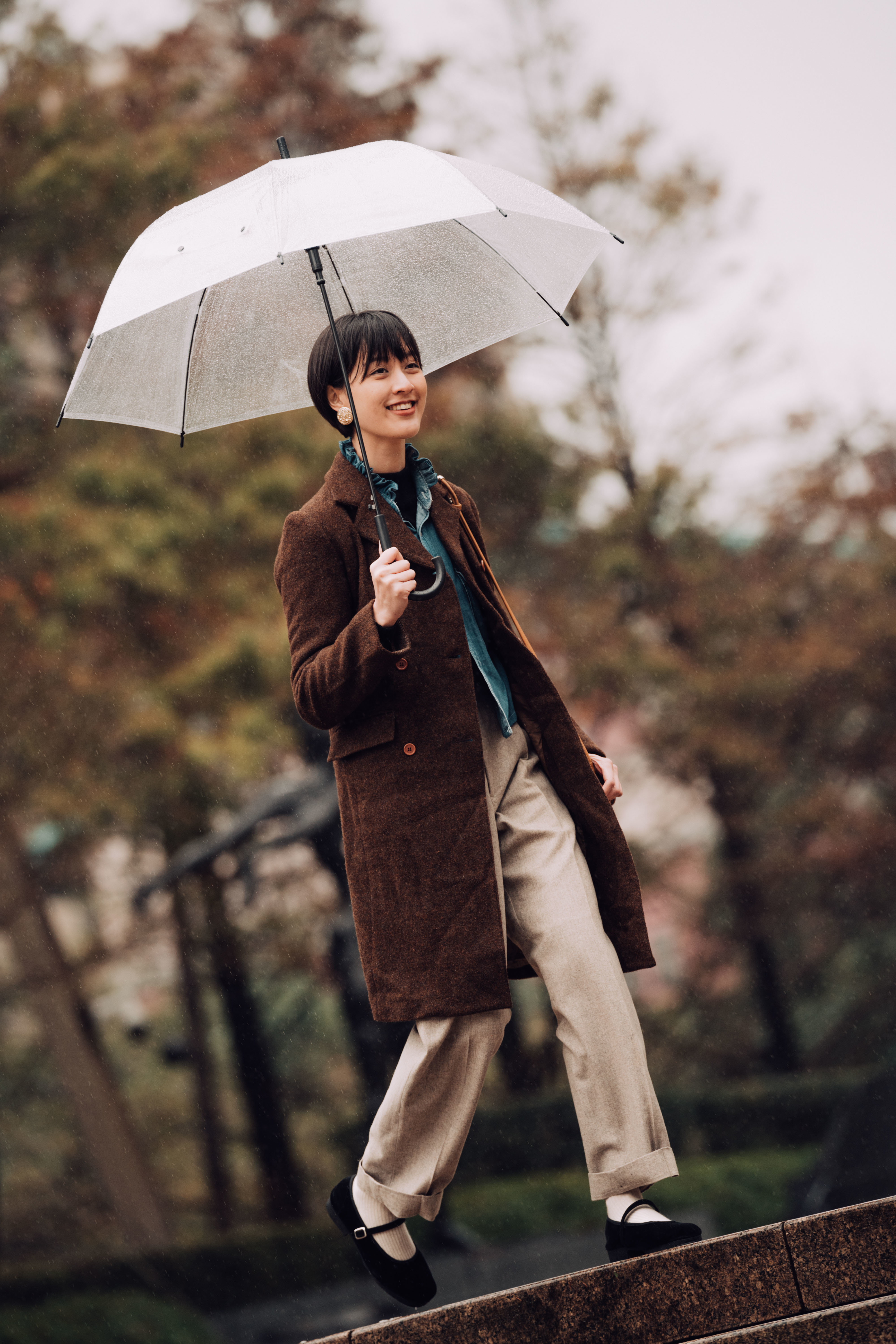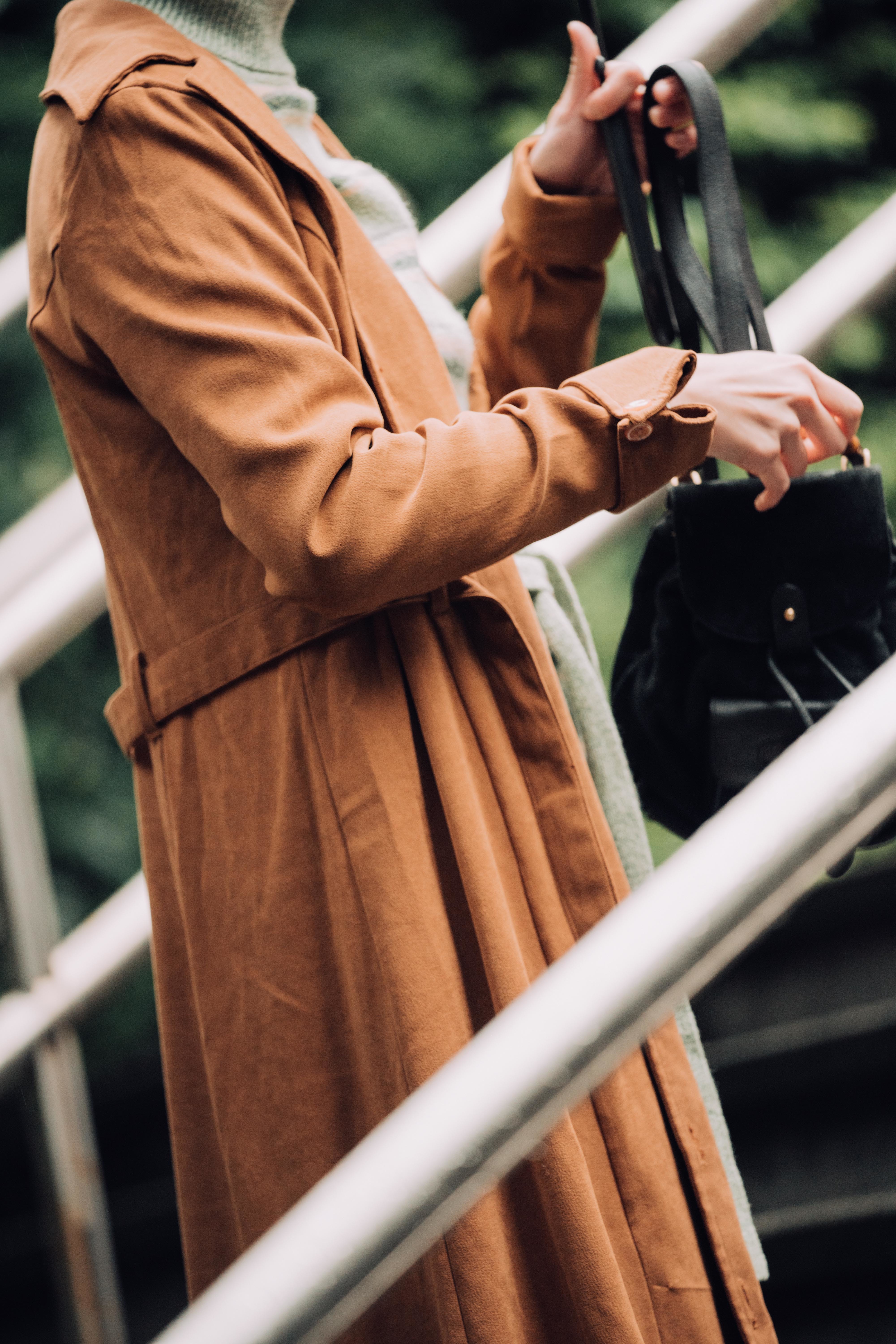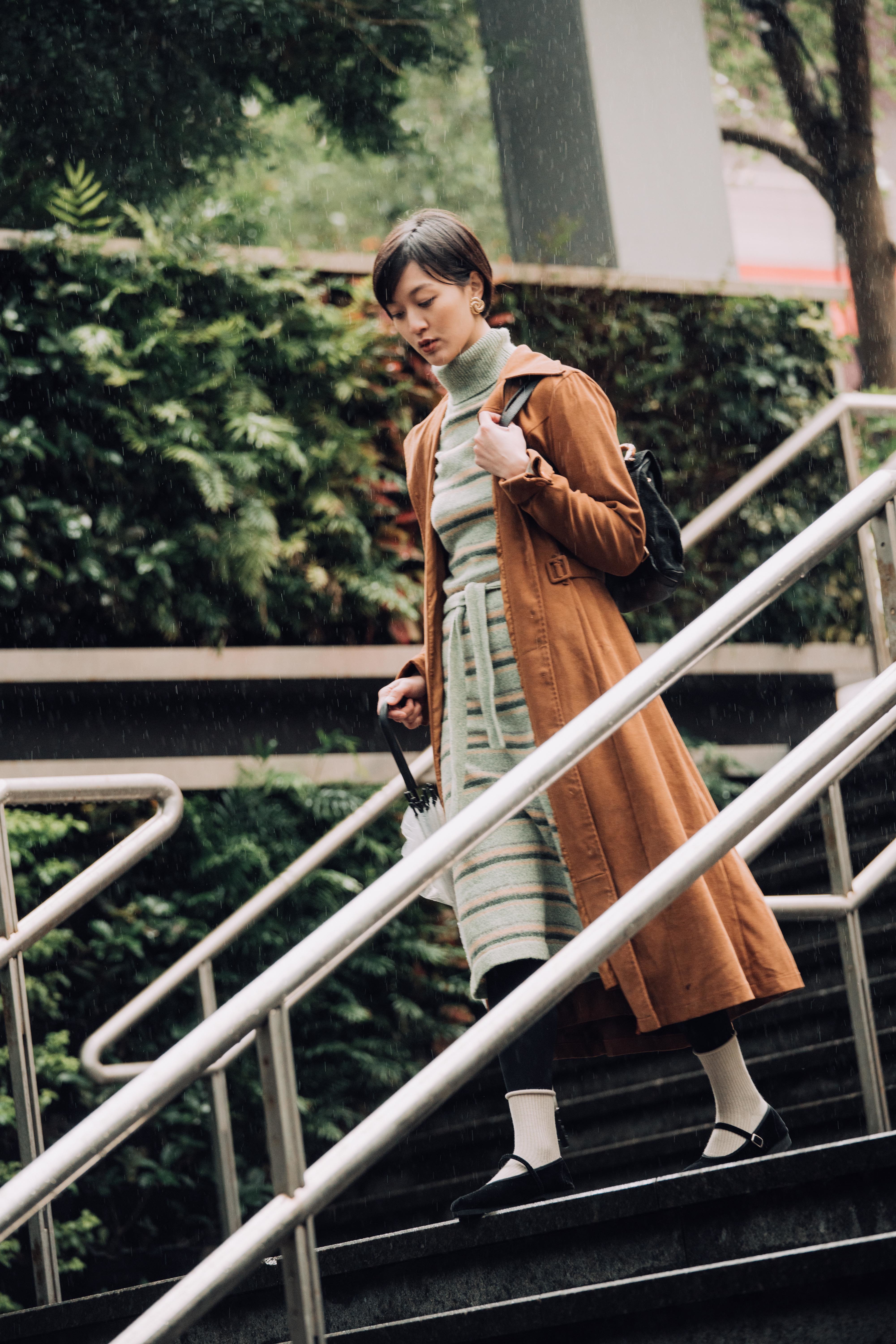 咖啡色的毛呢外套,及膝長度傳遞一股中性正裝感。