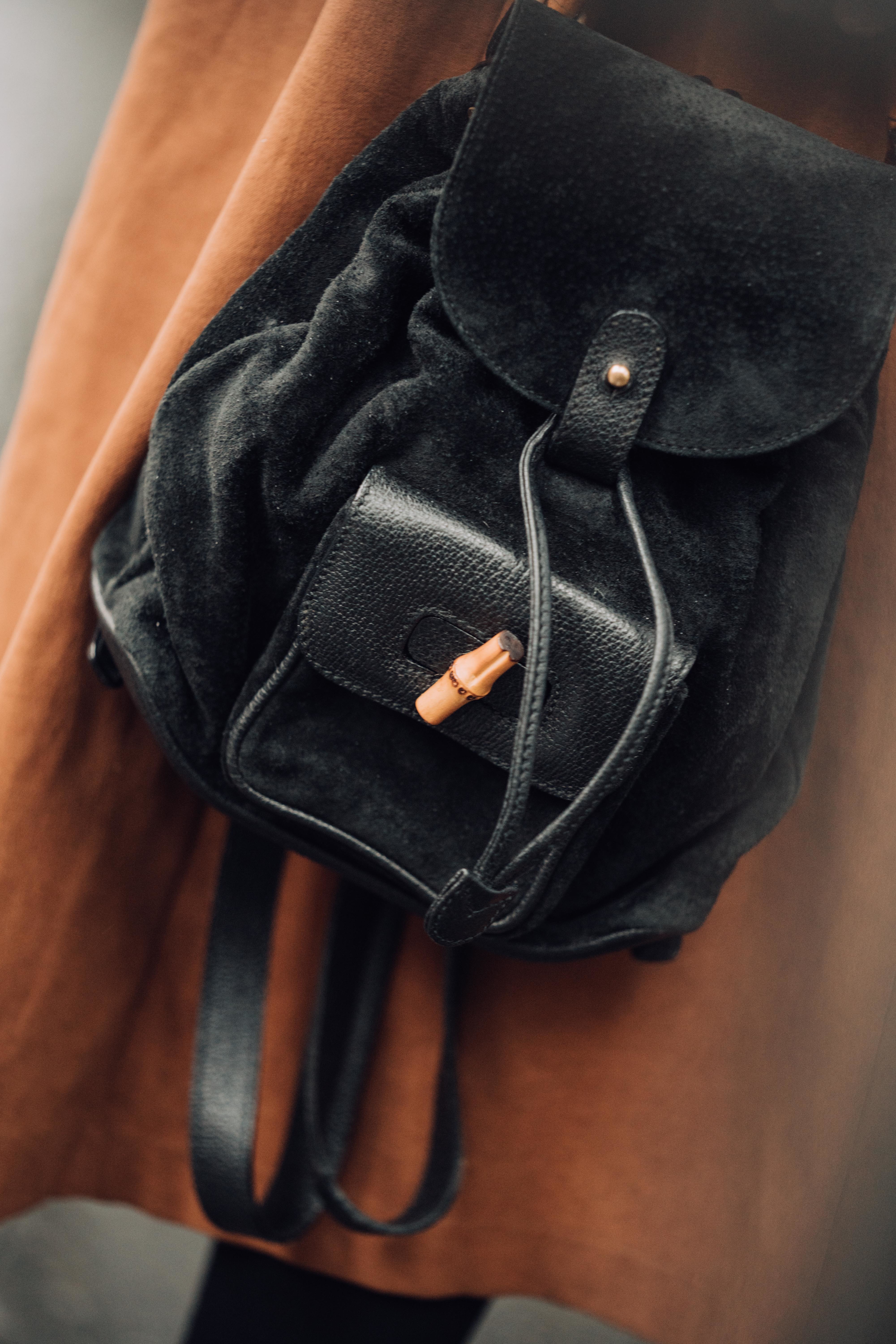 至於裙裝不方便隨身攜帶的小物,就交給市面少見的Gucci竹節麂皮後背包,小小的包身,精緻有型地替你收妥各式物件,也為你的衣著增添紋理細節。