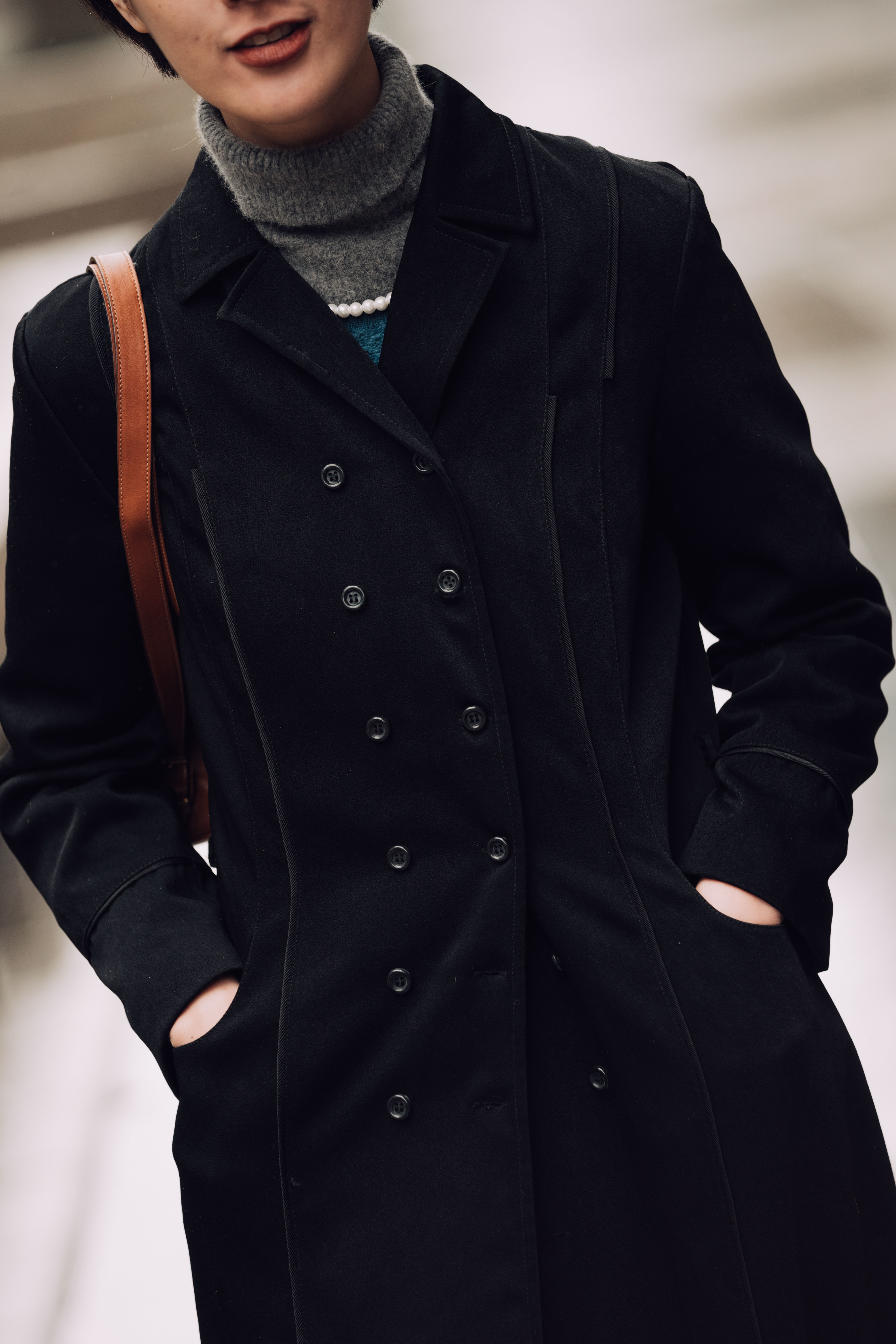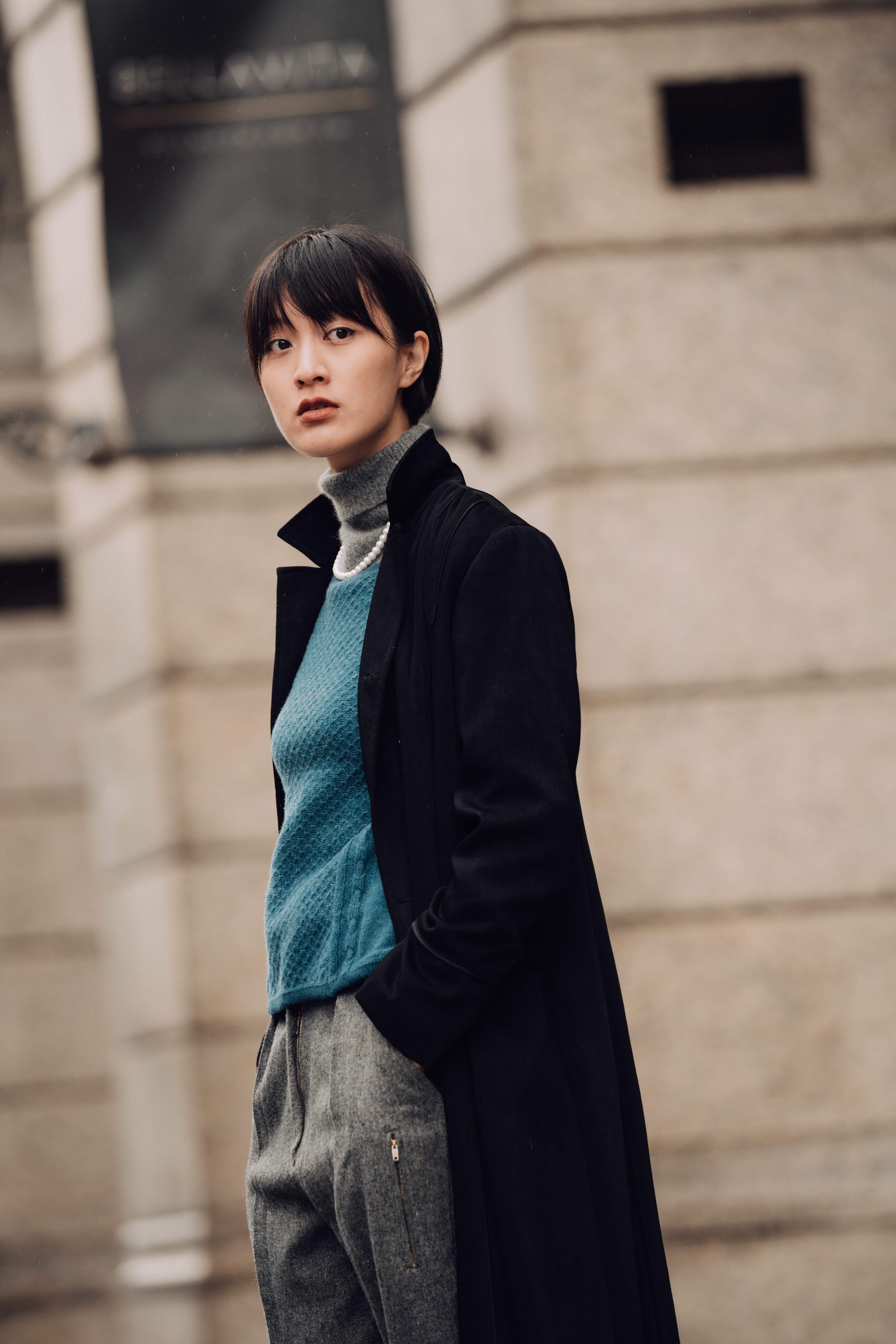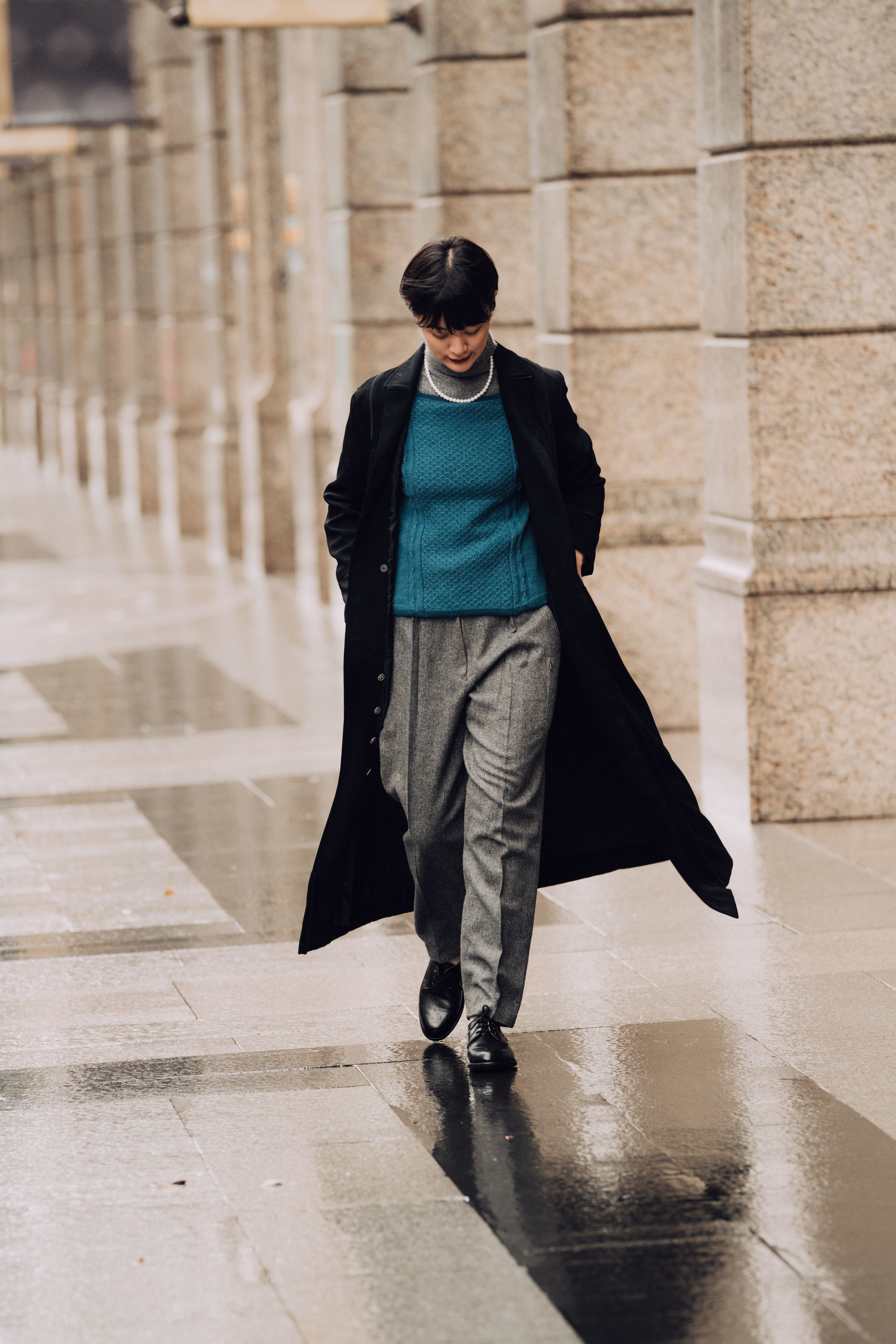 為承接整體灰黑色調,利用低彩度的藍色毛衣,及一只典雅珍珠項鍊,以細緻的筆法勾勒出冬日裡的率性身影。