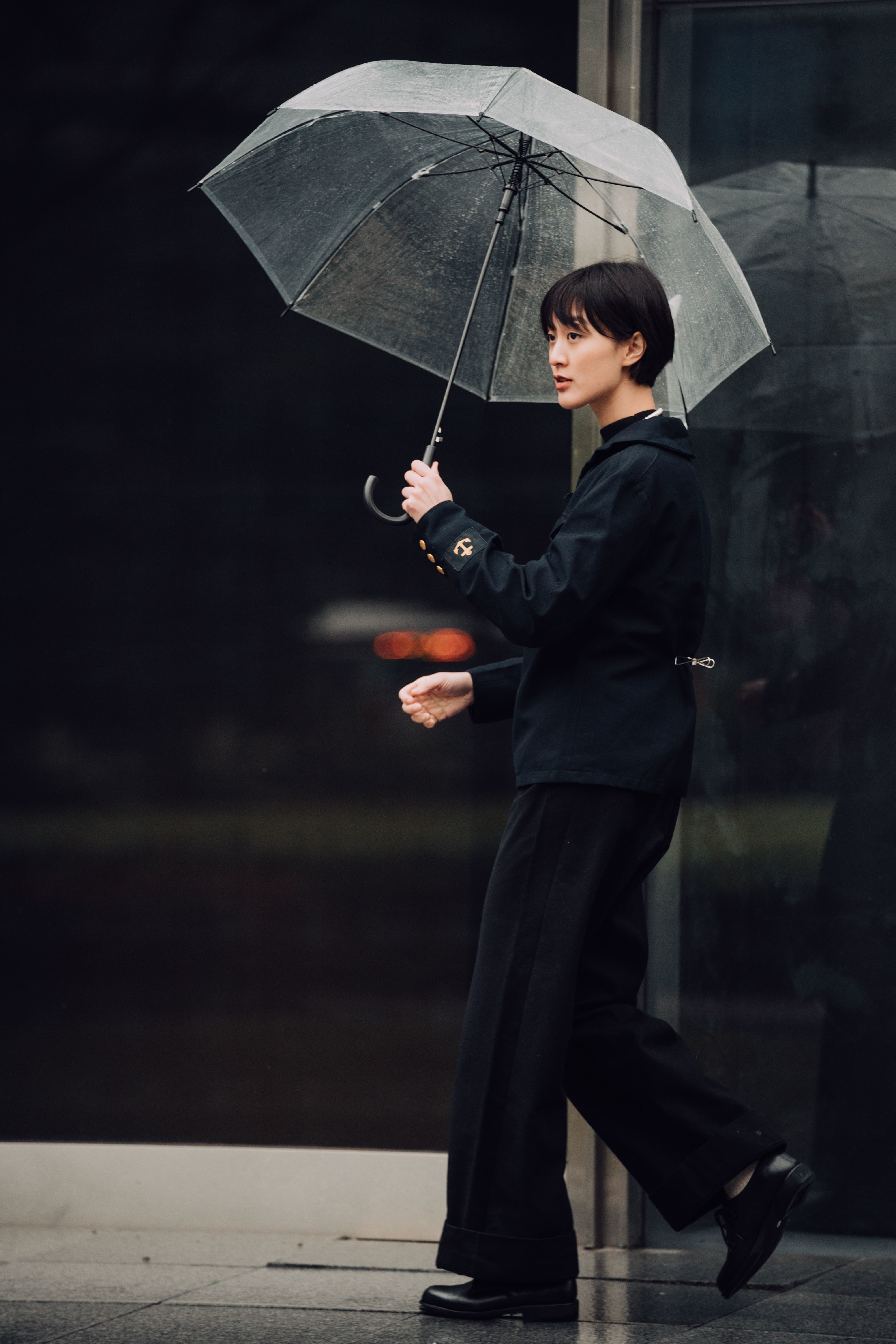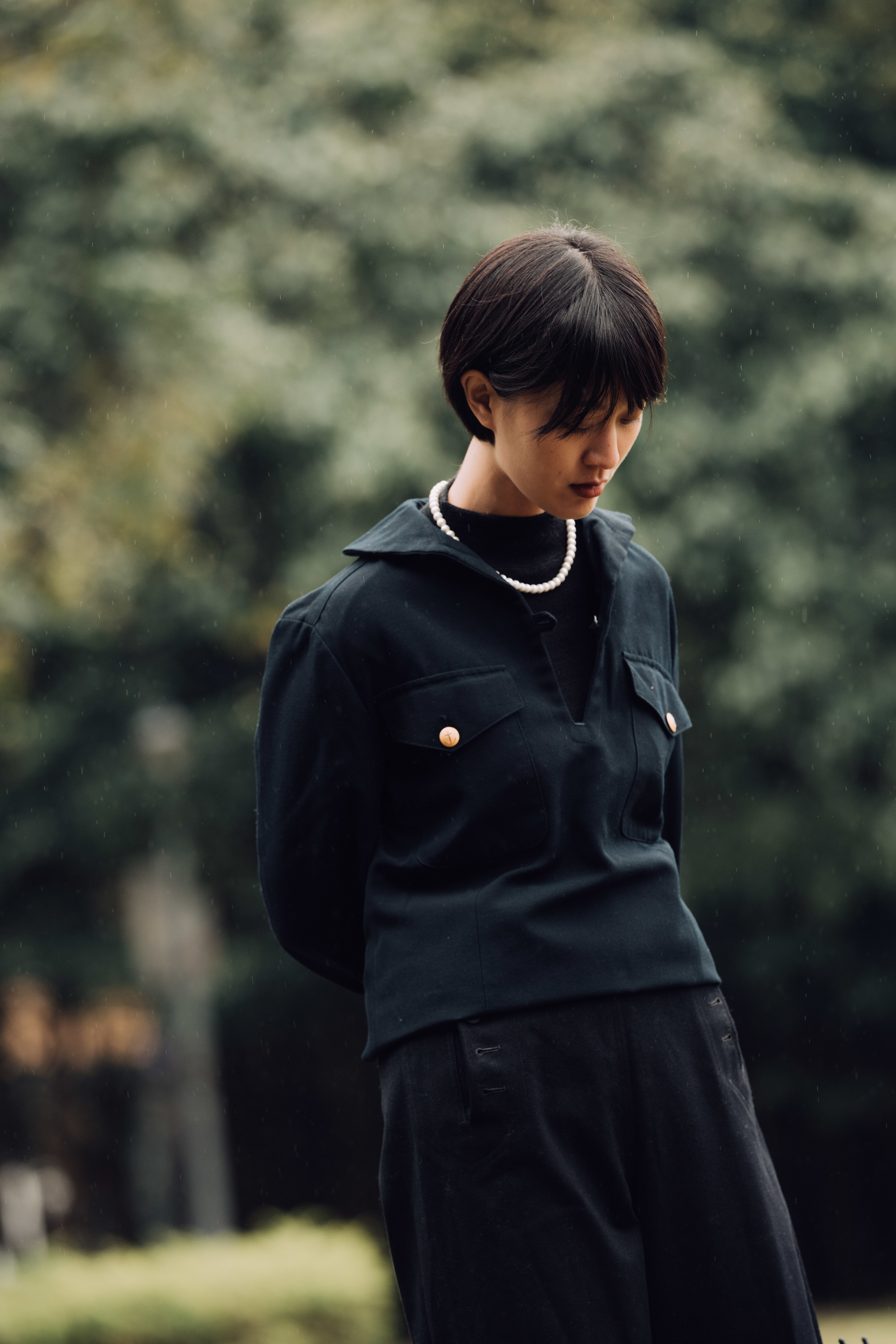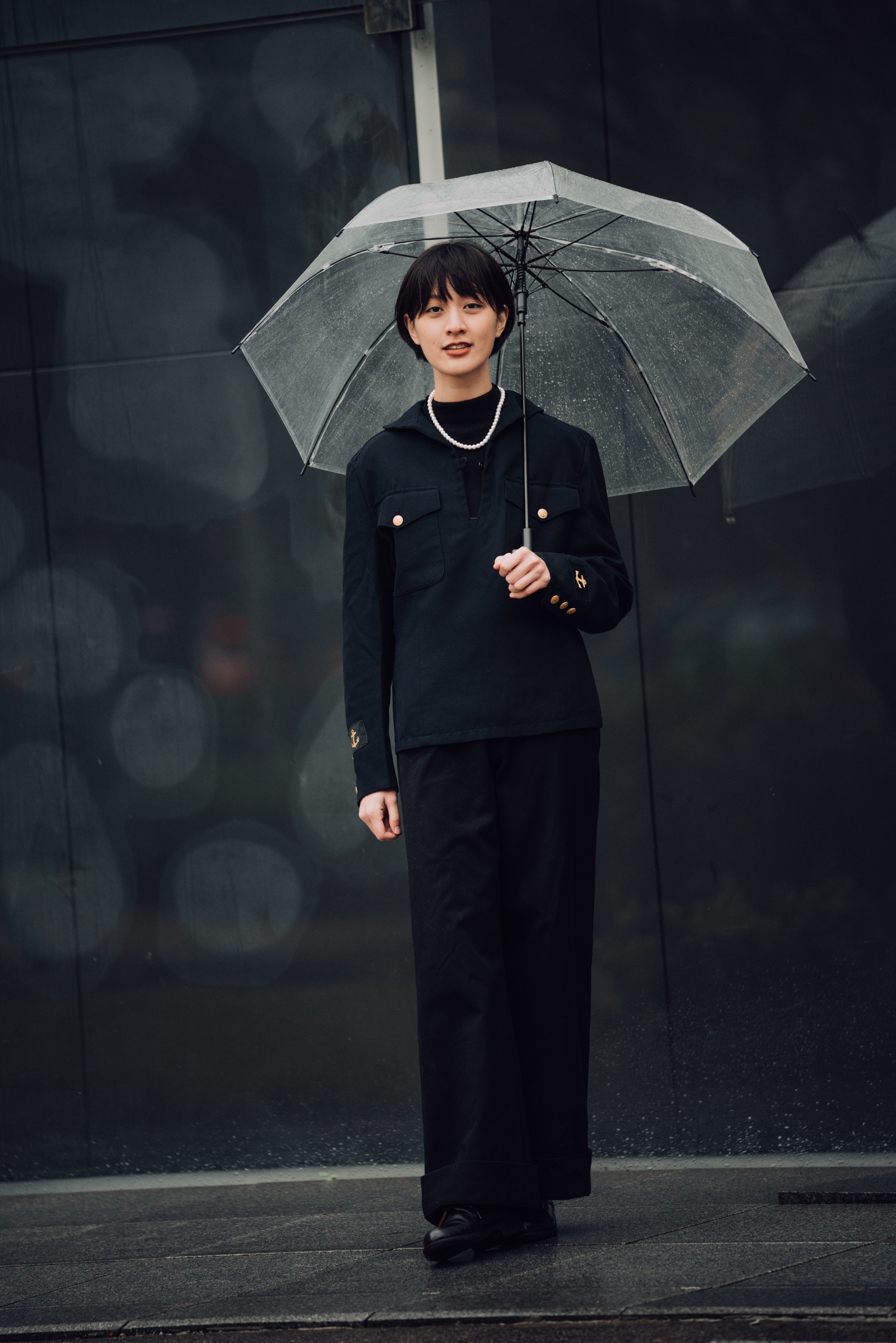 為承接整體灰黑色調,利用低彩度的藍色毛衣,及一只典雅珍珠項鍊,以細緻的筆法勾勒出冬日裡的率性身影。