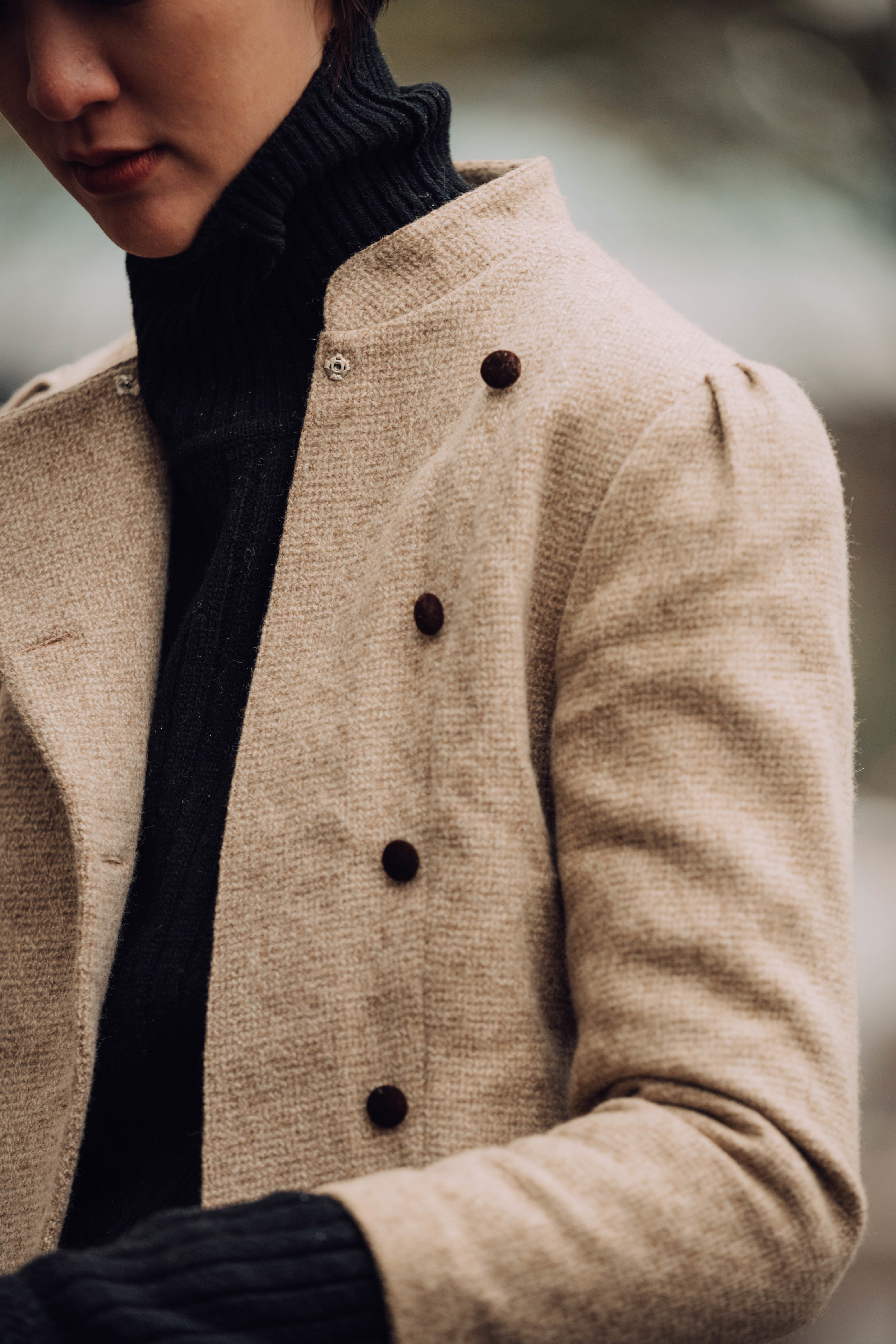 在外頭,為自己添一件有著柔和剪裁的古著毛呢外套,擁抱暖意。