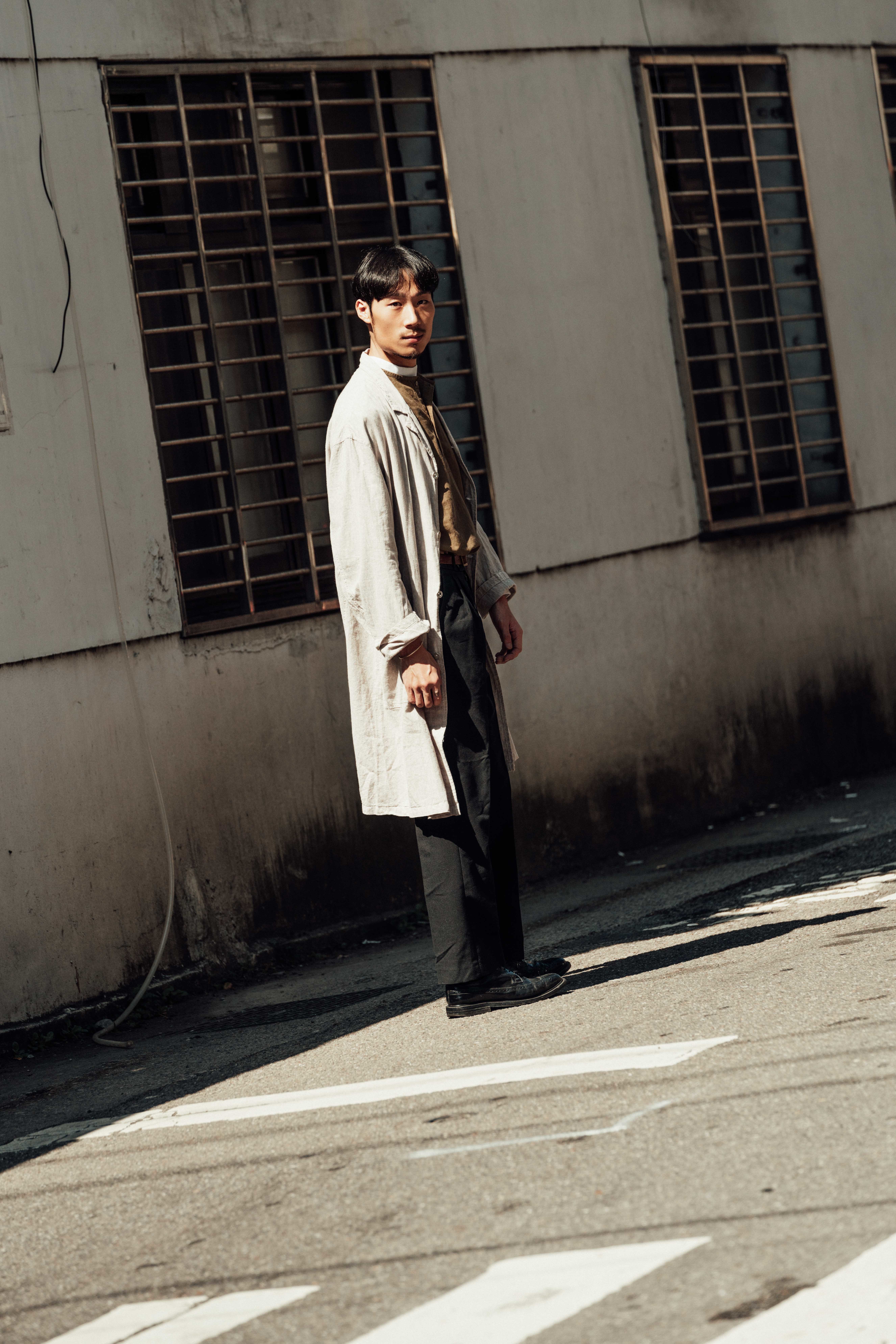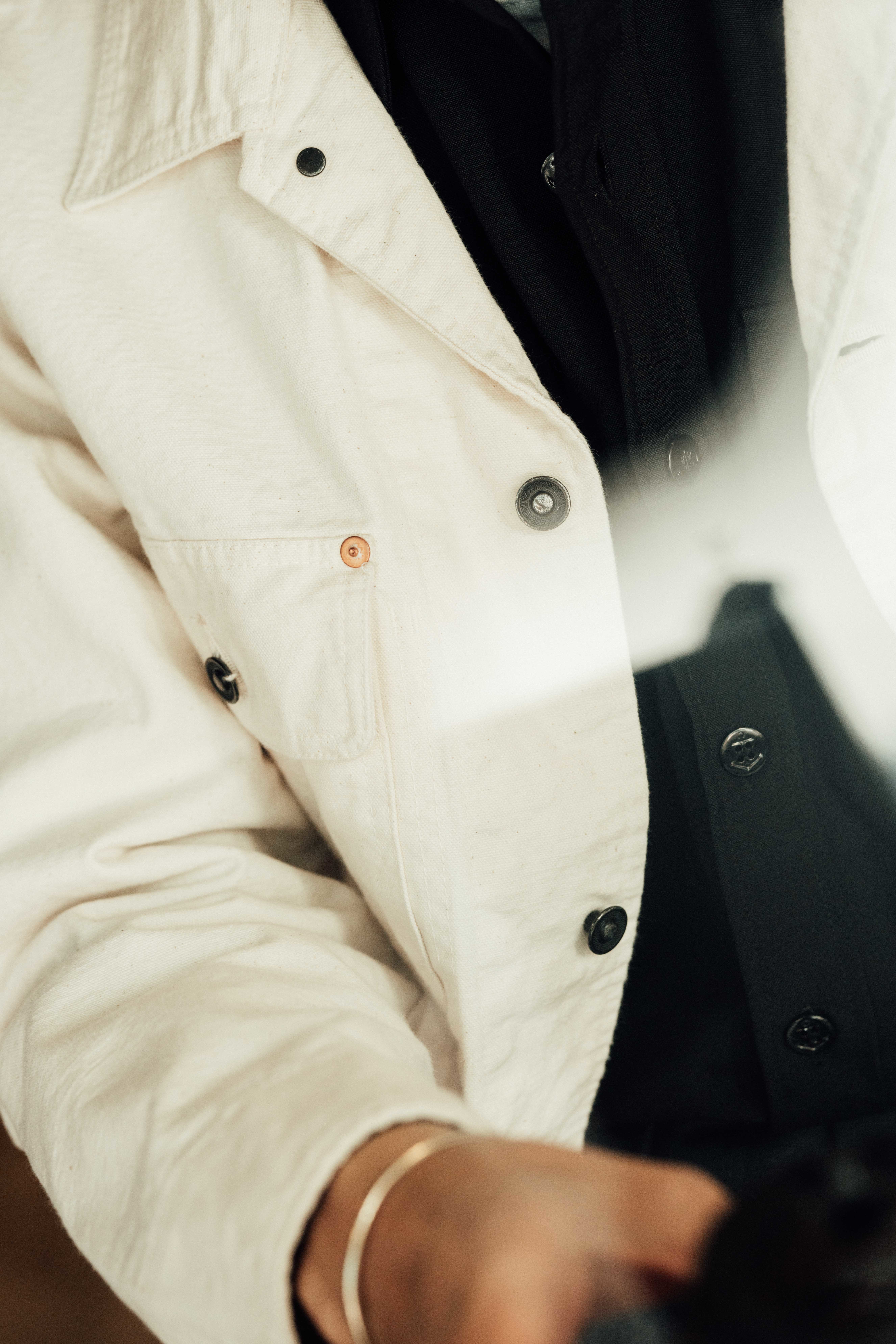 工作襯衫來自50年代以工裝起家的LE LABOUREUR,以法國勃根的傳統布料和技法製作出每一件厚實的工作外套。混亞麻的棉質有較高的韌性與透氣性,無論是農業或是其他工作場合都能舒適自在。褲款搭配純白的德國海軍褲,以鈕扣固定的褲頭也採用淺色的縫線,營造大方清爽的男子魅力。