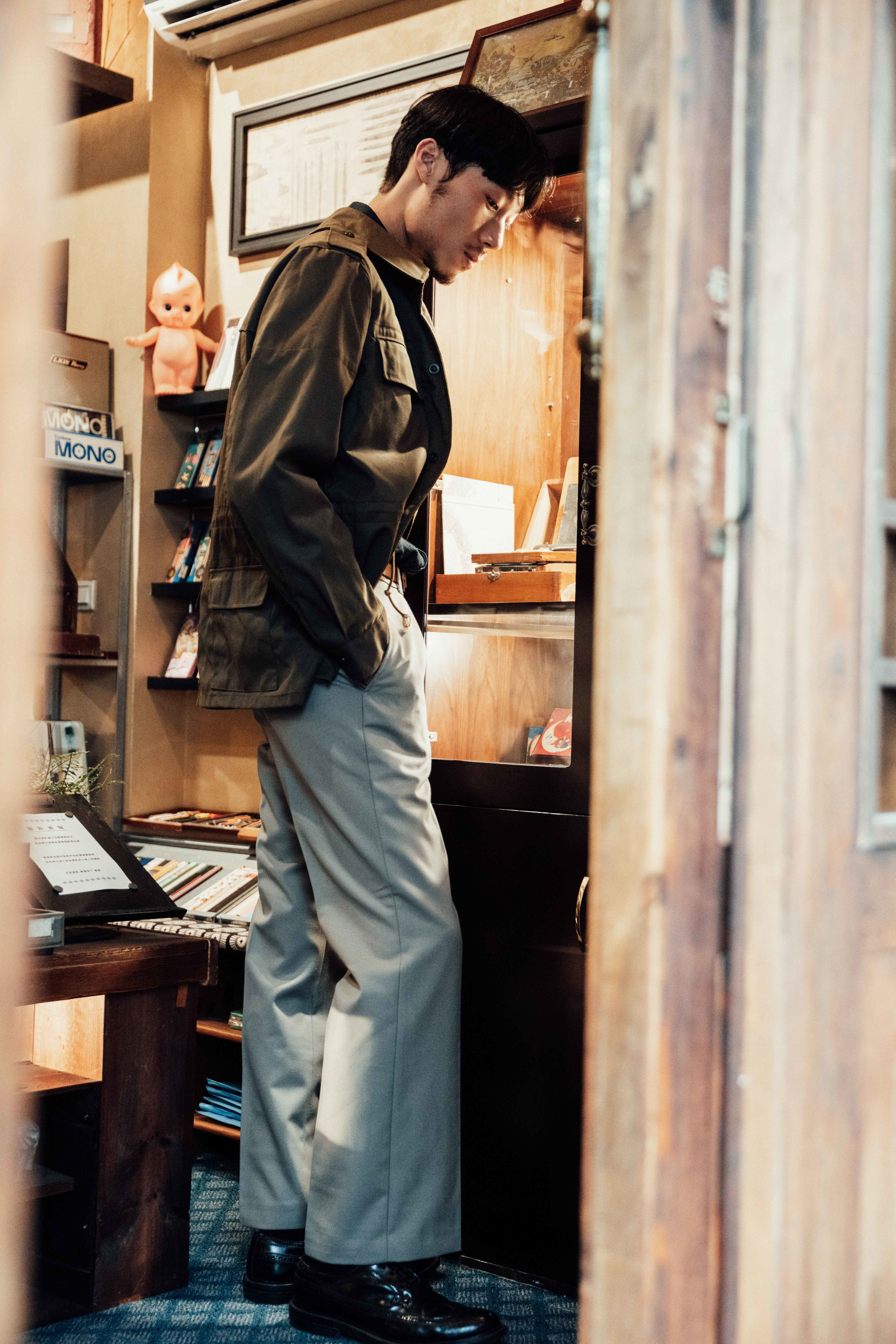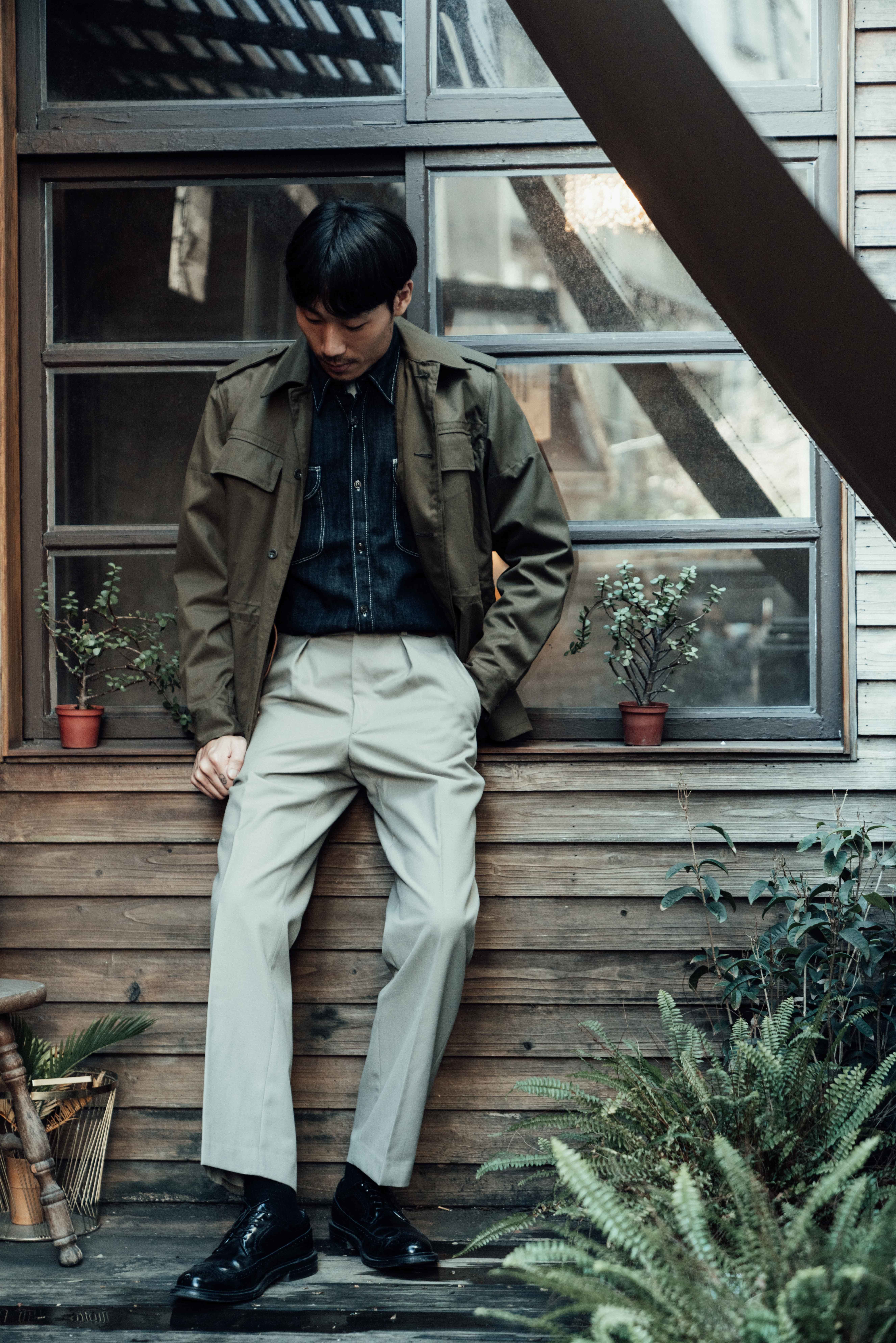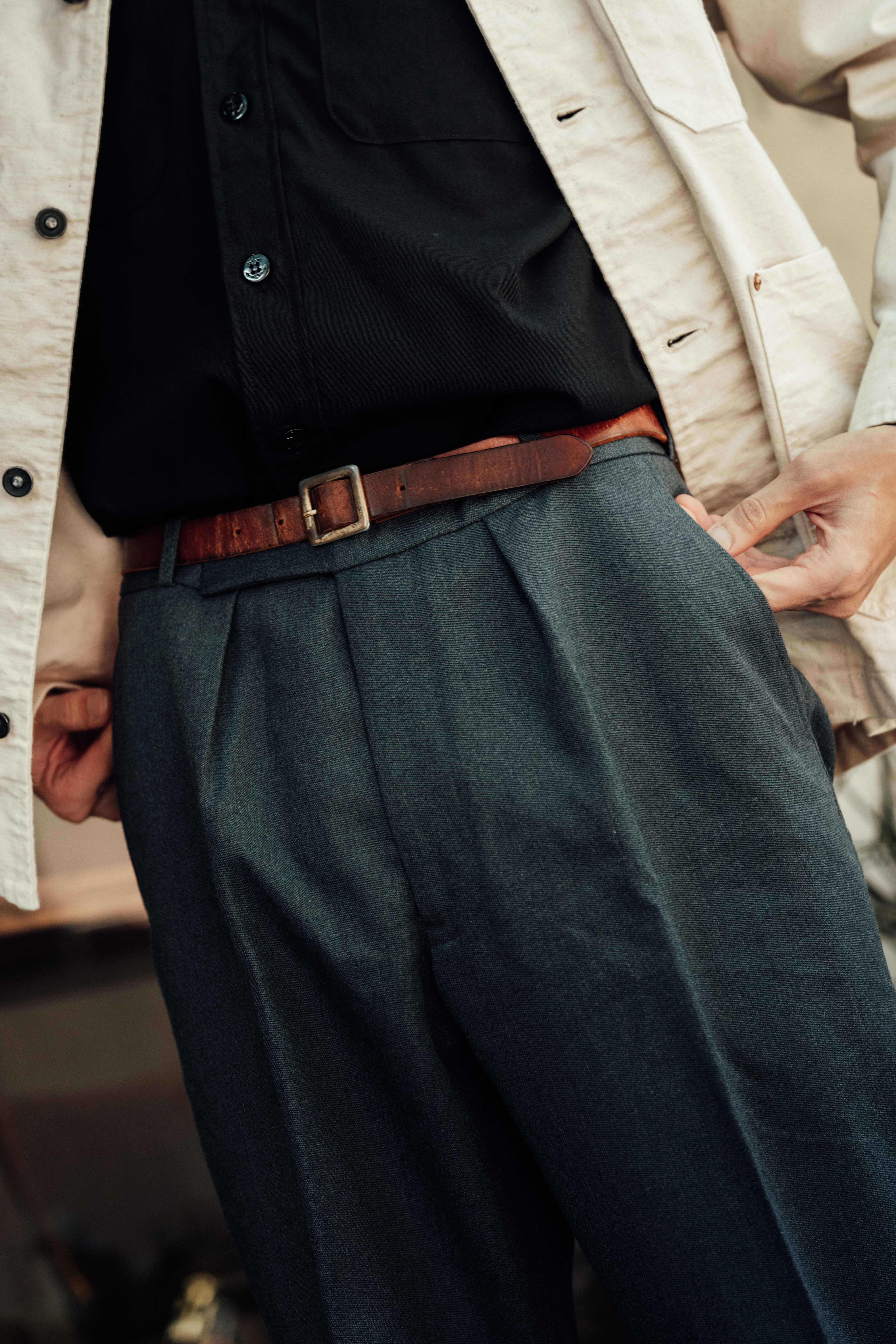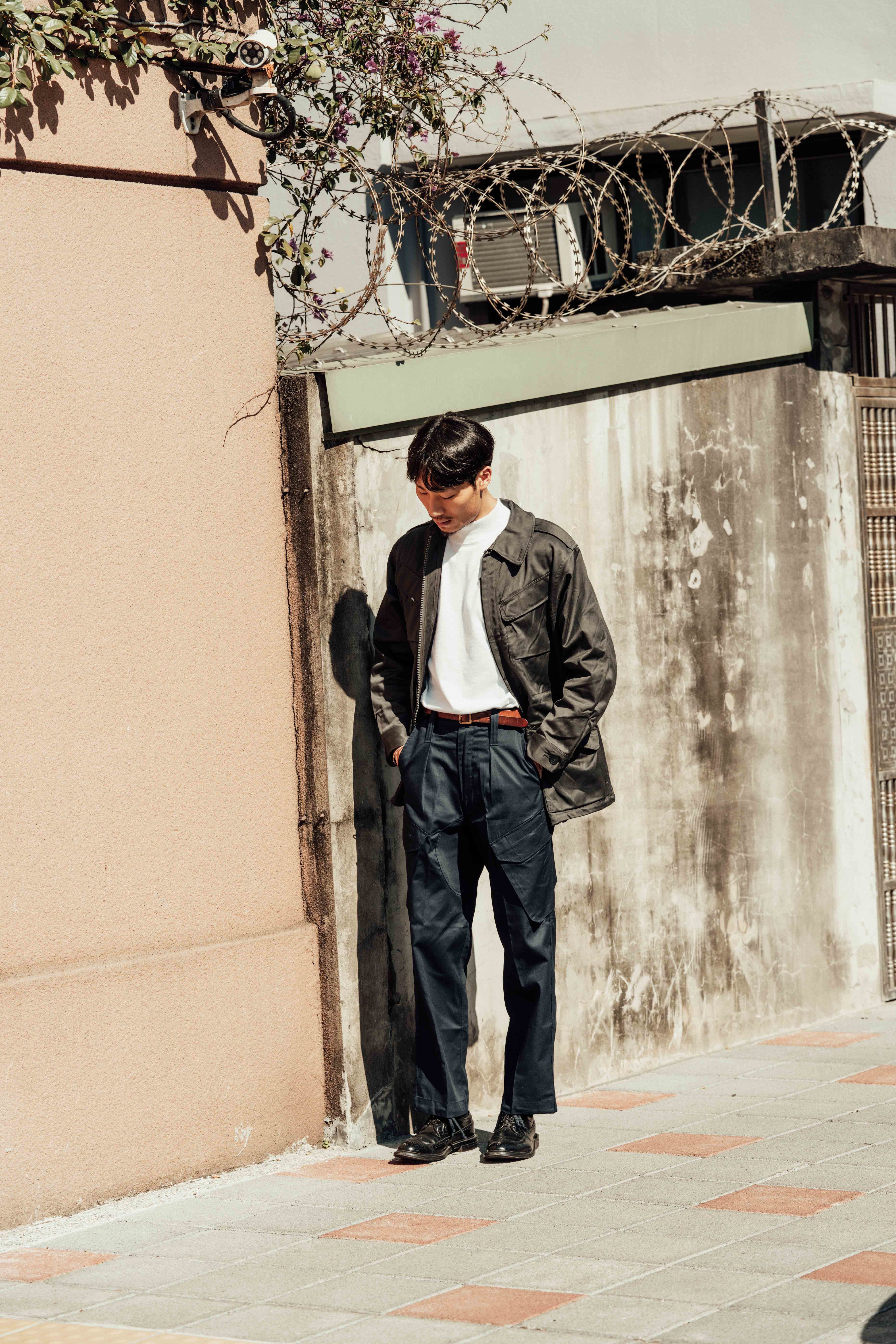 下身搭配捷克公發M97制服褲,迷人的灰色中帶有藍綠的色調,皺褶的設計與腰間滑桿的金屬釦襯托出身形的立體感,讓你在步伐當中散發自信。