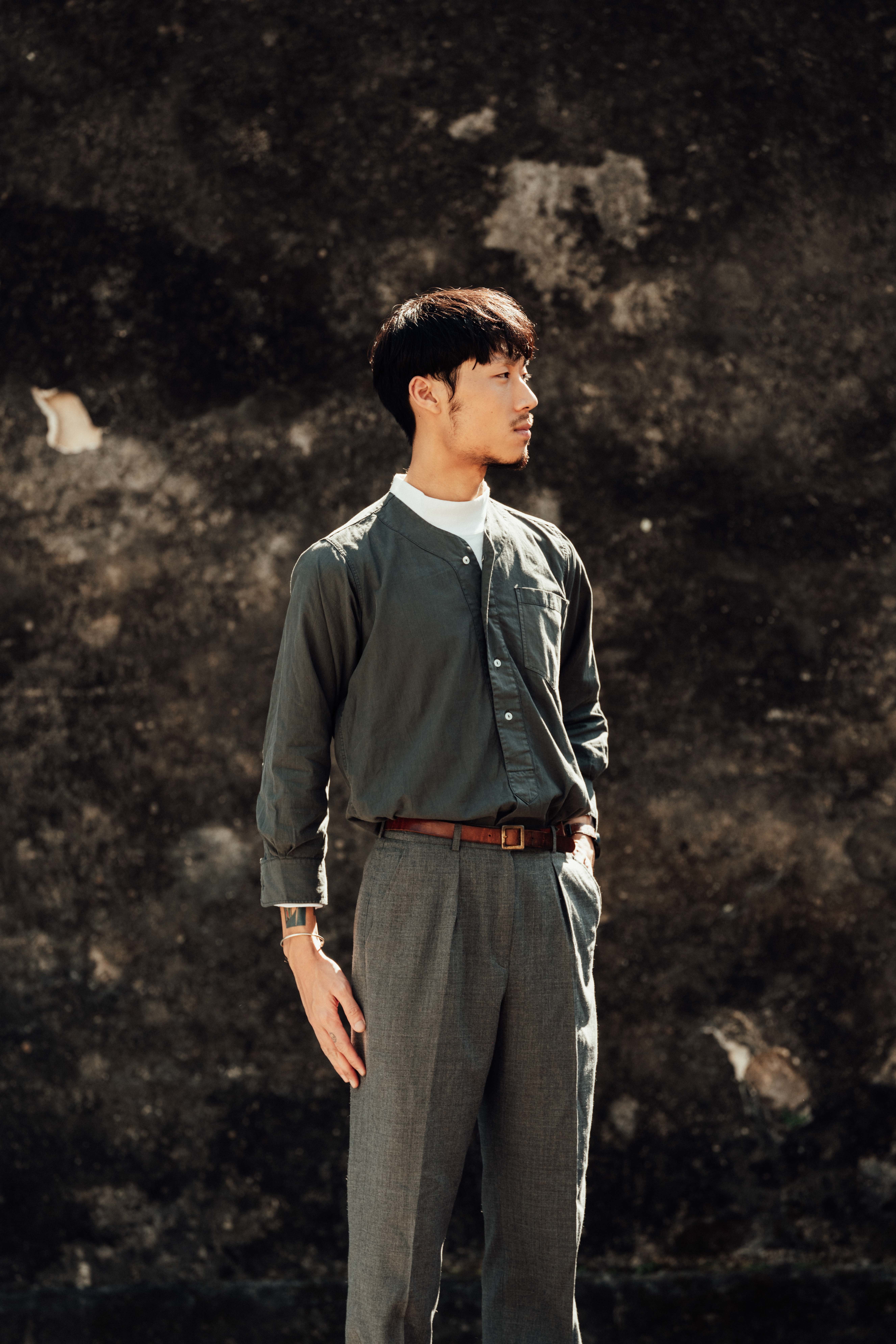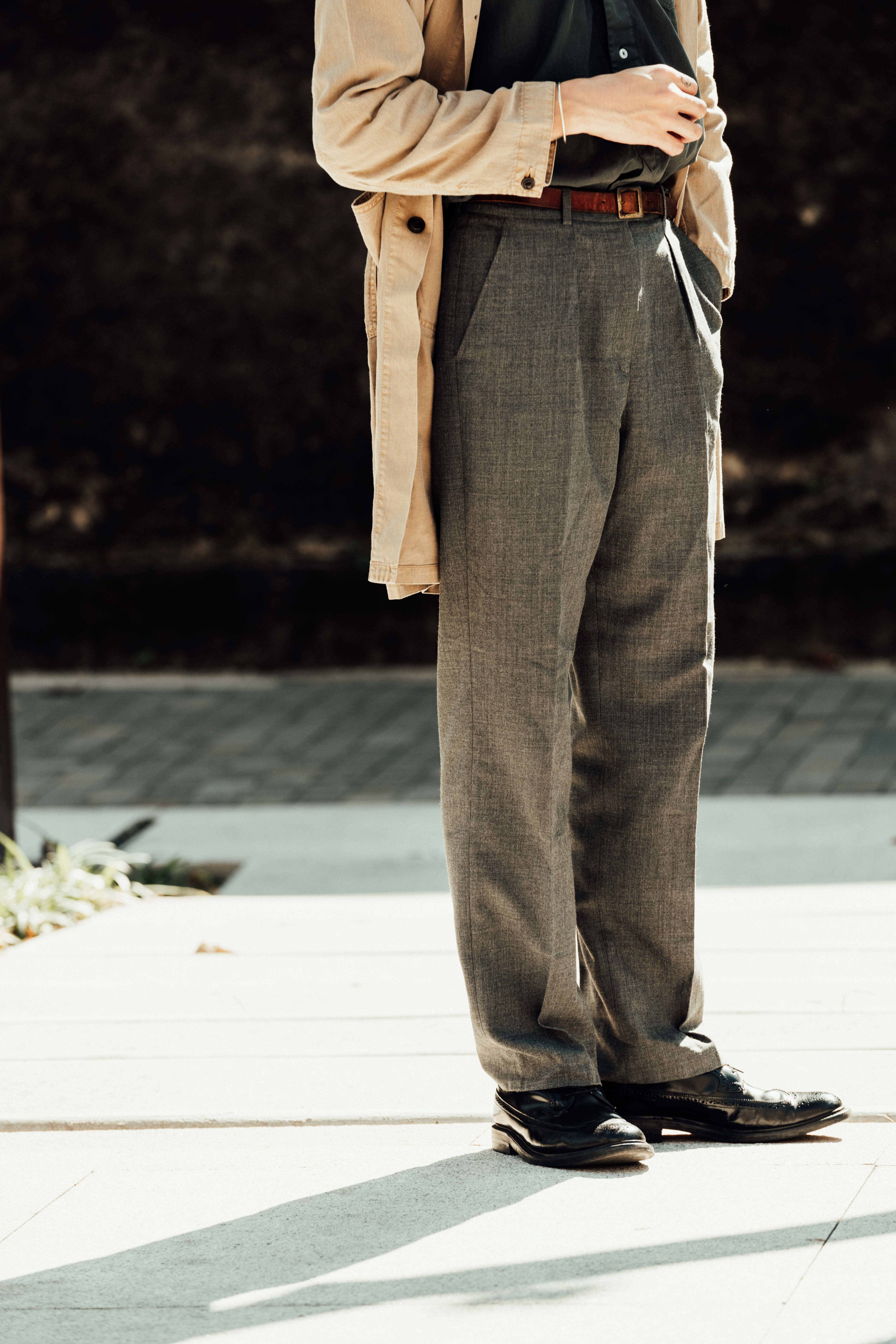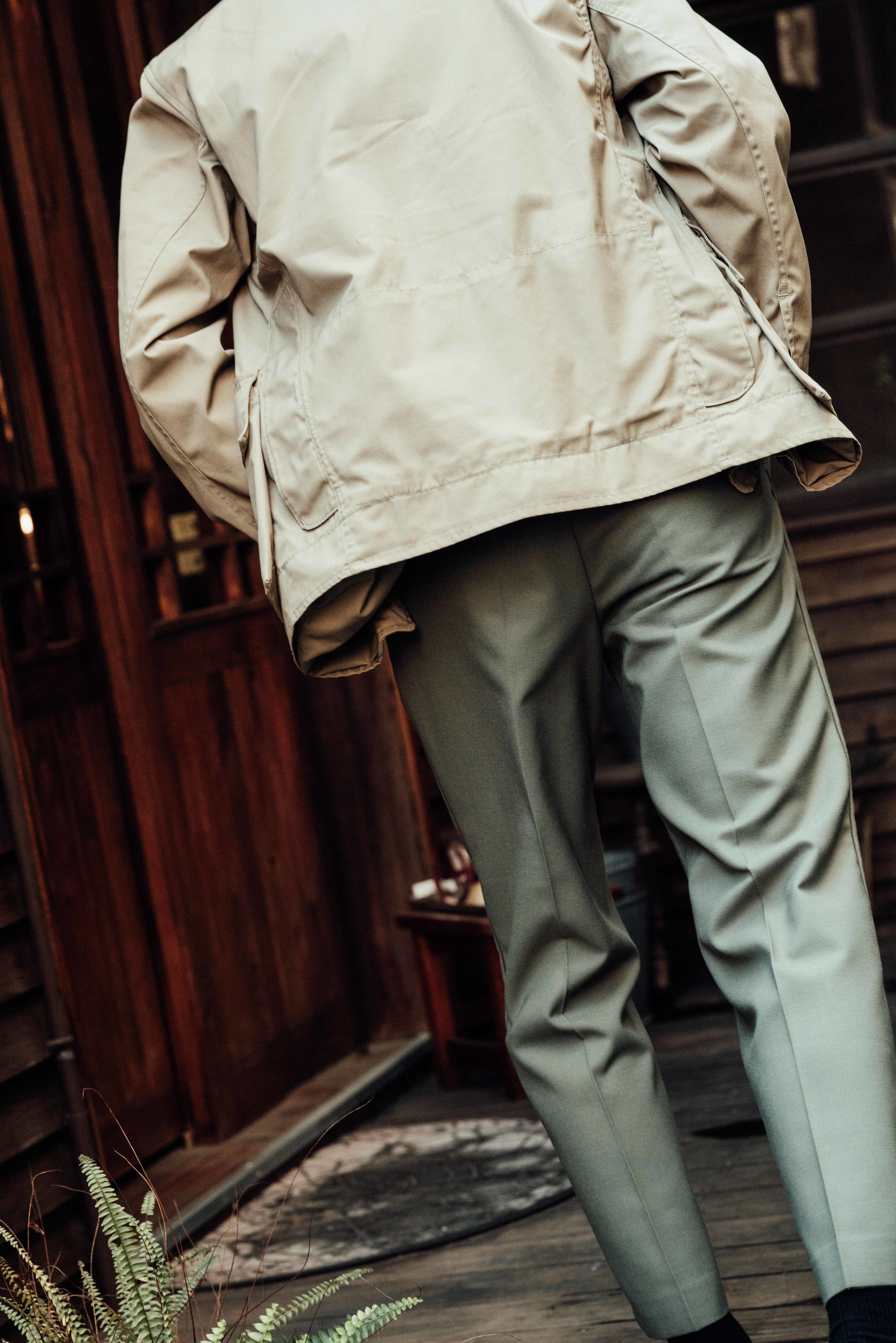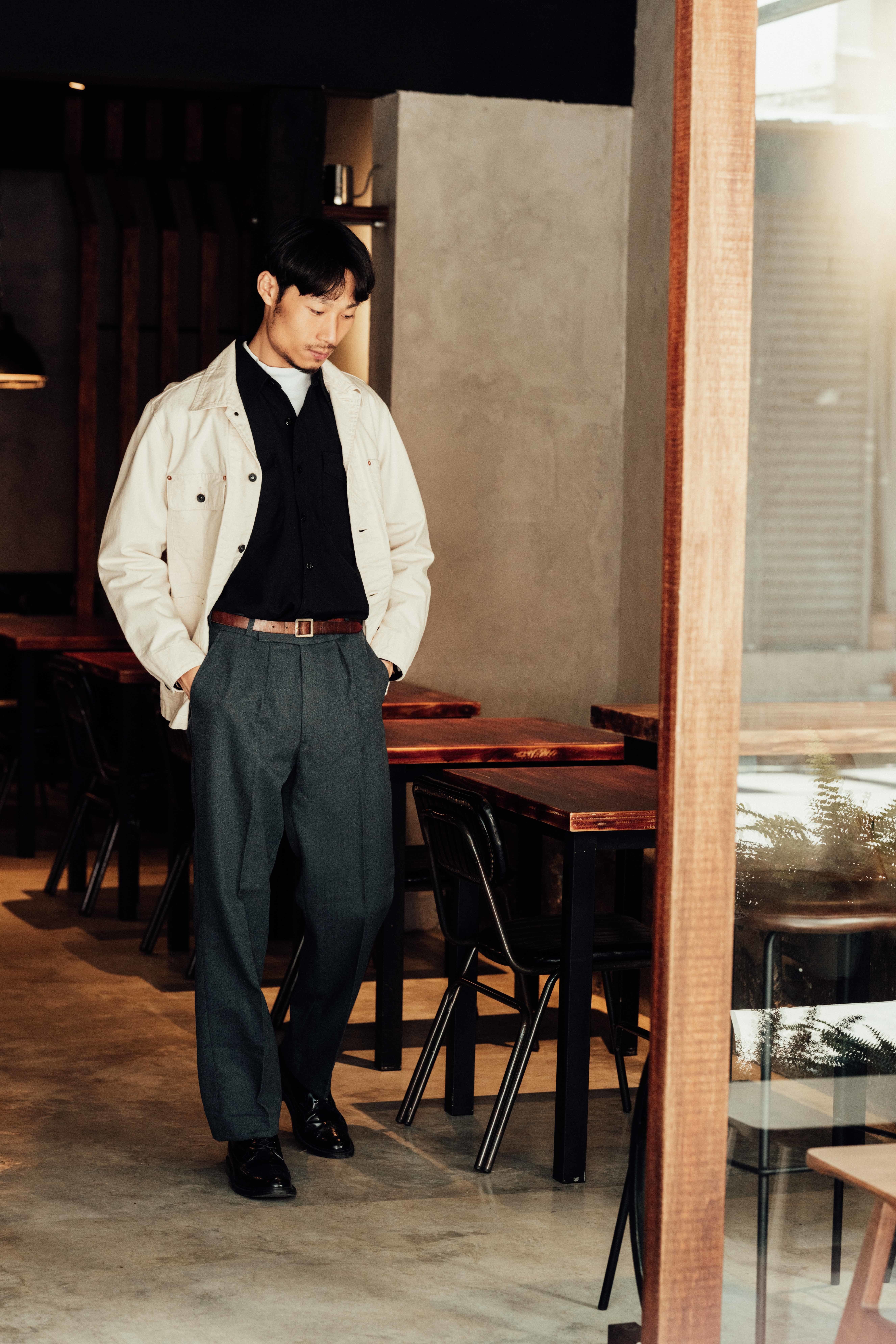 下身搭配捷克公發M97制服褲,迷人的灰色中帶有藍綠的色調,皺褶的設計與腰間滑桿的金屬釦襯托出身形的立體感,讓你在步伐當中散發自信。