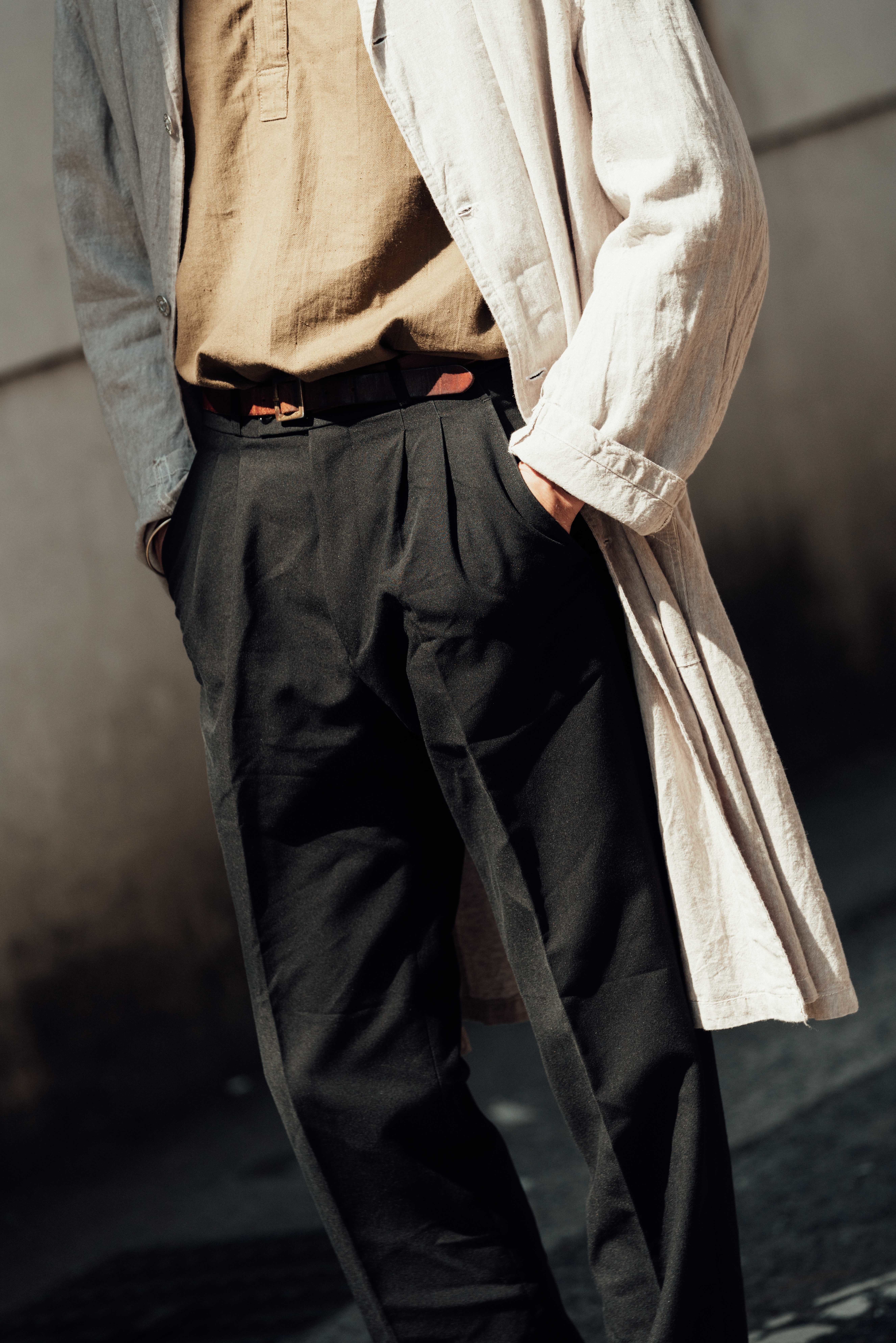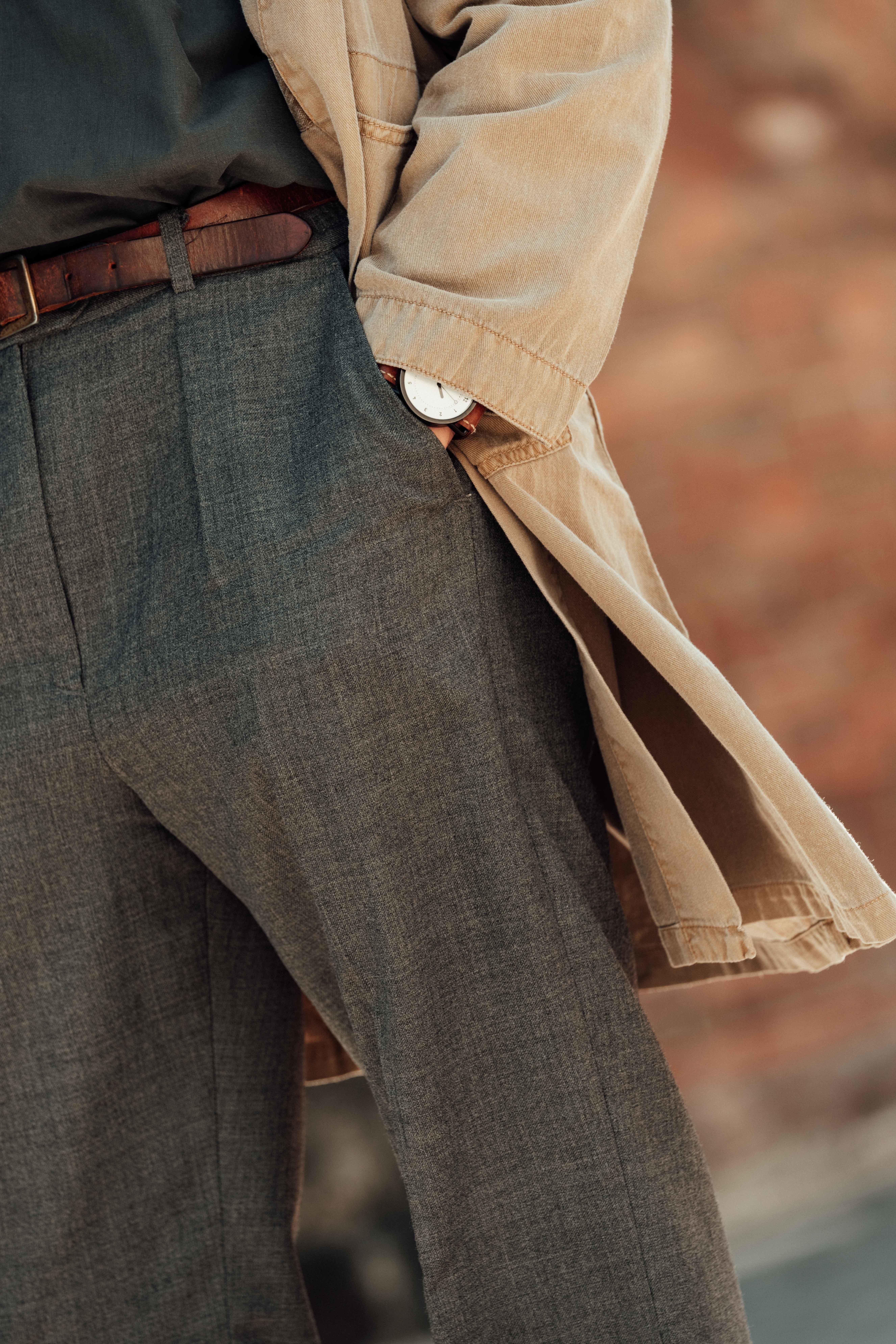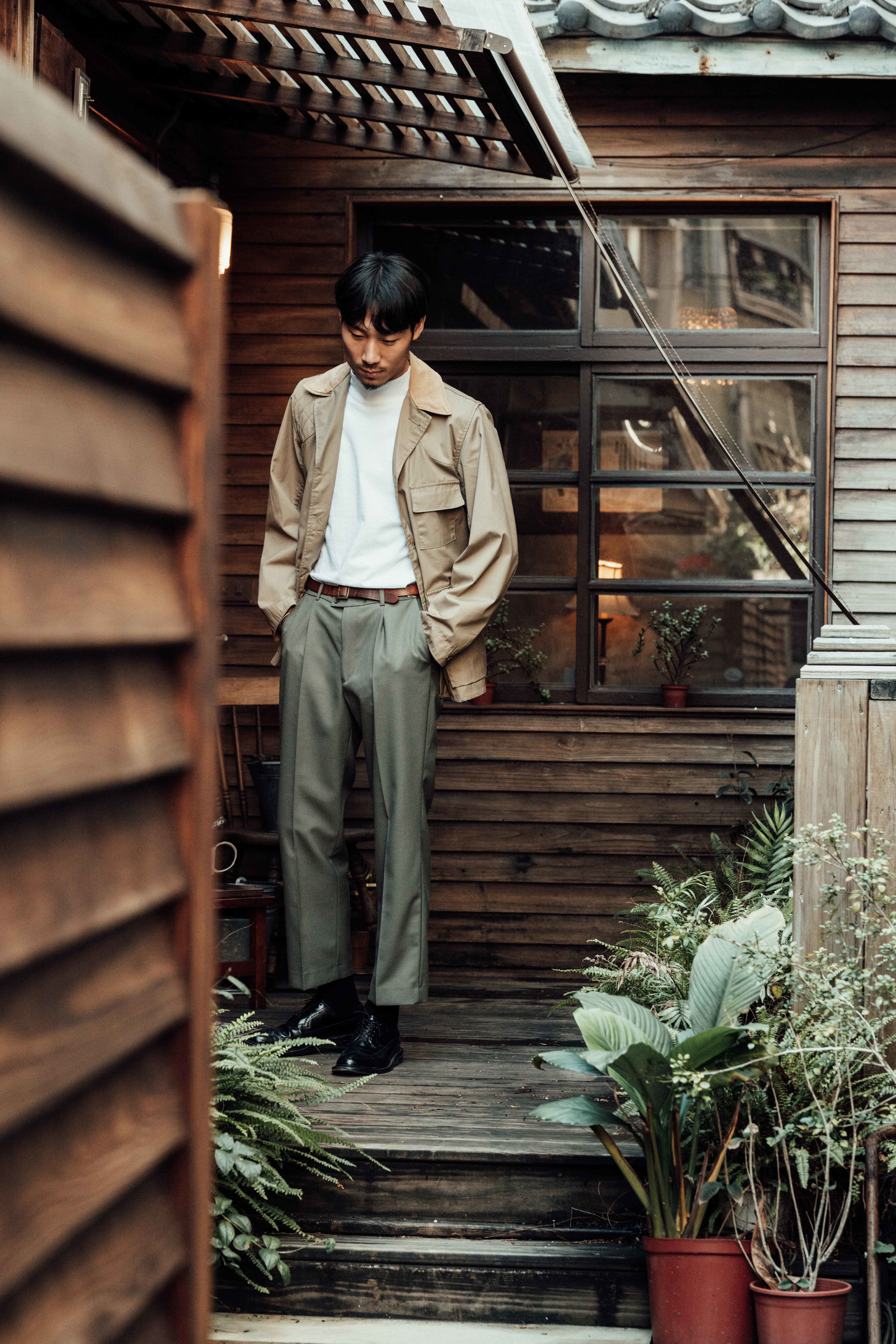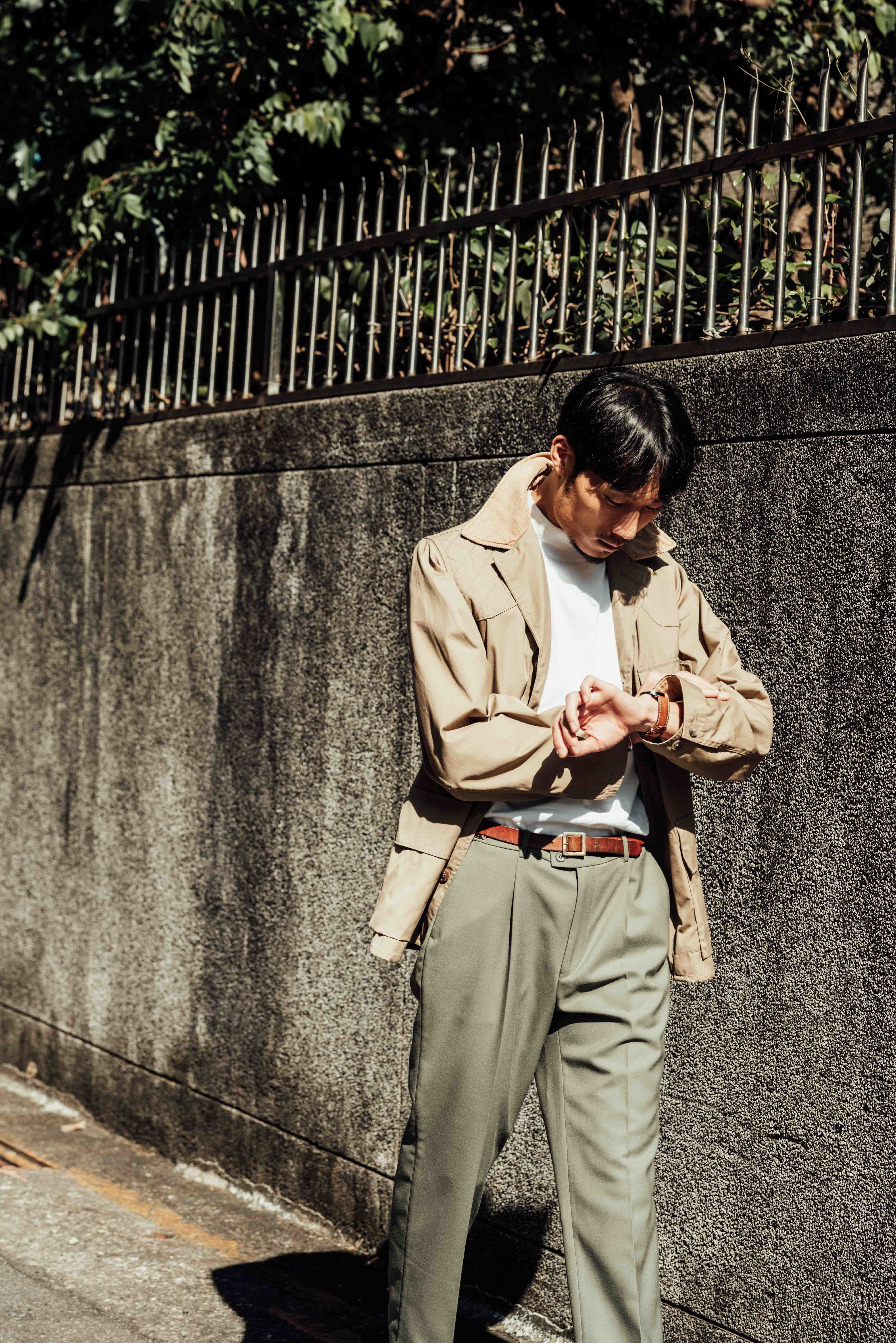 下身搭配捷克公發M97制服褲,迷人的灰色中帶有藍綠的色調,皺褶的設計與腰間滑桿的金屬釦襯托出身形的立體感,讓你在步伐當中散發自信。