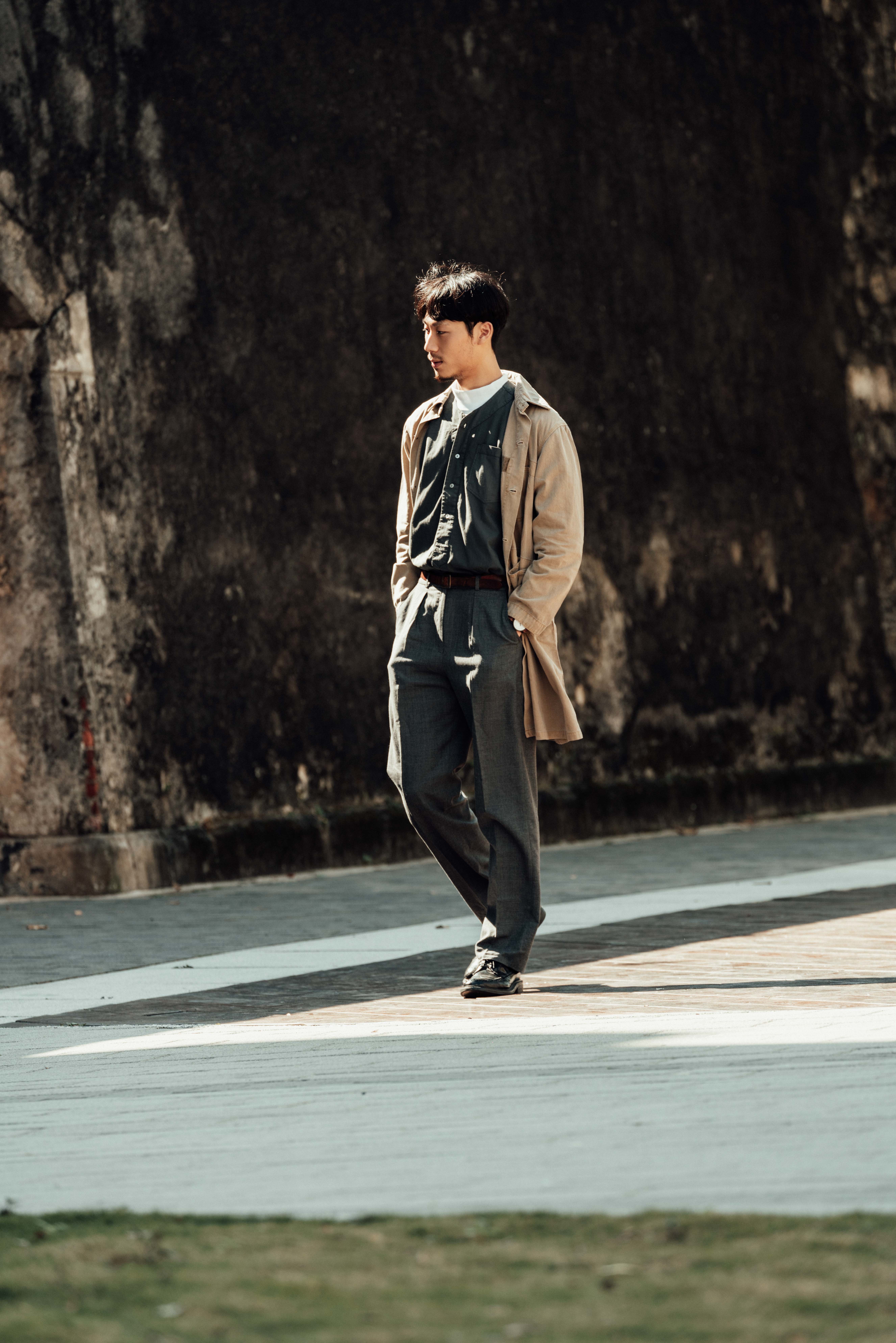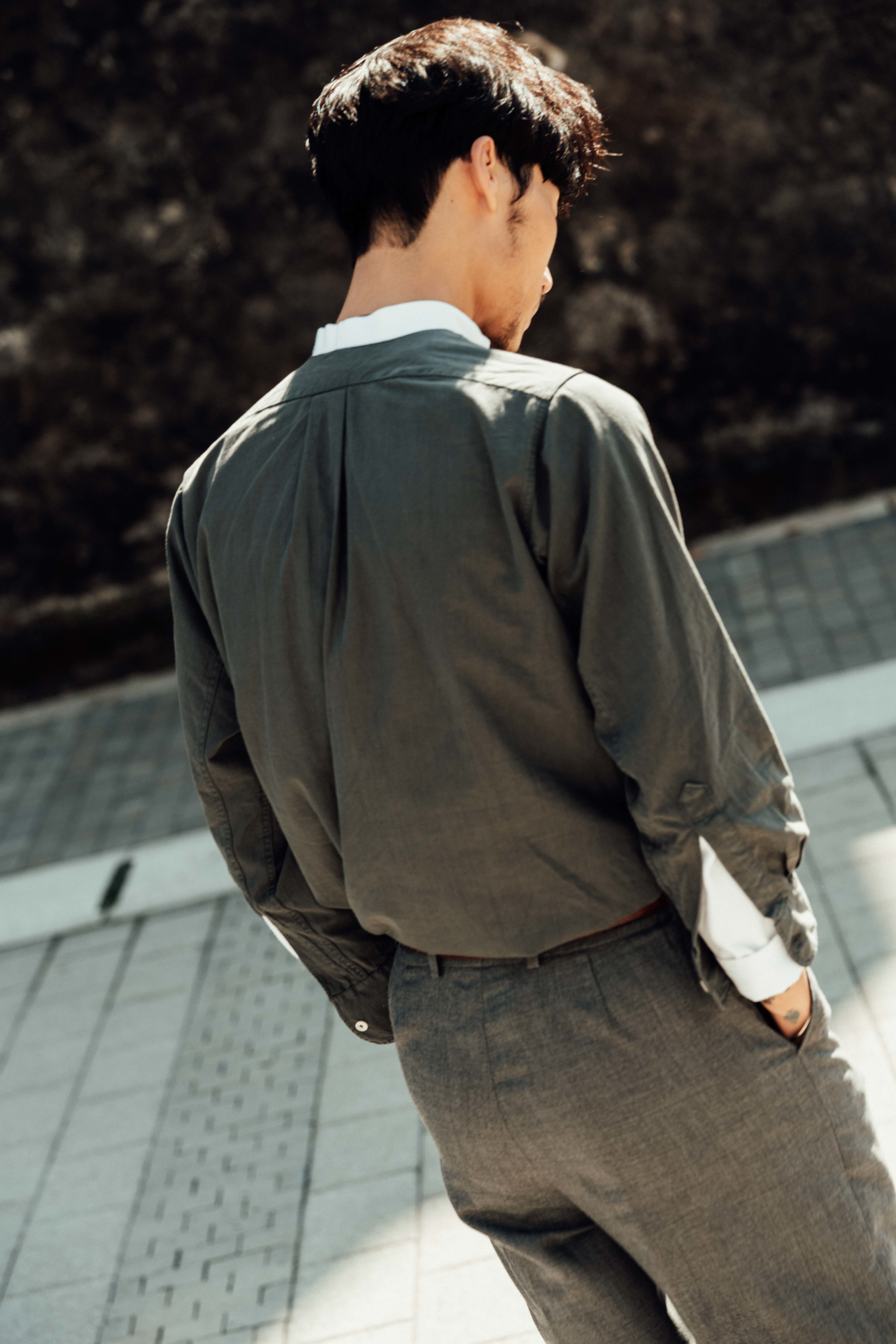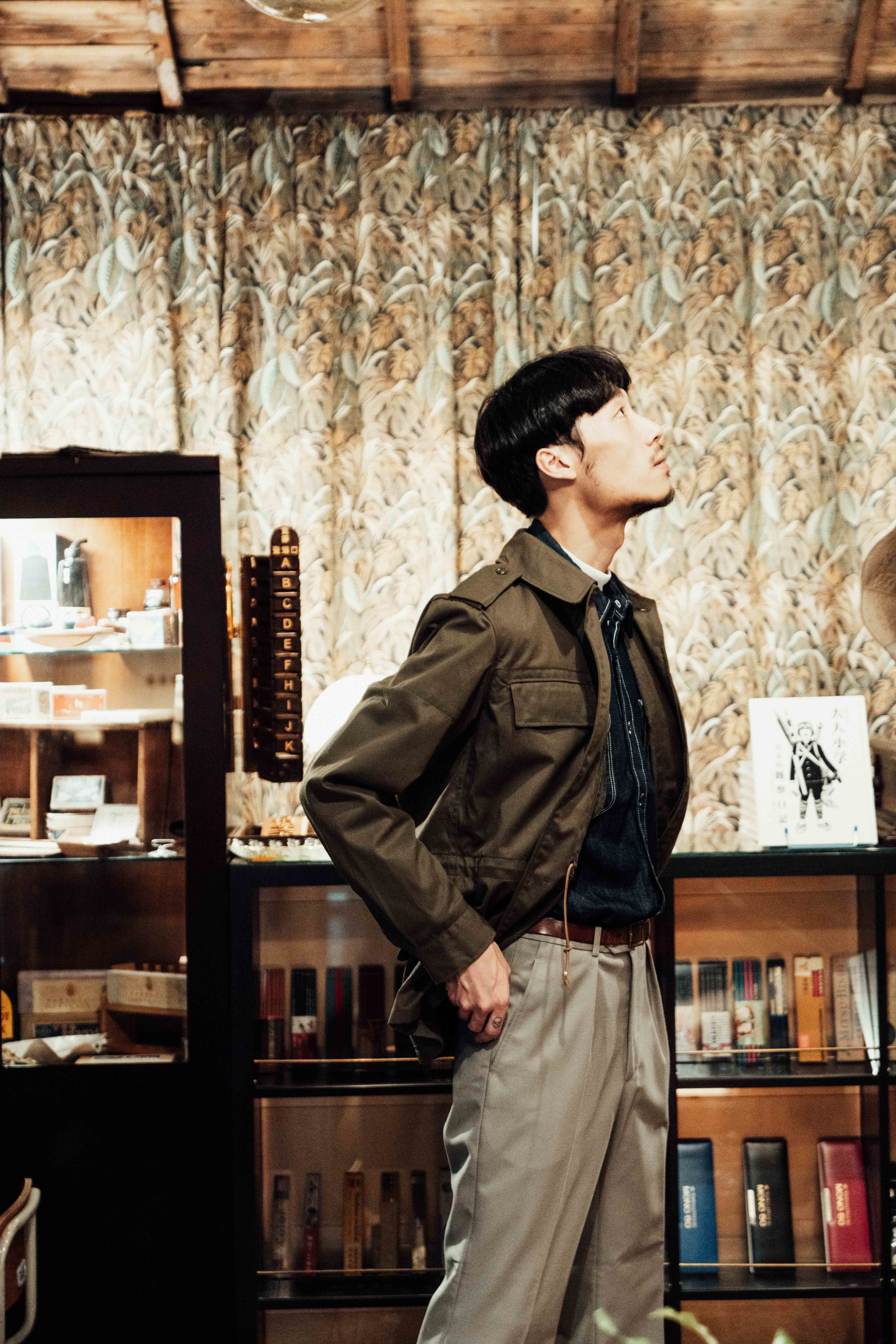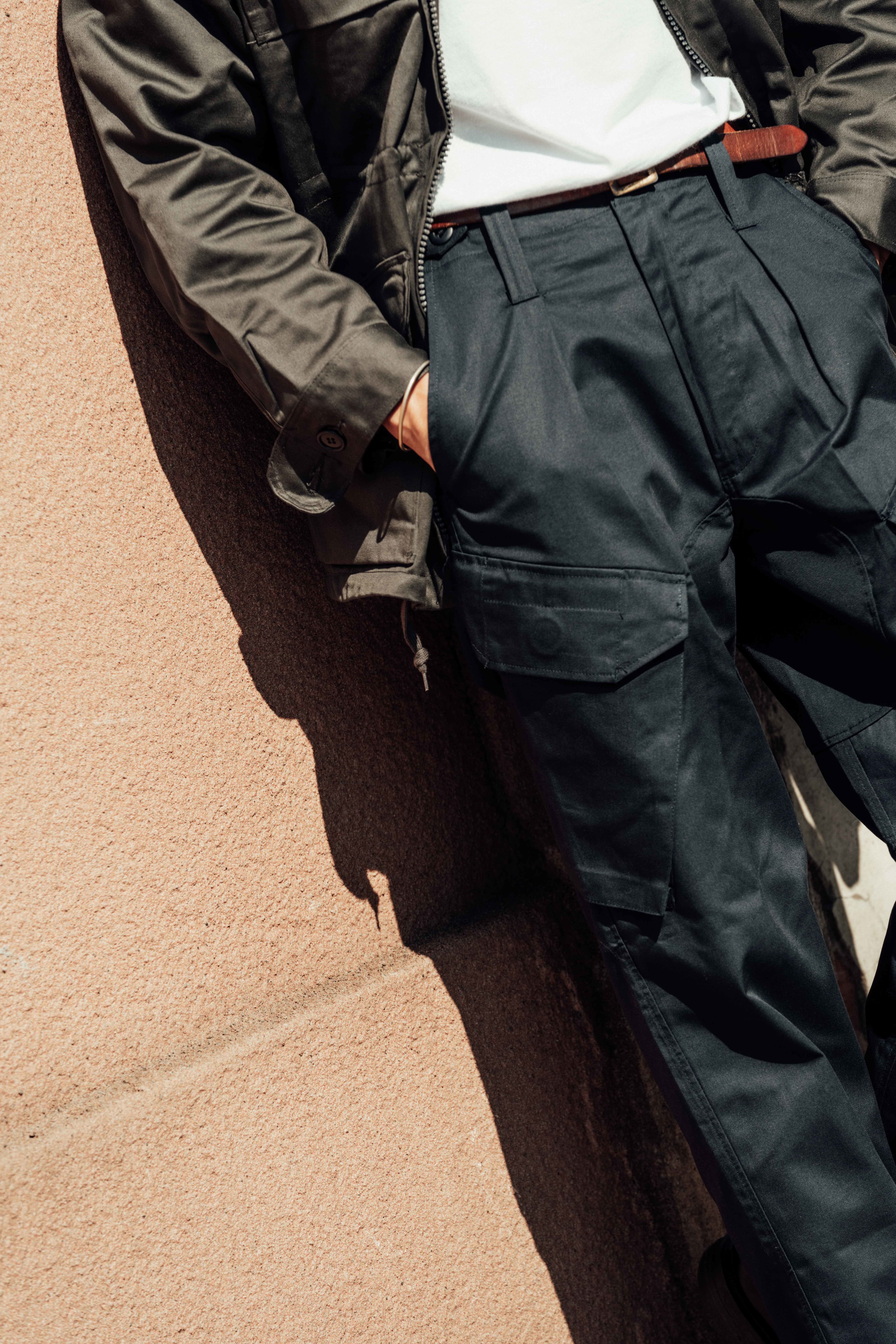 下身搭配捷克公發M97制服褲,迷人的灰色中帶有藍綠的色調,皺褶的設計與腰間滑桿的金屬釦襯托出身形的立體感,讓你在步伐當中散發自信。
