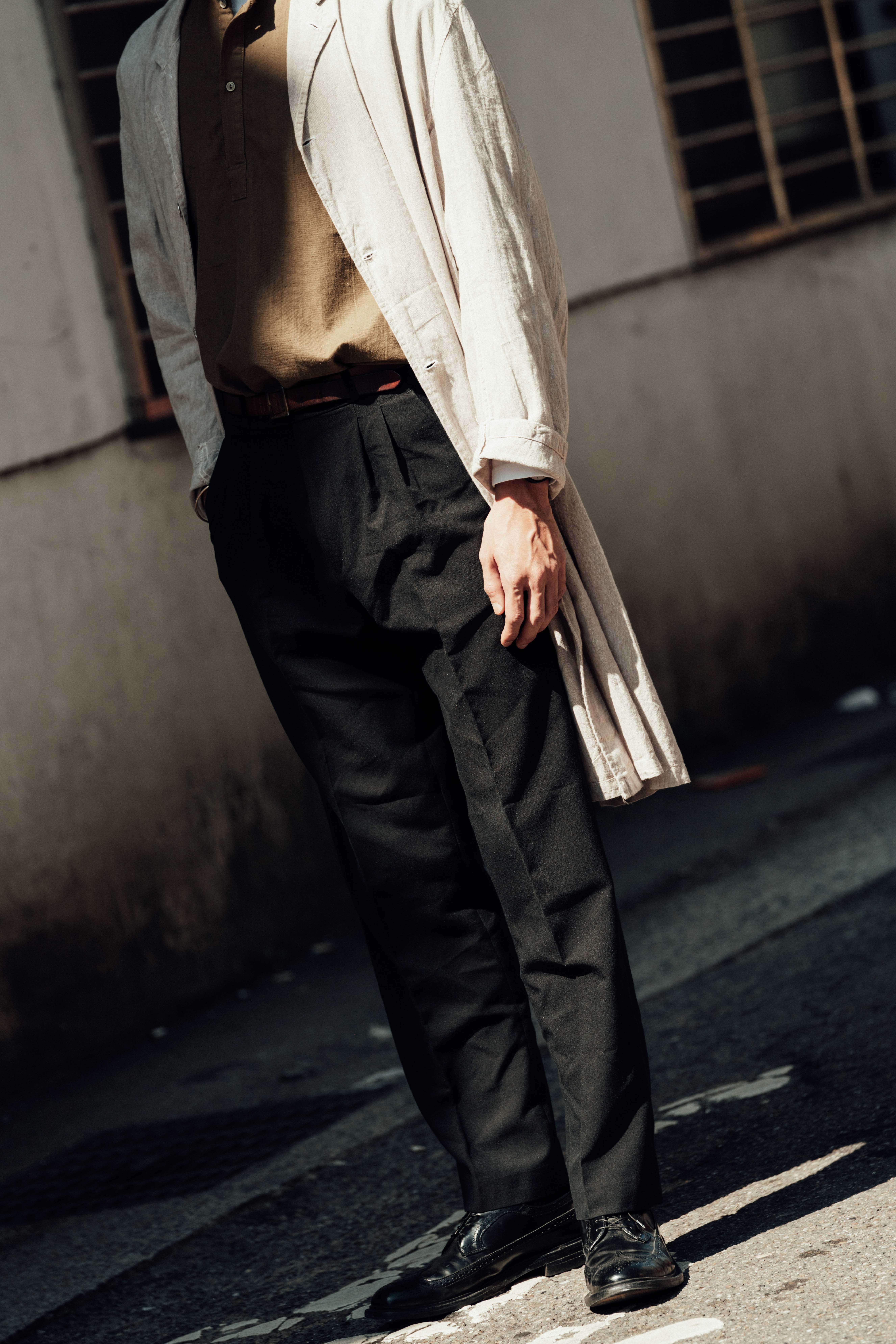 下身以法軍公發的西裝褲凸顯正式感,但寬褲管口穿起來確實無比的輕鬆自在,讓你同時駕馭輕鬆與嚴謹的風格。