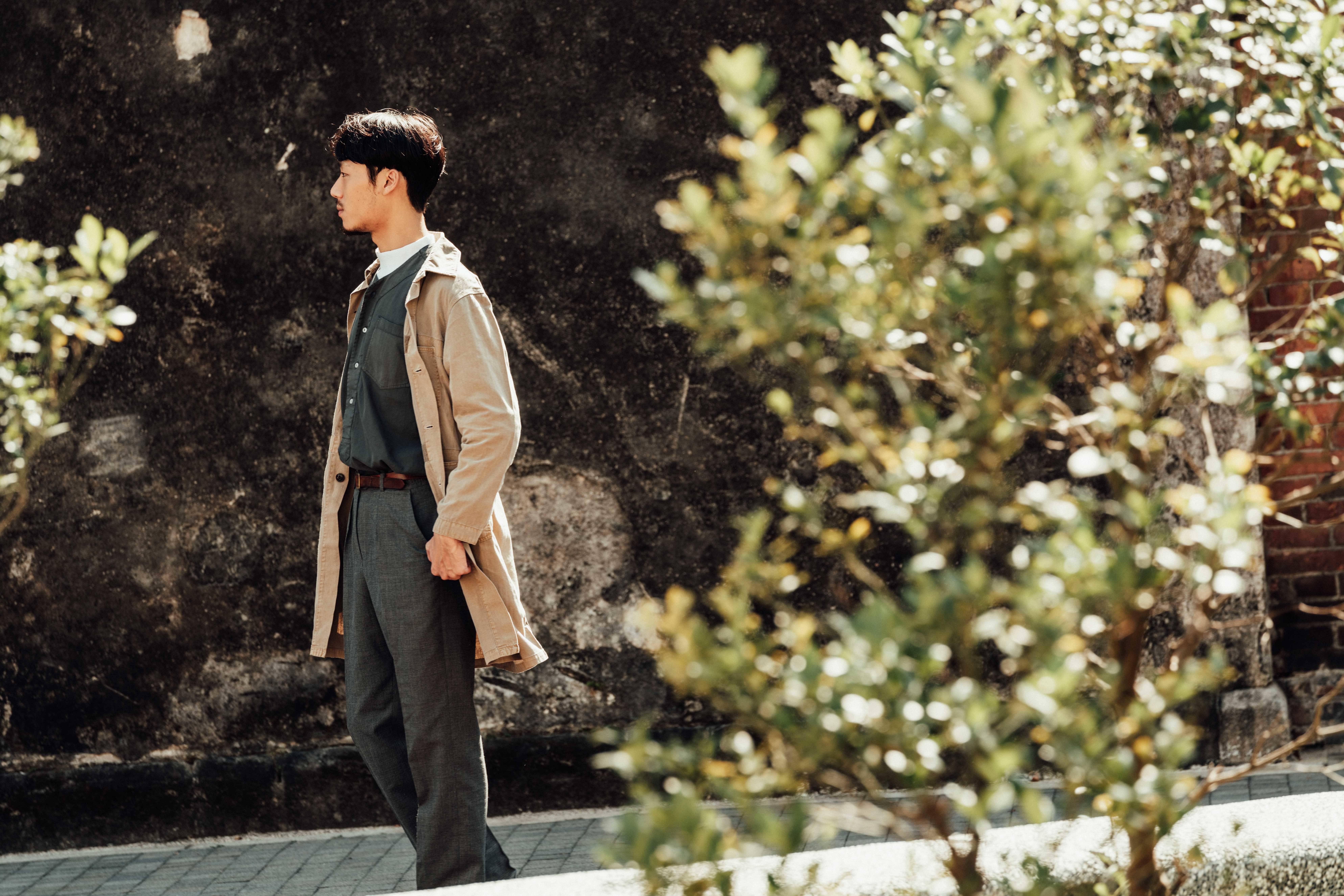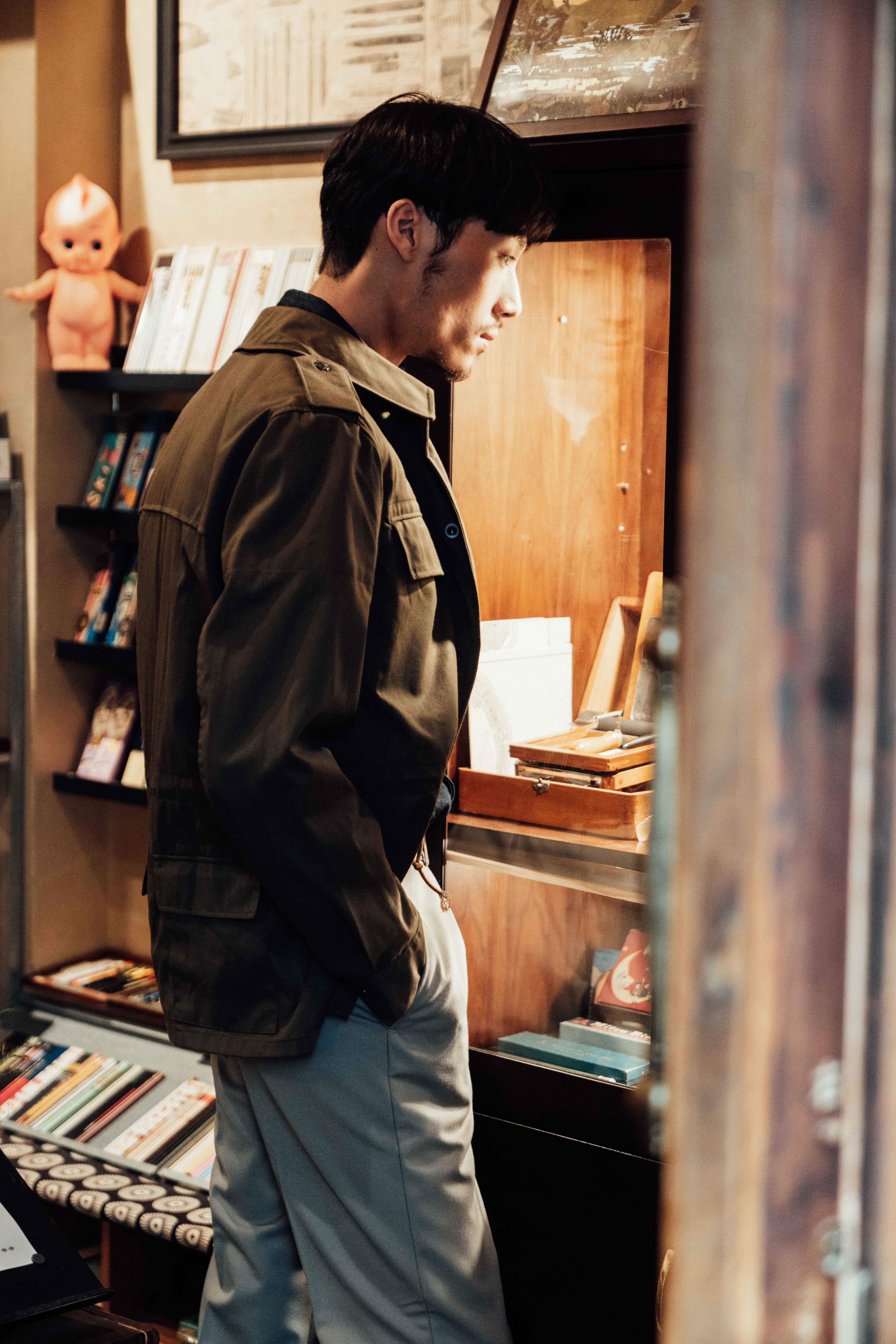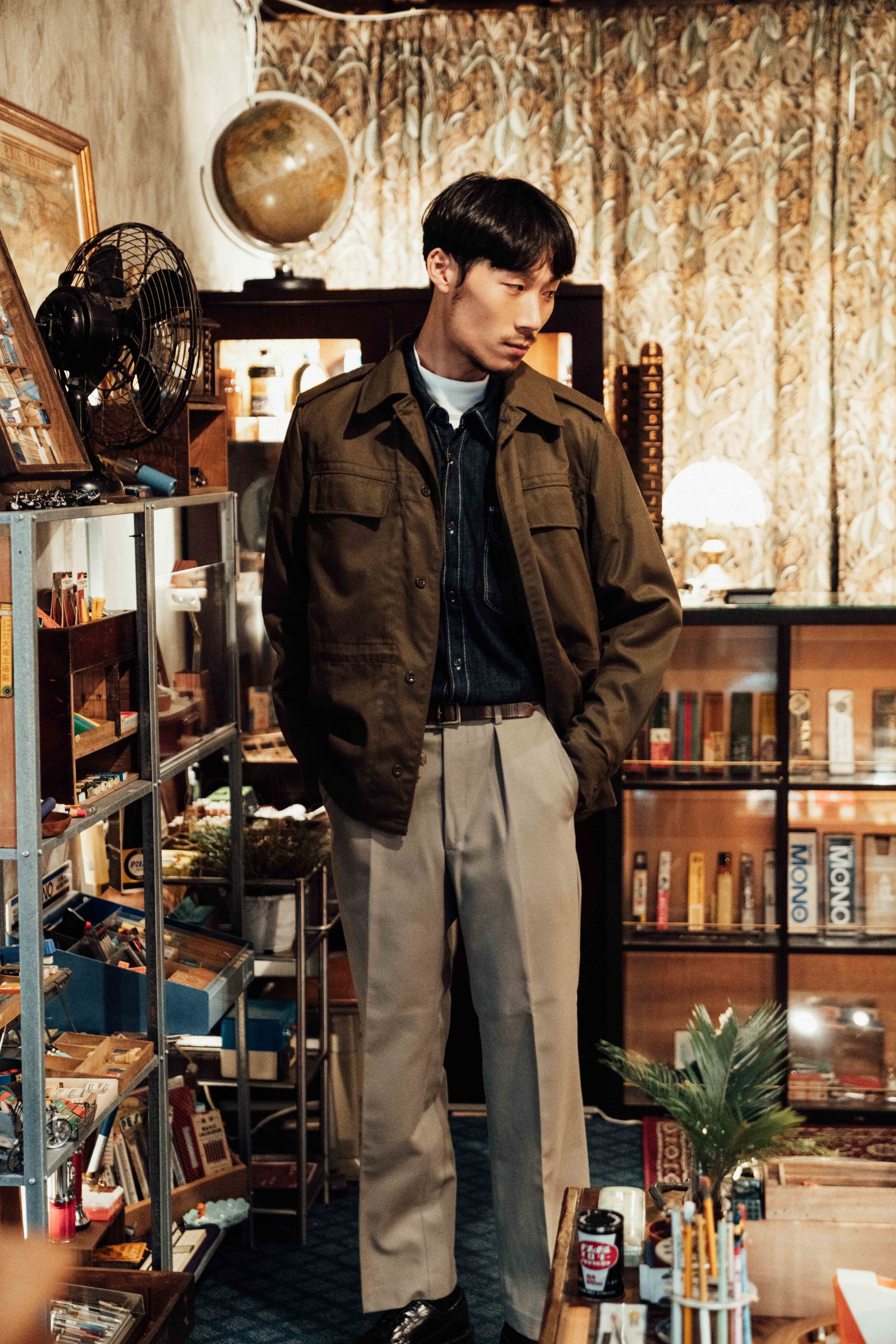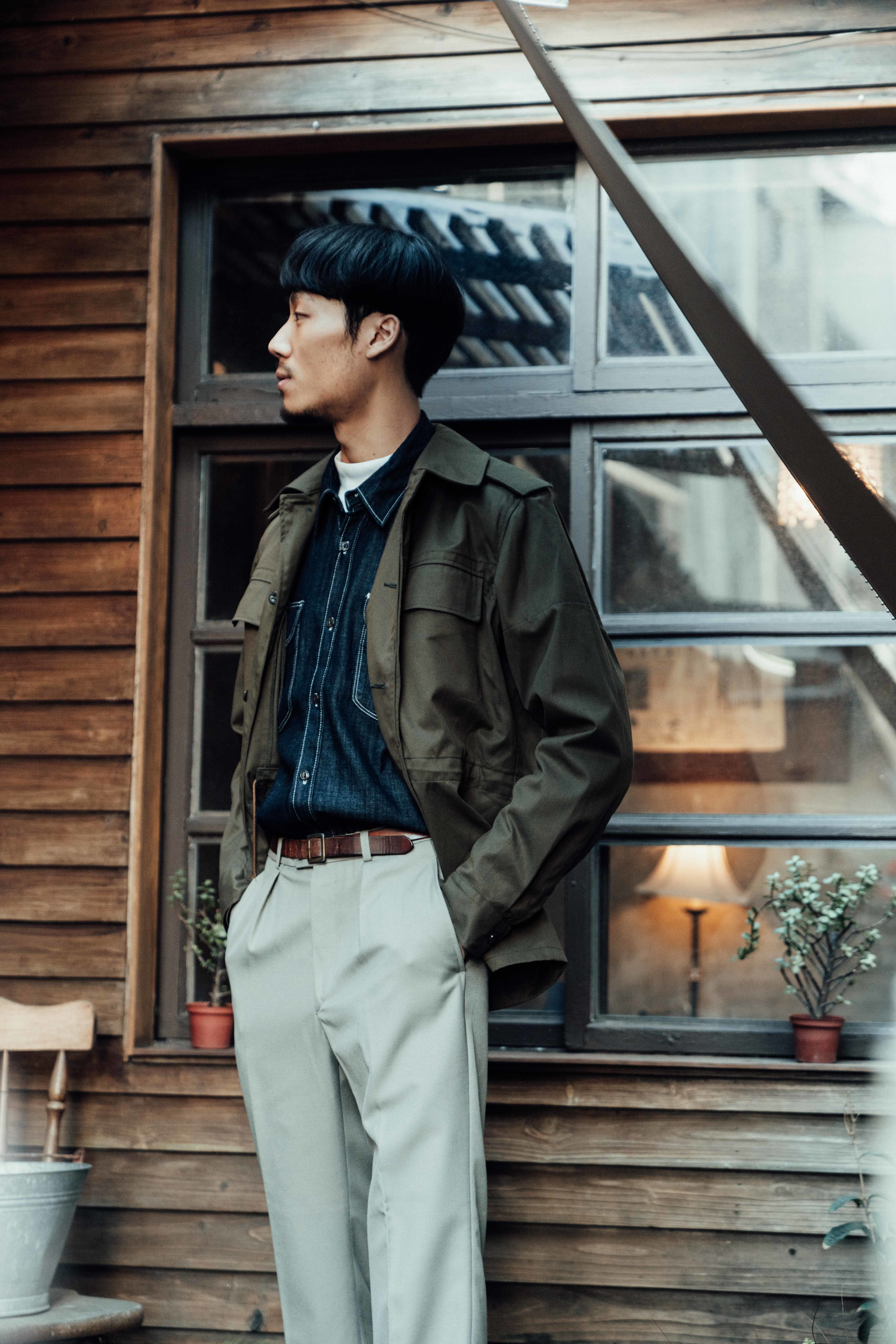 M71的丹麥野戰夾克最出眾的就是鐵灰的顏色,相較於軍裝常見的卡其與軍綠,暗色的大衣在陽光下閃著光芒。內搭GOOD ON Mock Tee,露出的小高領散發出成熟穩重感,下身搭配湛藍色英國海軍長褲,紮上皮帶,展現硬派爽朗的男子氣息,對方也許就這樣墜入情迷。