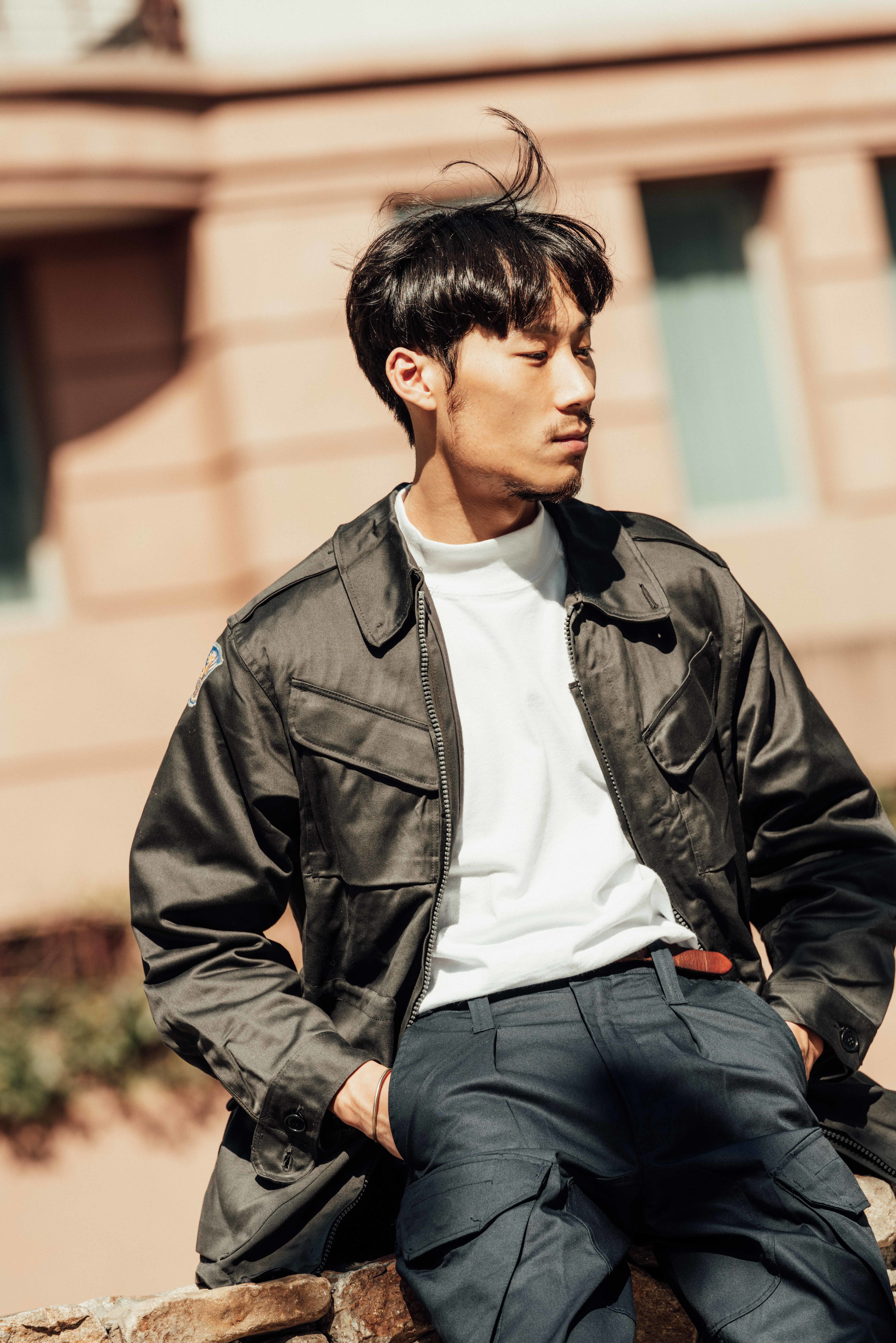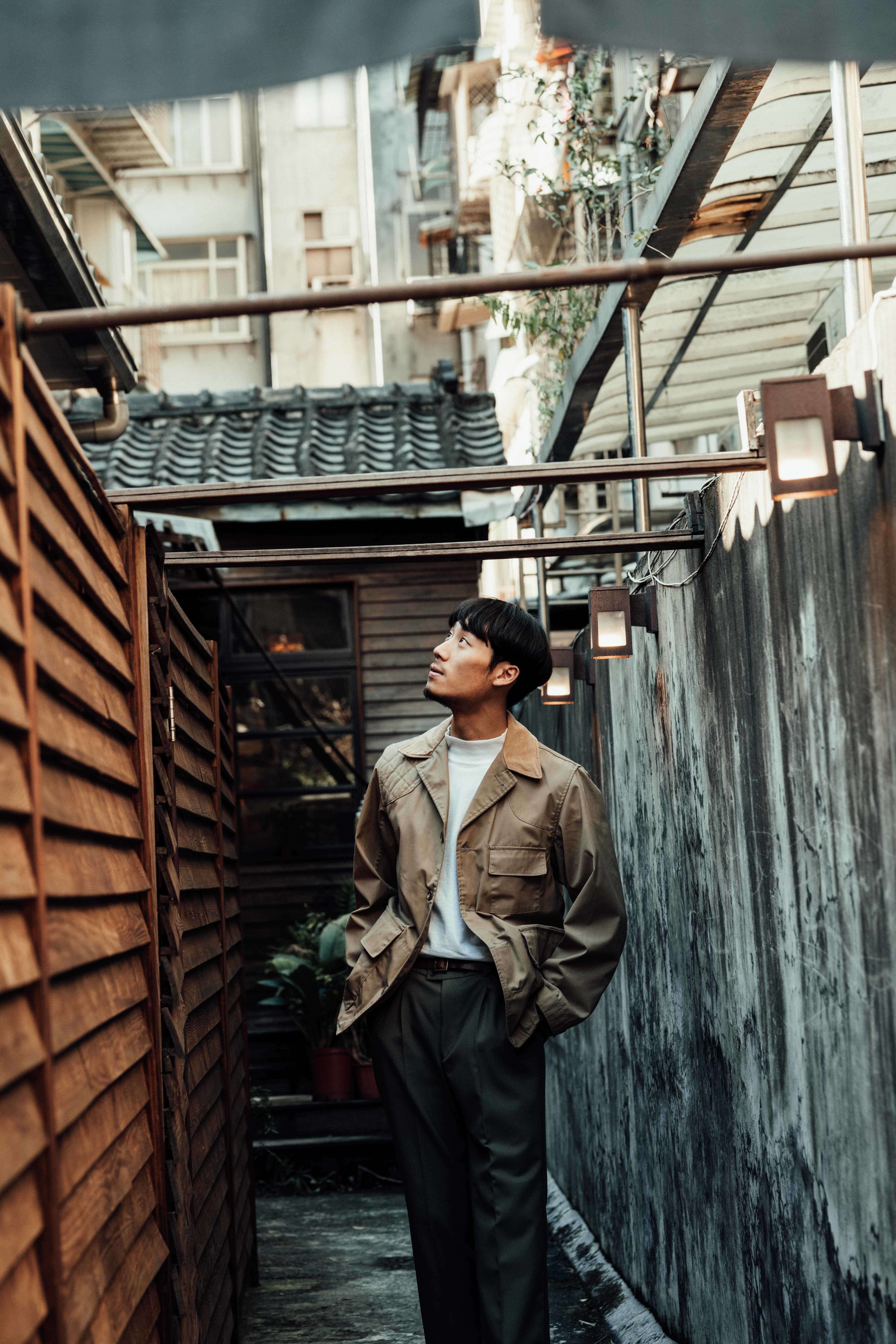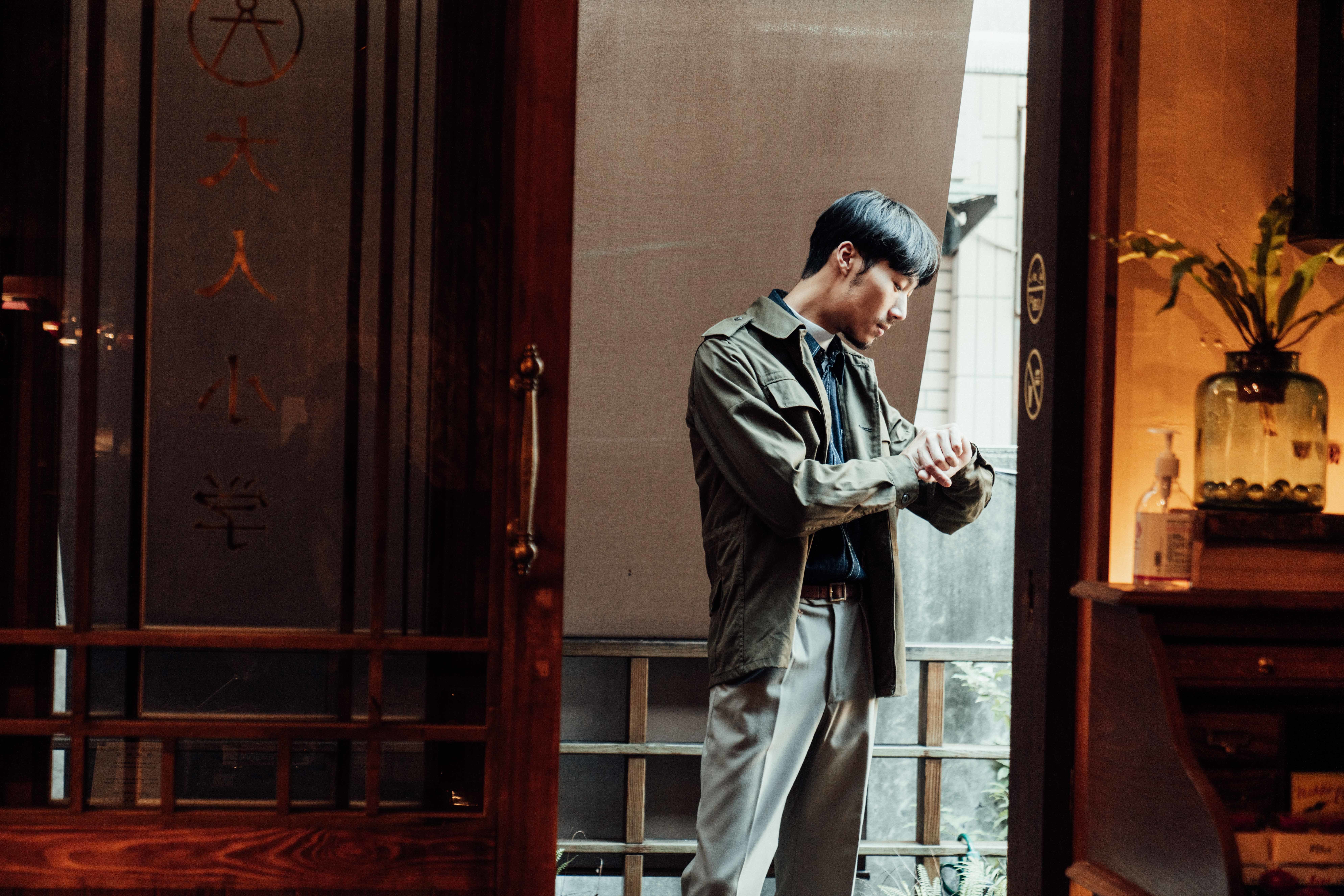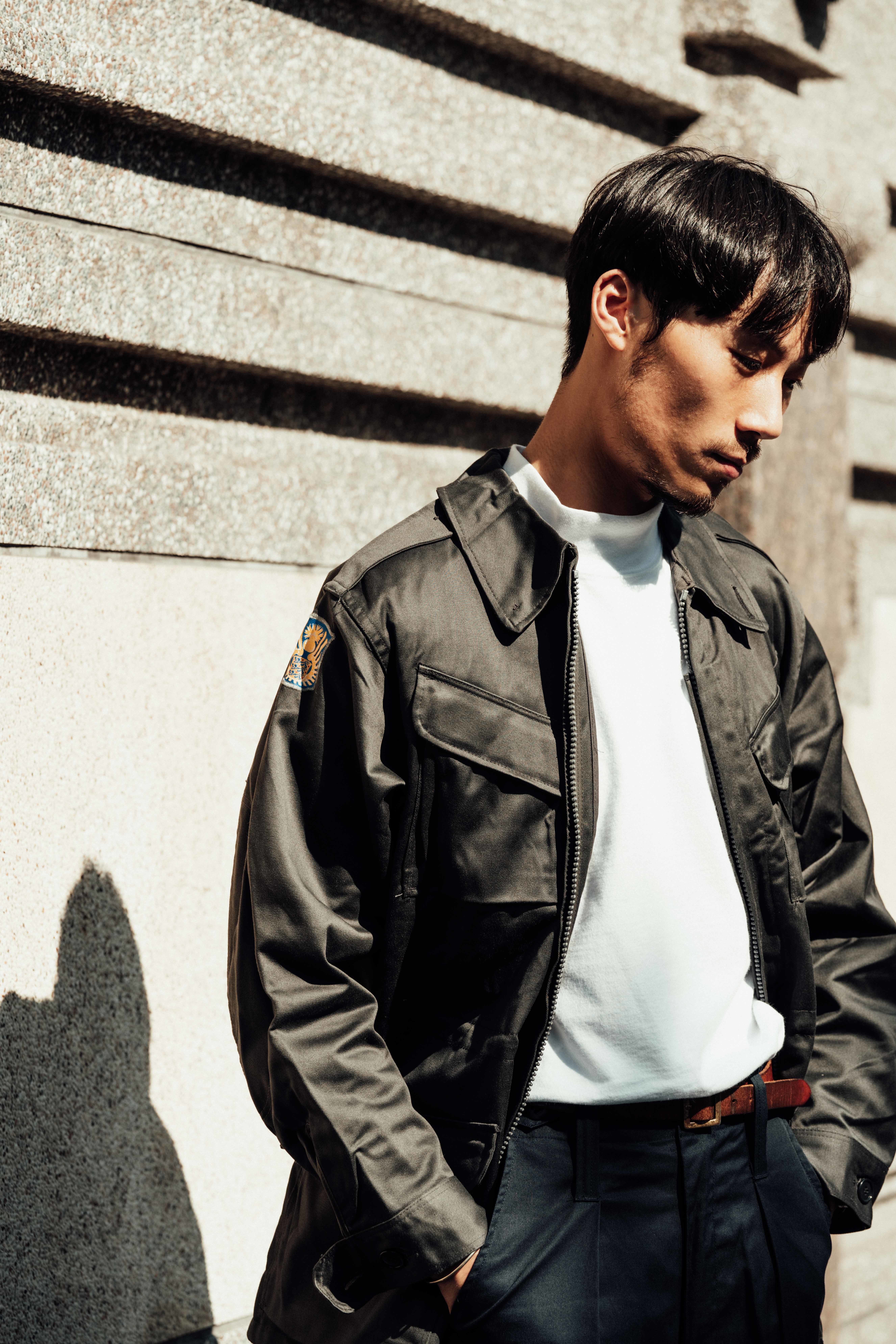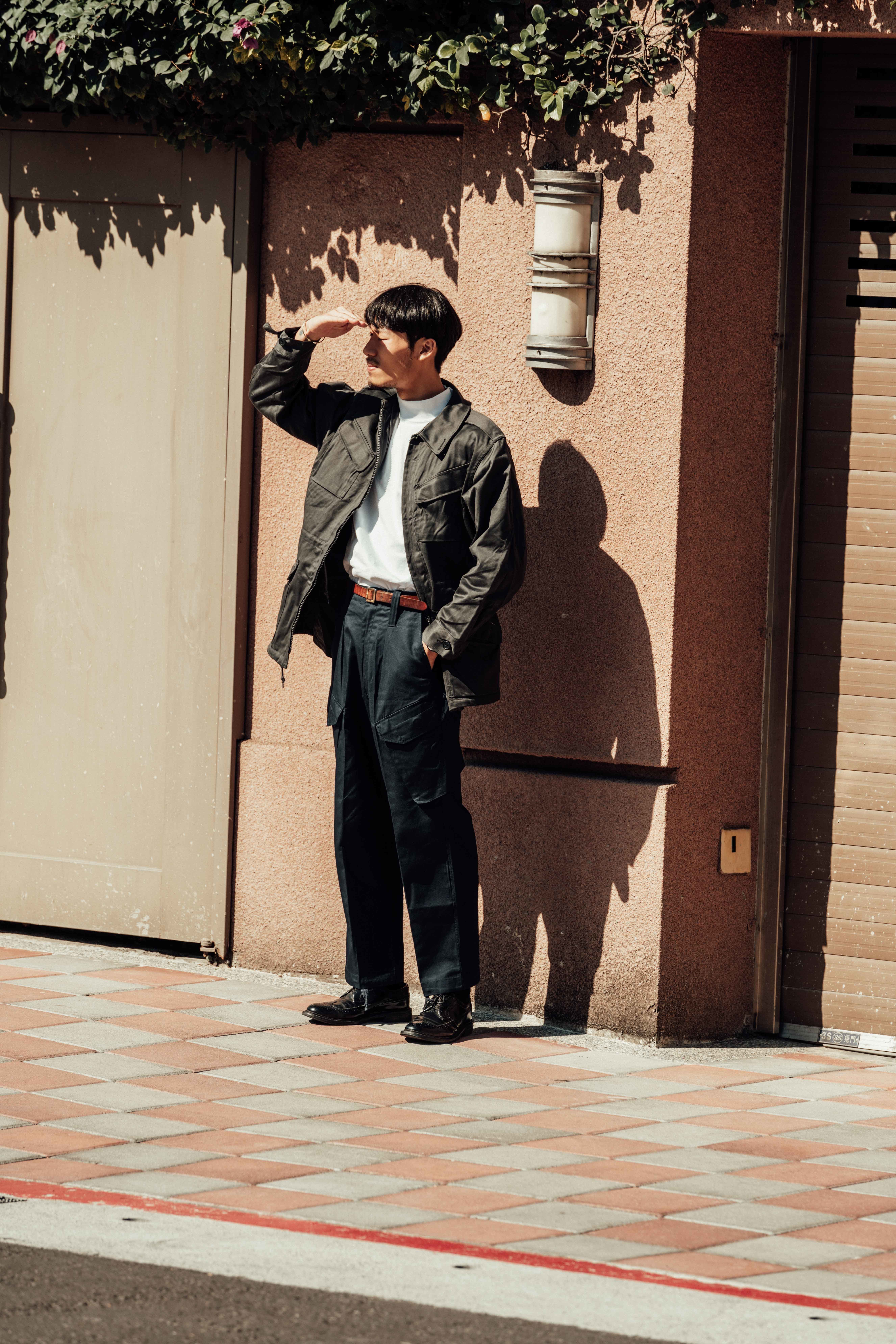 M71的丹麥野戰夾克最出眾的就是鐵灰的顏色,相較於軍裝常見的卡其與軍綠,暗色的大衣在陽光下閃著光芒。內搭GOOD ON Mock Tee,露出的小高領散發出成熟穩重感,下身搭配湛藍色英國海軍長褲,紮上皮帶,展現硬派爽朗的男子氣息,對方也許就這樣墜入情迷。