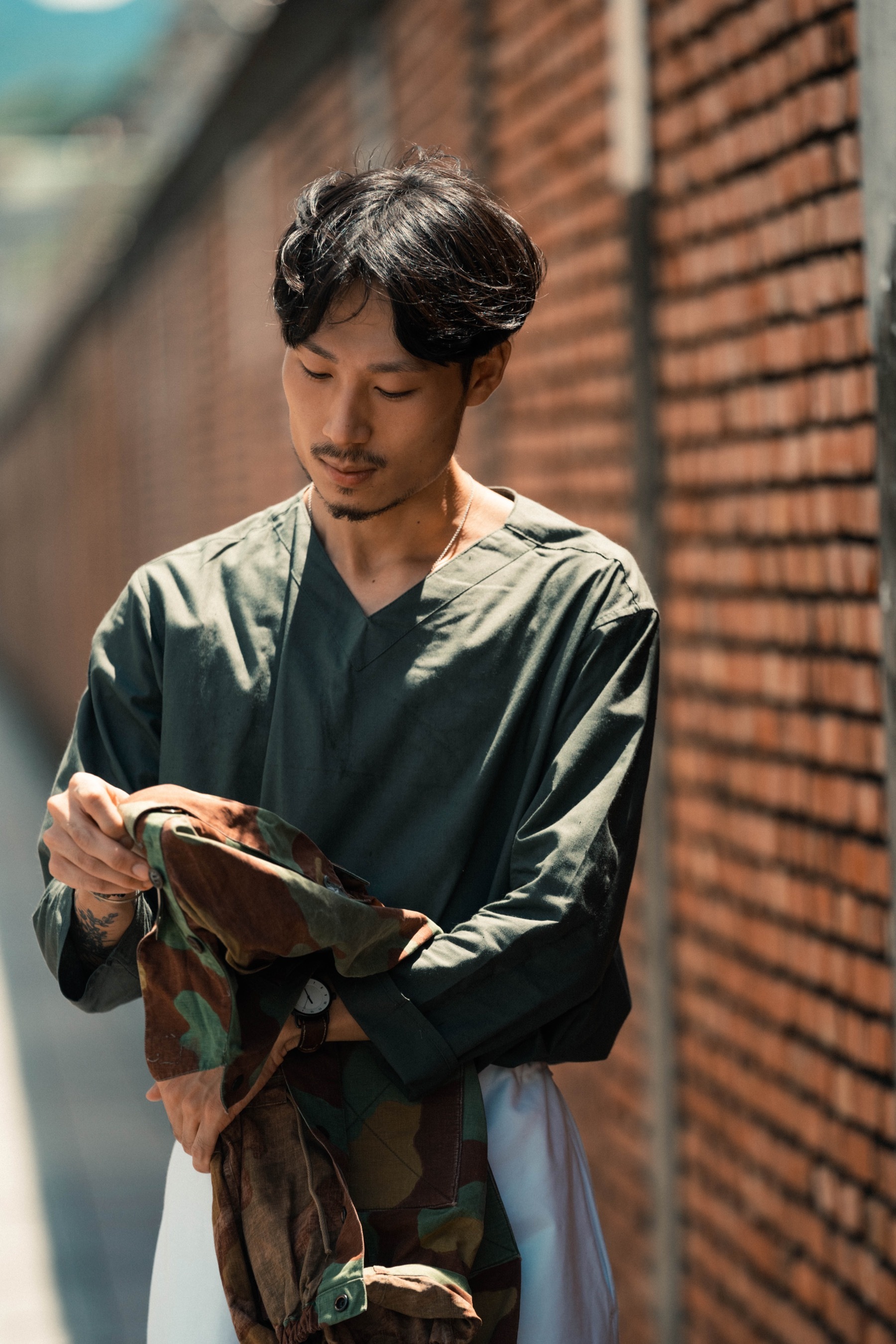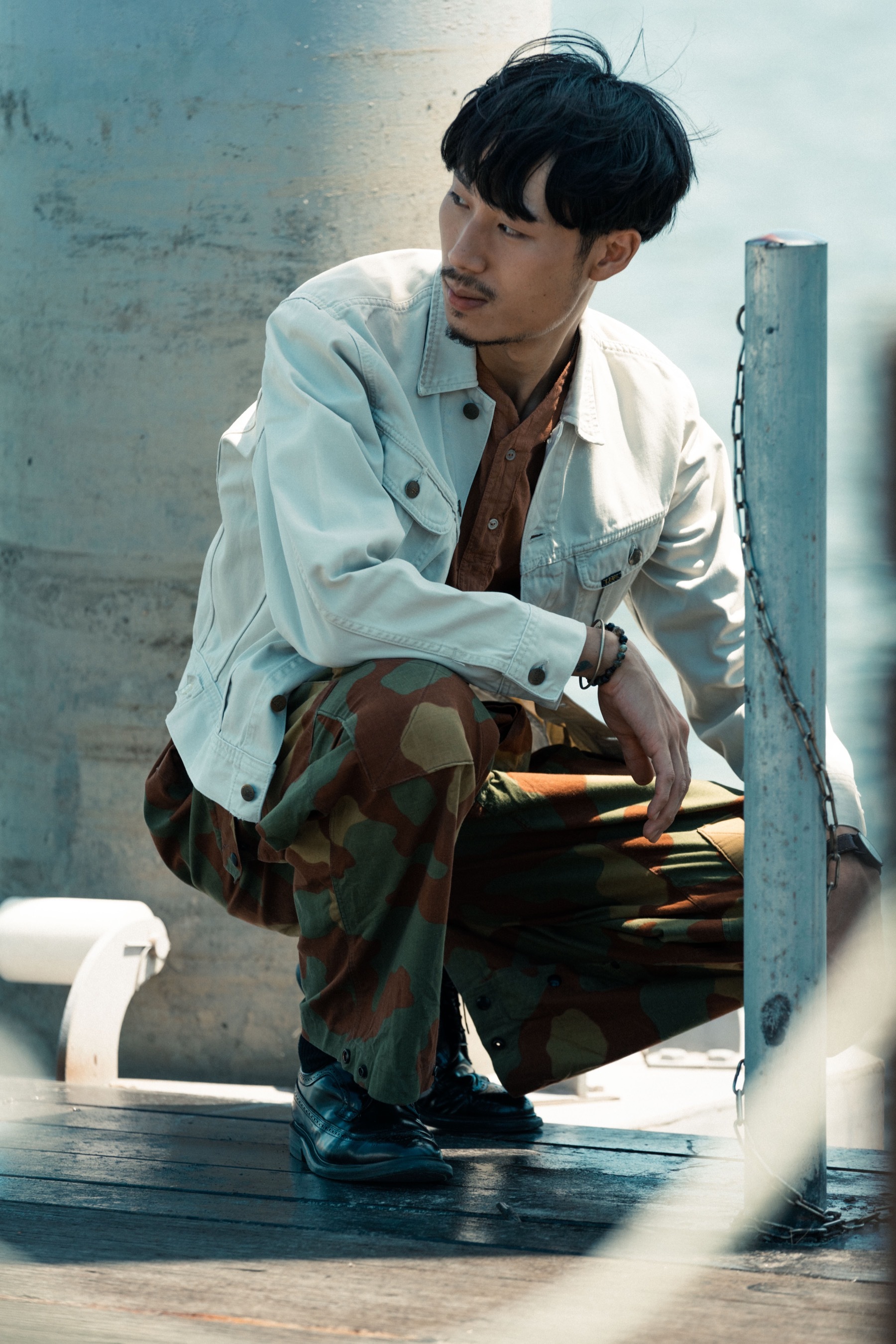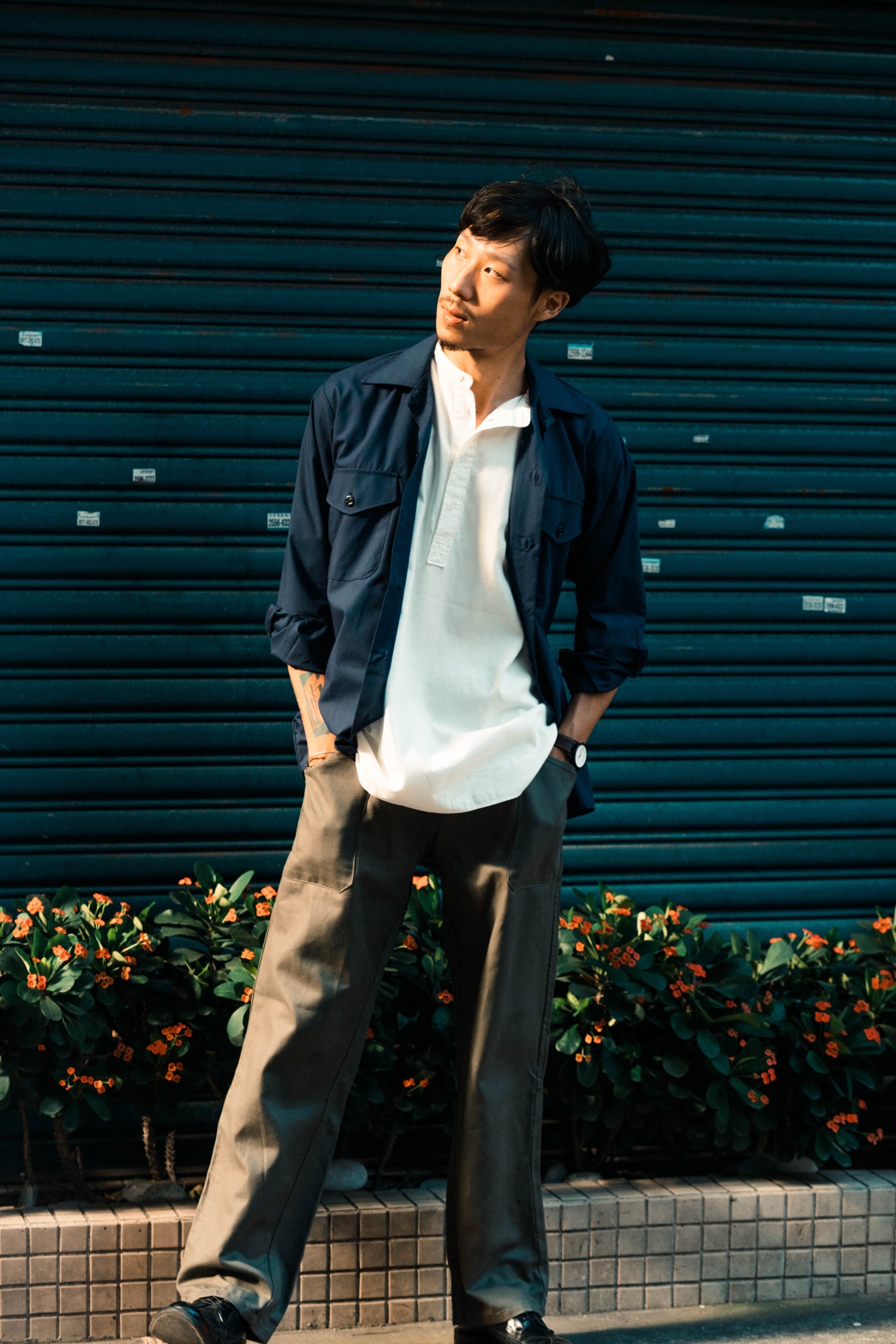 下身搭配工作室改製的法軍長褲,舒適的面料、寬鬆的版型,呈現法軍古著細膩寫意的隨性。