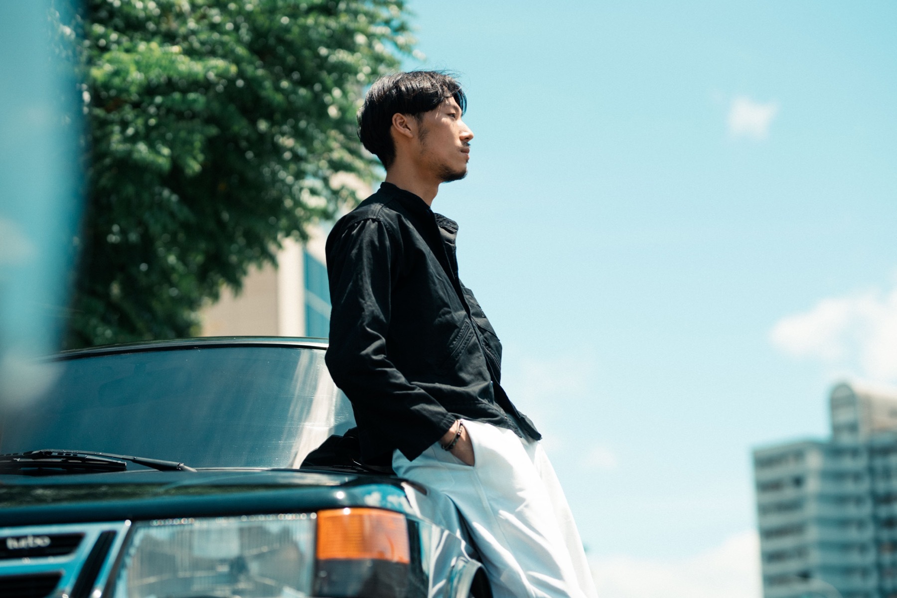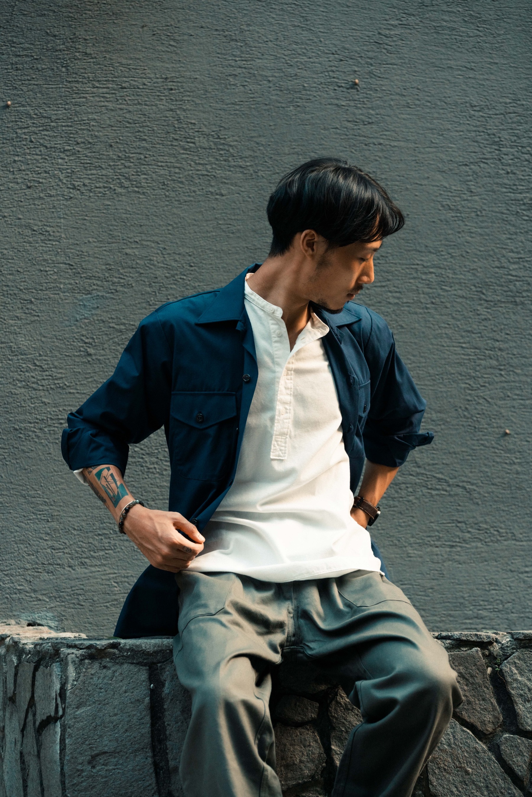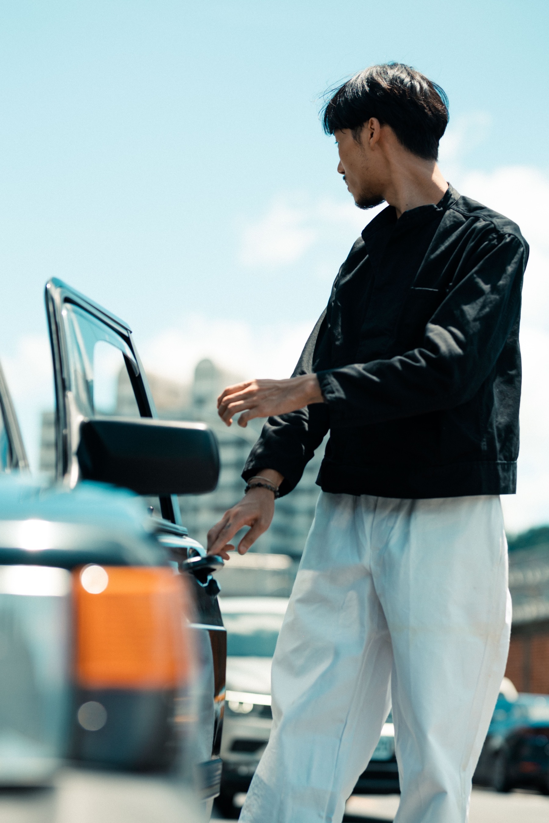 下身搭配工作室改製的法軍長褲,舒適的面料、寬鬆的版型,呈現法軍古著細膩寫意的隨性。