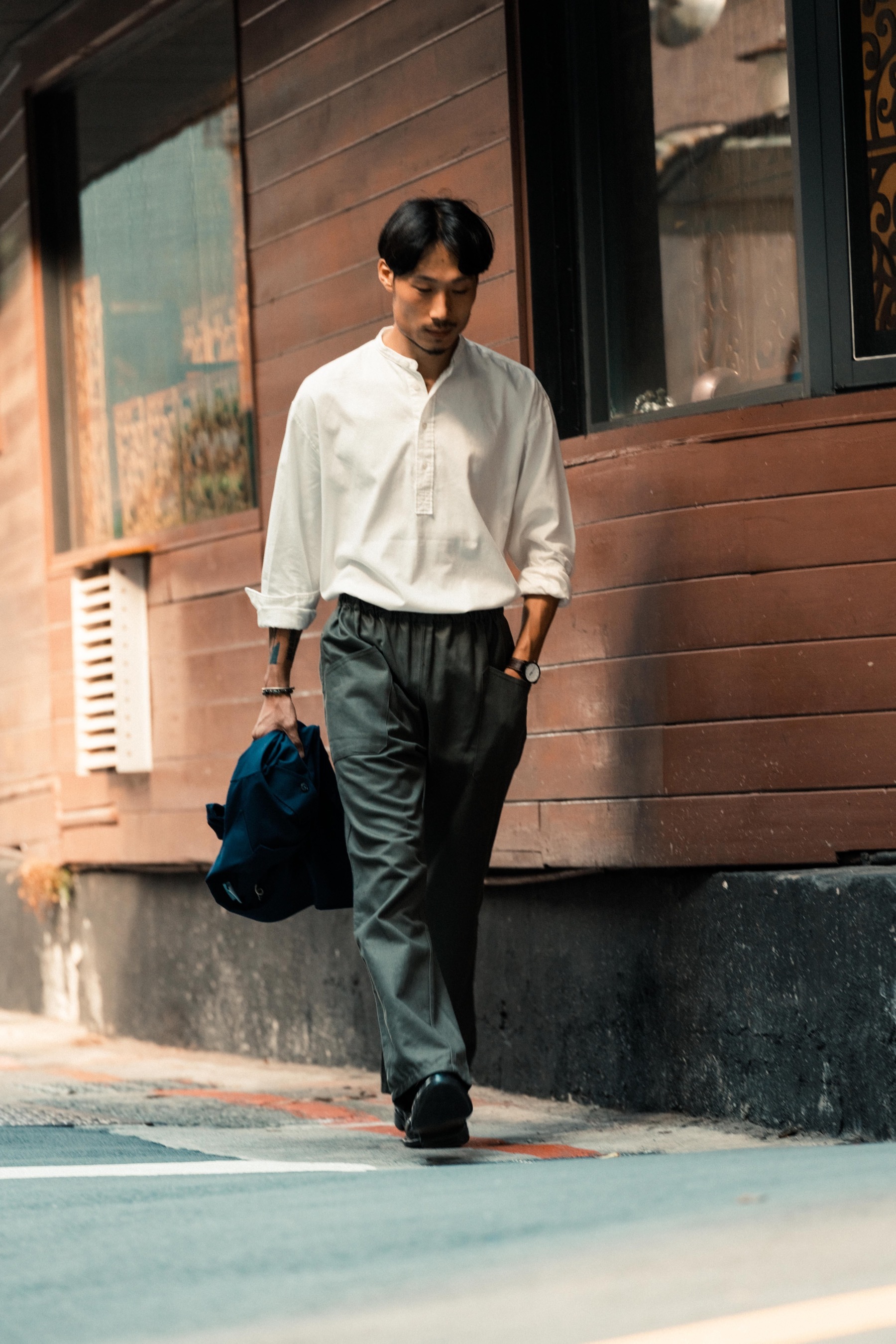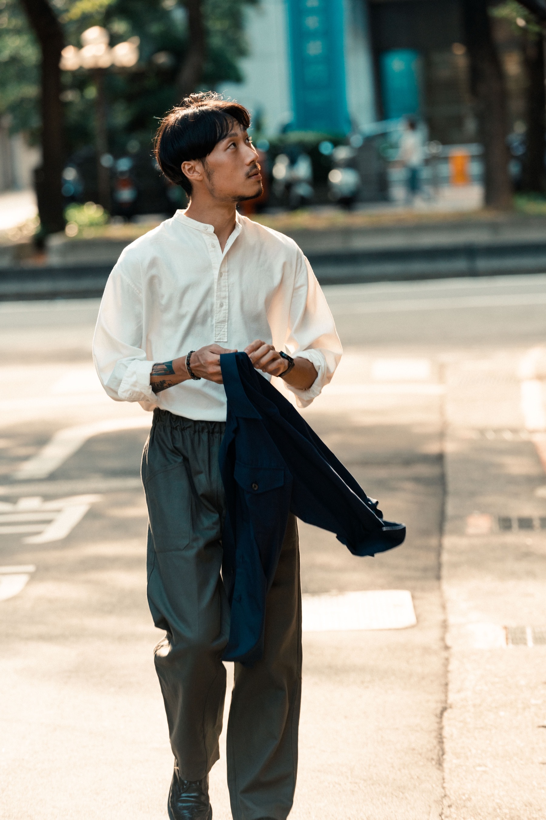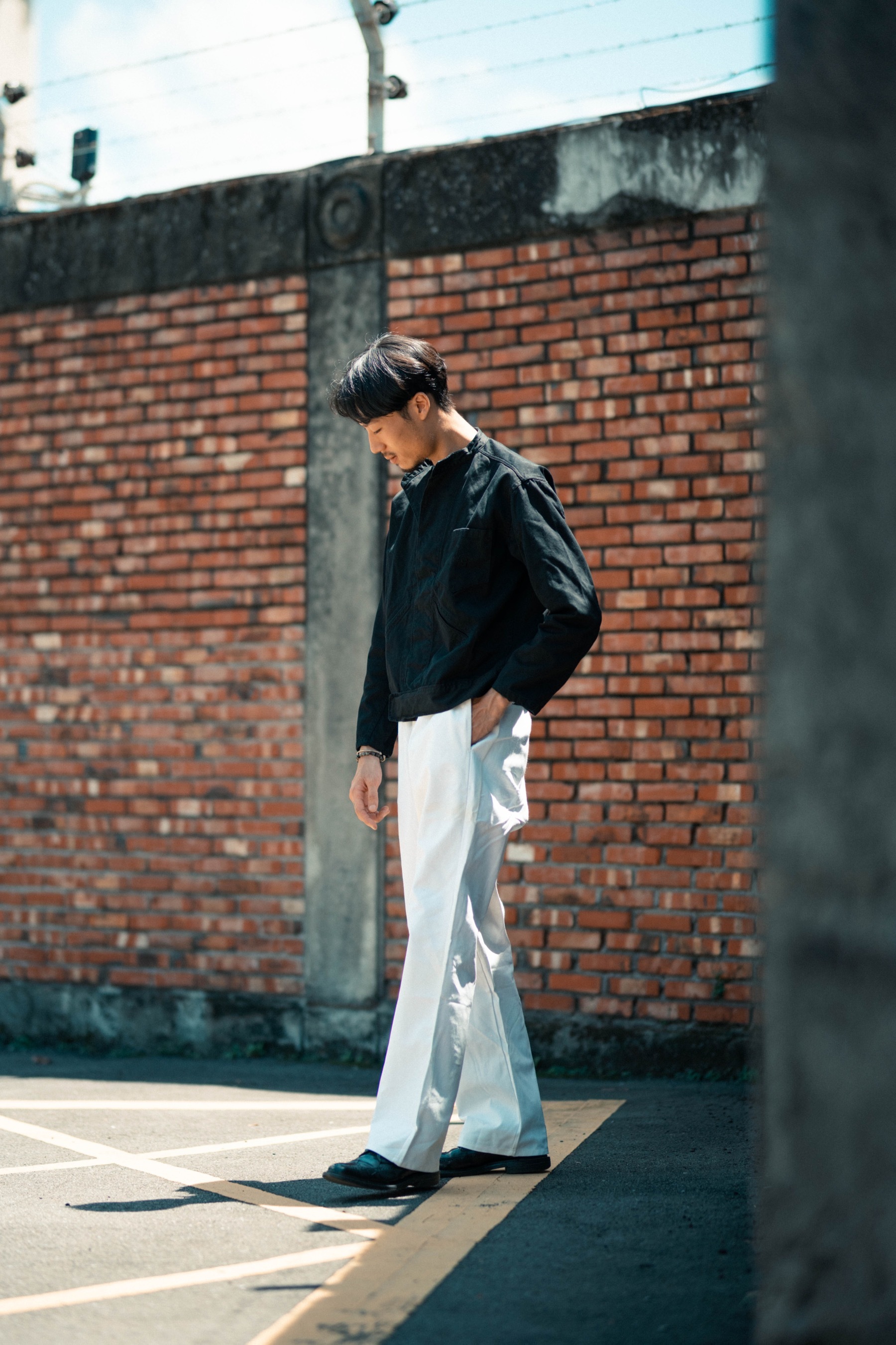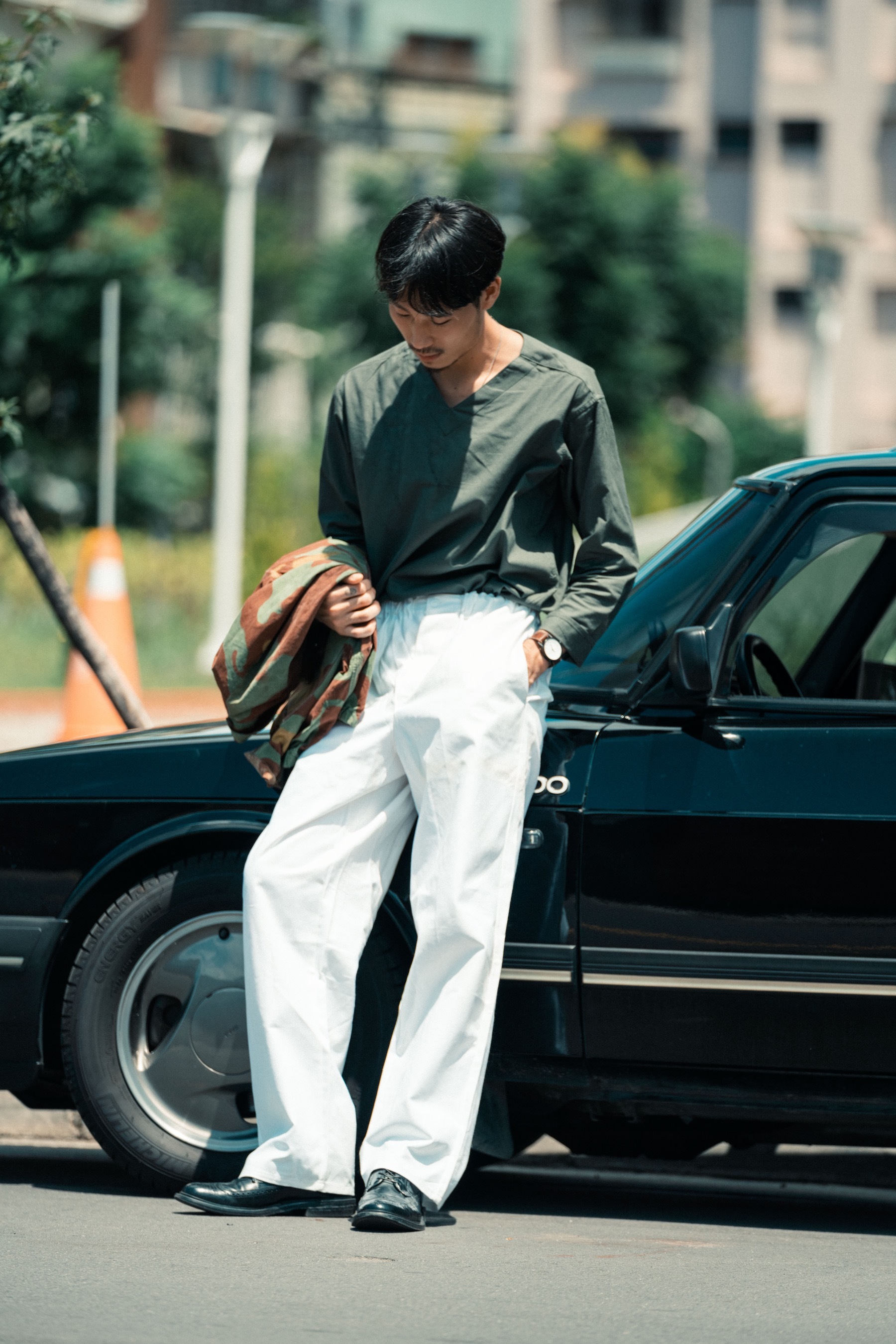 下身搭配捷克軍醫的醫用長褲,除了乾淨俐落的白給人清爽的感覺,寬鬆的版型和柔軟的棉料在夏日也非常透氣,讓你在悶熱的季節交際之處保持明快的步伐,在視覺上給人帥氣的一擊。