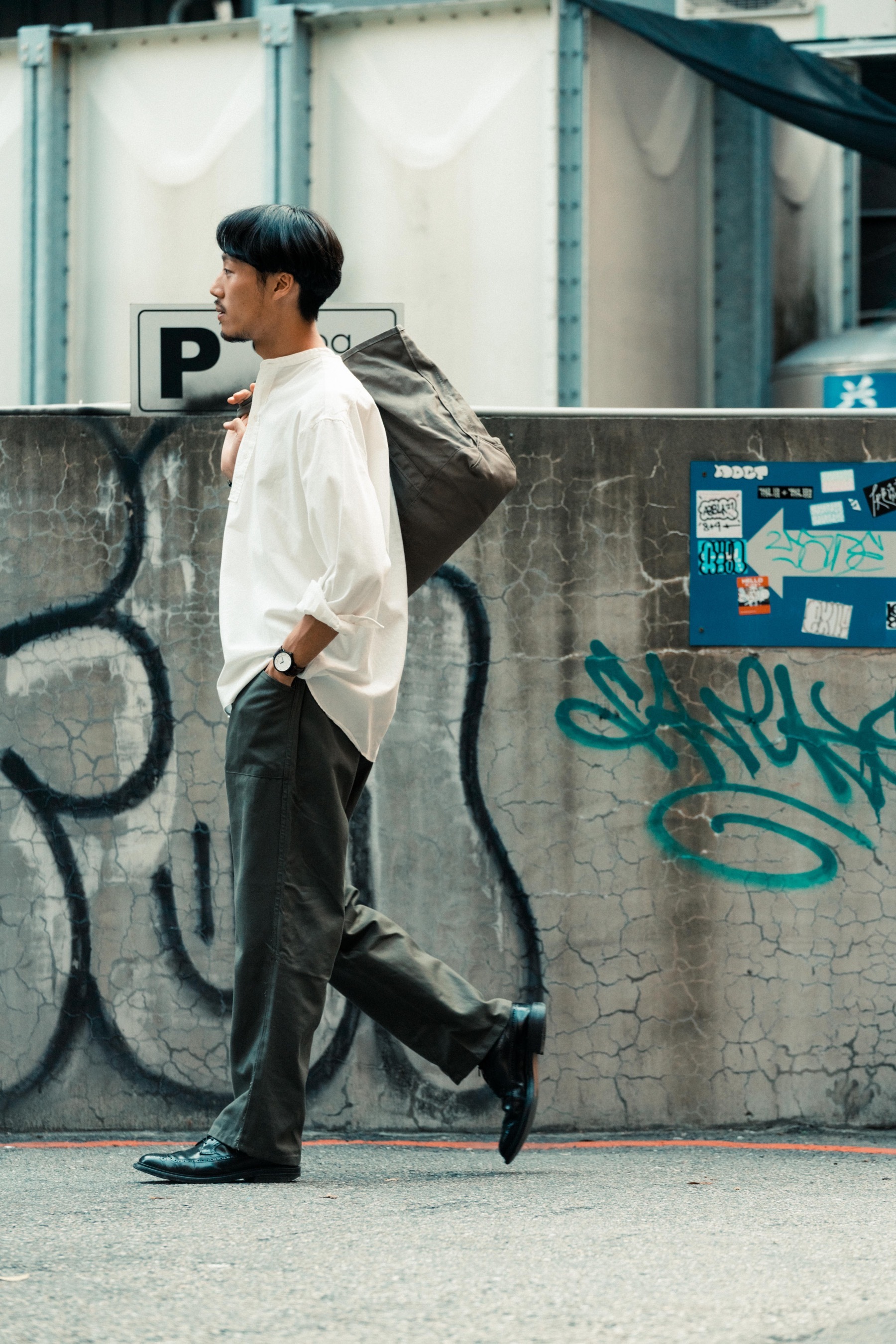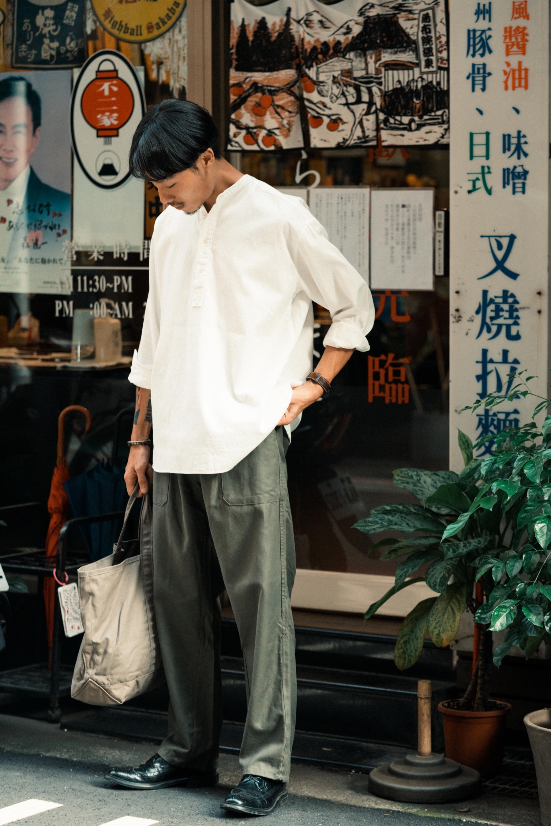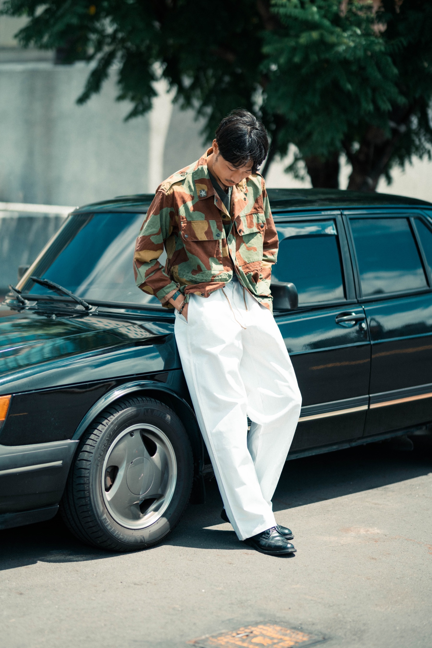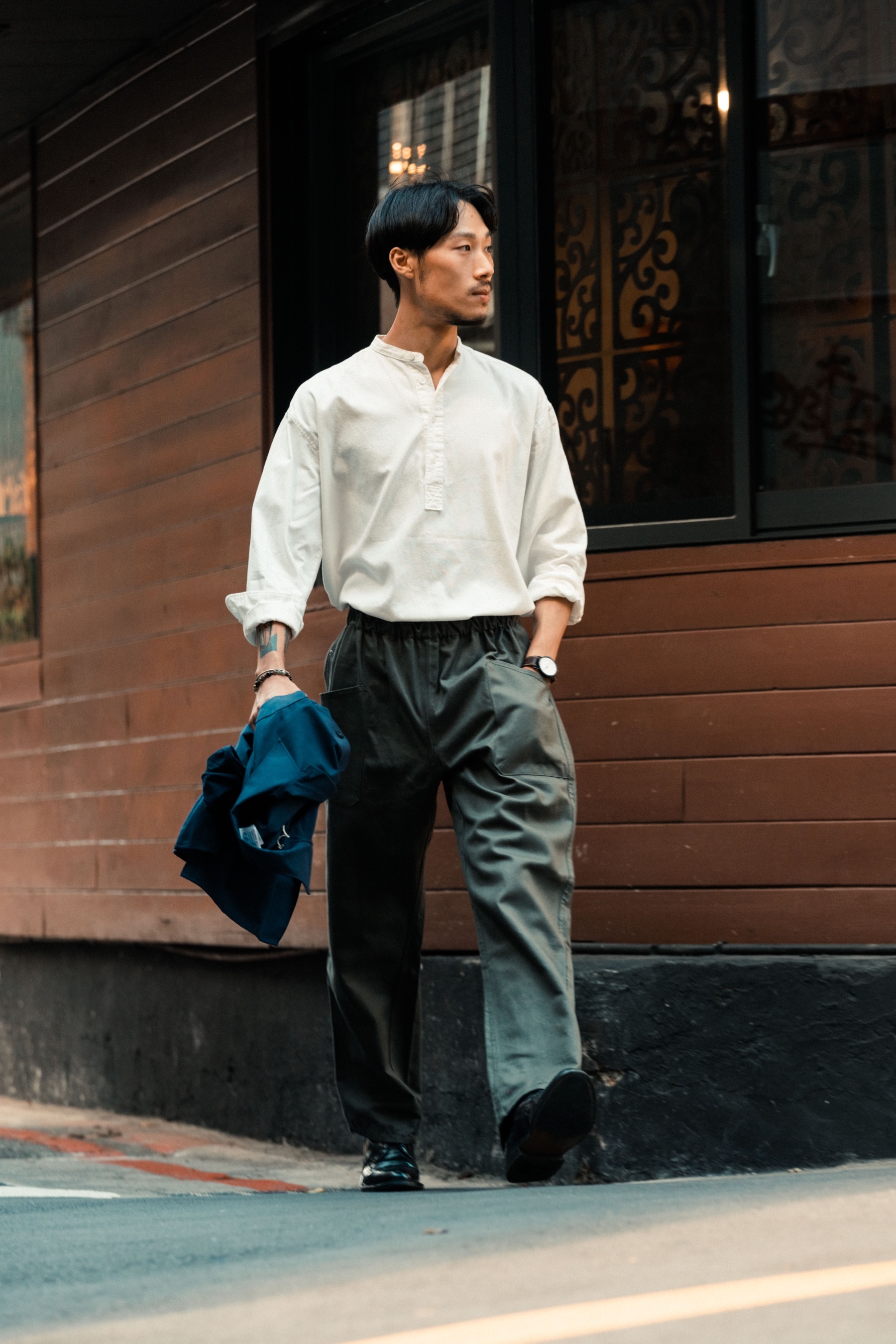 下身搭配捷克軍醫的醫用長褲,除了乾淨俐落的白給人清爽的感覺,寬鬆的版型和柔軟的棉料在夏日也非常透氣,讓你在悶熱的季節交際之處保持明快的步伐,在視覺上給人帥氣的一擊。