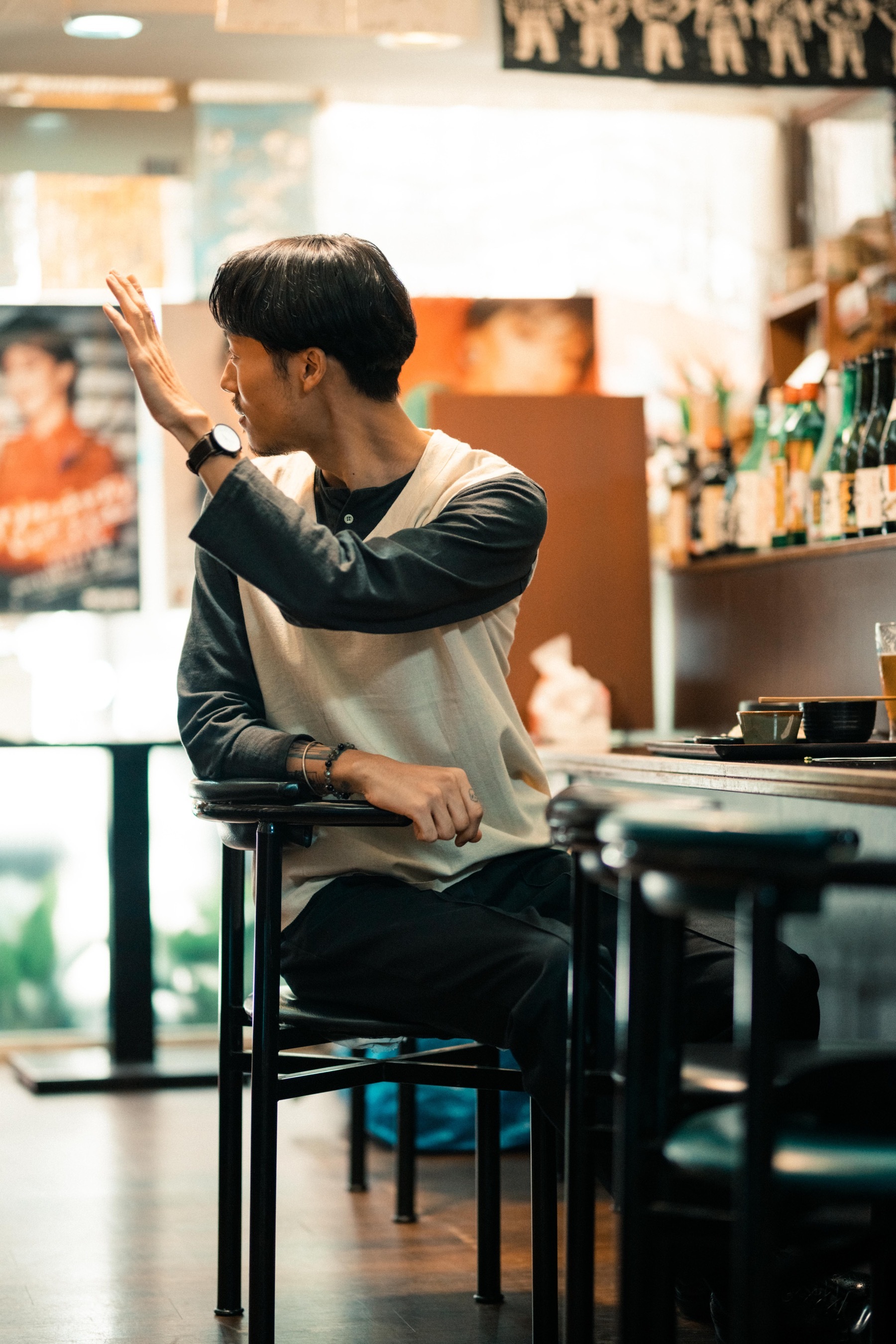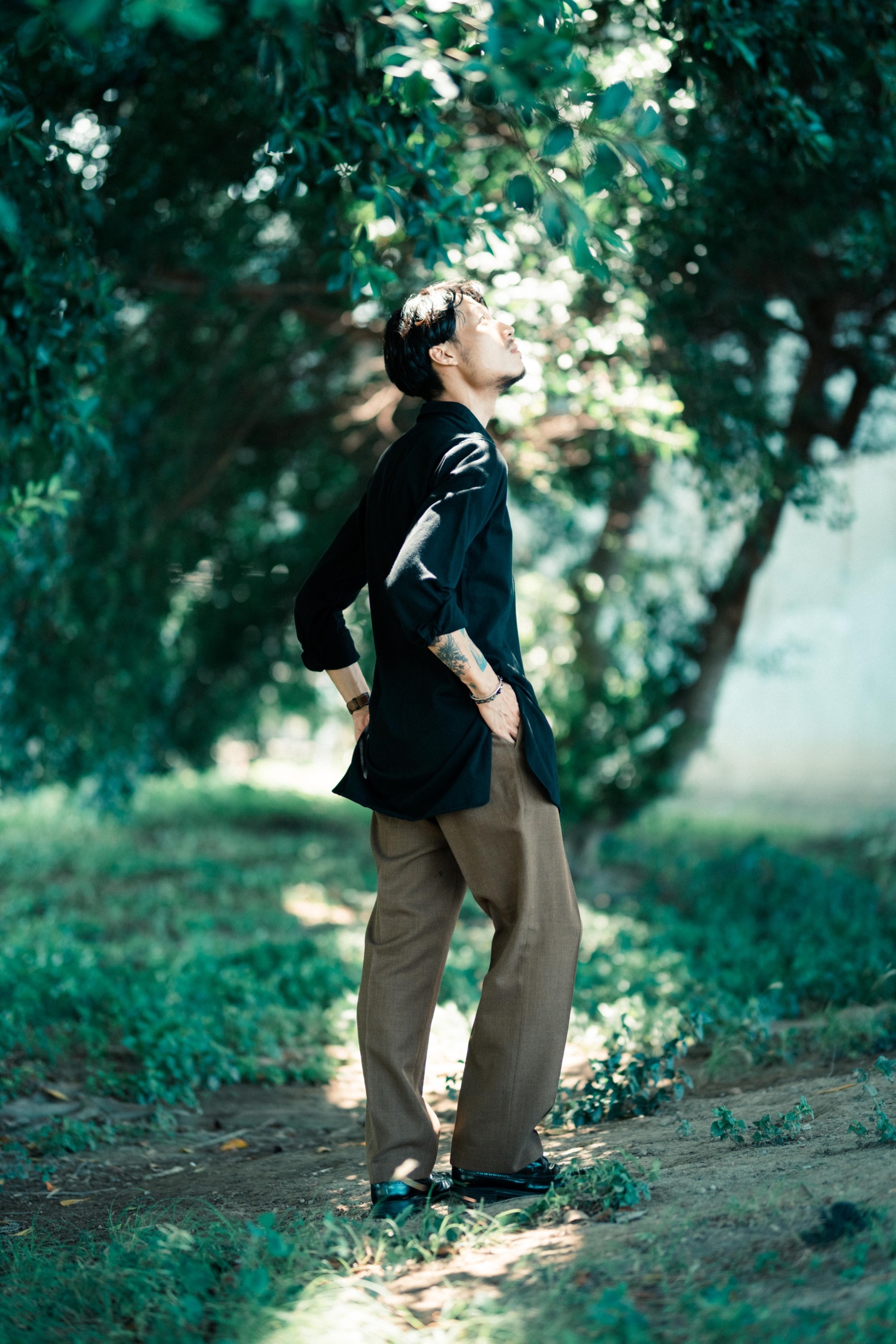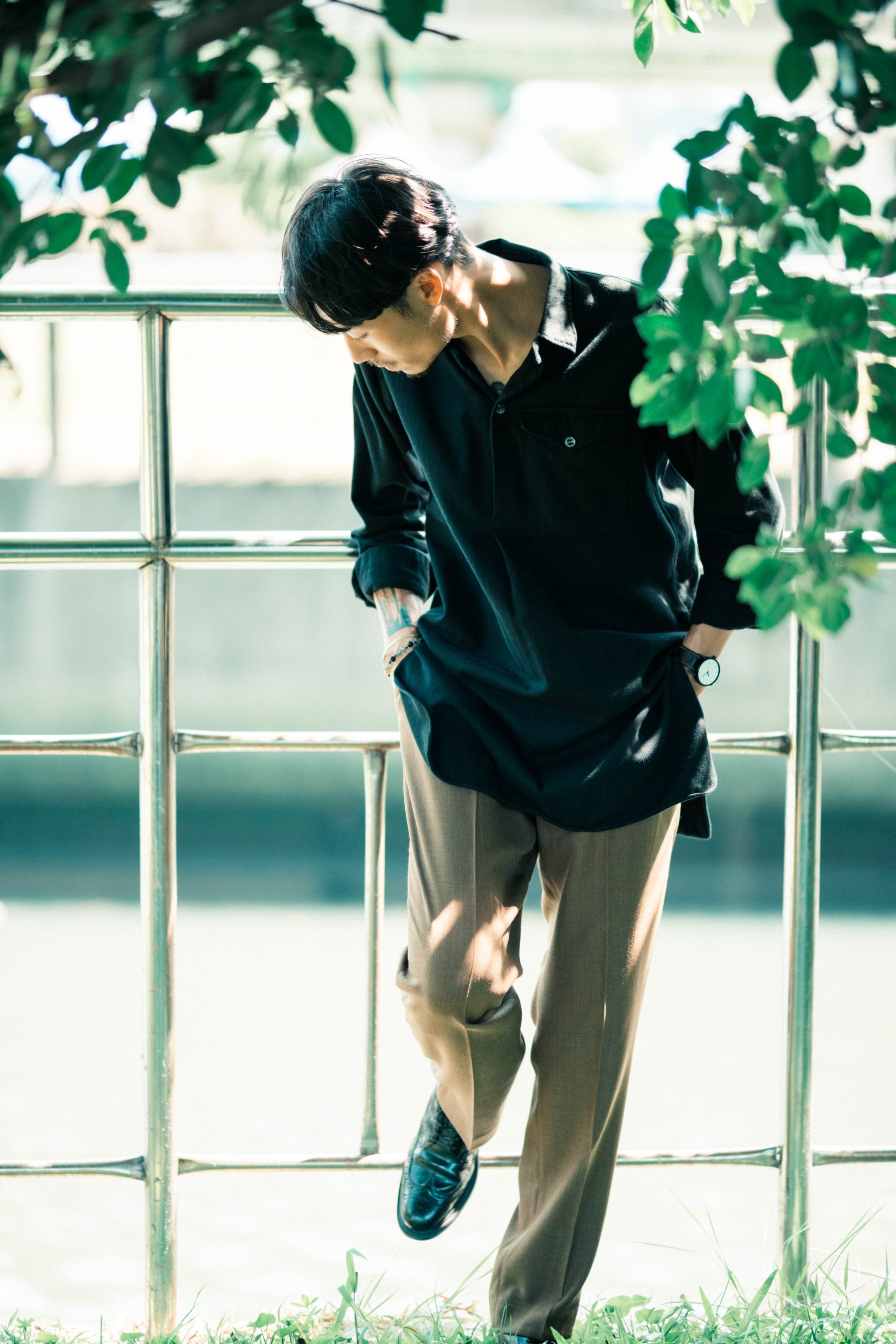 寬鬆的瑞典Pullover有著早期的復古氛圍,Rolling On將鐵灰色染製後呈黑色色澤,配上長版的垂墜感,透露著一點憂鬱小生的冷冽感。下身搭配捷克公發的軍褲,羊毛混紡的材質較厚實,即便版型寬鬆仍能塑造出下身的線條感。沉穩的深棕色散發出令人安心的氛圍,展現成熟穩重的男子魅力。