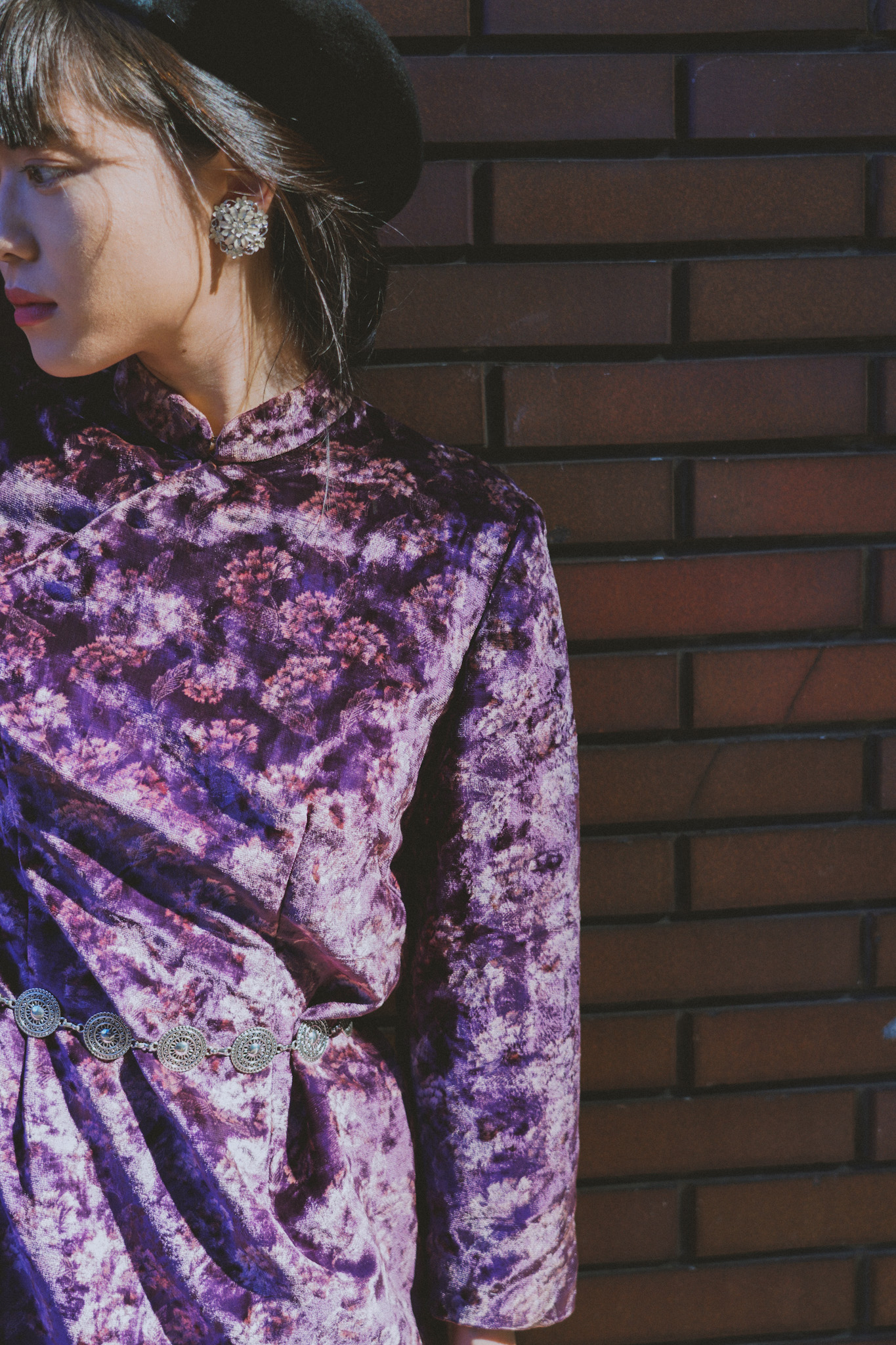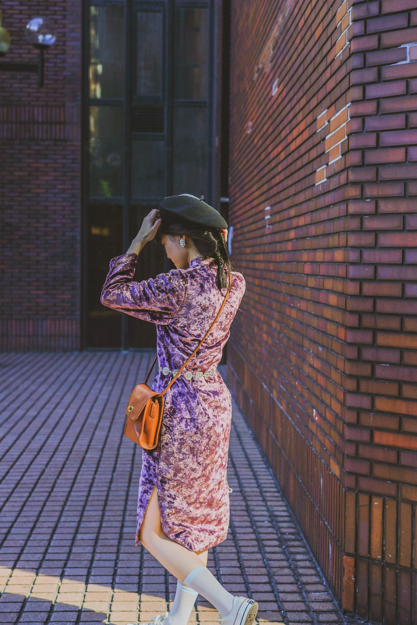 以這件紫色天鵝絨旗袍為例,雖說單穿已足夠襯托優雅氣息,不妨試試加入金屬感飾件,如腰帶、細緻點綴的飾品等,加強布料紋理之餘,還能讓視覺更加精彩。配上貝蕾帽與帆布鞋,自然流露一股女孩獨有的個性氣息。