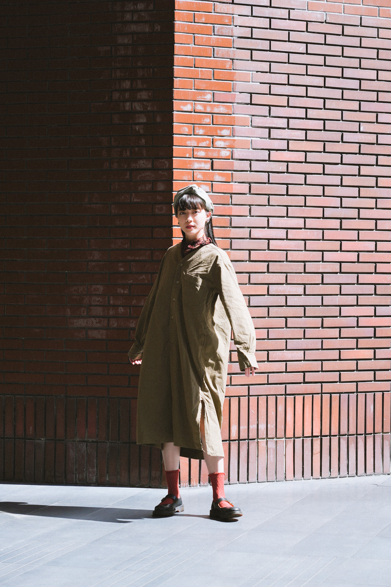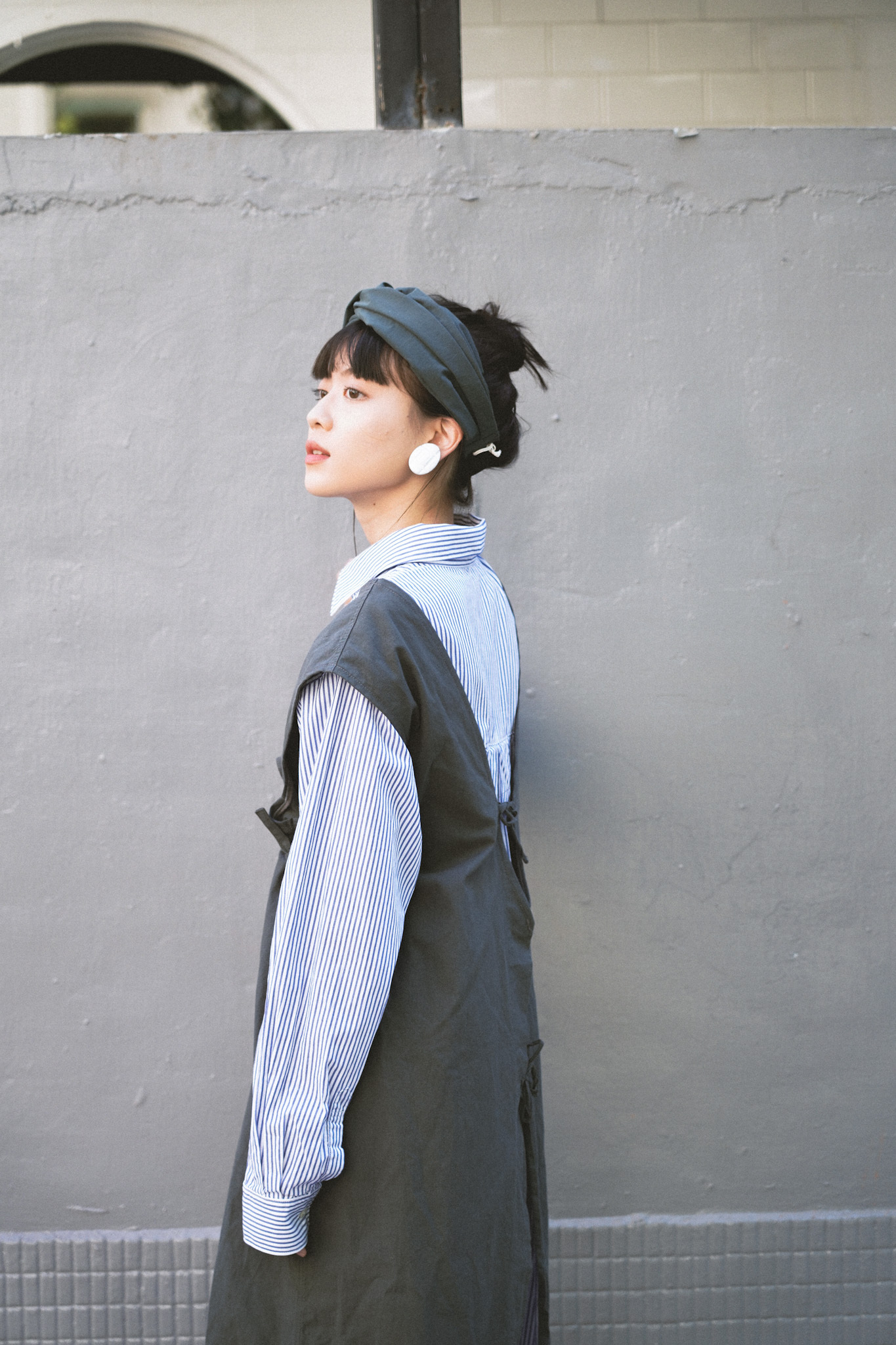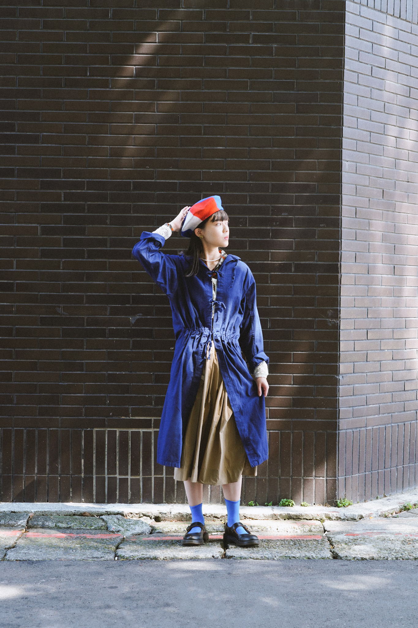 單穿之餘,也可搭上我們由德軍醫療長袍改製的 Apron dress,V 領剪裁與抽繩綁帶,讓身形比例更加俐落,也能詮釋出帶點沈穩的女孩感。