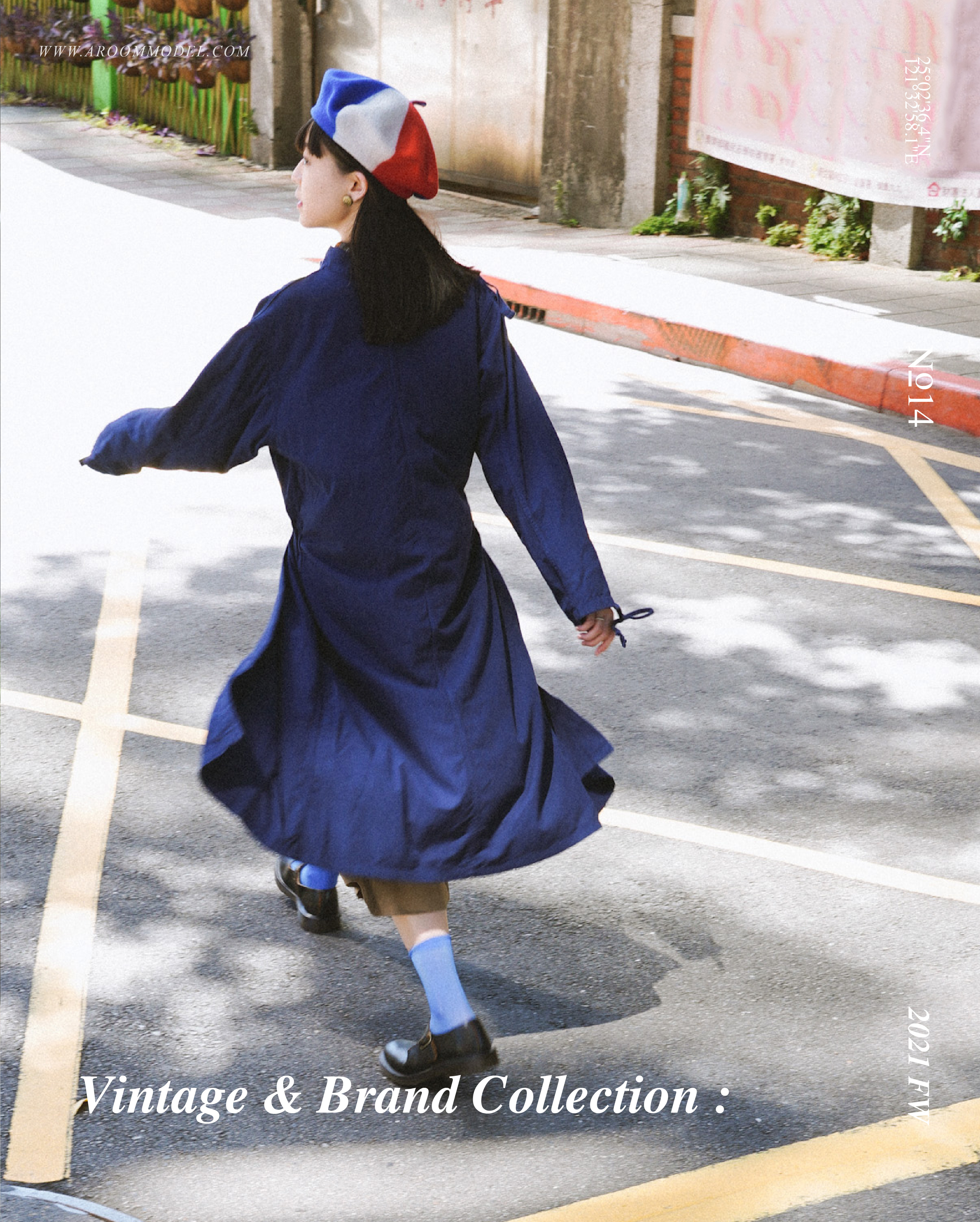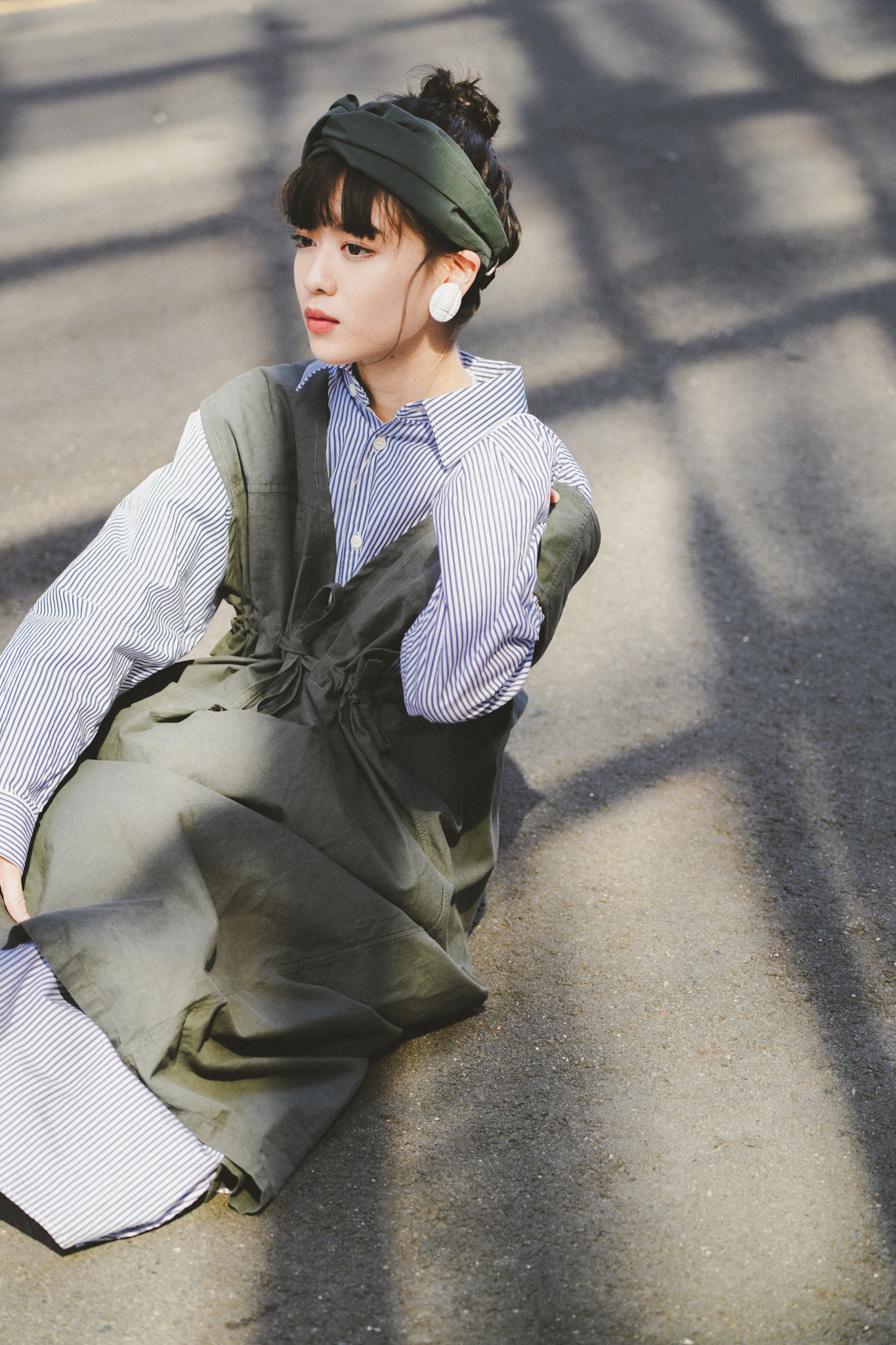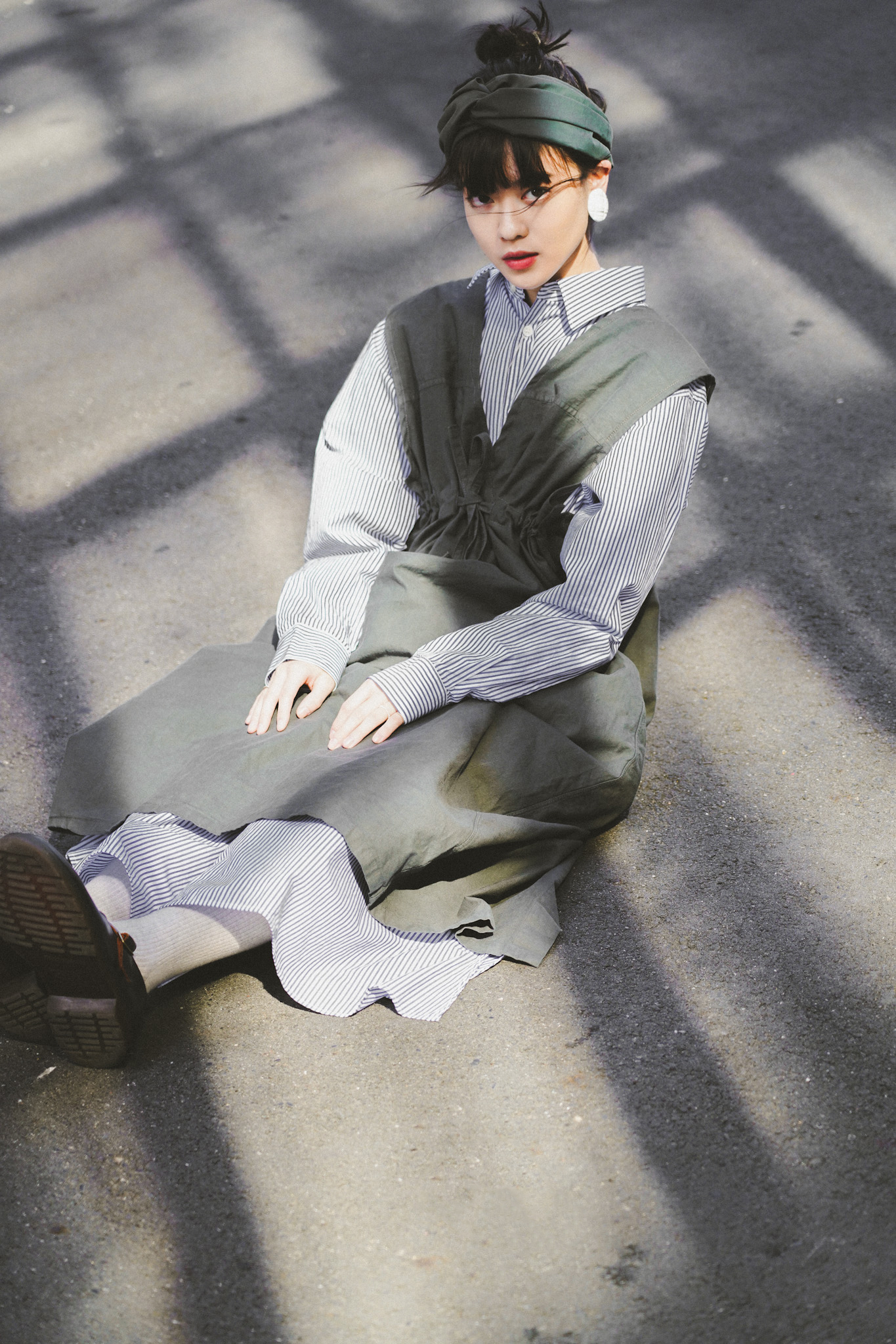 單穿之餘,也可搭上我們由德軍醫療長袍改製的 Apron dress,V 領剪裁與抽繩綁帶,讓身形比例更加俐落,也能詮釋出帶點沈穩的女孩感。
