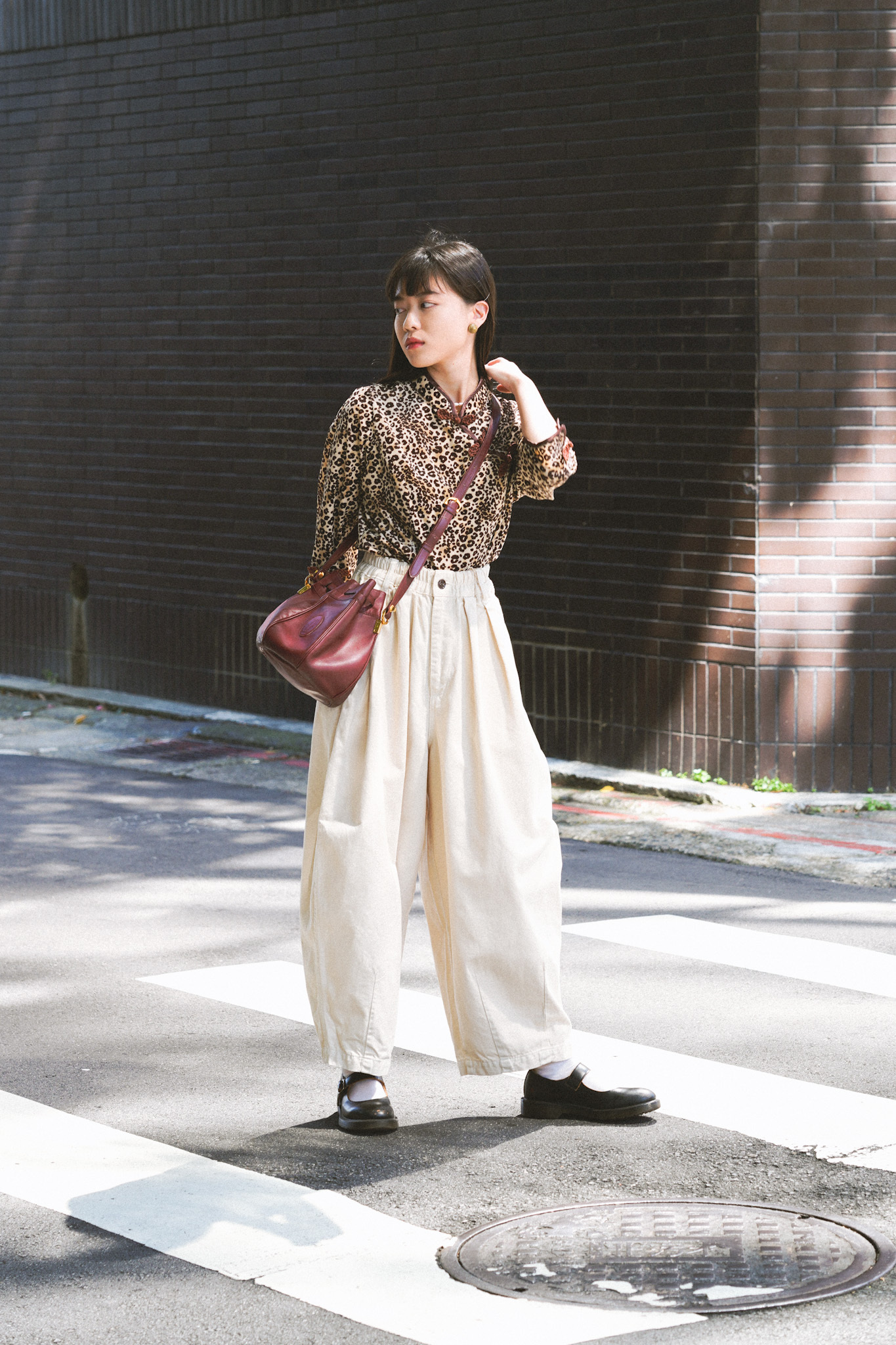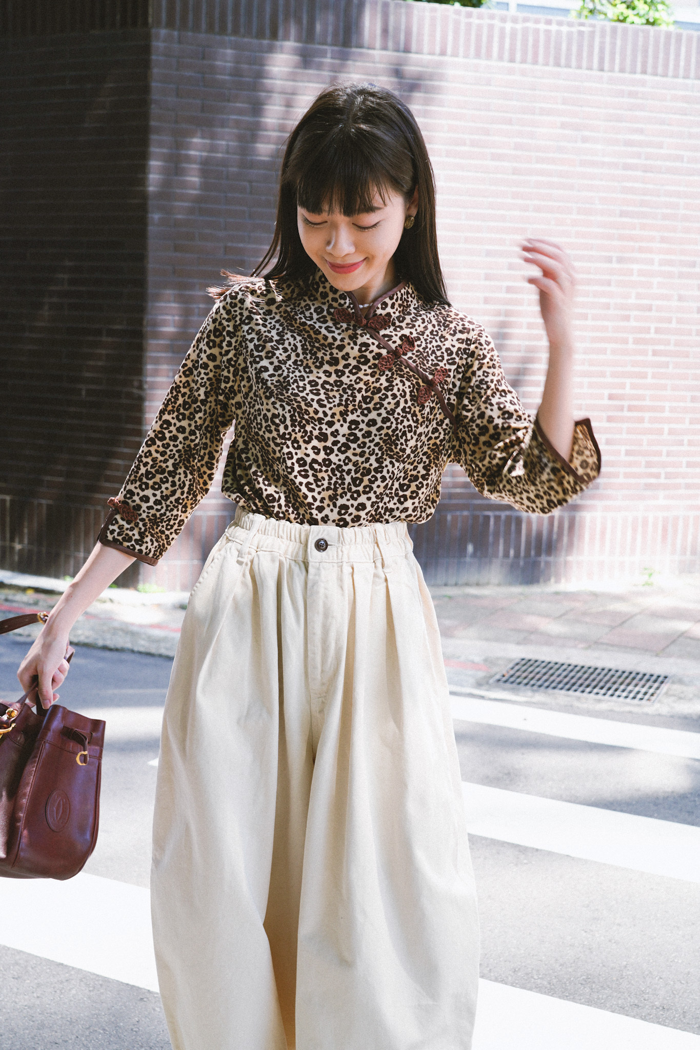天鵝絨的旗袍式上衣,有著搶眼的豹紋元素,領口中國結有畫龍點睛之妙。而為了避免整體穿搭太過眼花撩亂,其餘單品就用素面的簡約風格來平衡視覺。
