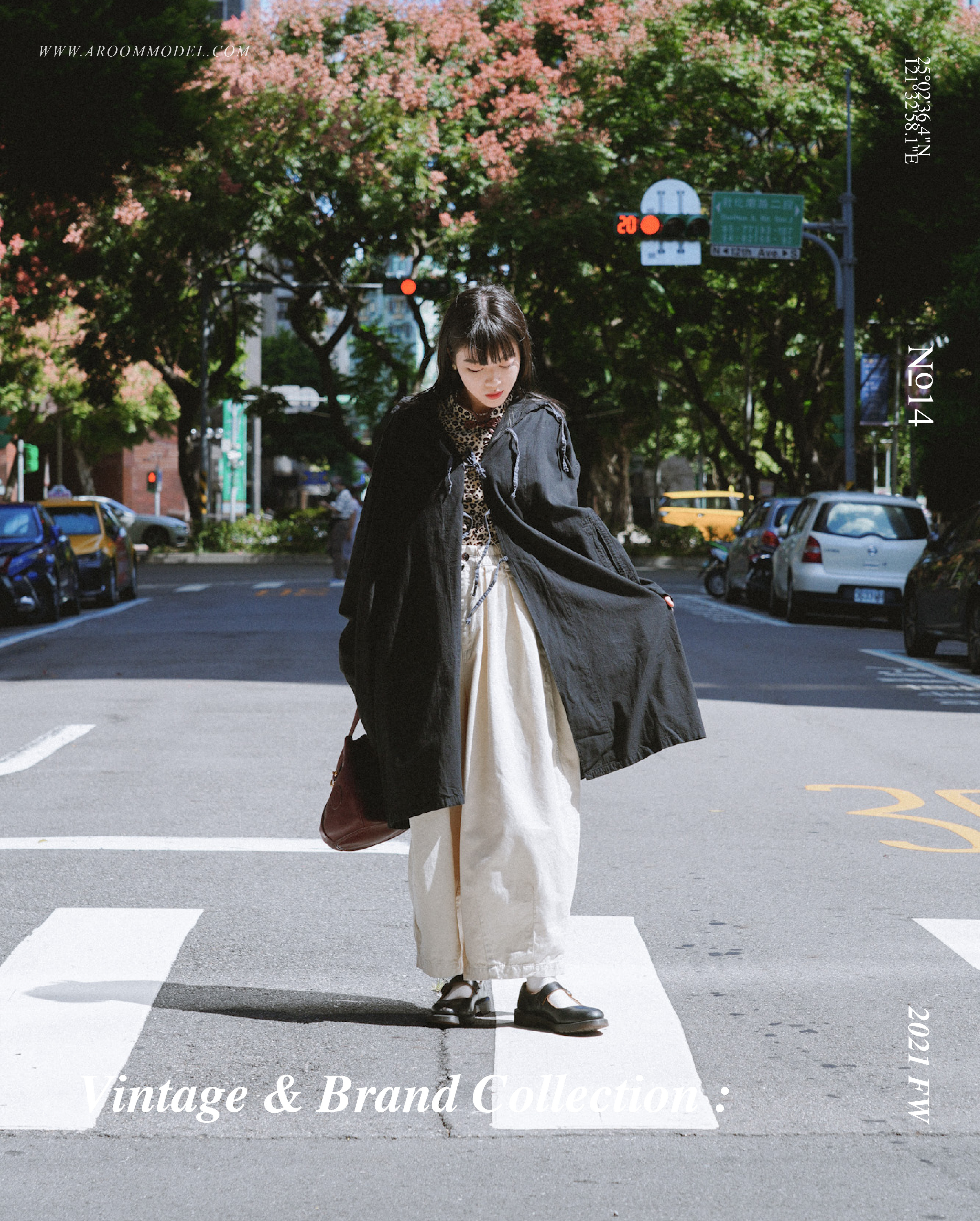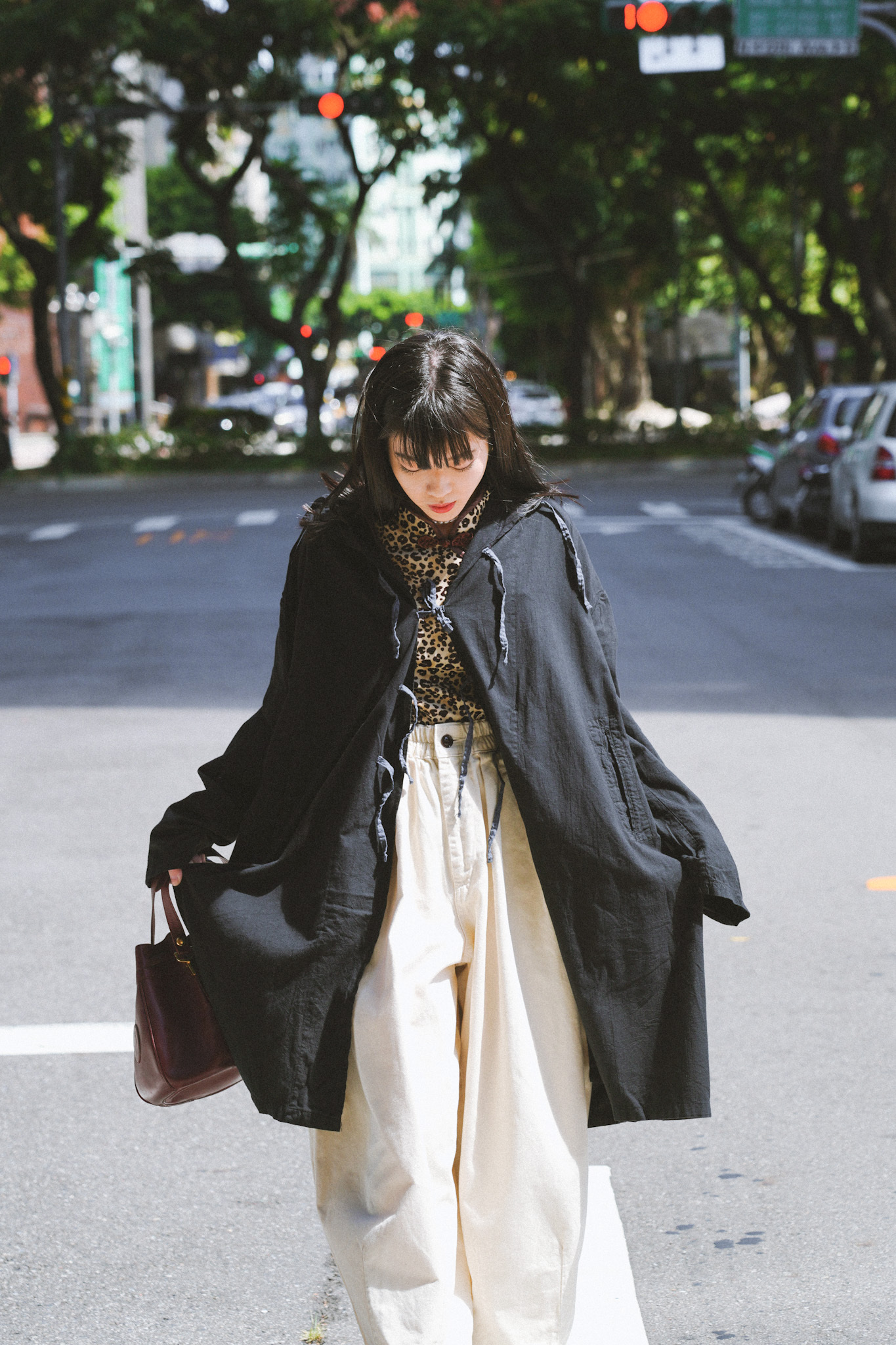 下身搭配 HARVESTY 定番款 CIRCUS PANTS,用淡淡奶油色營造柔和輪廓,外罩一件來自60's匈牙利的軍用Parka,顏色同樣也是我們獨家染製而成!讓重點留在衣領那若隱若現的豹紋,原本平靜的黑頓時多了股神祕成熟的氣質,多層次的搭法也可避免氣溫驟降時著涼。