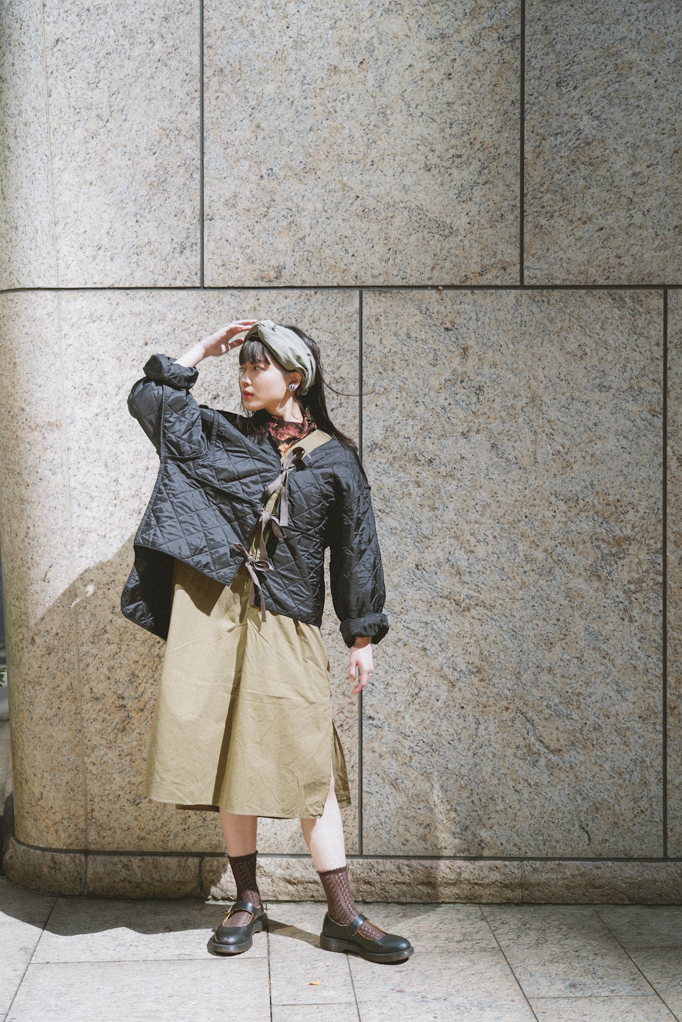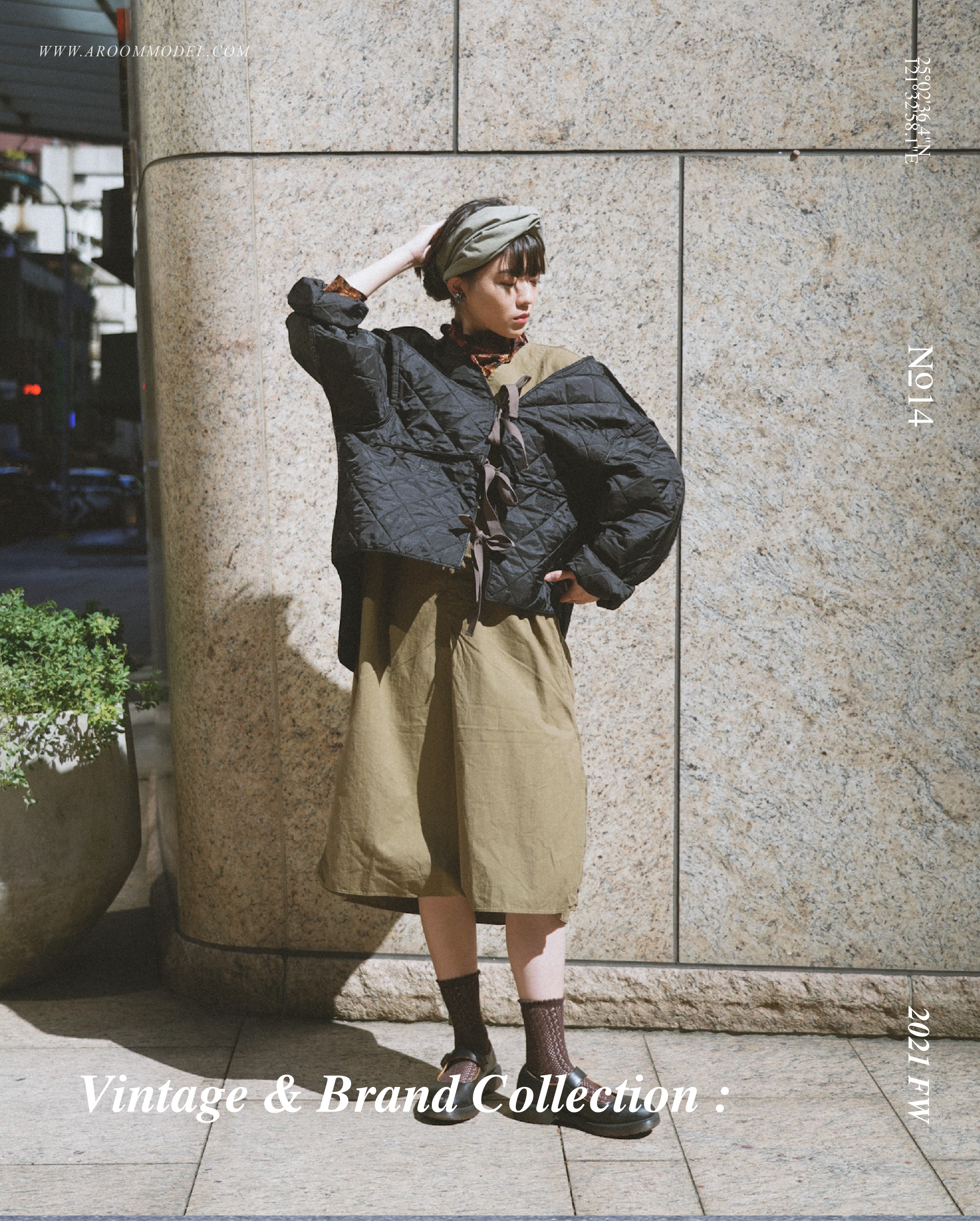 穿上一襲軍綠色 F5 染製德軍睡袍,用內搭的大地色系天鵝絨注入溫柔氣息。待氣溫再涼一些,還可罩上荷蘭的黑色鋪棉外套,原先為荷蘭軍的外套內裡,我們改製後賦予了它嶄新的樣貌,讓短版版型與蝴蝶結綁帶組合,中性的軍綠擁有了雅緻的形象。